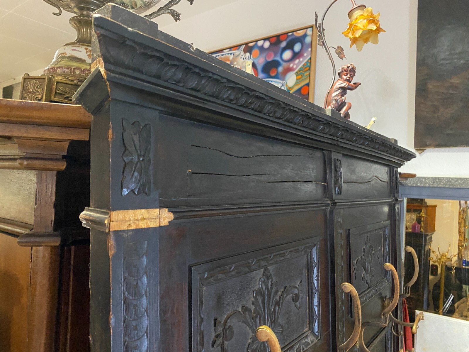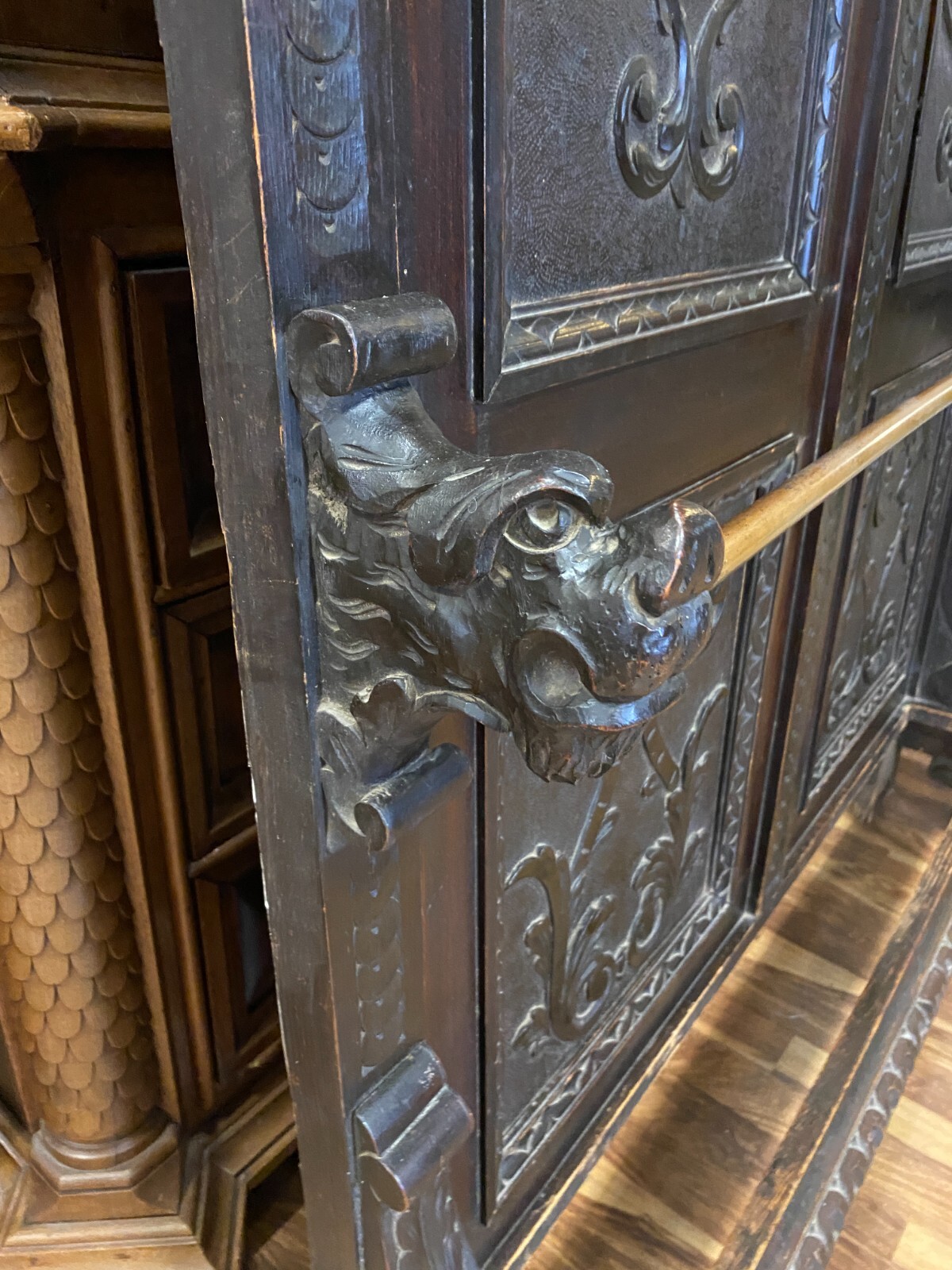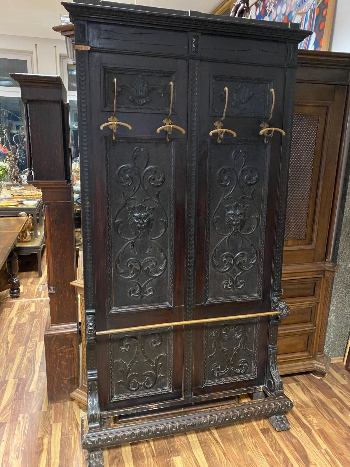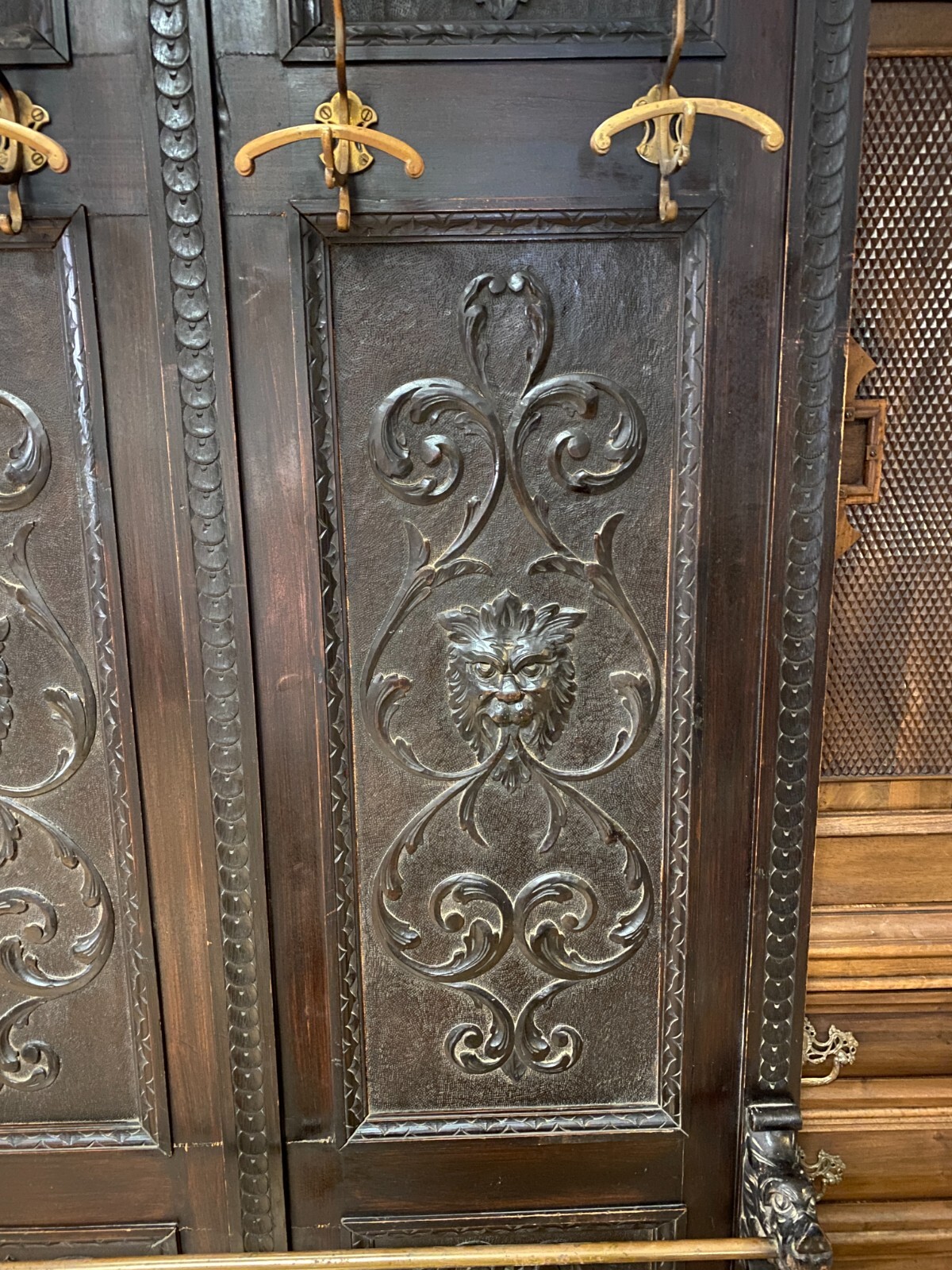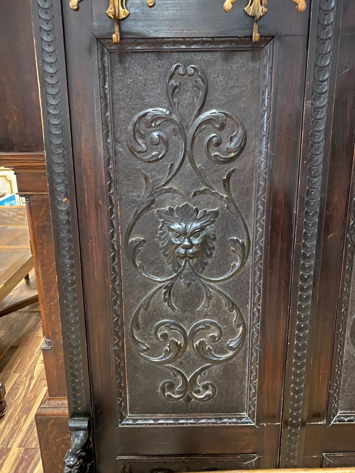 ANTIKE GARDEROBE MIT KÖPFEN UND FRATZEN UM 1890 GRÜNDERZEIT SEHR GROSS 240x120cm