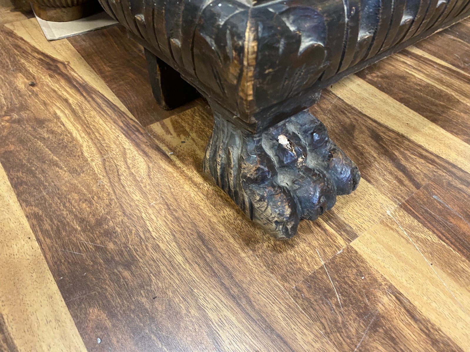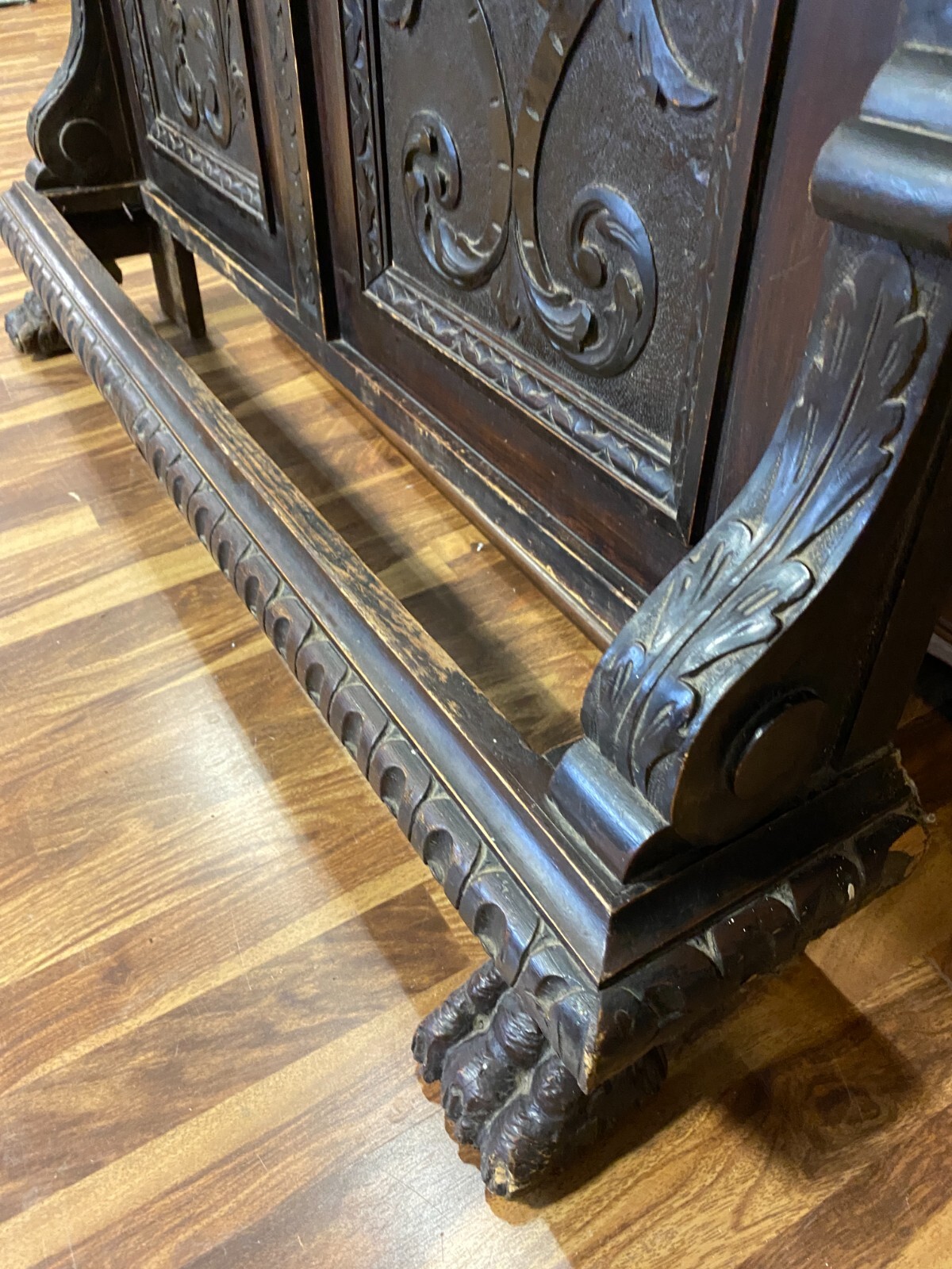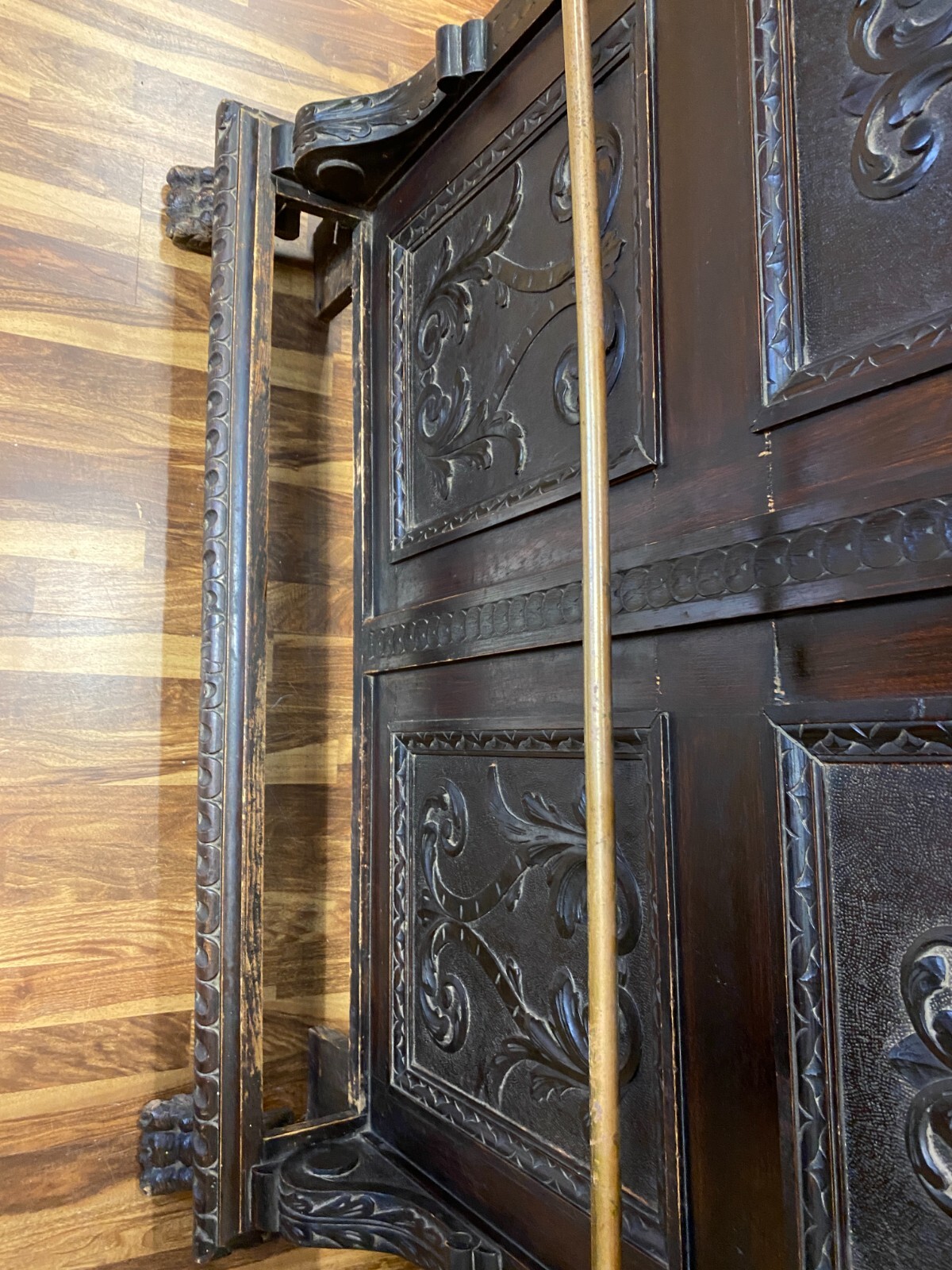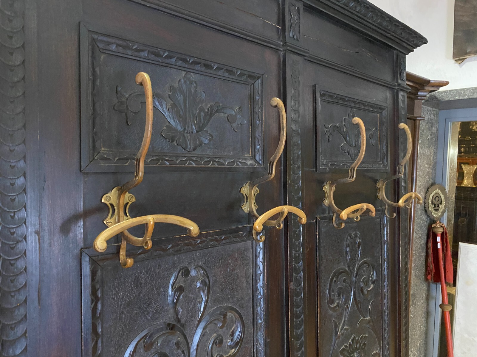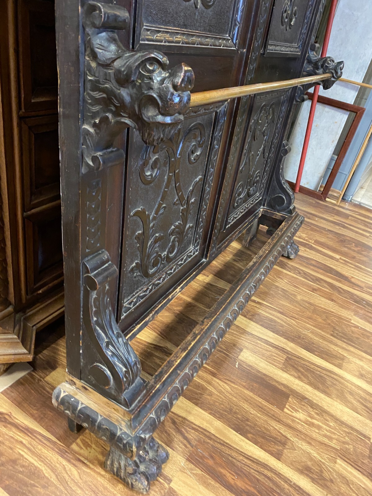 Sehr große Gründerzeit Garderobe, um 1890. Gestell wohl aus Weichholz, dunkelbraun patiniert. Im oberen Bereich Dehnungsrisse. Seitlich unten rechts bestoßen und leicht unvollständig. Unten mittig befand sich wohl ein Abtropfbehälter, dieser ist nicht vorhanden. Beide Füße stärker berieben und mit altem, inaktiven Wurmfraß. An der linken Seite im oberen- und unteren Bereich kleinere Leisten fehlend. Kleiderhaken stammen wohl aus der Jugendstilzeit. Die Garderobe ist am Stück und muss oben an der Wand befestigt werden. Die seitlichen Kanten zum Teil berieben. Stabiler Zustand, Abmessungen BTH: 120x23x240cm.
