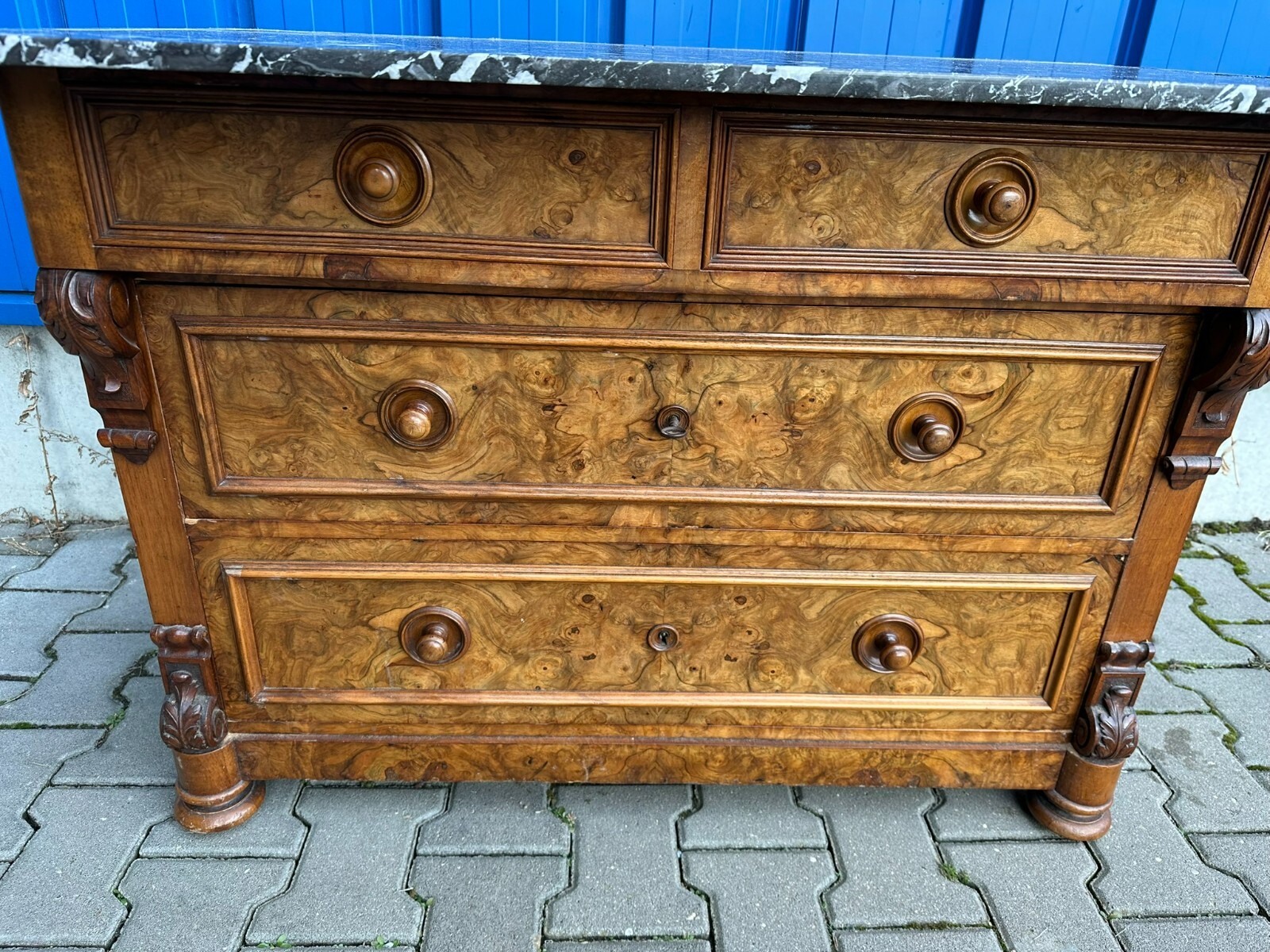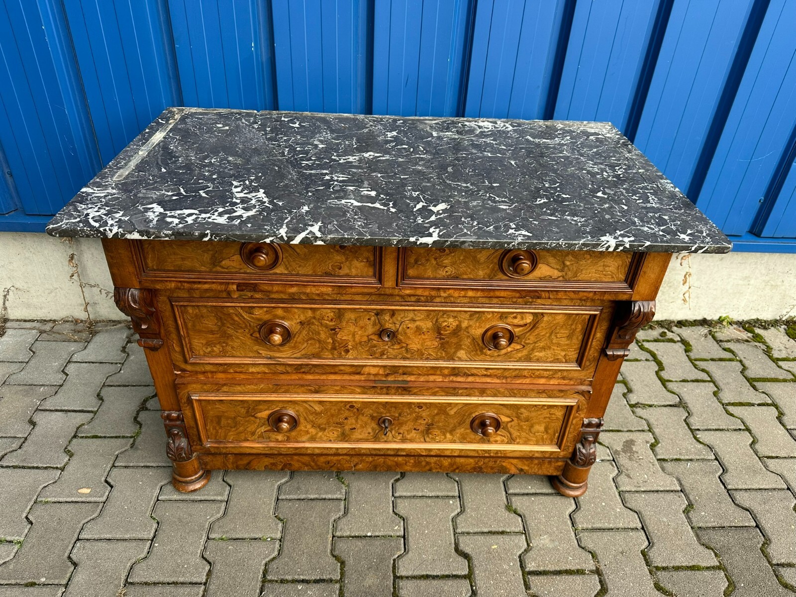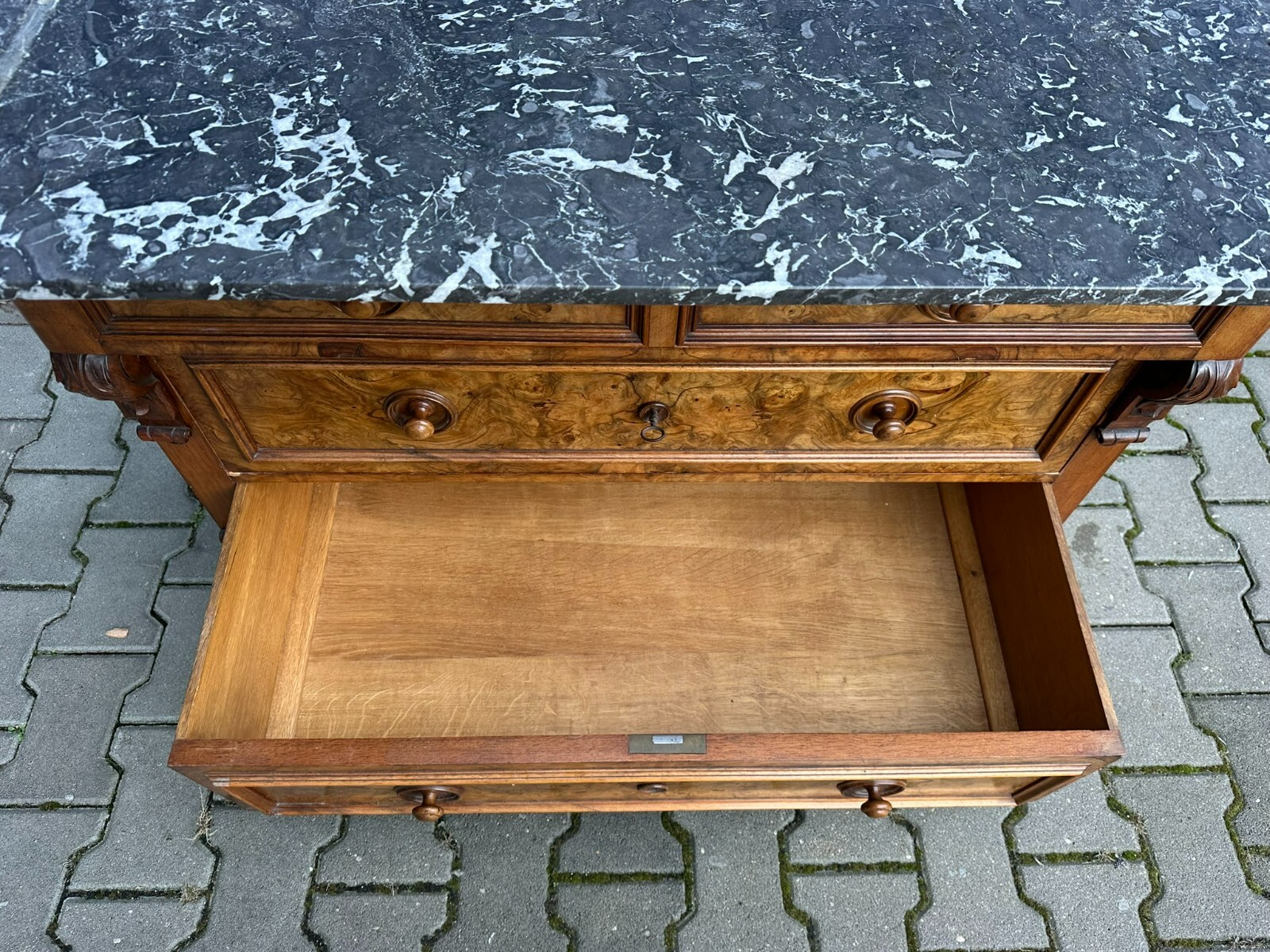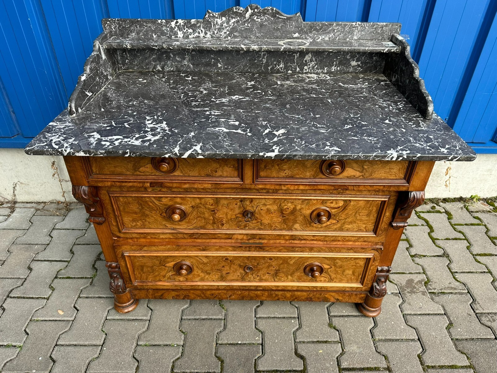 Antike Gründerzeitkommode um 1890, massiver Holzkorpus, in Nussbaum und Wurzelnuss gearbeitet, die Kommode ist ursprünglich als Waschkommode ausgelegt, Seitenteile zum Teil mit Dehnungsrissen. An der Front sehr schönes Furnierbild. Mittlere Schublade innen fleckig, untere Schublade etwas schwergängig. Die Schubladenböden wurden mal komplett ausgetauscht. Die Marmorplatte oben zum Teil mit Kratzern und Flecken, der Aufbau ist zwar vollständig, der Träger an der linken Seite jedoch gebrochen. Die Marmorteile wurden mal mit Panzertape nachbefestigt, hier diverse Kleberspuren. Die Marmorteile müssten etwas überarbeitet und neu fixiert werden. Abmessungen BTH: 106x60x100cm, Höhe der Hauptmarmorplatte: 78cm.