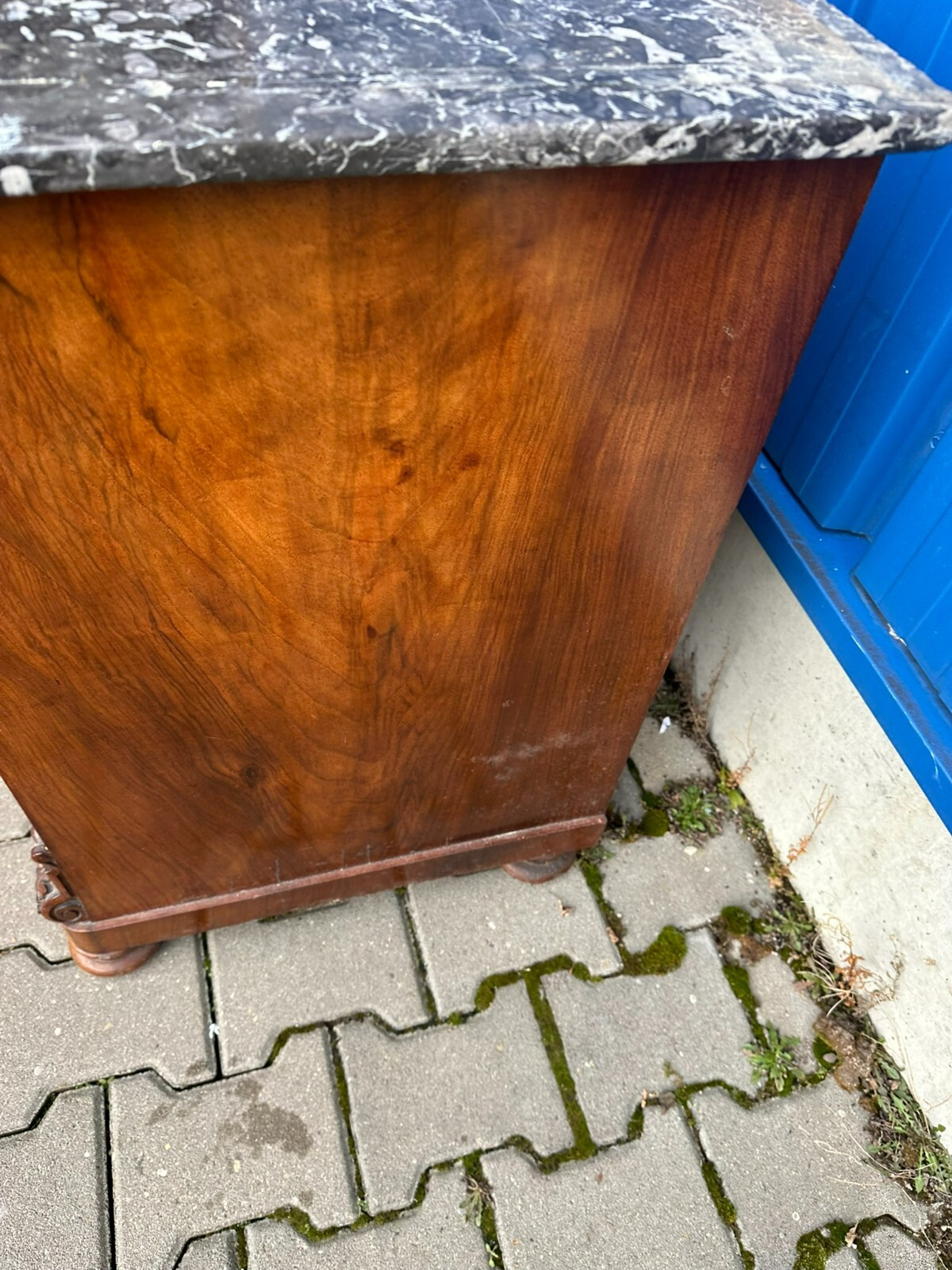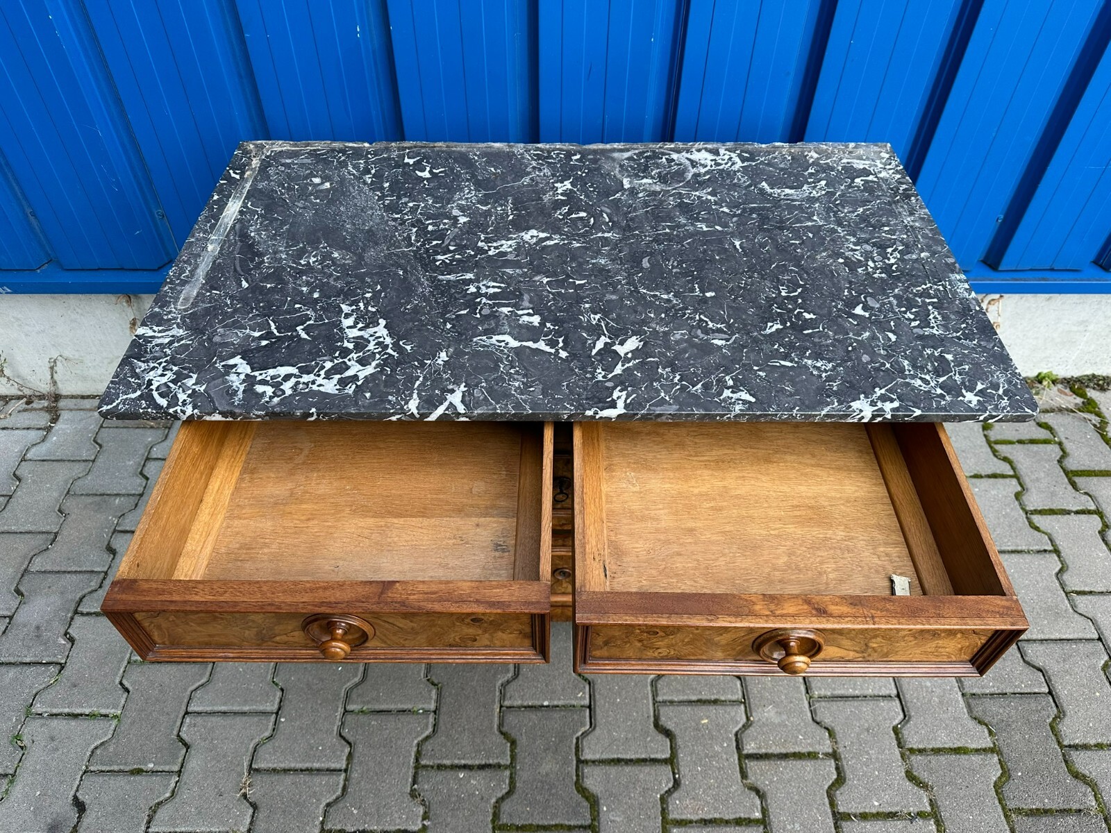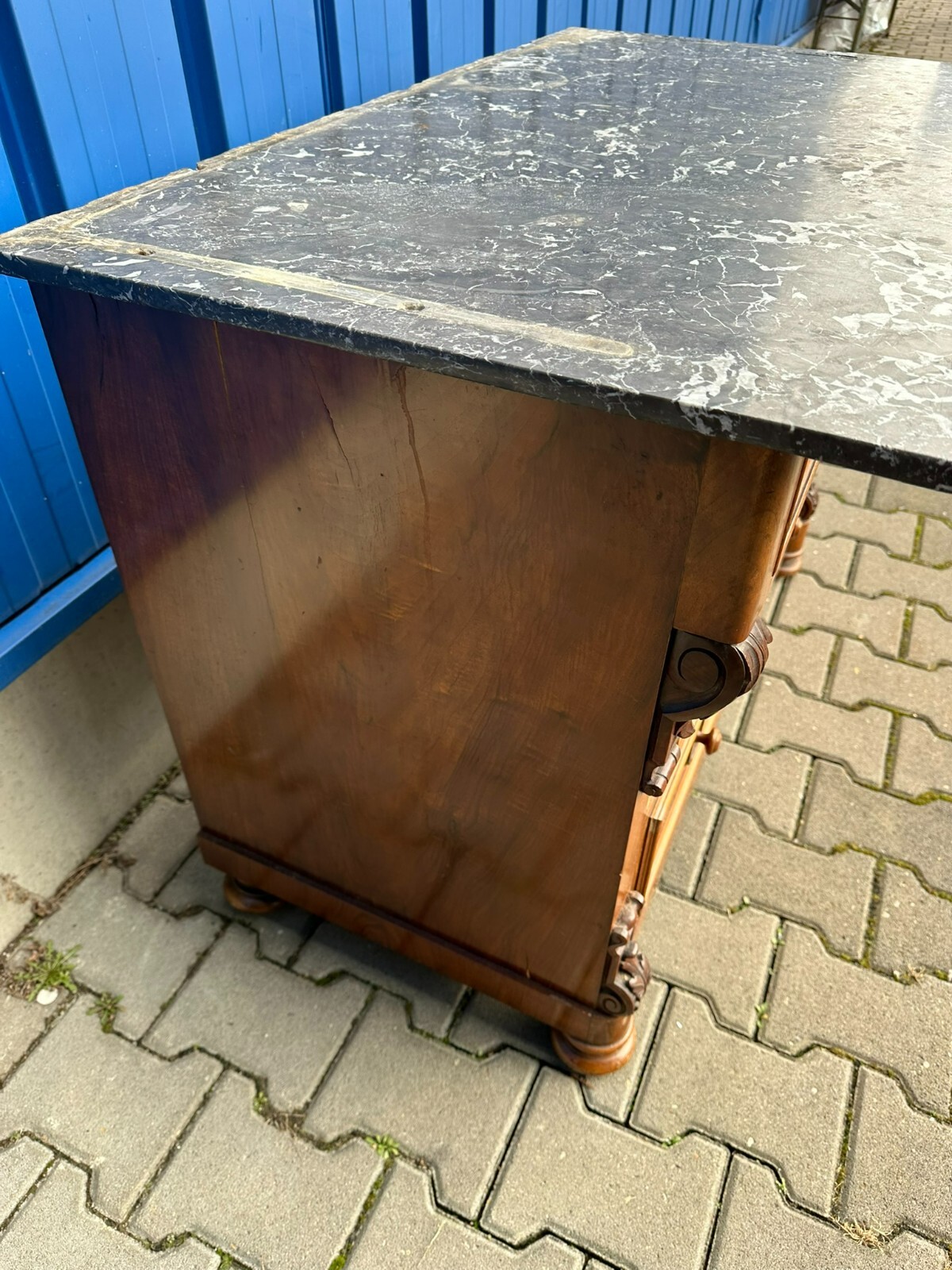 Antike Gründerzeitkommode um 1890, massiver Holzkorpus, in Nussbaum und Wurzelnuss gearbeitet, die Kommode ist ursprünglich als Waschkommode ausgelegt, Seitenteile zum Teil mit Dehnungsrissen. An der Front sehr schönes Furnierbild. Mittlere Schublade innen fleckig, untere Schublade etwas schwergängig. Die Schubladenböden wurden mal komplett ausgetauscht. Die Marmorplatte oben zum Teil mit Kratzern und Flecken, der Aufbau ist zwar vollständig, der Träger an der linken Seite jedoch gebrochen. Die Marmorteile wurden mal mit Panzertape nachbefestigt, hier diverse Kleberspuren. Die Marmorteile müssten etwas überarbeitet und neu fixiert werden. Abmessungen BTH: 106x60x100cm, Höhe der Hauptmarmorplatte: 78cm.