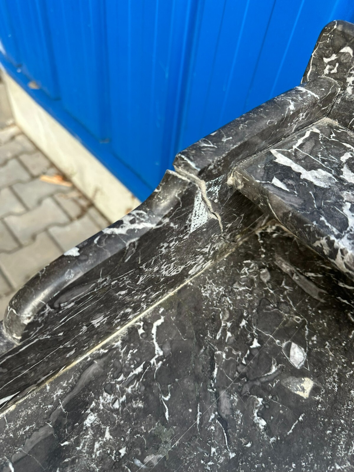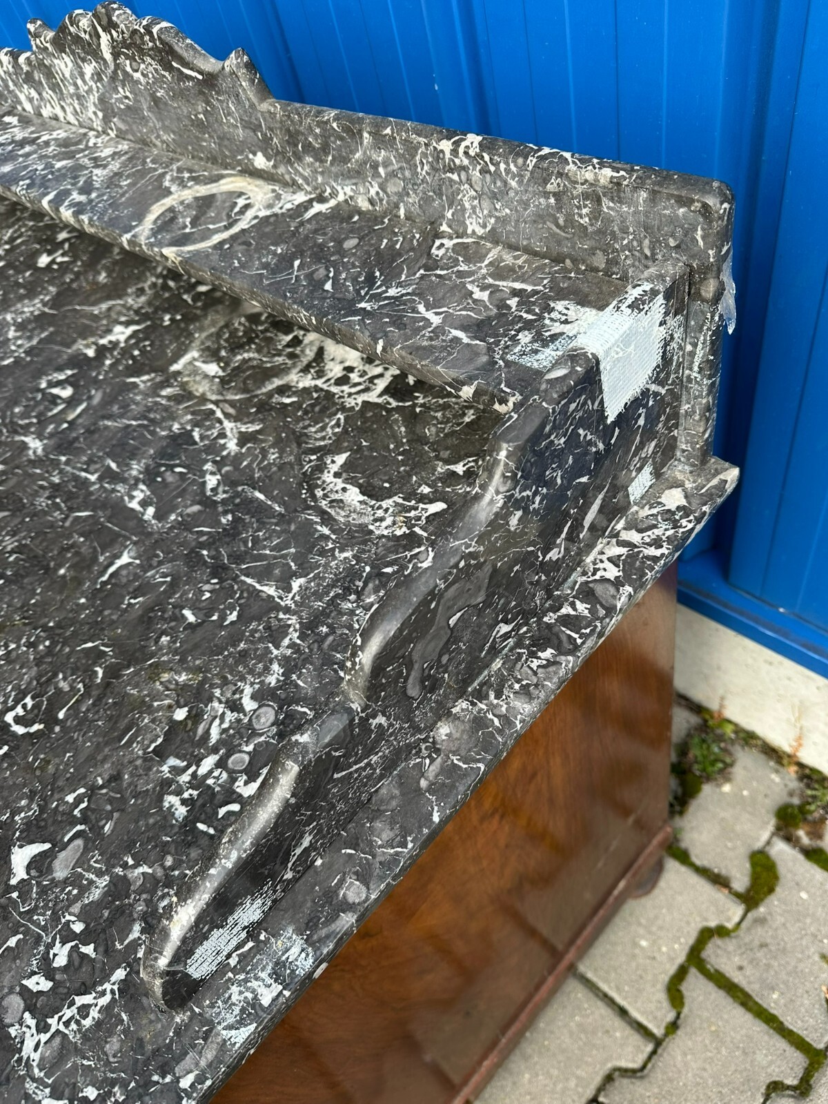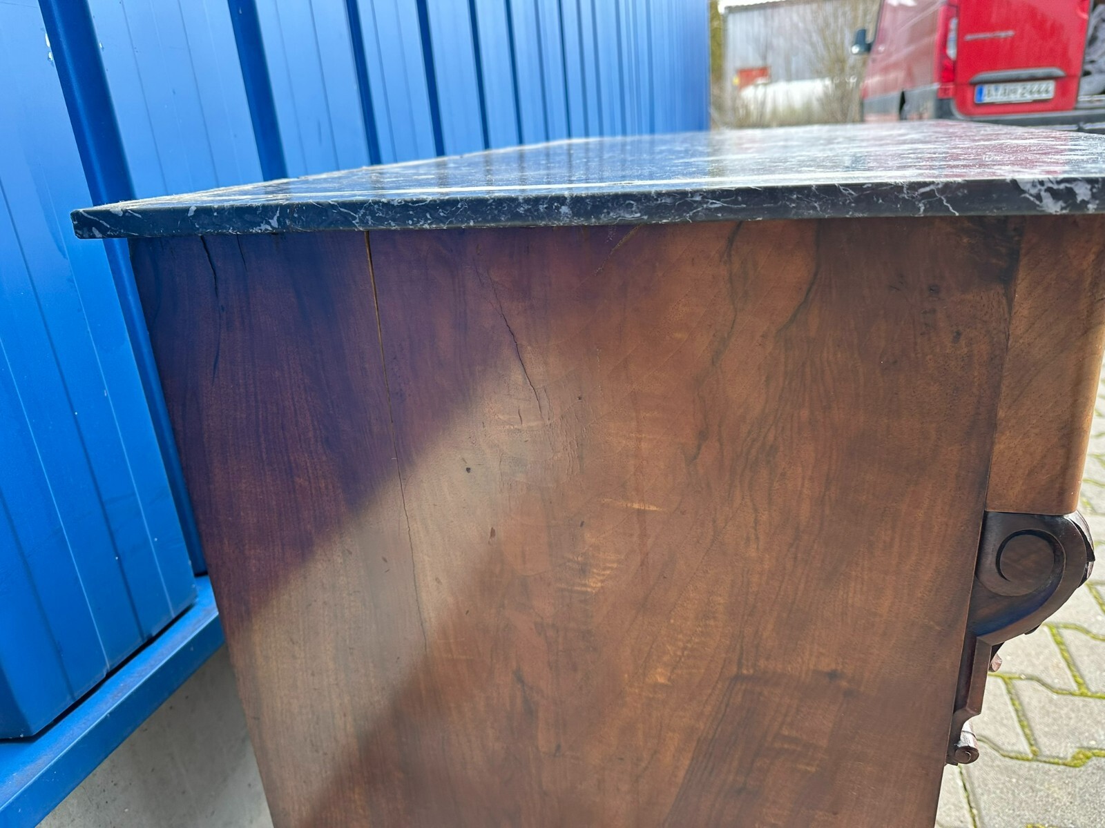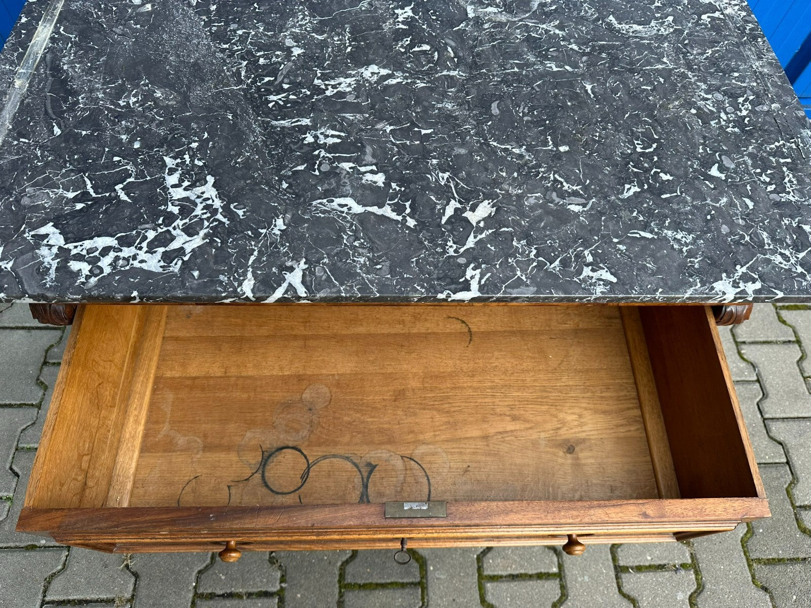 Antike Gründerzeitkommode um 1890, massiver Holzkorpus, in Nussbaum und Wurzelnuss gearbeitet, die Kommode ist ursprünglich als Waschkommode ausgelegt, Seitenteile zum Teil mit Dehnungsrissen. An der Front sehr schönes Furnierbild. Mittlere Schublade innen fleckig, untere Schublade etwas schwergängig. Die Schubladenböden wurden mal komplett ausgetauscht. Die Marmorplatte oben zum Teil mit Kratzern und Flecken, der Aufbau ist zwar vollständig, der Träger an der linken Seite jedoch gebrochen. Die Marmorteile wurden mal mit Panzertape nachbefestigt, hier diverse Kleberspuren. Die Marmorteile müssten etwas überarbeitet und neu fixiert werden. Abmessungen BTH: 106x60x100cm, Höhe der Hauptmarmorplatte: 78cm.