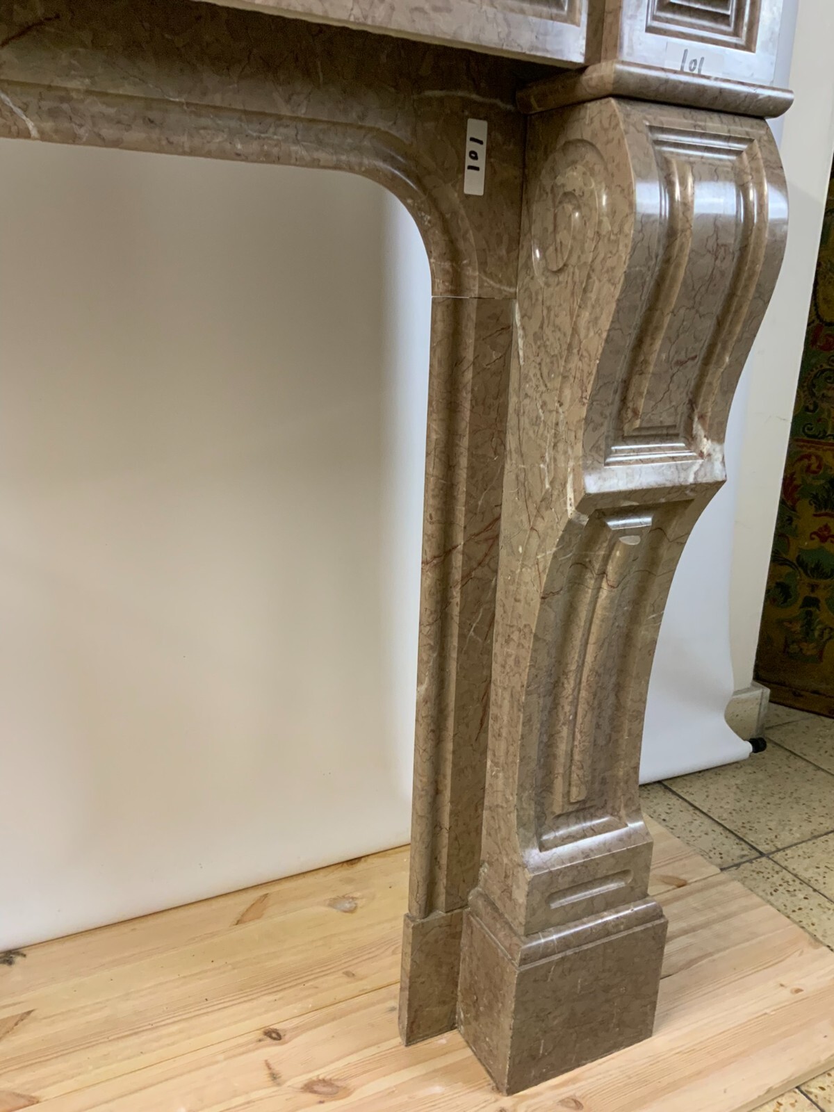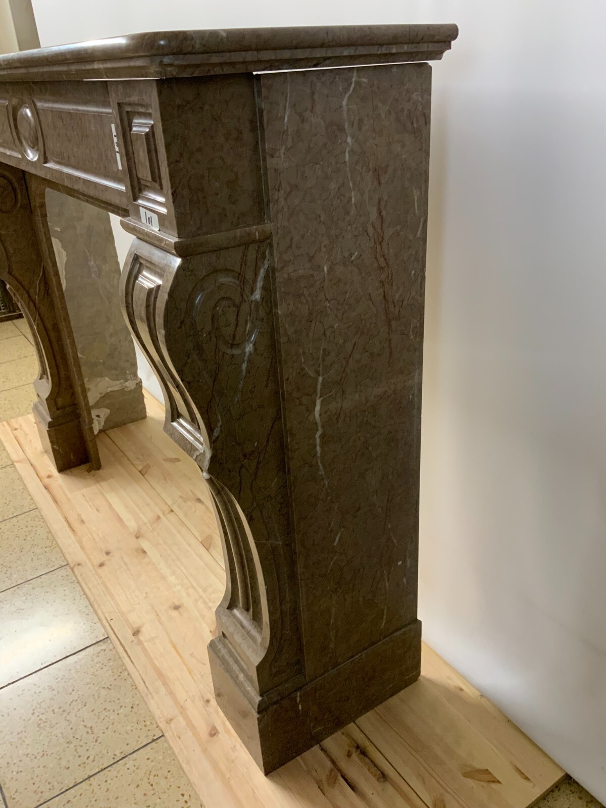 Antike Kaminumrandung aus Marmor, original um 1880 Louis Philippe. Abmessungen BTH: 151x40x115cm, Innen BxH: 94x87cm. Der Marmor wurde mal komplett überarbeitet und poliert, er hat restaurierte Brüche, die teilweise zu sehen sind. Der Aufbau besteht aus folgenden Teilen: Obere Abdeckplate, Front (1 oder 2-teilig) und jeweils Aussenbeine (fertig zusammengeklebt). Somit gestaltet sich ein Aufbau zu zweit sehr einfach. Die Teile können mit durchsichtigem Silicon aneinander geklebt werden zu Stabilitätszwecken. Der Kamin ist an der Oberfläche leicht verkratzt und berieben. Der rechte Fuß ist an der hinteren oberen rechten Ecke bestoßen und unvollständig. Der rechte Fuß ist im Fußbereich stark verkratzt. Die obere Platte hat an der hinteren rechten Ecke leichte Farbflecken und hat zudem Kratzer.  Kleinere Chips im Kantenbereich.