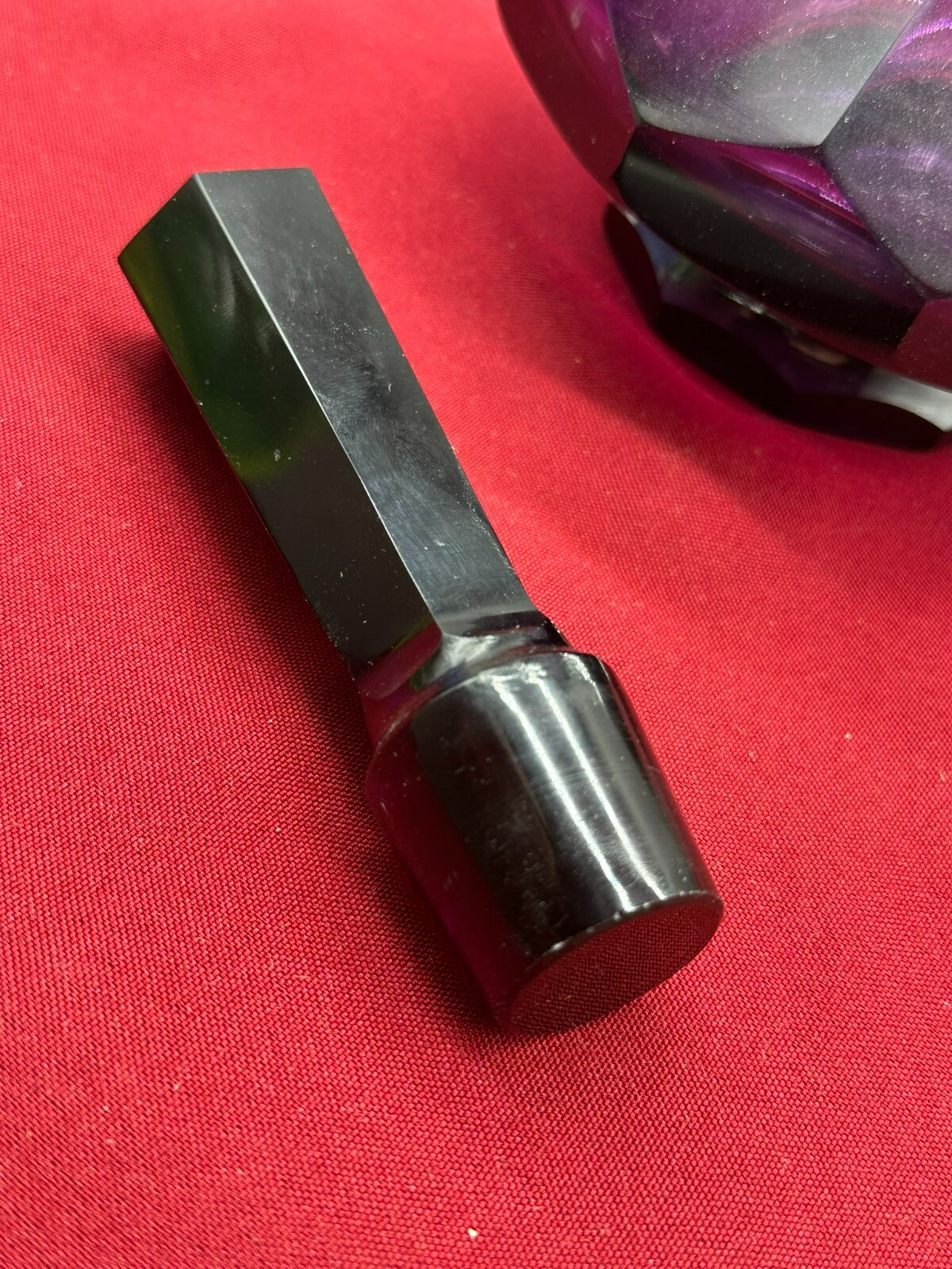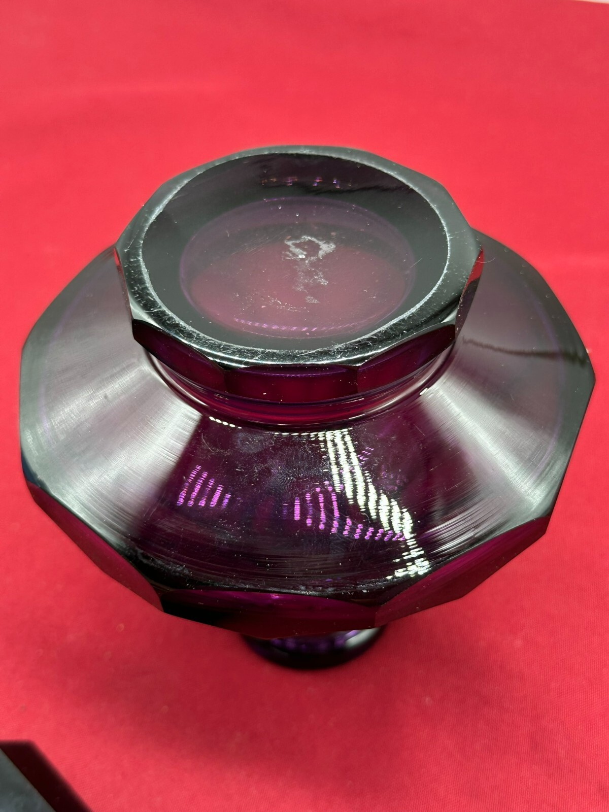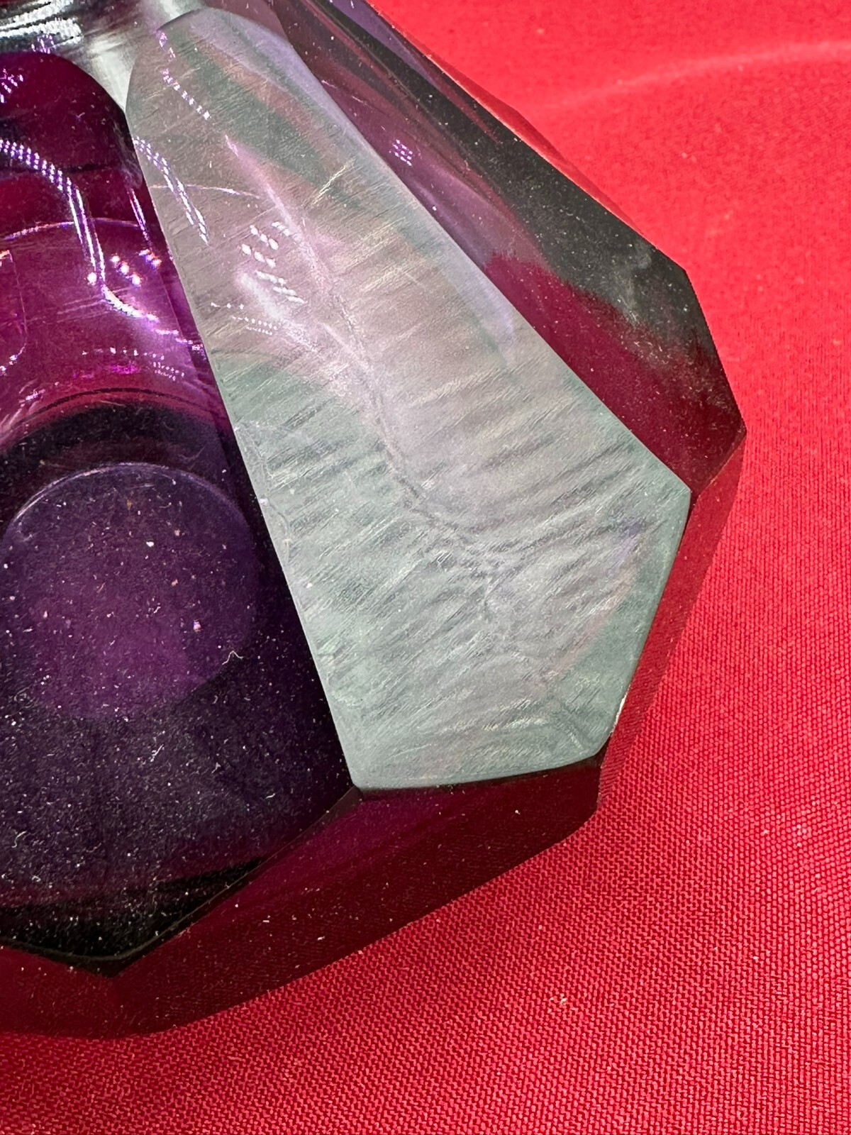 Sehr schöne Flasche mit Stöpsel, mundgeblasen, wohl Böhmen um 1920. An den Schleifkanten minimalst berieben, ohne Chips. Höhe/Durchmesser 23/14cm.