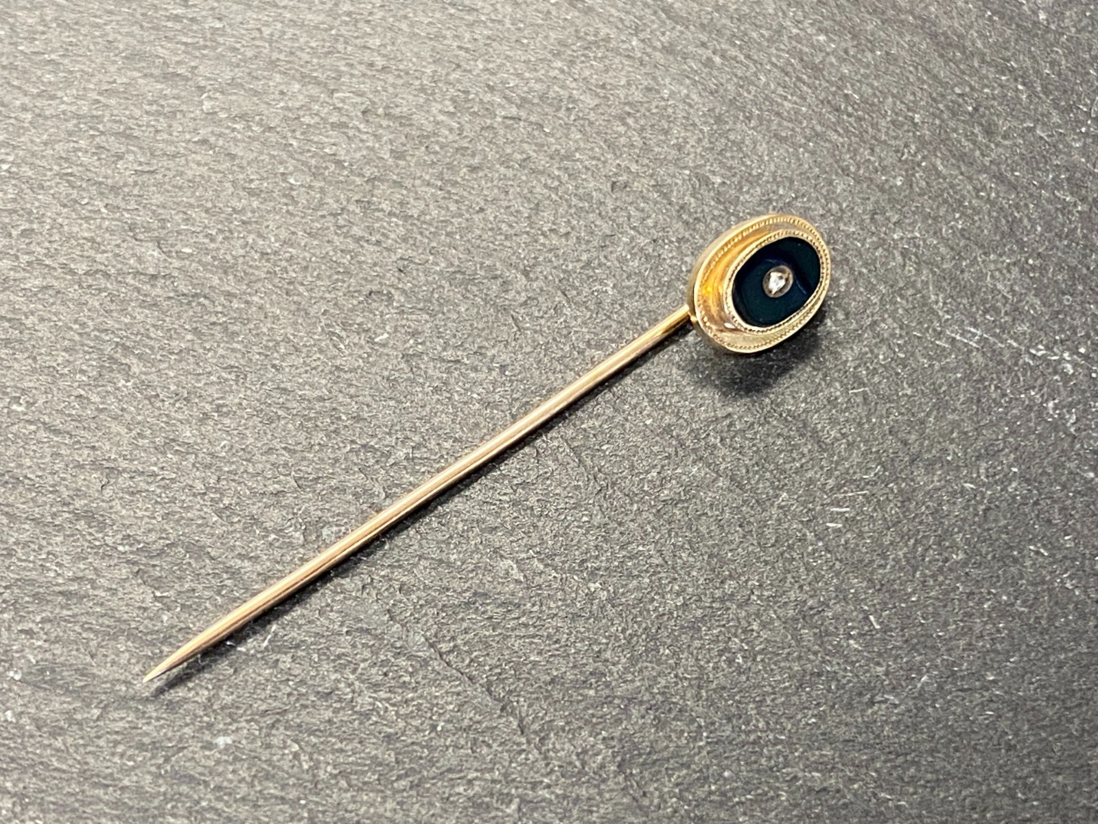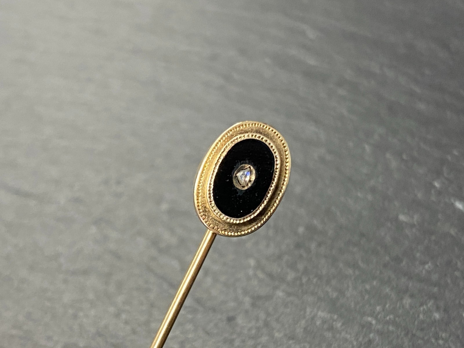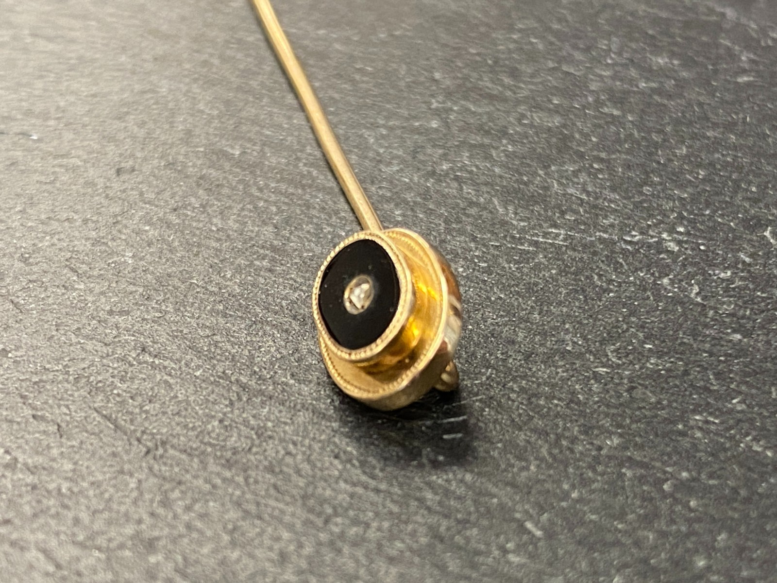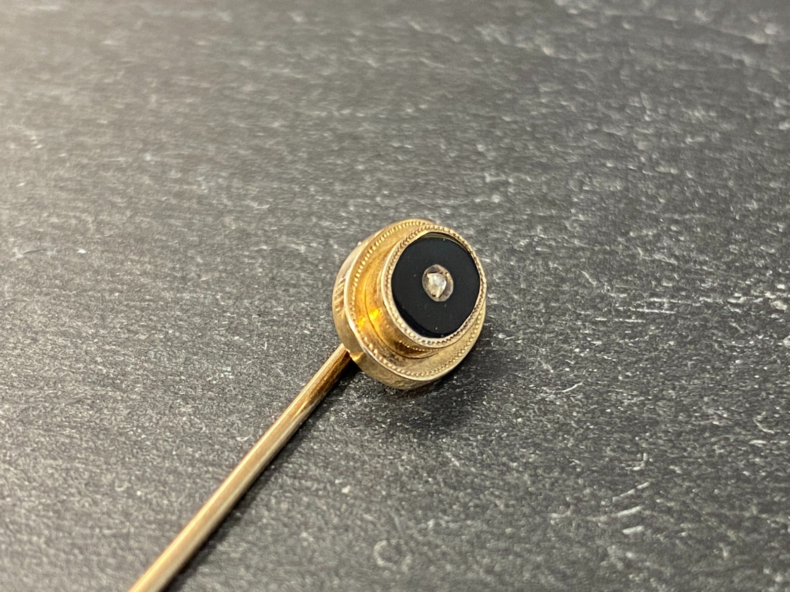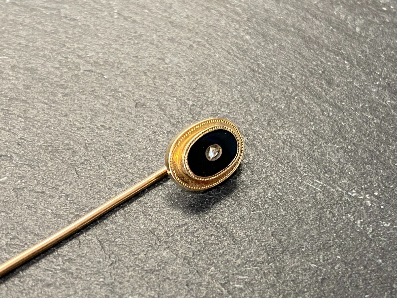 Antike Krawattennadel mit Onyx und einem Diamantsplitter mit B/H ca. 1,6/1,2mm, soweit in der Fassung messbar, ohne Punze. Wir haben das Stück geröntgt, es handelt sich um Gelbgold 14K. Die Nadel ist gerade und die Oberfläche weist minimalste Abnutzungsspuren auf, insgesamt ein sehr guter Zustand. Gesamtlänge ca. 5,3cm, B/H des Kopfes ca. 0,82/1,1cm, Gesamtgewicht ca. 1,67g. Die Begutachtung der Stücke wird vorgenommen von einem Fachmitglied der deutschen gemmologischen Gesellschaft E.V. Ein Schmuckpass wird mitgeliefert.