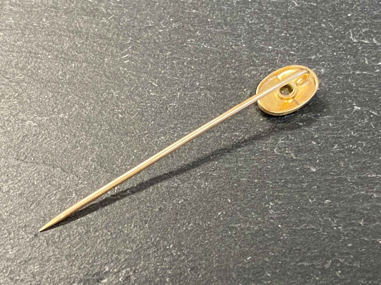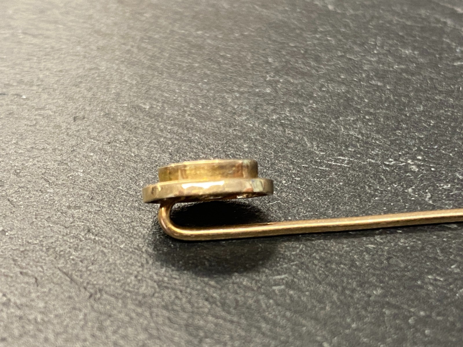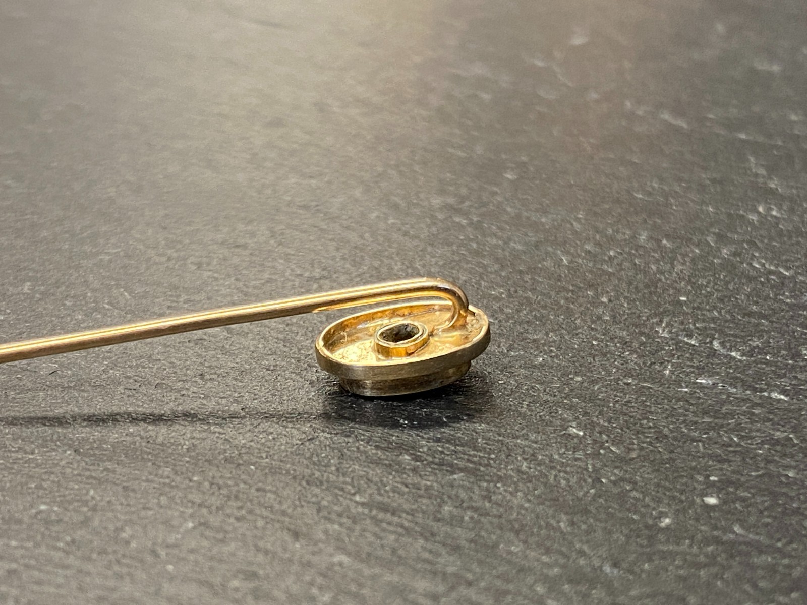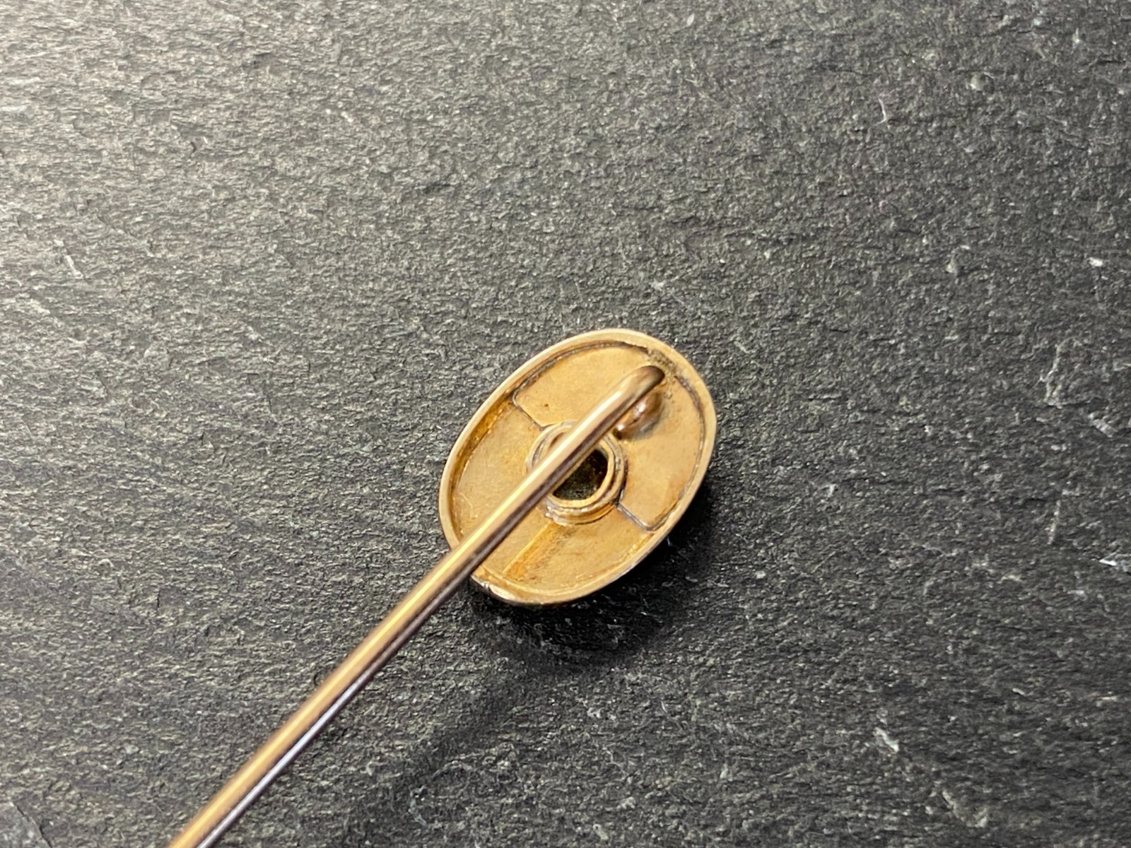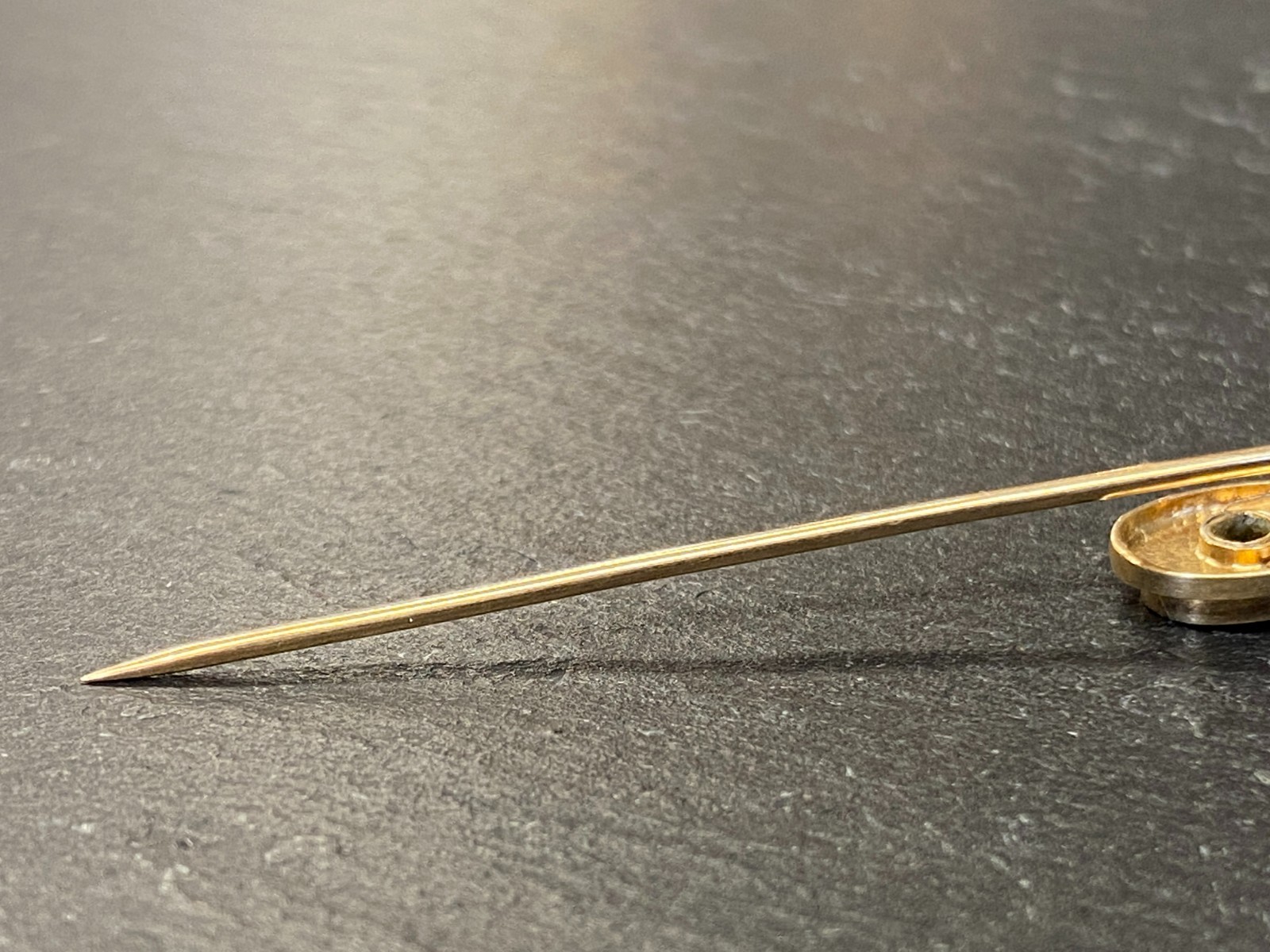 Antike Krawattennadel mit Onyx und einem Diamantsplitter mit B/H ca. 1,6/1,2mm, soweit in der Fassung messbar, ohne Punze. Wir haben das Stück geröntgt, es handelt sich um Gelbgold 14K. Die Nadel ist gerade und die Oberfläche weist minimalste Abnutzungsspuren auf, insgesamt ein sehr guter Zustand. Gesamtlänge ca. 5,3cm, B/H des Kopfes ca. 0,82/1,1cm, Gesamtgewicht ca. 1,67g. Die Begutachtung der Stücke wird vorgenommen von einem Fachmitglied der deutschen gemmologischen Gesellschaft E.V. Ein Schmuckpass wird mitgeliefert.