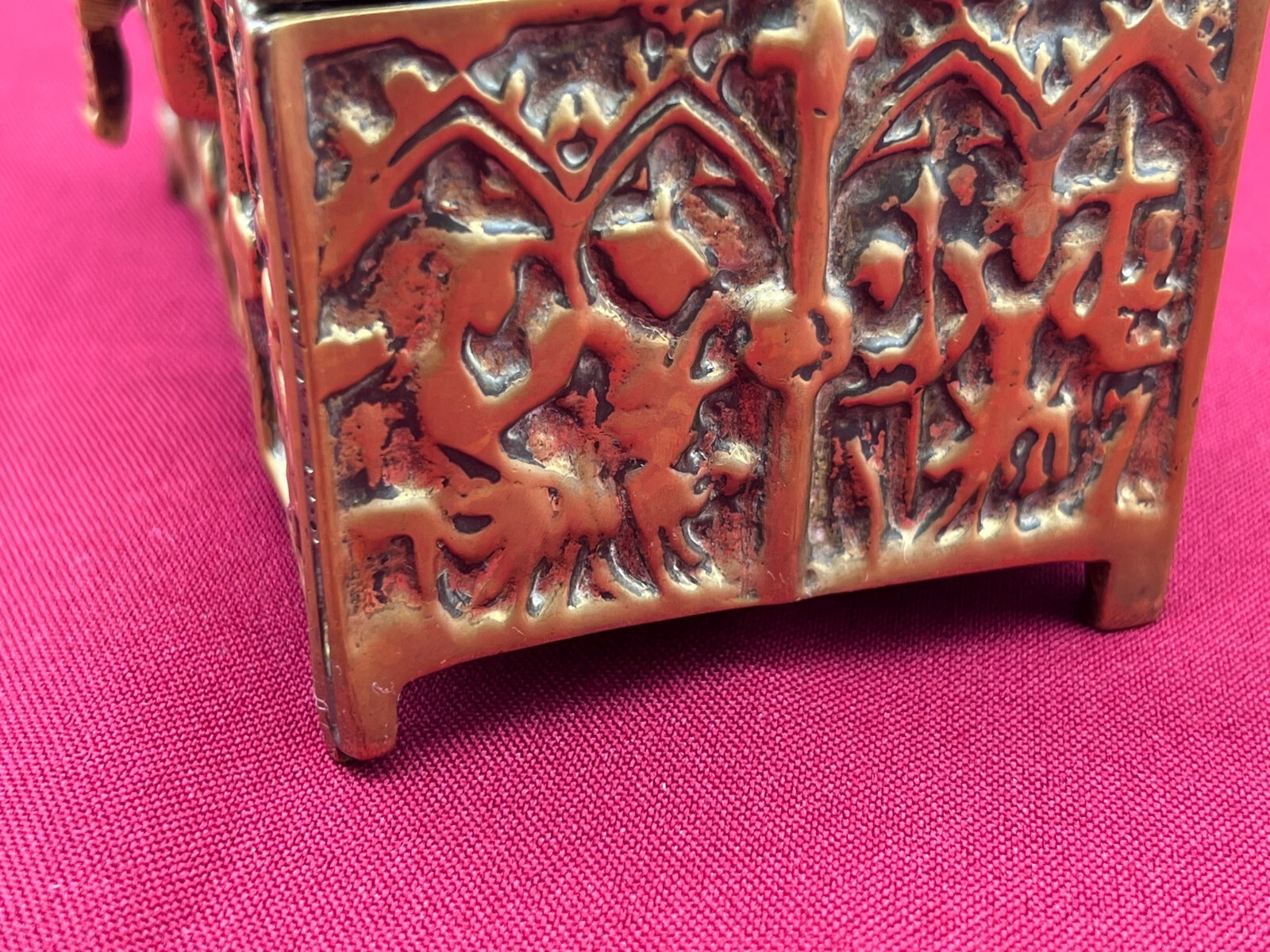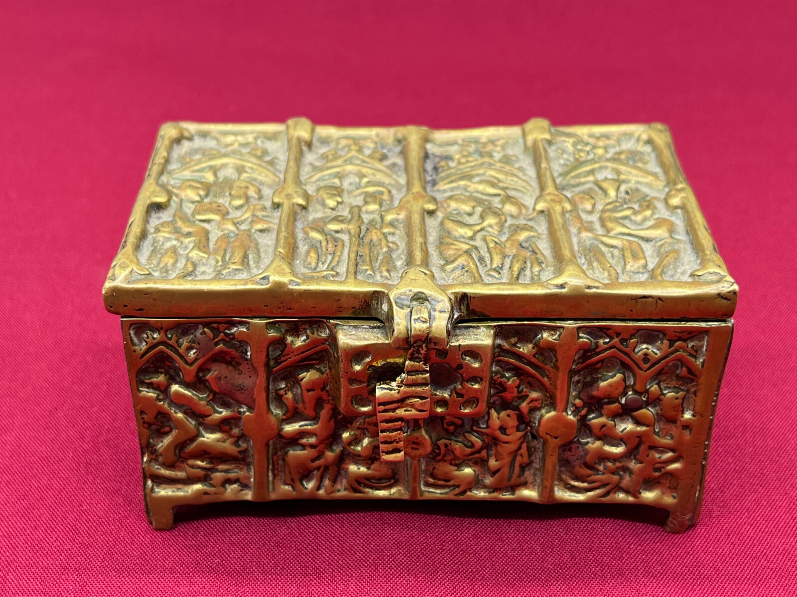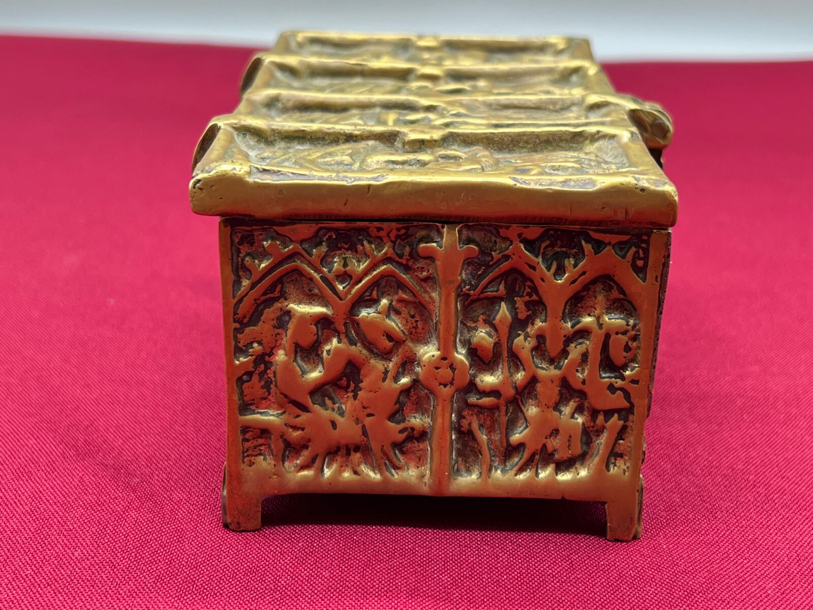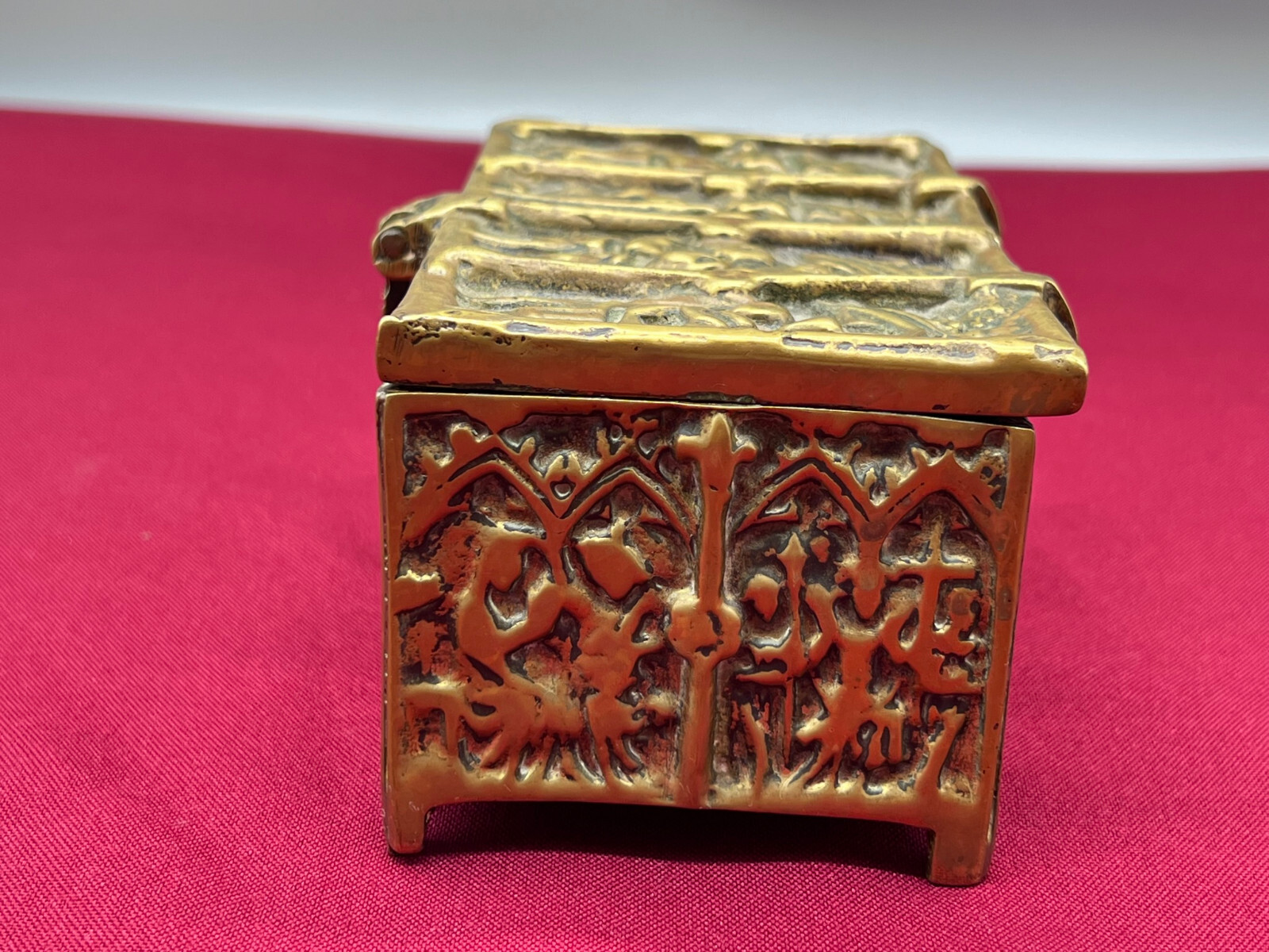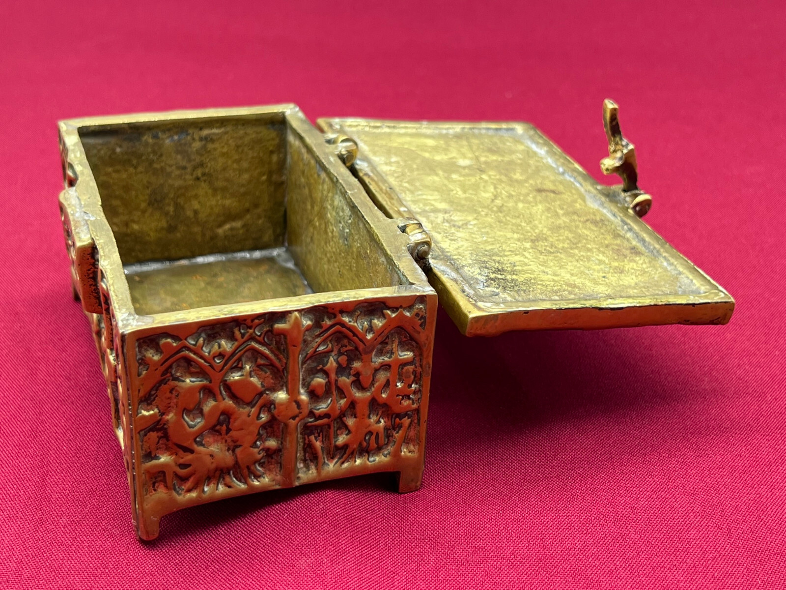 Massive neogotische Schatulle aus Messing, am Boden altgelötet. Abmessungen BTH 13/8/7cm.