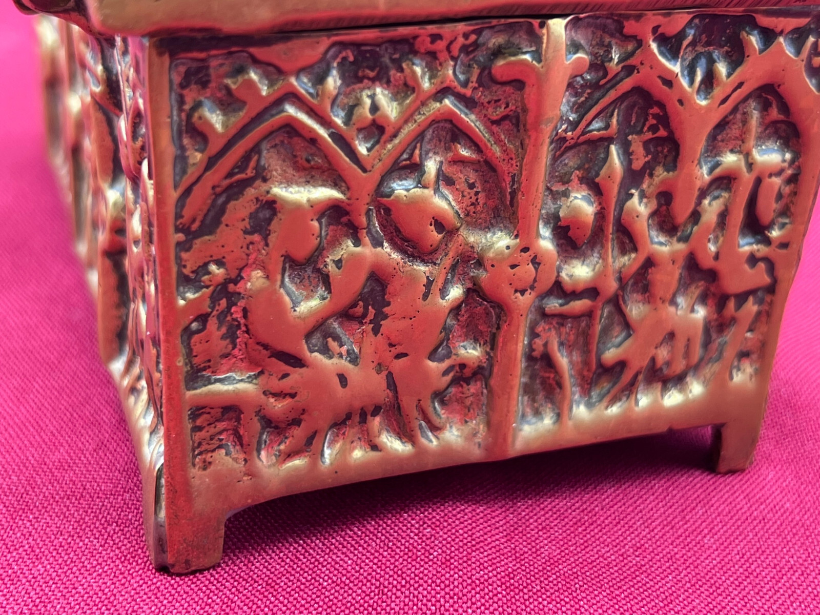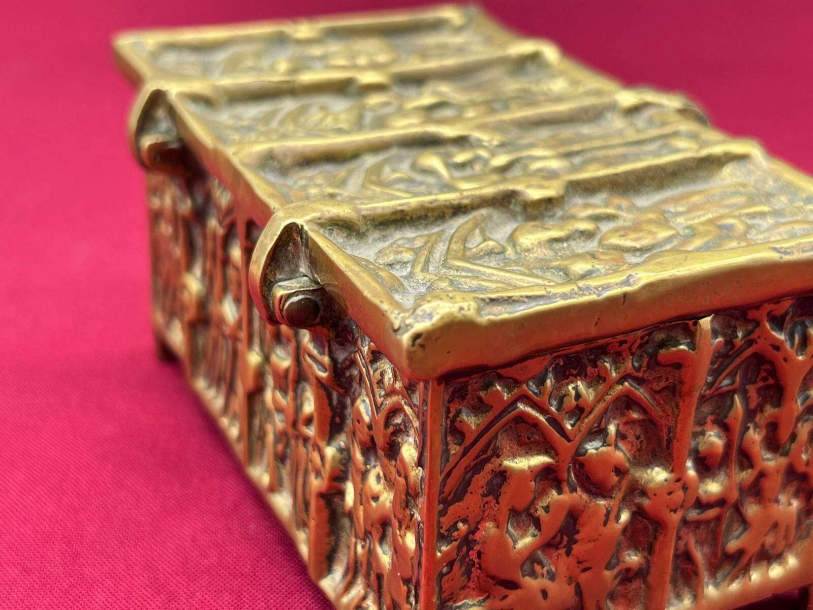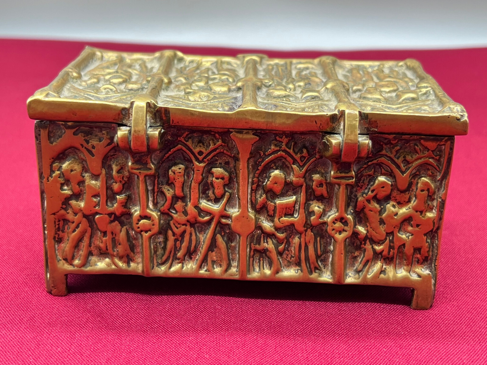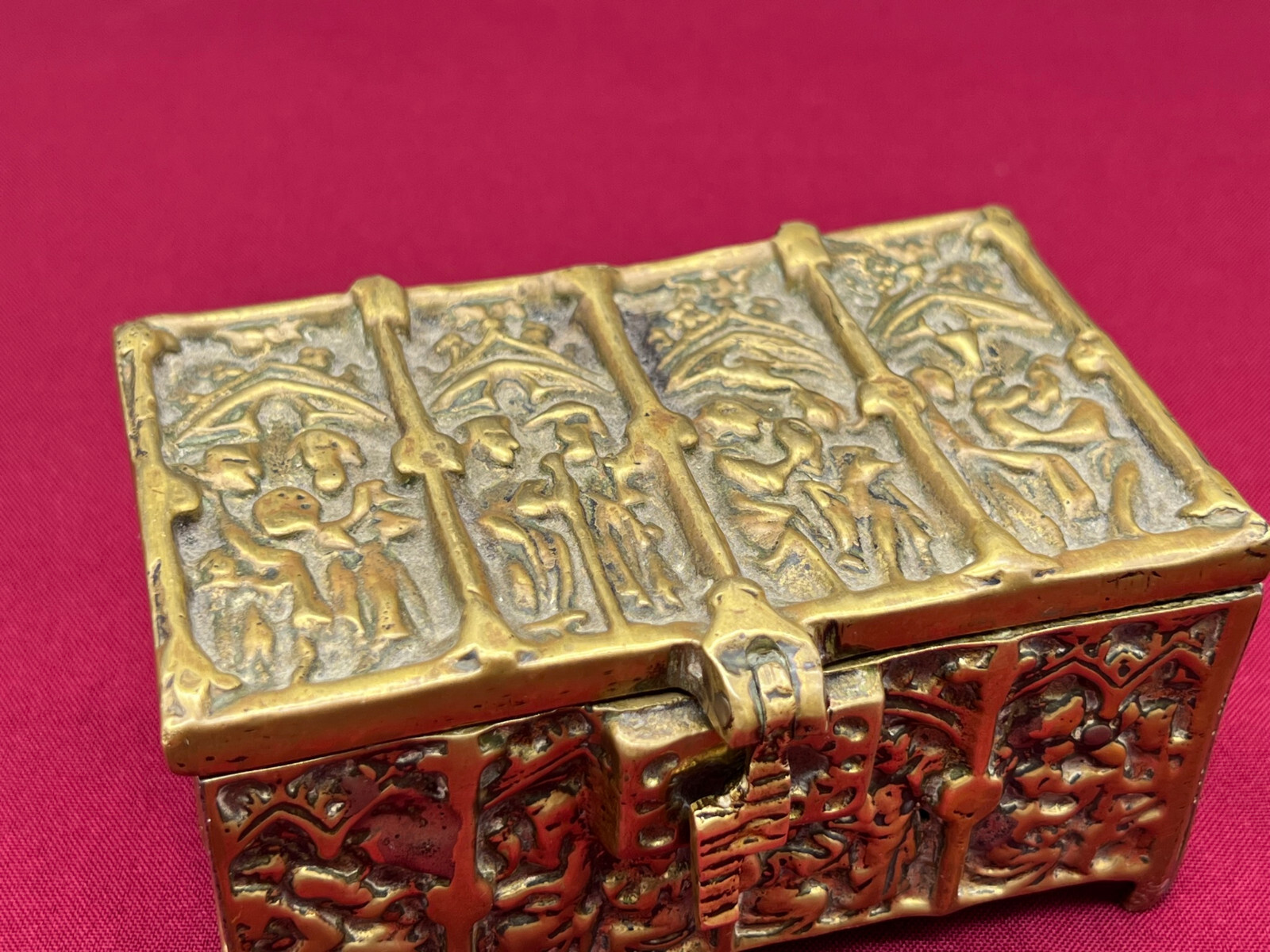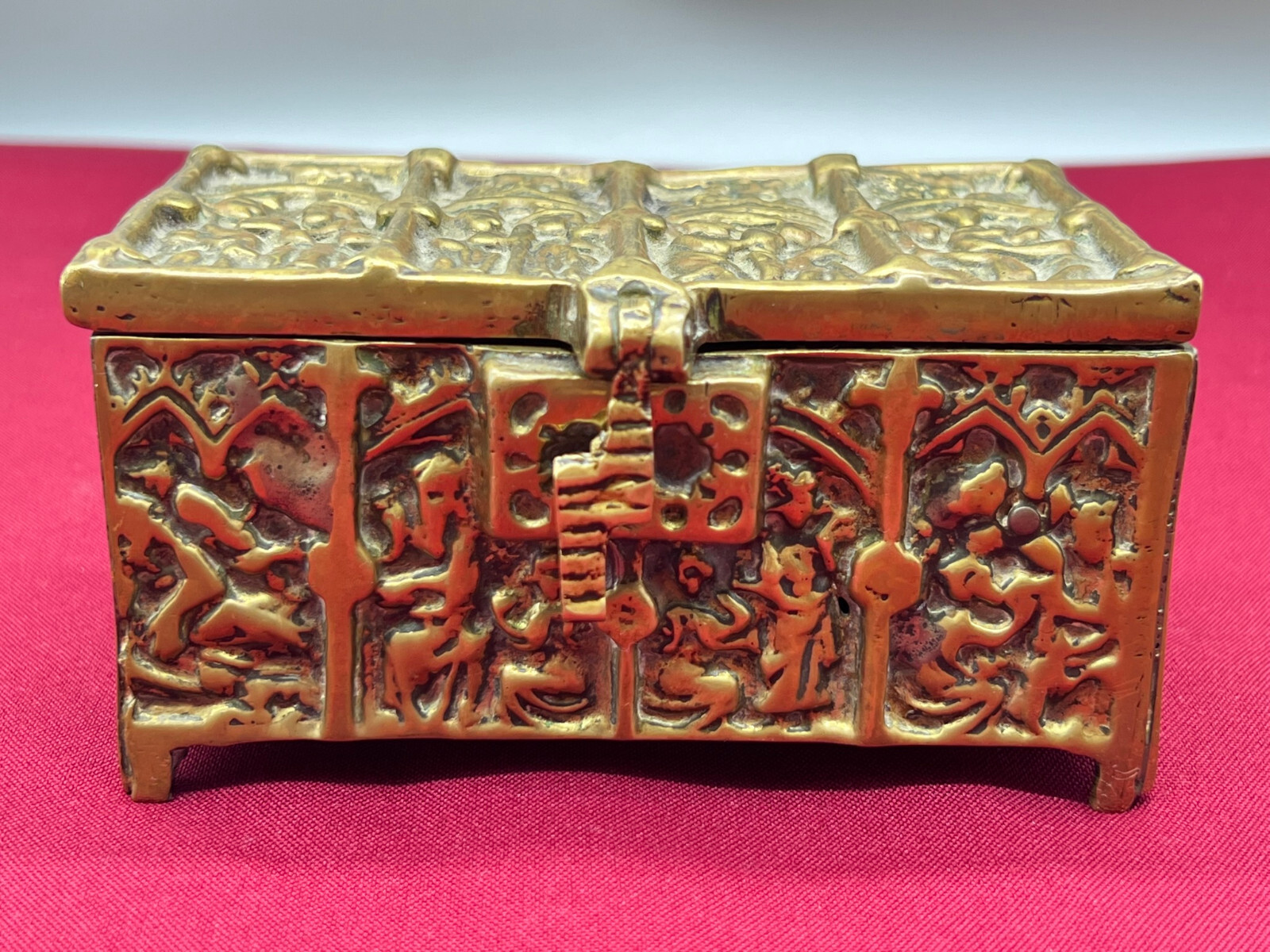 Massive neogotische Schatulle aus Messing, am Boden altgelötet. Abmessungen BTH 13/8/7cm.