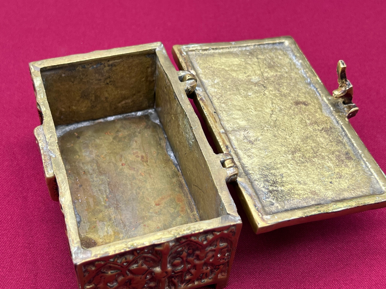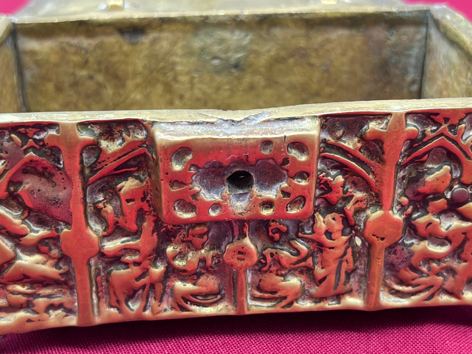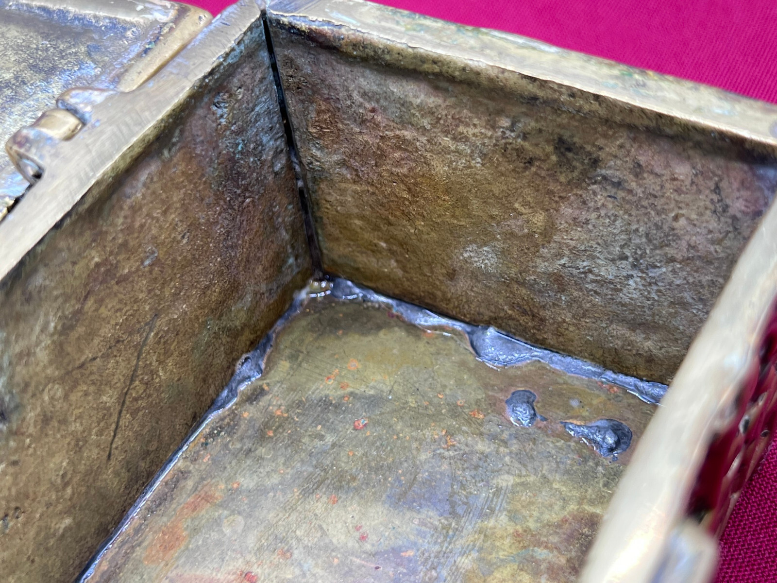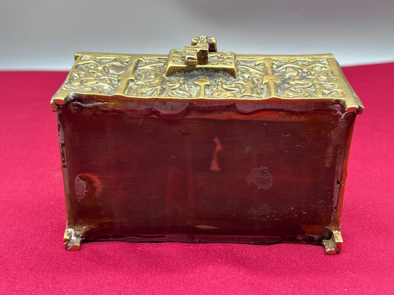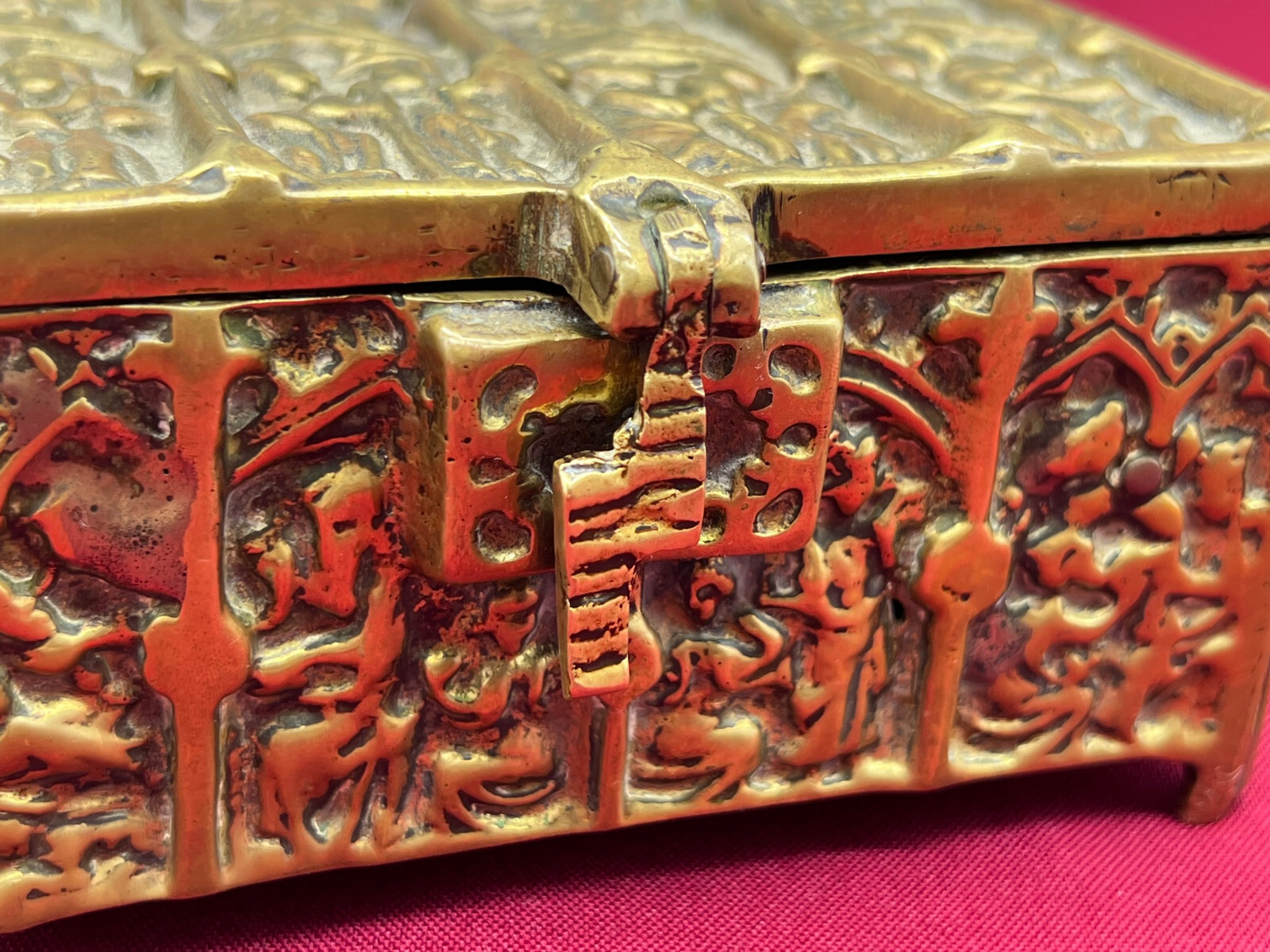 Massive neogotische Schatulle aus Messing, am Boden altgelötet. Abmessungen BTH 13/8/7cm.