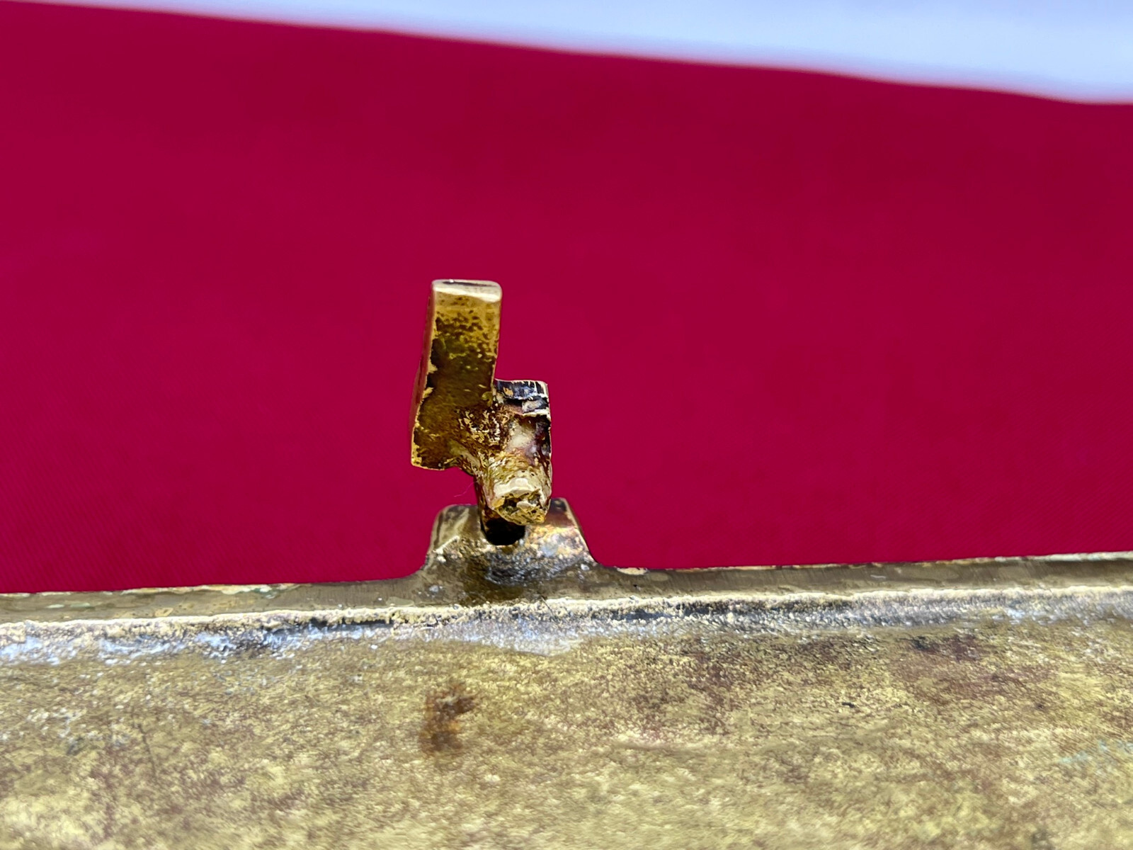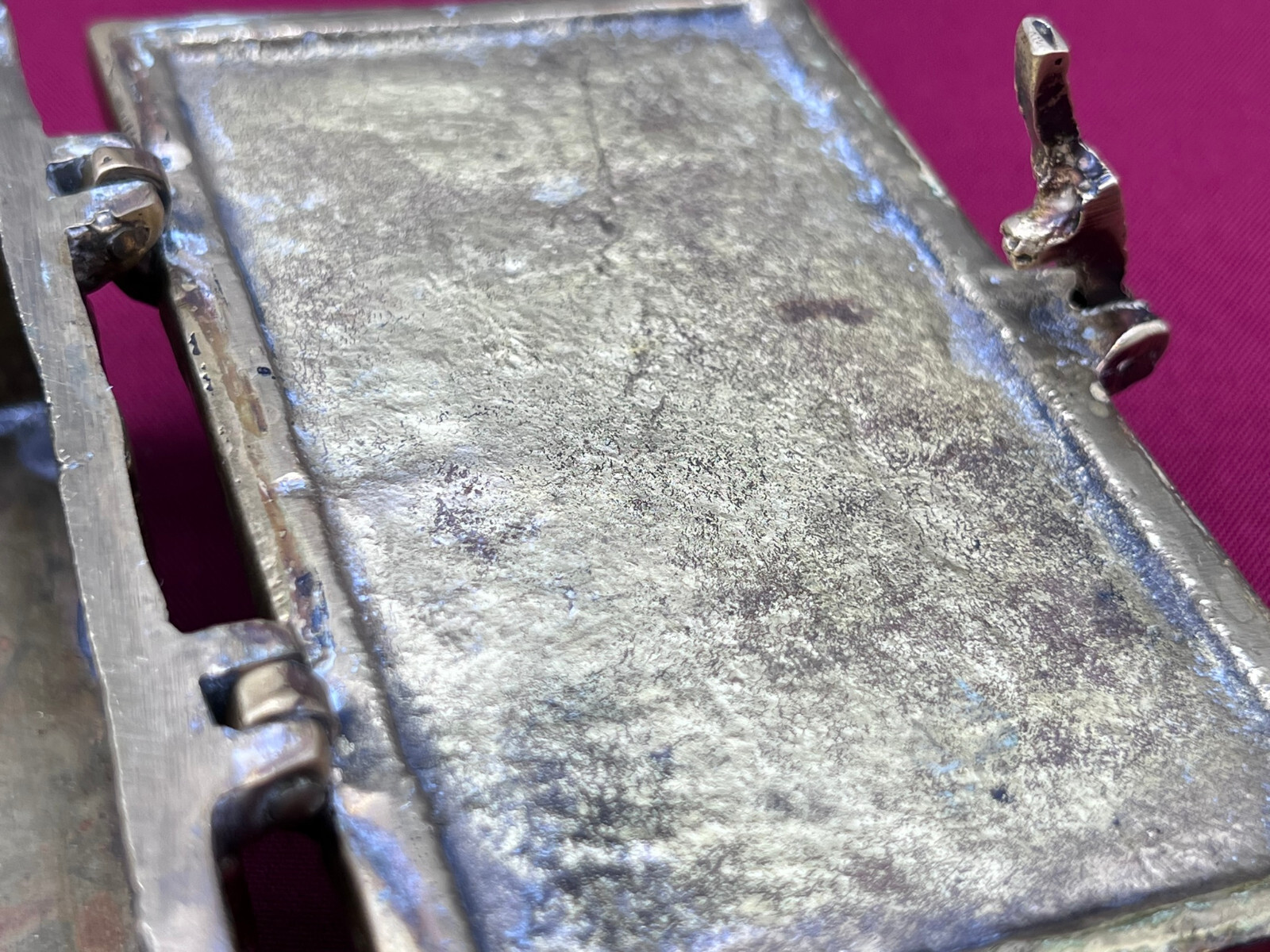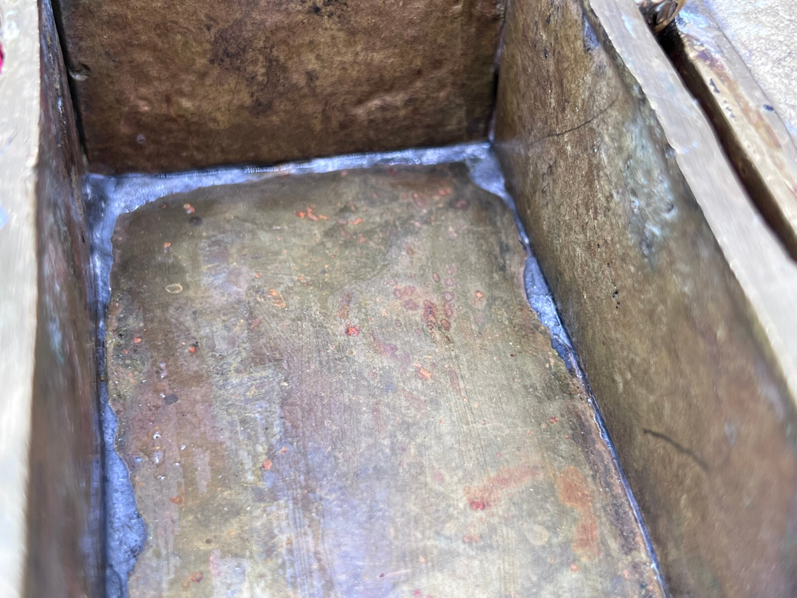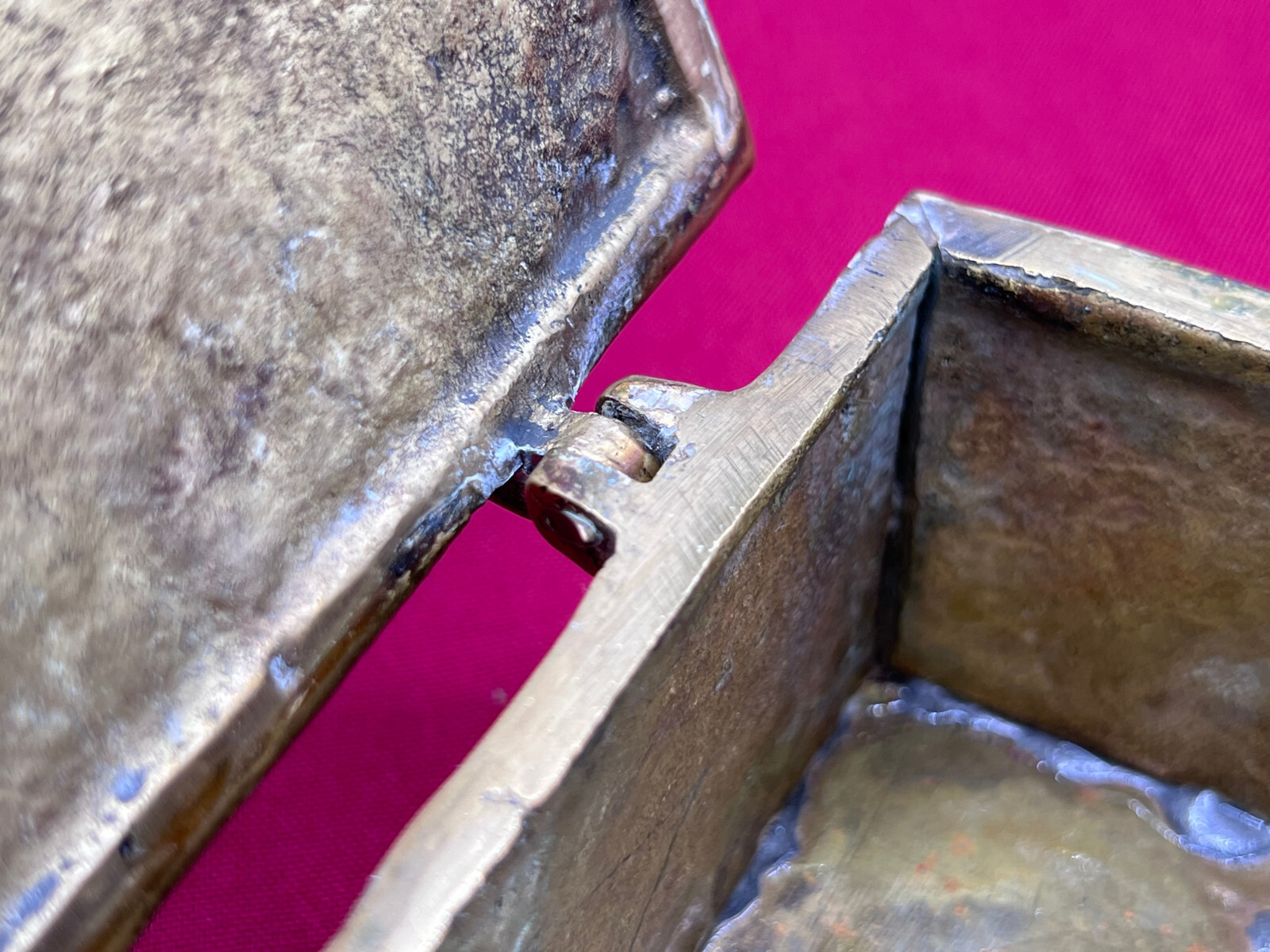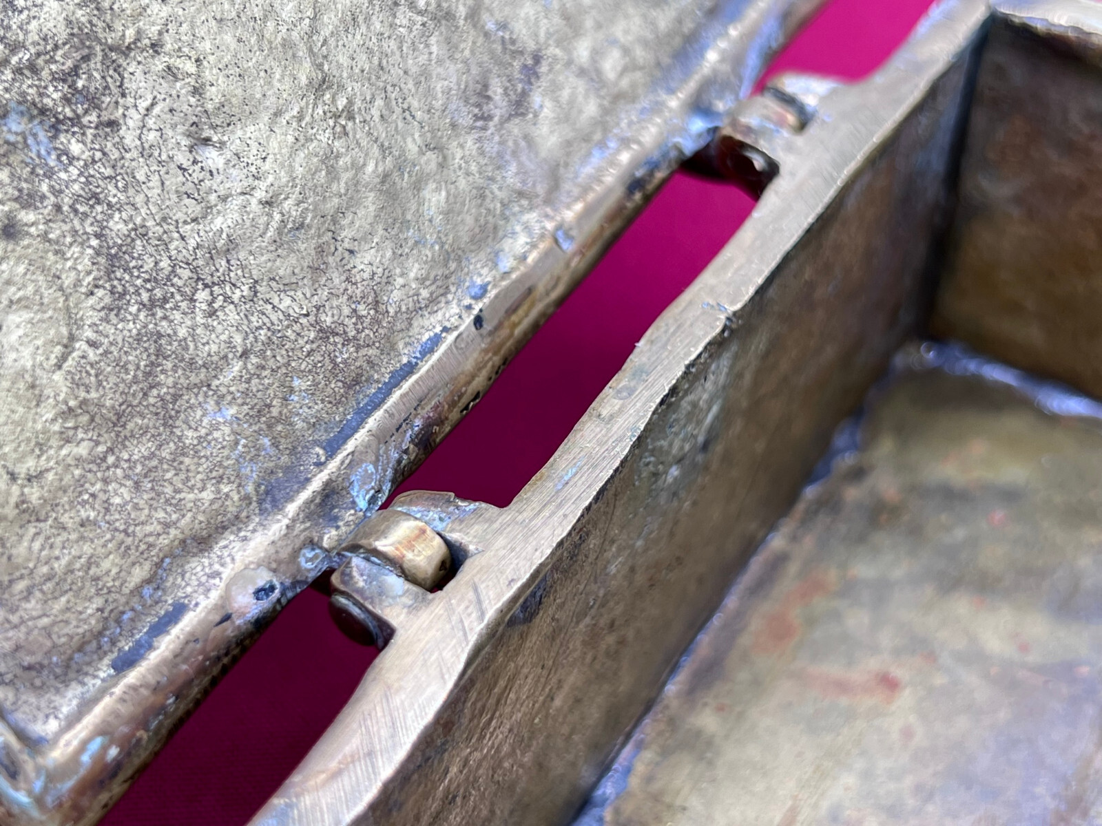 Massive neogotische Schatulle aus Messing, am Boden altgelötet. Abmessungen BTH 13/8/7cm.