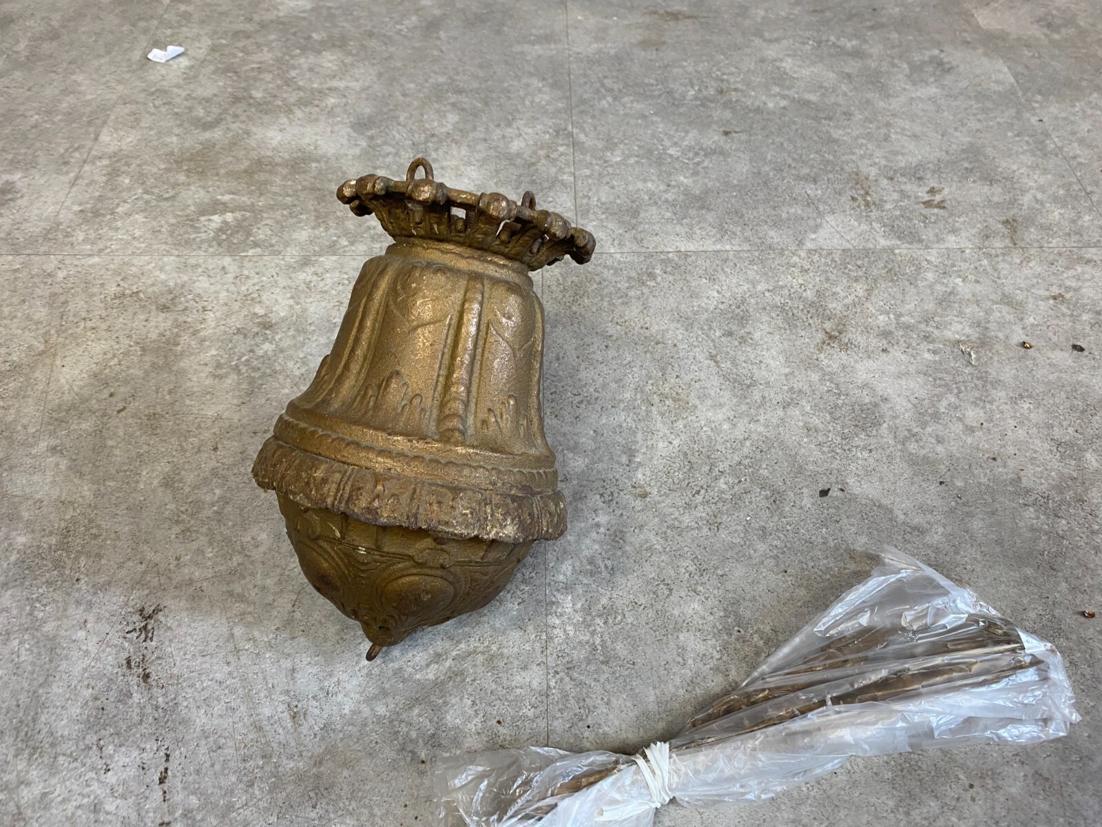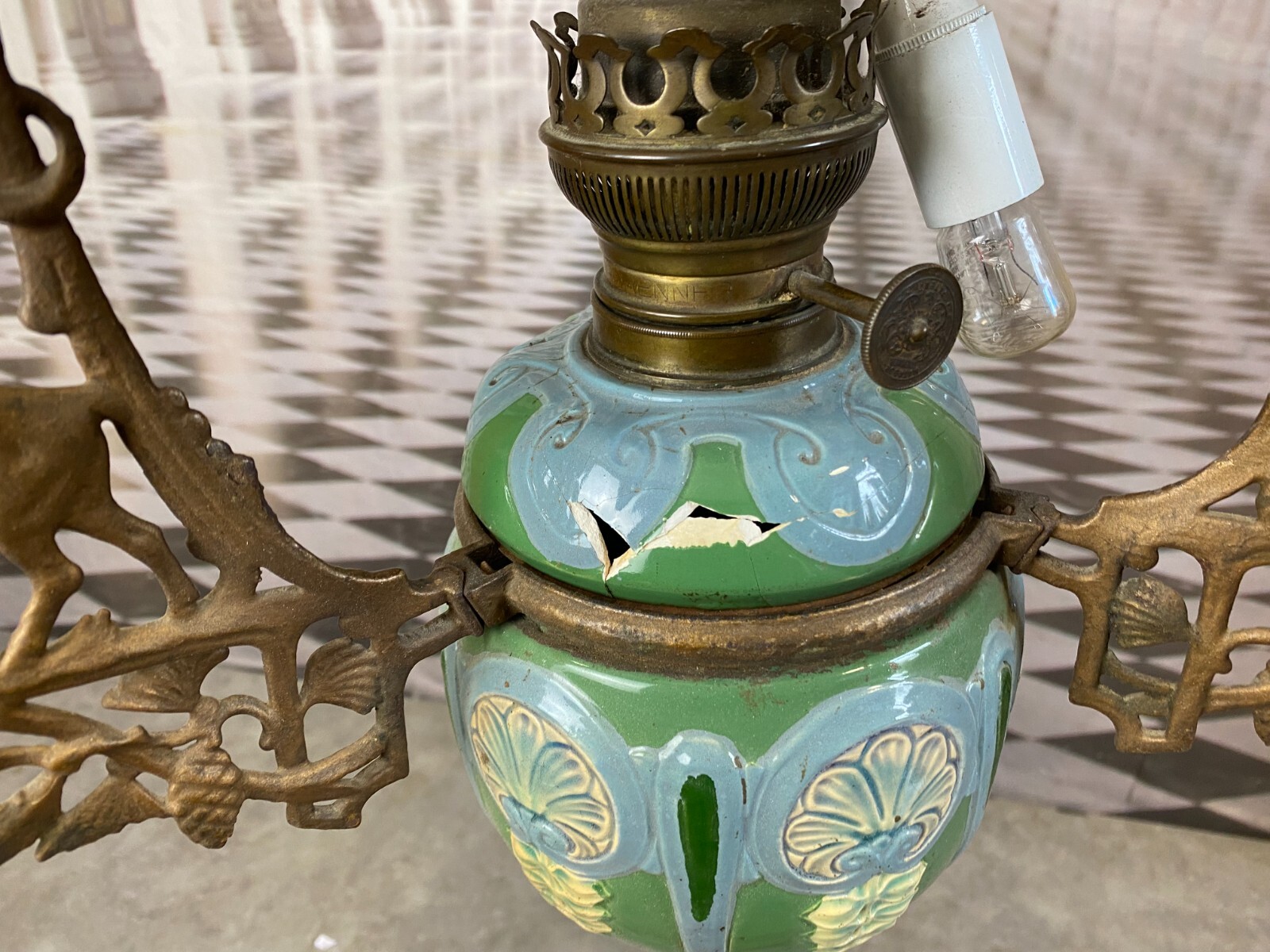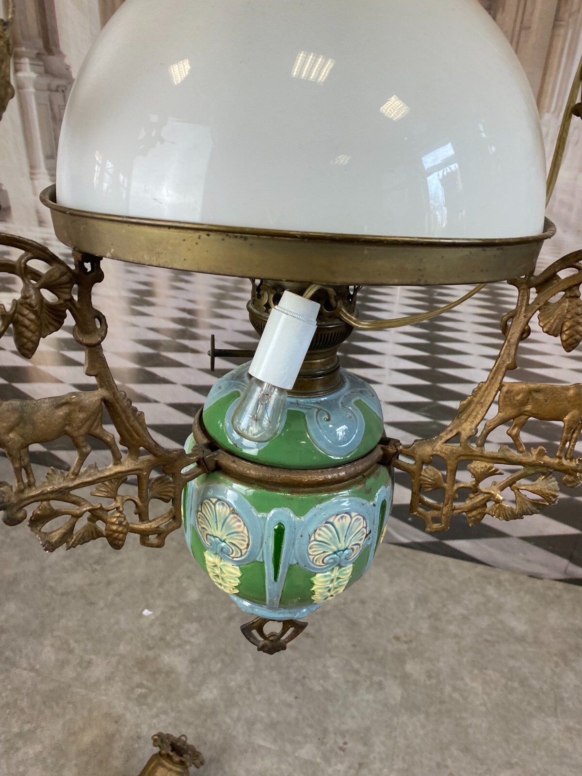 Antike Öllampe aus Metall und Keramik, elektrifiziert. Die Eisenteile sind korrodiert, die Halterungen und Hirschdekore angelaufen und zum Teil verbogen. Die Keramik am Brenneinsatz gebrochen, altgeklebt und unvollständig. Mit grossem Lampenschirm, ohne Brennglasaufsatz. Höhe / Durchmesser 145/40cm. Die Elektrifizierung ist nicht professionell ausgeführt worden, wir geben diese kostenlos dazu.