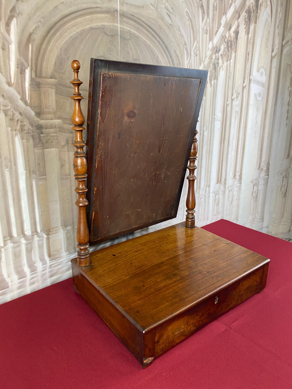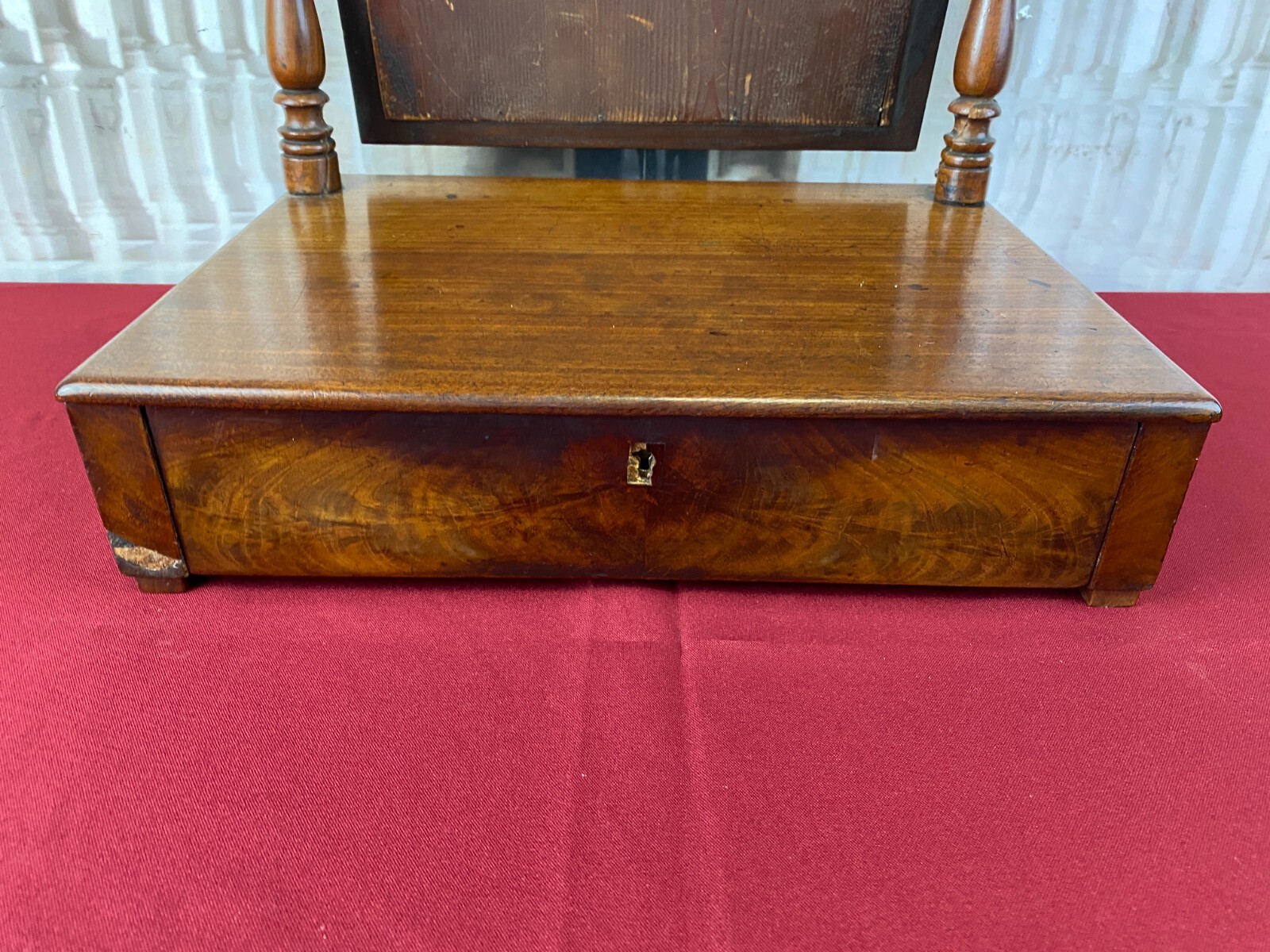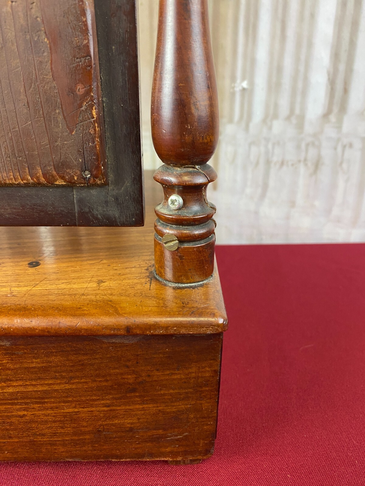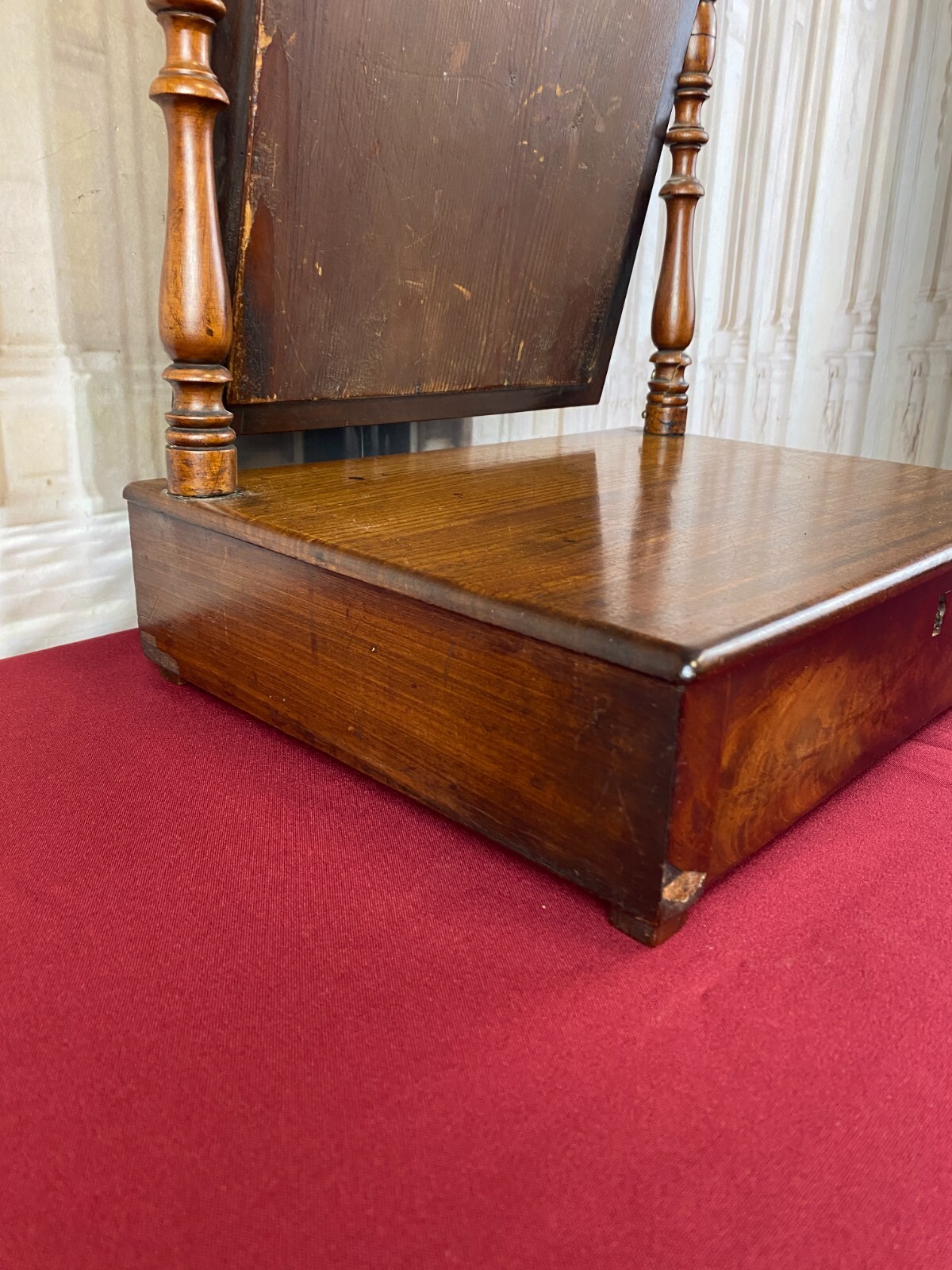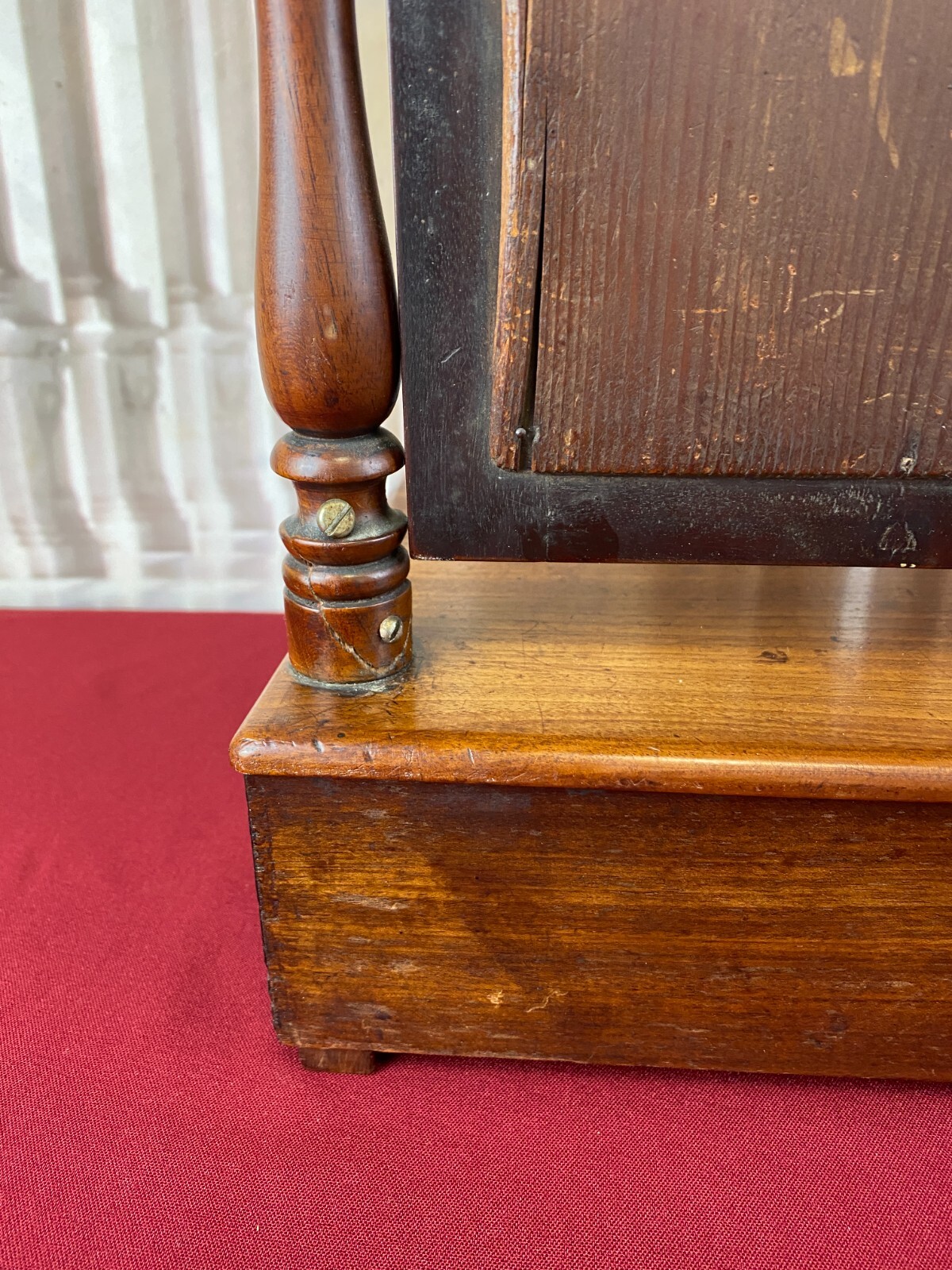 Antike Psyche, aus Mahagoni, um 1890. An der Oberfläche Druckstellen und Flecken. Ohne Schlüssel, am Schlüsselloch leicht beschädigt. Die beiden Halterungen des Spiegels wurden mal neu befestigt und zusätzlich an der Basis geschraubt. An der unteren Kante links, vorne und seitlich Furnierschäden. Das Möbel kann nicht zerlegt werden, der Spiegel ist fleckig. Abmessungen BTH: 39x29x55cm.