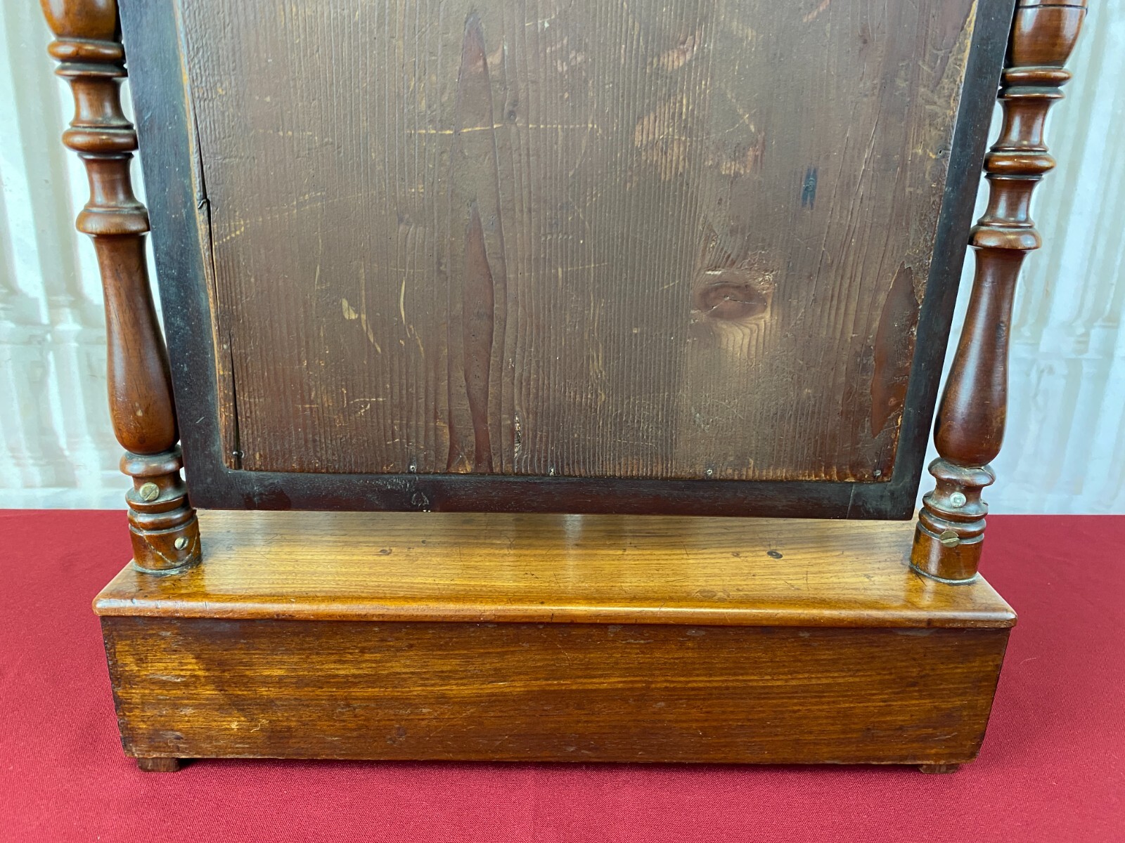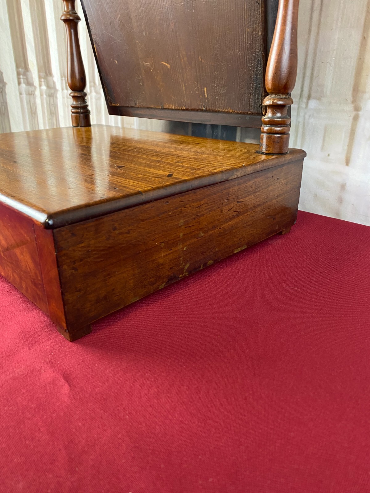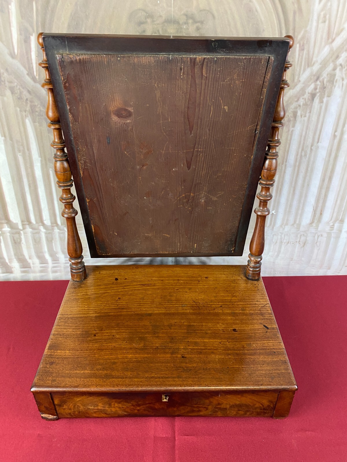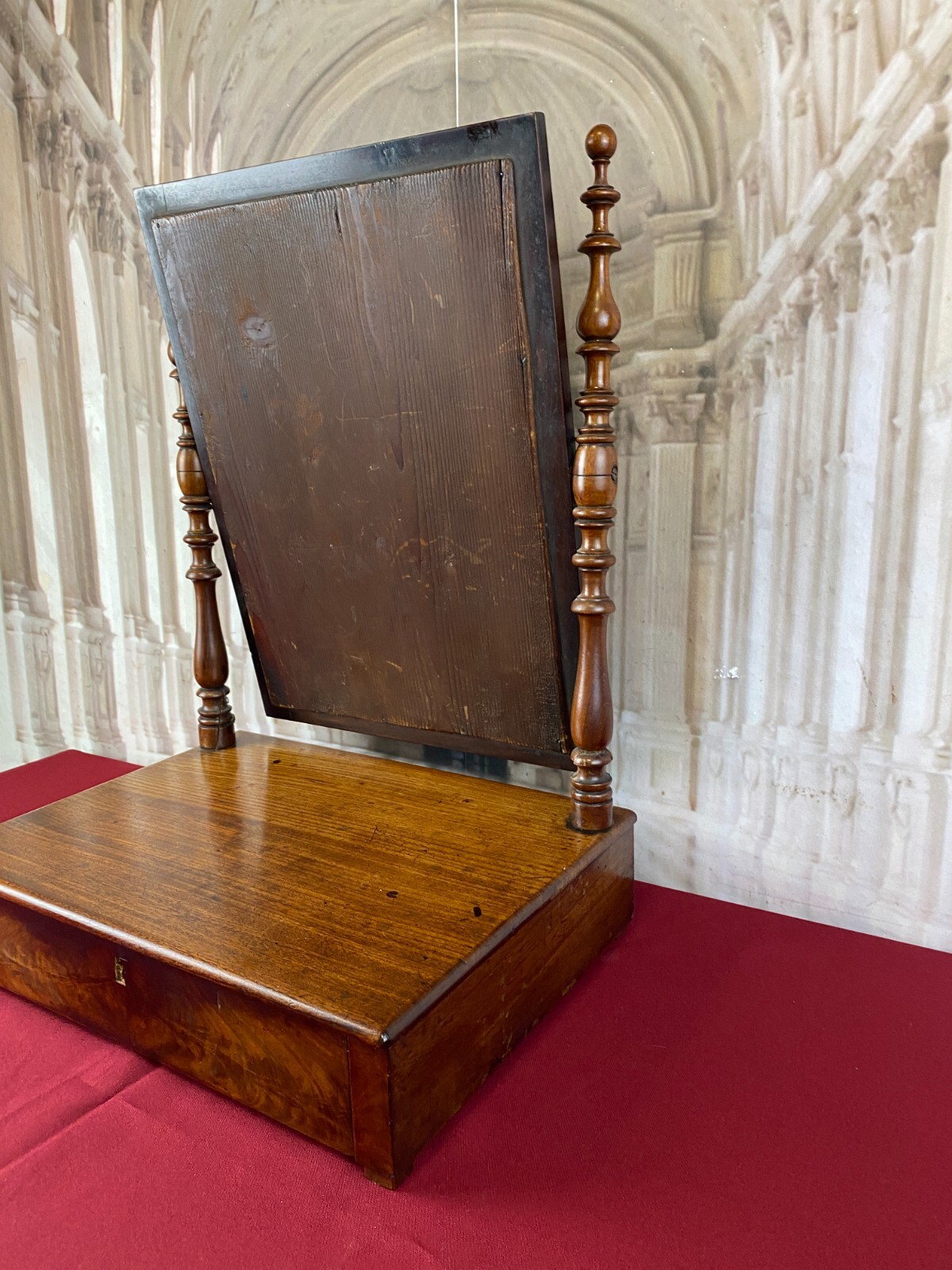 Antike Psyche, aus Mahagoni, um 1890. An der Oberfläche Druckstellen und Flecken. Ohne Schlüssel, am Schlüsselloch leicht beschädigt. Die beiden Halterungen des Spiegels wurden mal neu befestigt und zusätzlich an der Basis geschraubt. An der unteren Kante links, vorne und seitlich Furnierschäden. Das Möbel kann nicht zerlegt werden, der Spiegel ist fleckig. Abmessungen BTH: 39x29x55cm.