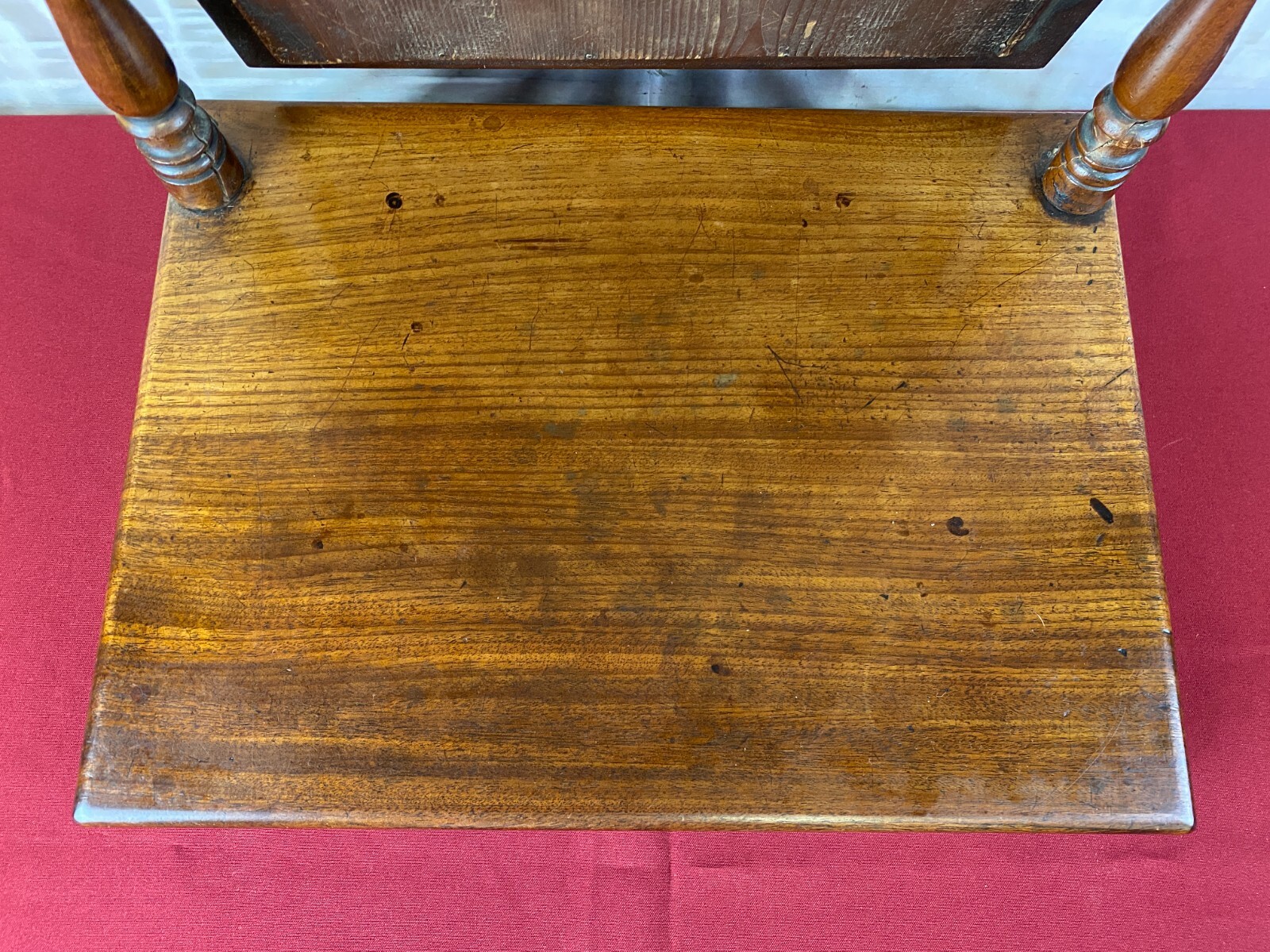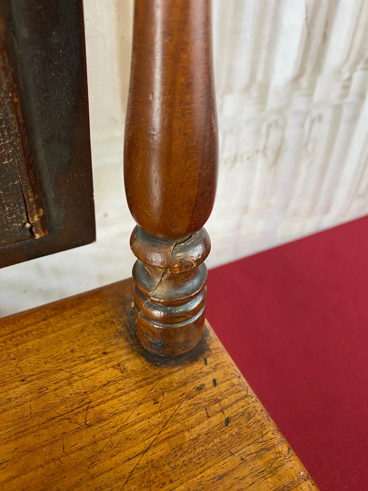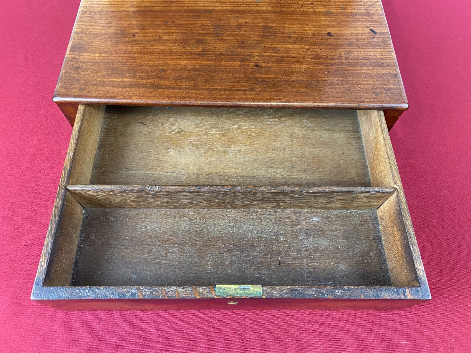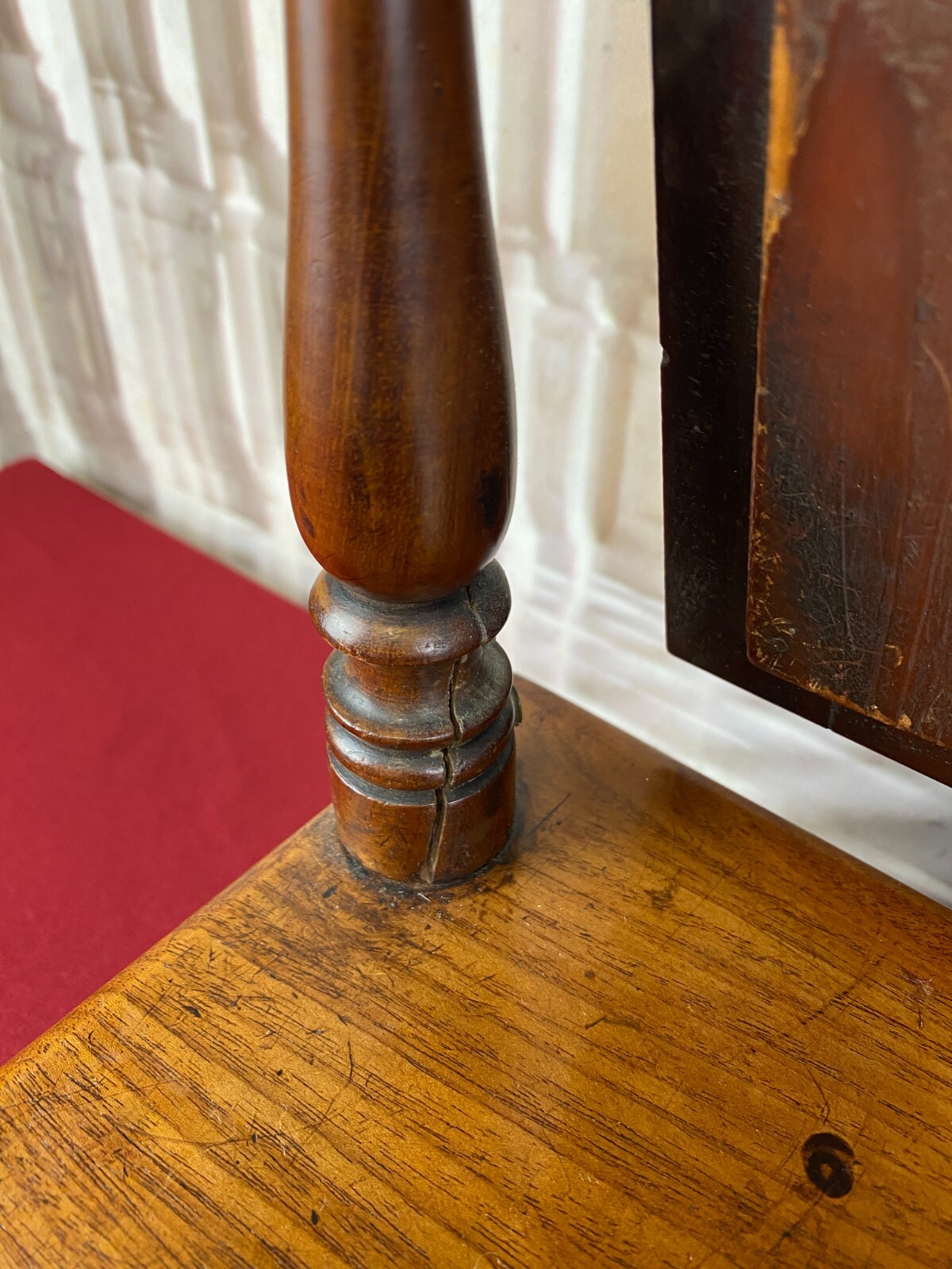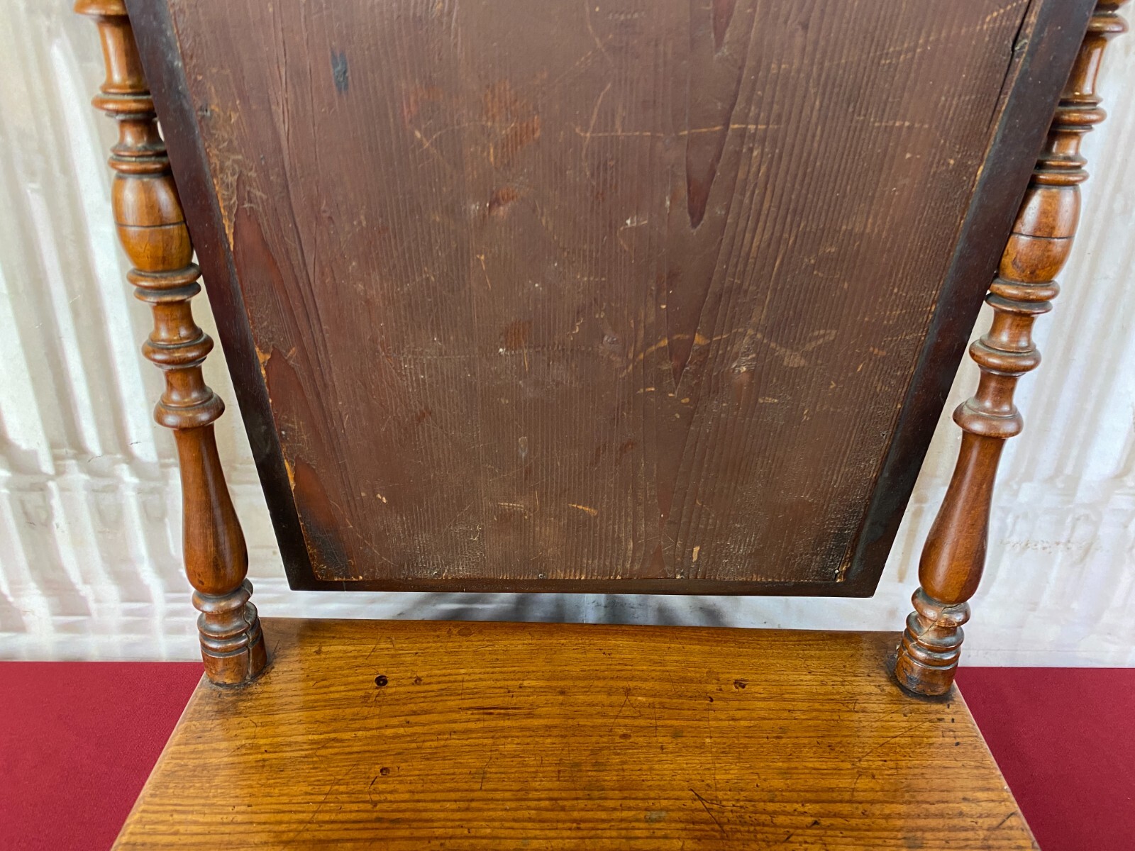 Antike Psyche, aus Mahagoni, um 1890. An der Oberfläche Druckstellen und Flecken. Ohne Schlüssel, am Schlüsselloch leicht beschädigt. Die beiden Halterungen des Spiegels wurden mal neu befestigt und zusätzlich an der Basis geschraubt. An der unteren Kante links, vorne und seitlich Furnierschäden. Das Möbel kann nicht zerlegt werden, der Spiegel ist fleckig. Abmessungen BTH: 39x29x55cm.