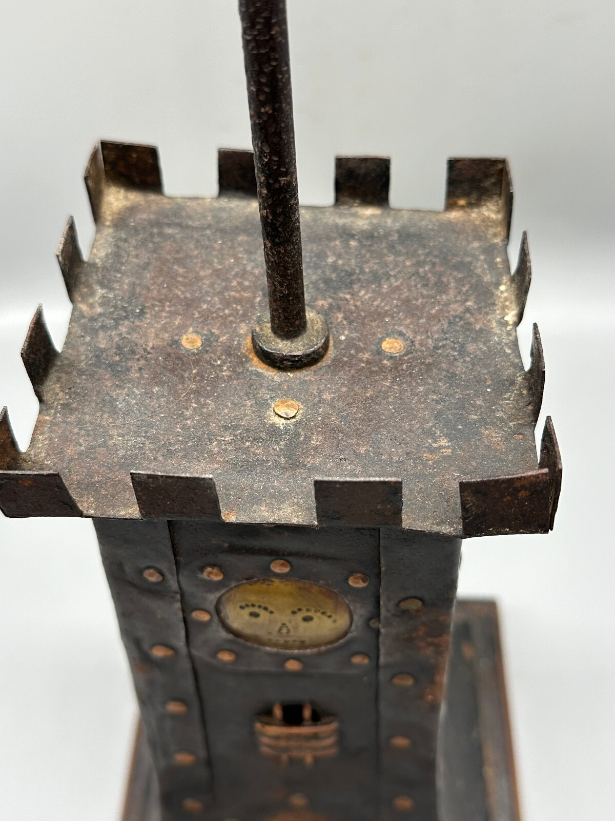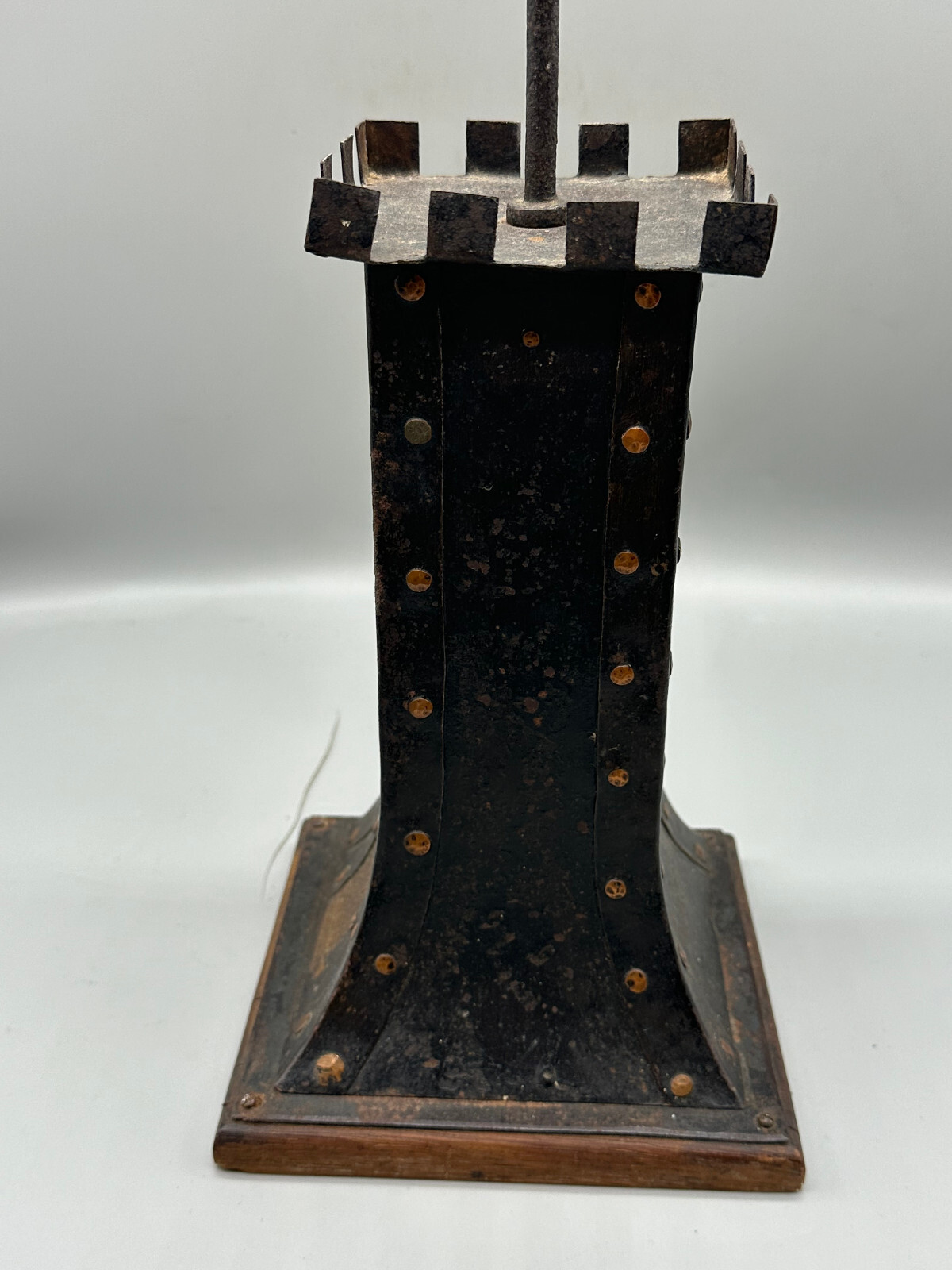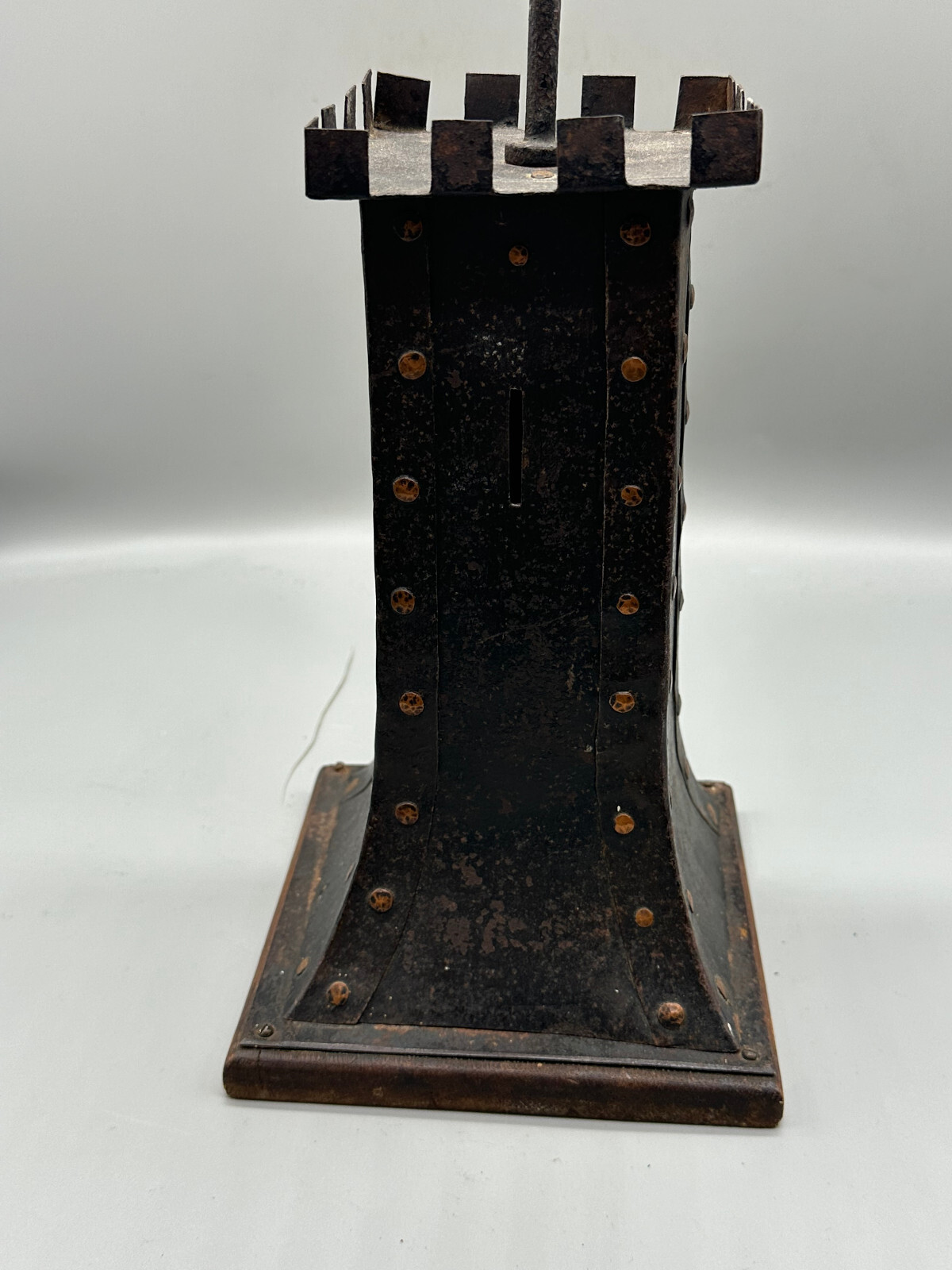 Antike handgemachte Sparbüchse aus Metall auf Holzpodest um 1920 . An der gesamten Oberfläche Korrosion und kleinere Verbiegungen . Die Spardose kann nicht geöffnet werden. Abmessungen BTH 16.5/16.5/49cm.