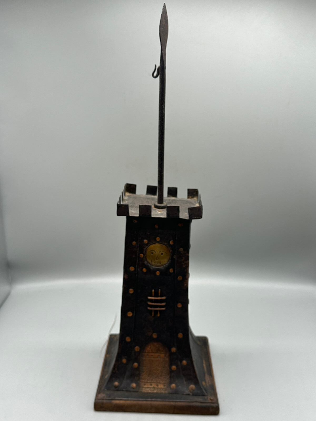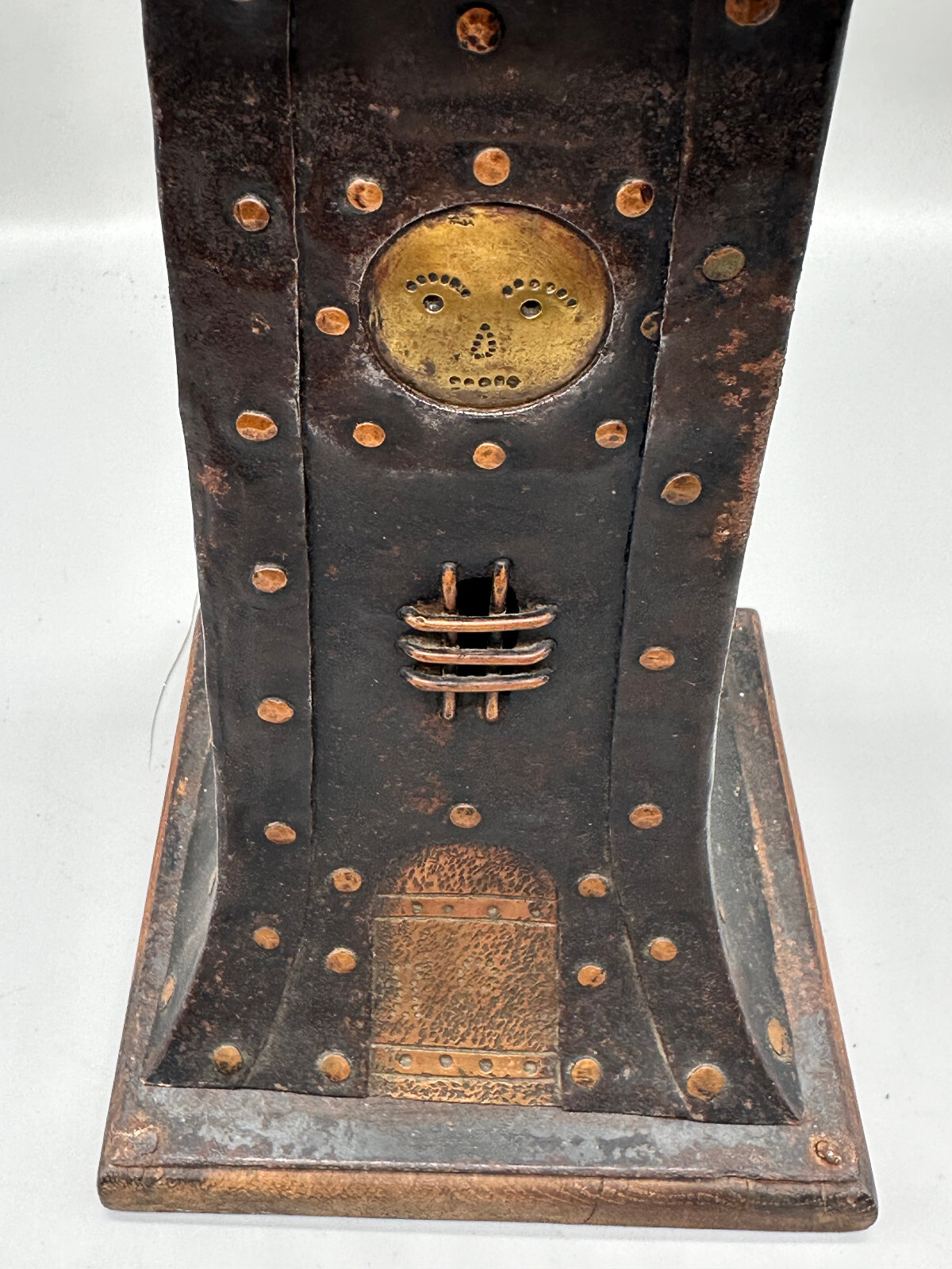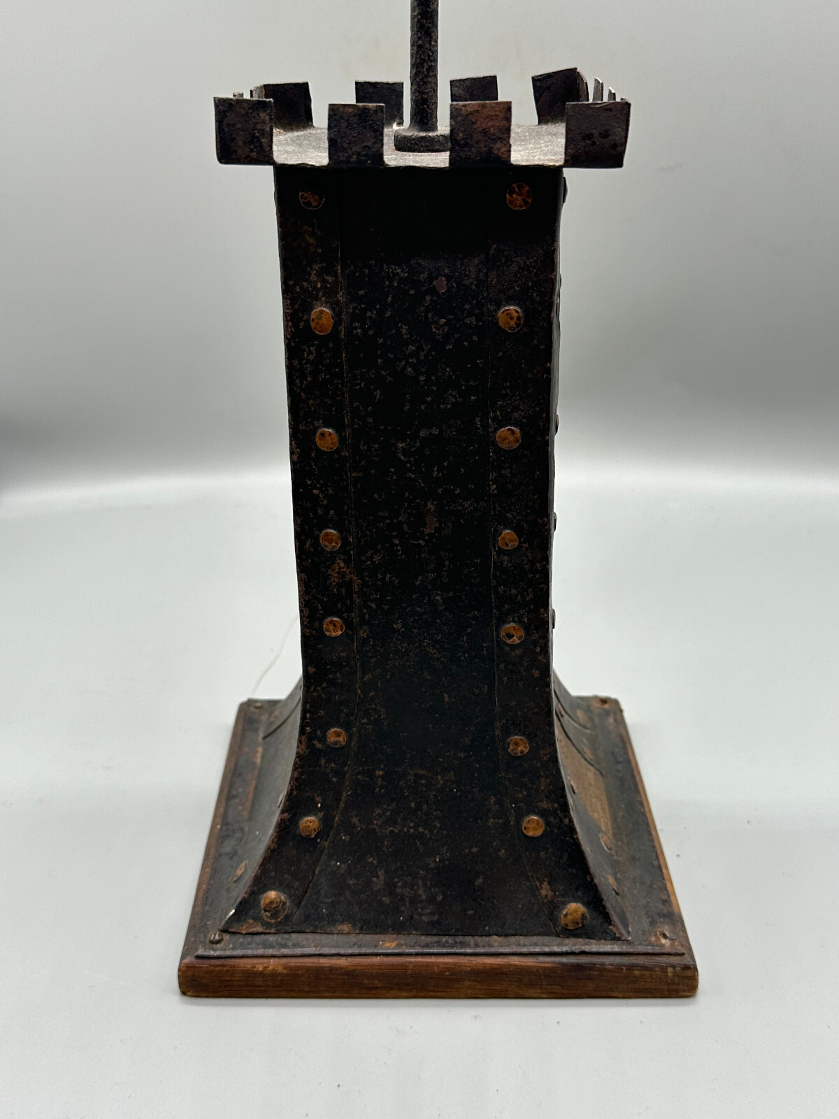 Antike handgemachte Sparbüchse aus Metall auf Holzpodest um 1920 . An der gesamten Oberfläche Korrosion und kleinere Verbiegungen . Die Spardose kann nicht geöffnet werden. Abmessungen BTH 16.5/16.5/49cm.