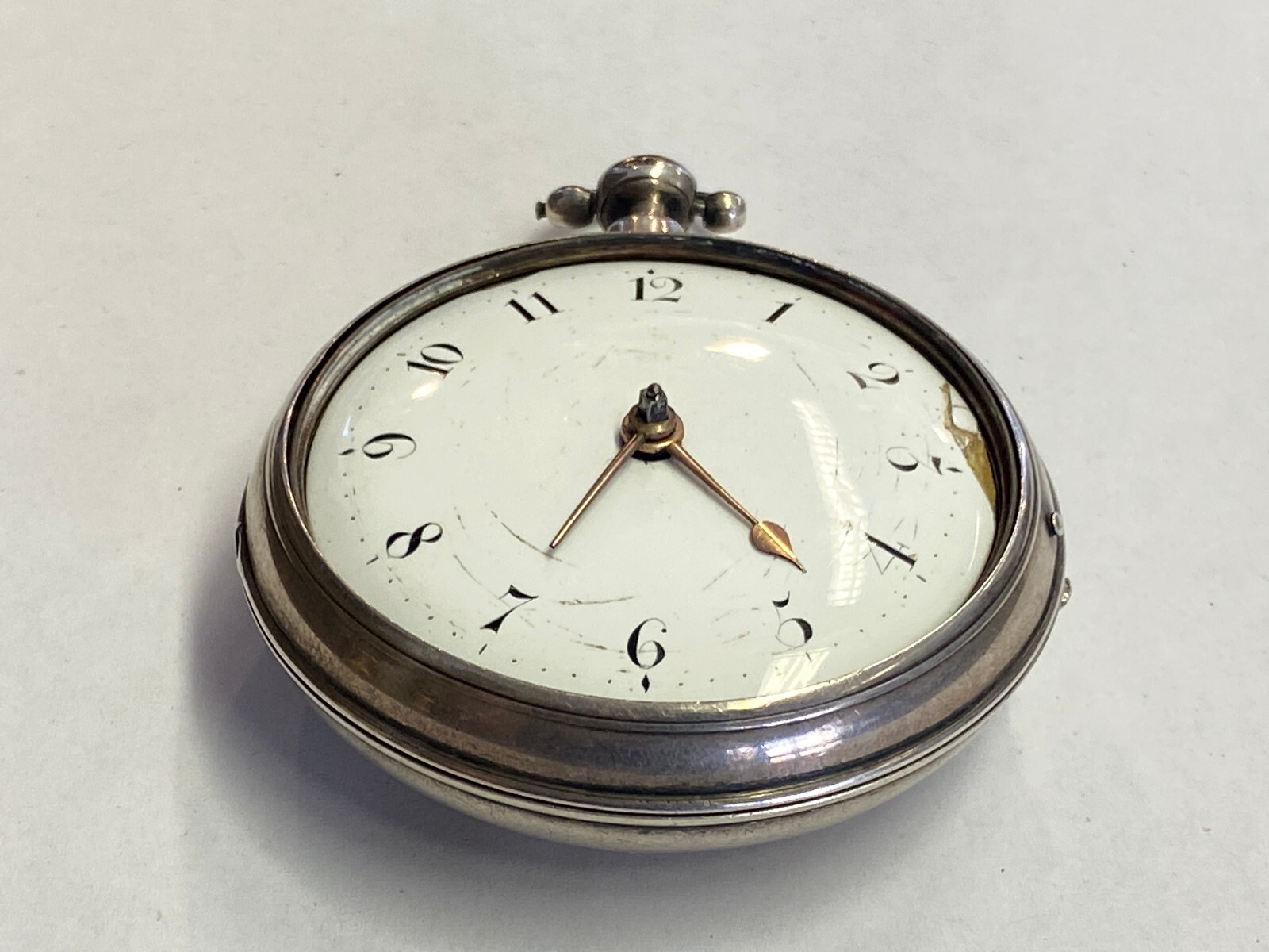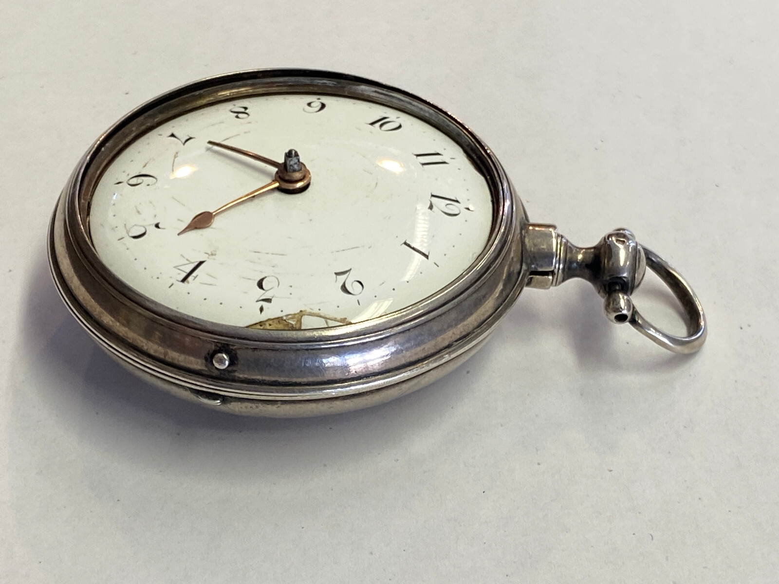 Antike Taschenuhr aus Sterling Silber, voll punziert. Gehäuse zum Teil berieben und verdellt, Ziffernblatt zum Teil beschädigt. Ohne Glas. Die Uhr kann aufgezogen werden, spult jedoch sofort den Aufzug ab. Der Verkauf erfolgt OHNE Schlüssel und als defekte, möglicherweise unvollständige Bastlerware. Am inneren Scharnier muss ein Befestigungsstift eingesetzt werden. Gesamtdurchmesser 55mm, Stärke 25mm, Gesamtgewicht 119g.