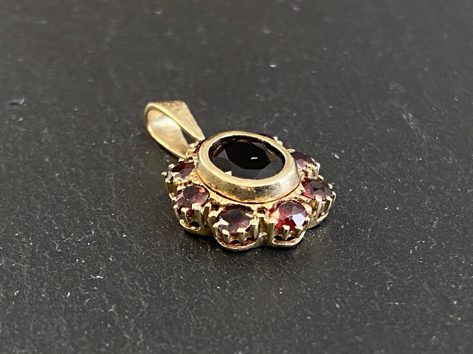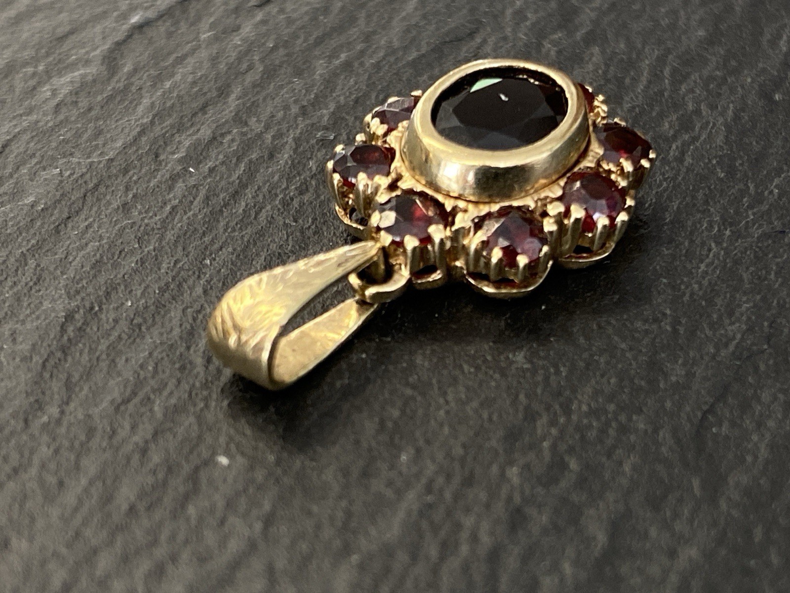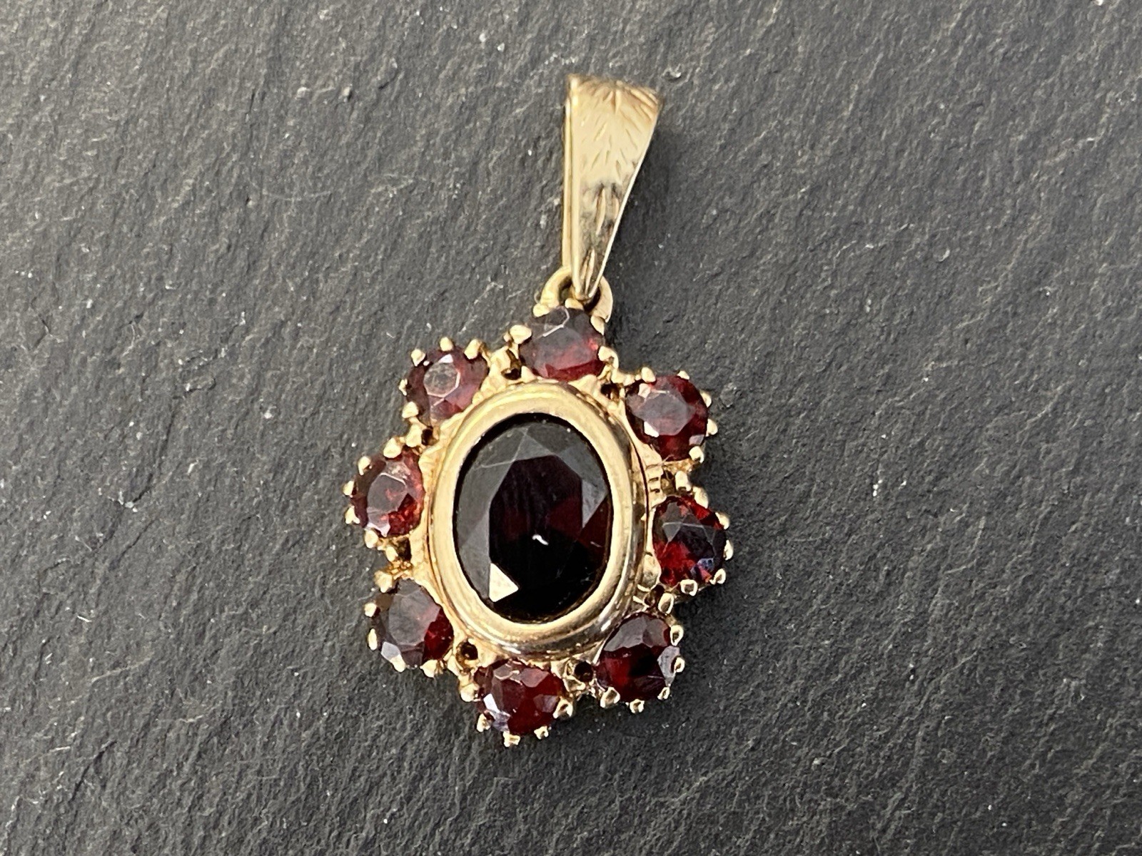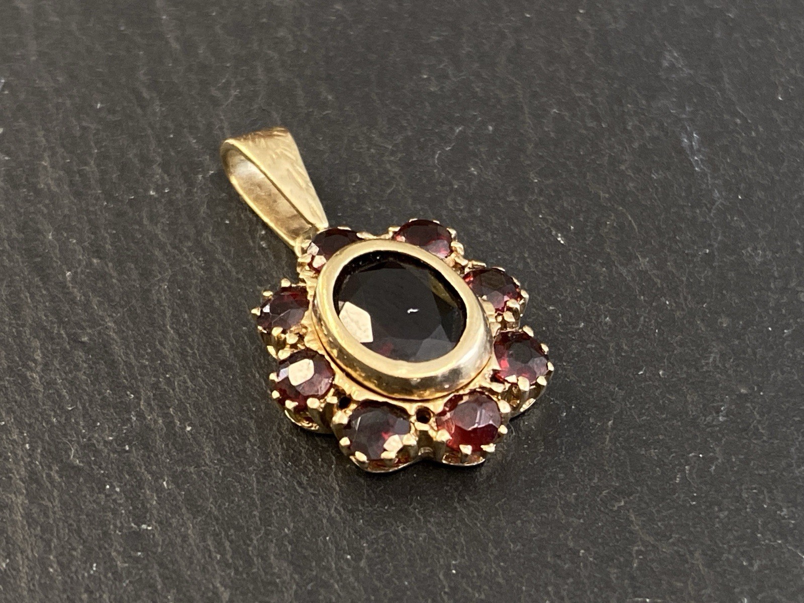 Kettenanhänger aus 8K Gelbgold, gestempelt, mit Granaten von zus. ca. 1,25ct., soweit in der Fassung messbar. Der Anhänger wirkt wie eine wunderschöne Blume, wohl Böhmen. Sehr schöner Gesamtzustand. BTH 1,46/0,6/2,5cm, Gesamtgewicht ca. 2,33g. Die Begutachtung der Stücke wird vorgenommen von einem Fachmitglied der deutschen gemmologischen Gesellschaft E.V.