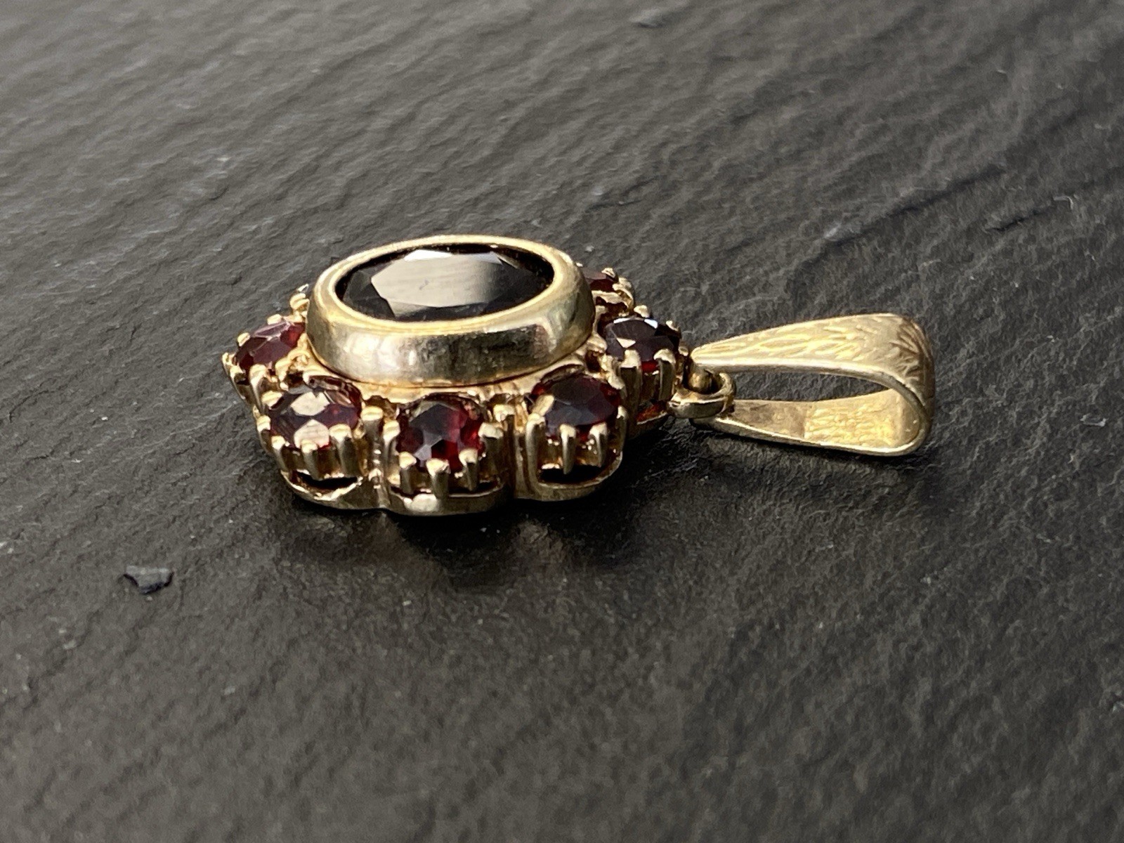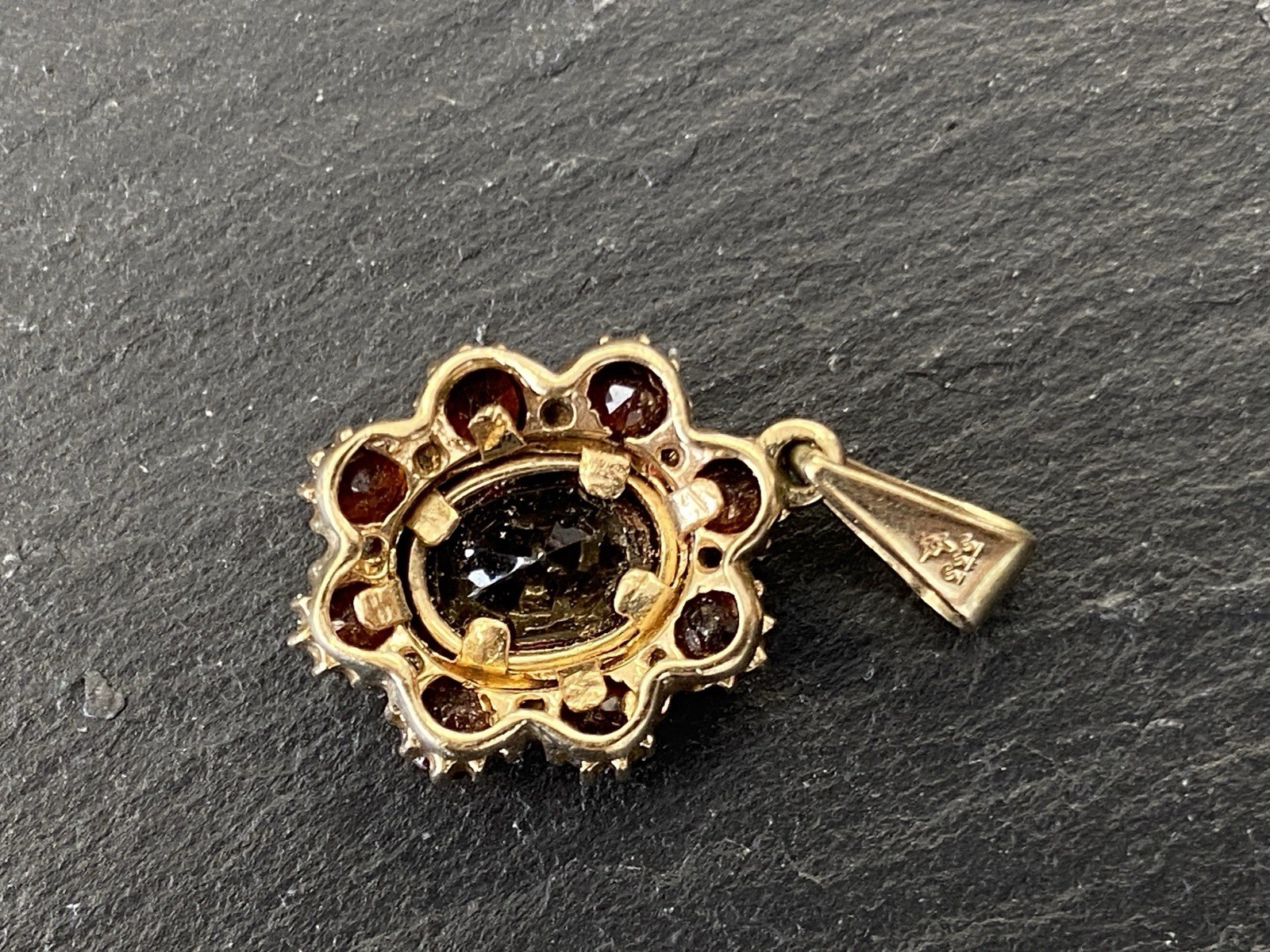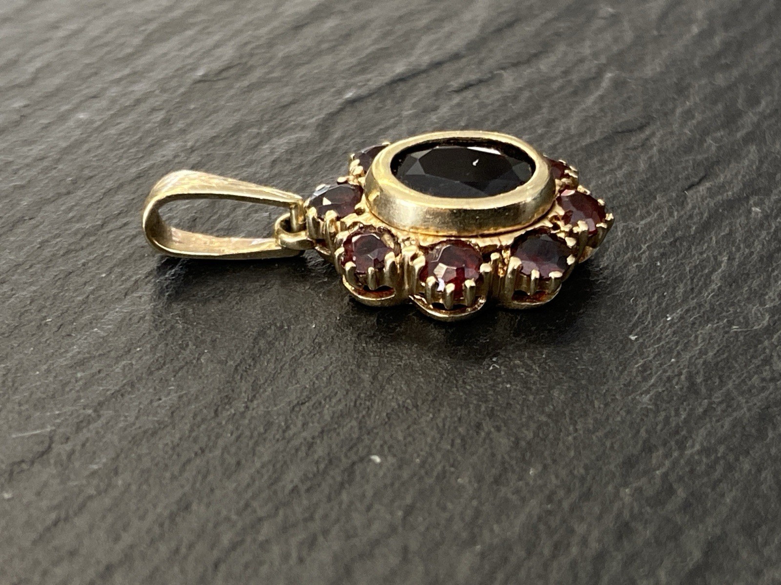 Kettenanhänger aus 8K Gelbgold, gestempelt, mit Granaten von zus. ca. 1,25ct., soweit in der Fassung messbar. Der Anhänger wirkt wie eine wunderschöne Blume, wohl Böhmen. Sehr schöner Gesamtzustand. BTH 1,46/0,6/2,5cm, Gesamtgewicht ca. 2,33g. Die Begutachtung der Stücke wird vorgenommen von einem Fachmitglied der deutschen gemmologischen Gesellschaft E.V.