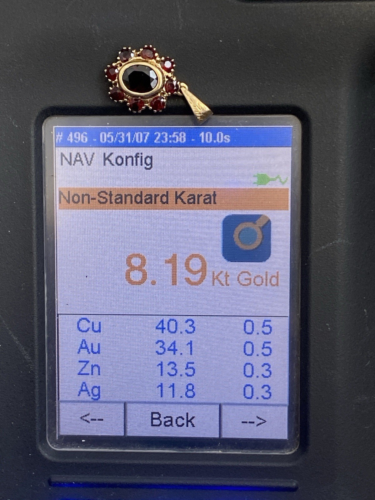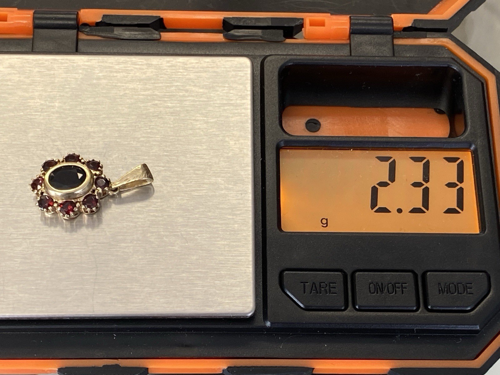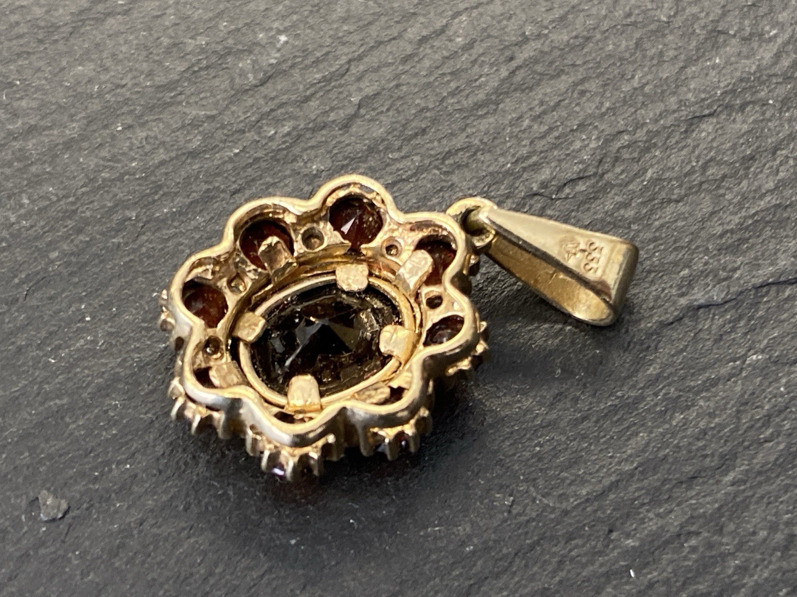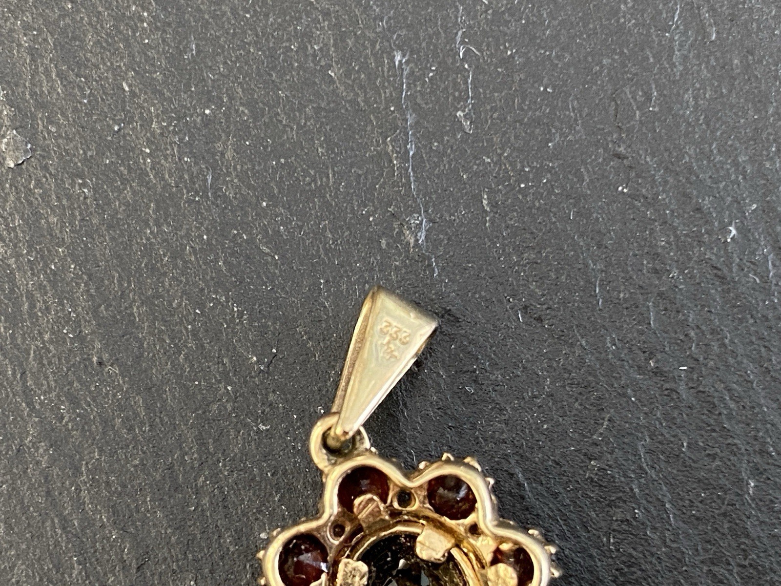 Kettenanhänger aus 8K Gelbgold, gestempelt, mit Granaten von zus. ca. 1,25ct., soweit in der Fassung messbar. Der Anhänger wirkt wie eine wunderschöne Blume, wohl Böhmen. Sehr schöner Gesamtzustand. BTH 1,46/0,6/2,5cm, Gesamtgewicht ca. 2,33g. Die Begutachtung der Stücke wird vorgenommen von einem Fachmitglied der deutschen gemmologischen Gesellschaft E.V.