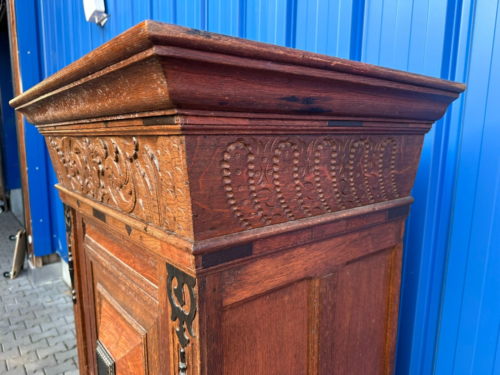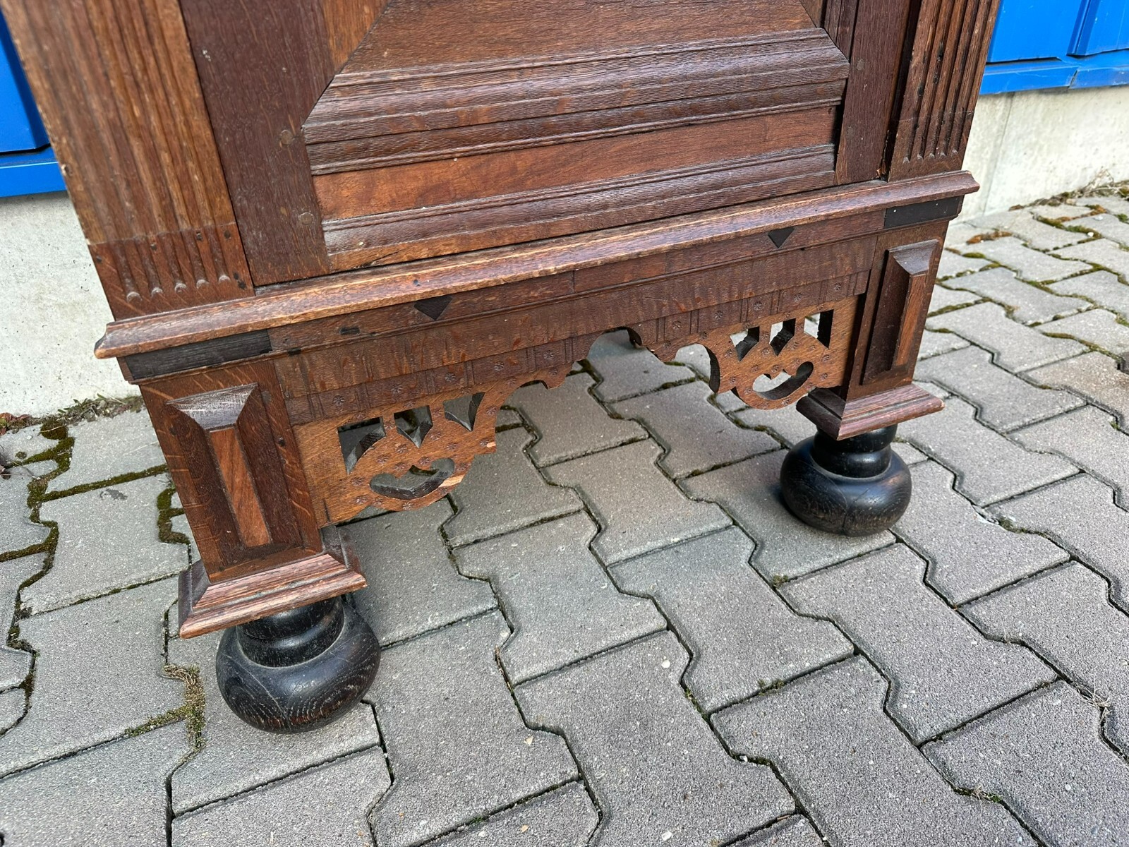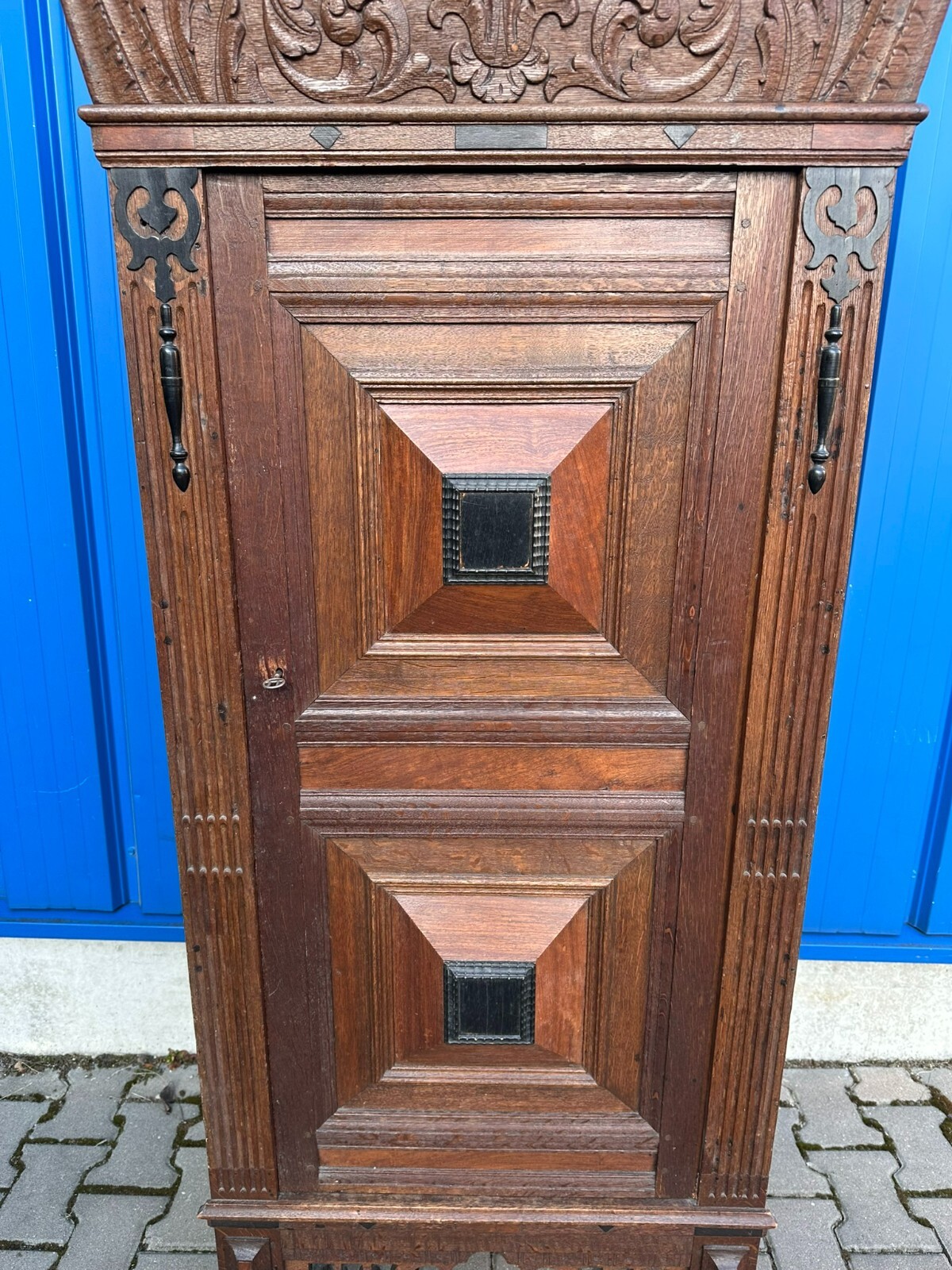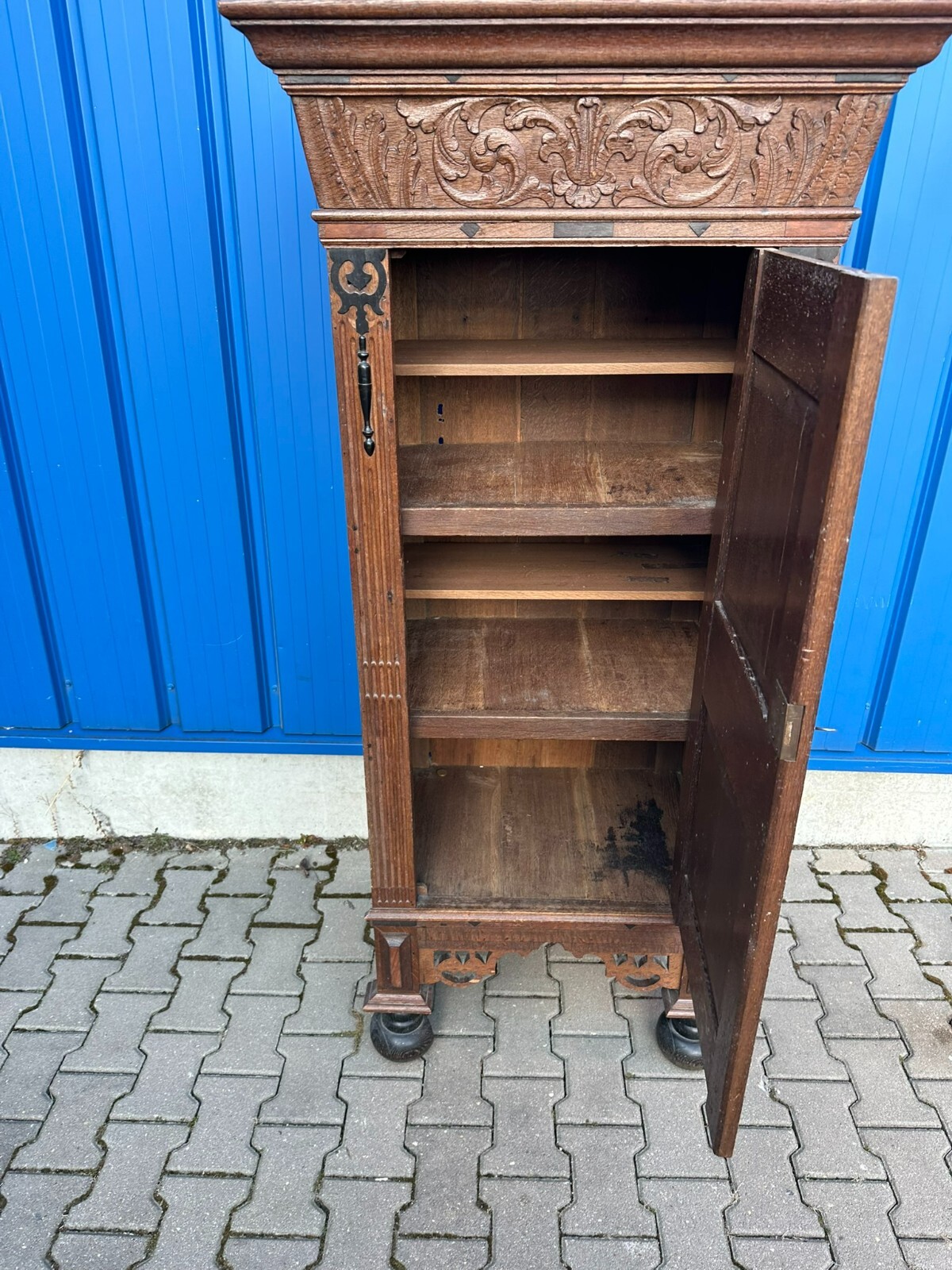 Antiker Barockschrank aus Eiche, 19tes Jahrhundert. An der gesamten Oberfläche kleinere Überarbeitungen, leicht berieben und insbesondere im unteren Bereich mit kleineren Bestoßungen. Linker Fuß unvollständig (die Stabilität wird nicht beeinträchtigt). An der linken Seitenwand ein Loch und die schwarzen Dekorelemente zum Teil unvollständig. Schloss nicht original, Funktionsfähig. Der Innenraum zum Teil fleckig. Die oberste Leiste minimal bestoßen. Das Möbel ist nicht zerlegbar. Abmessungen BTH: 86x57x178cm.
