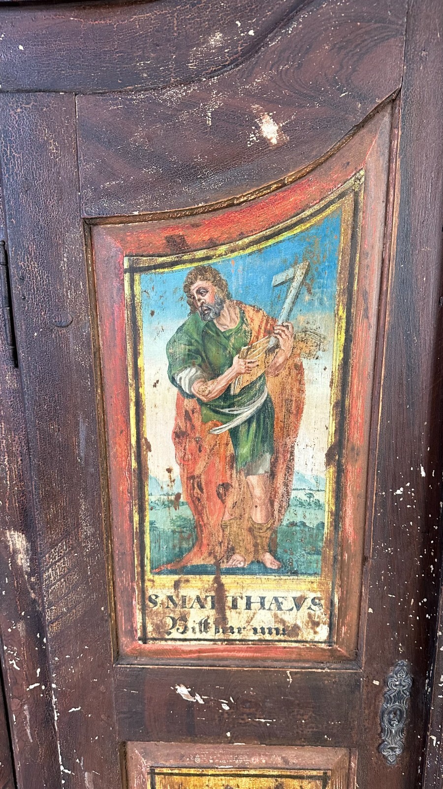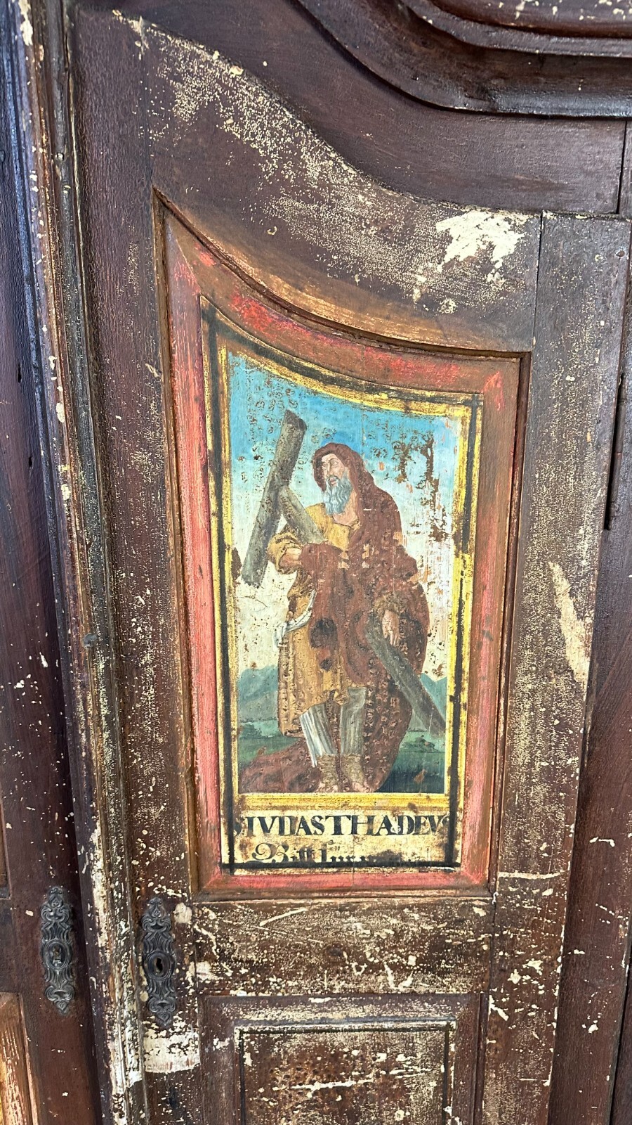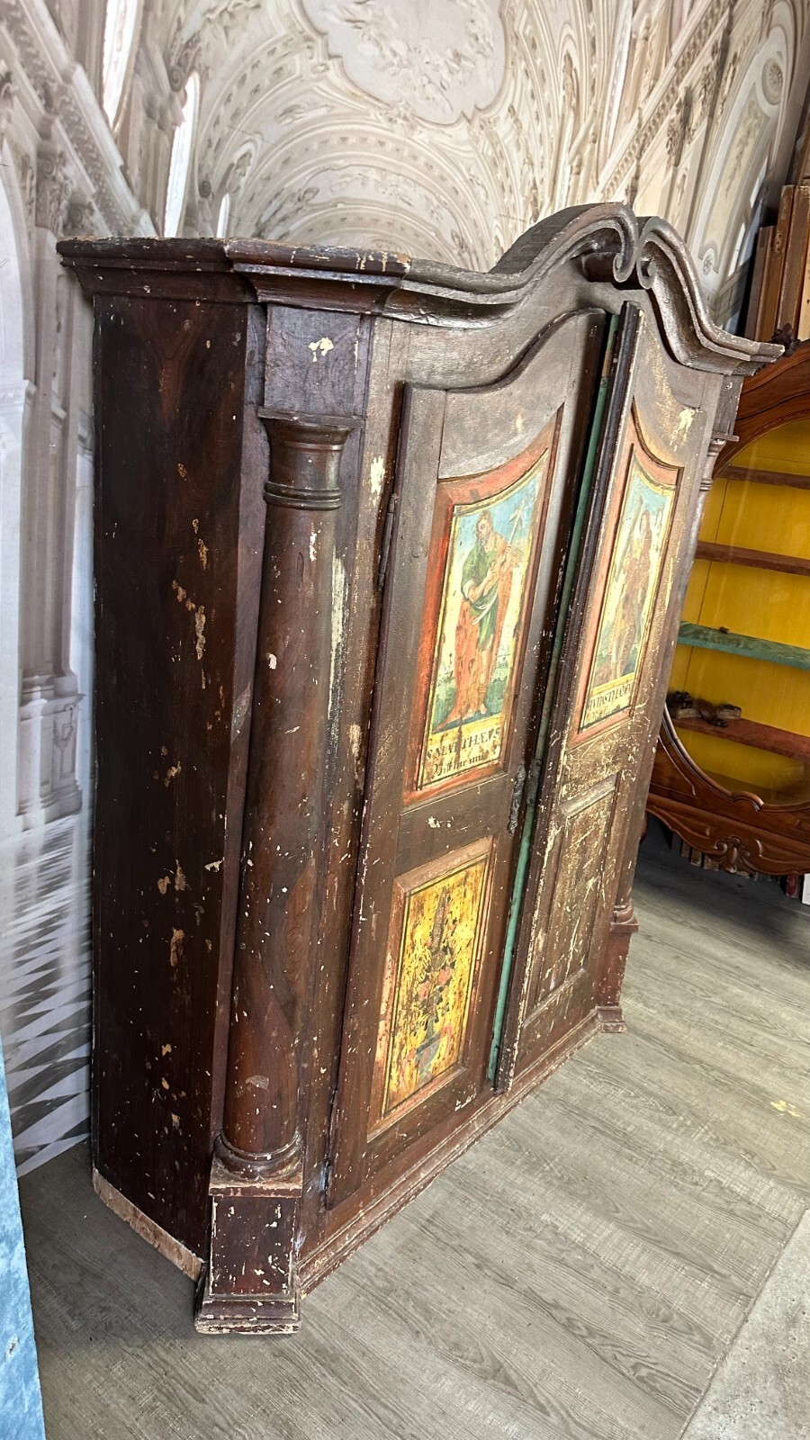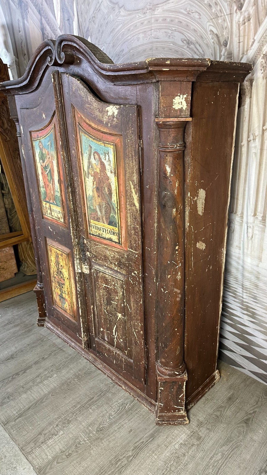 ANTIKER BAROCKSCHRANK BAUERNSCHRANK HOLZ MASSIV HEILIGENBILDER HANDBEMALT 18 TES