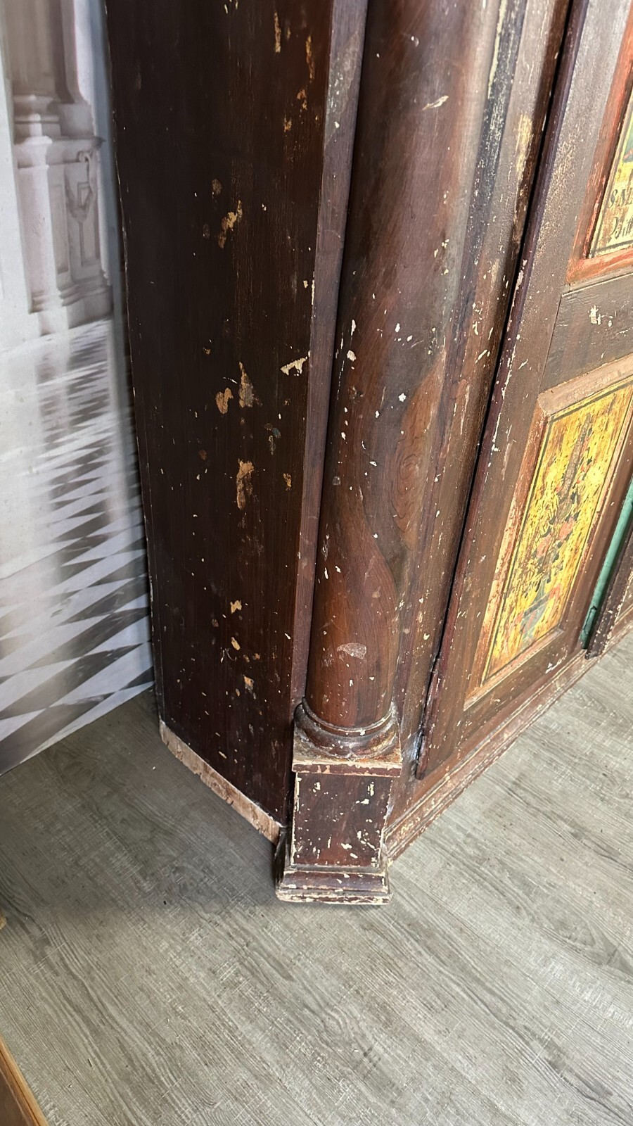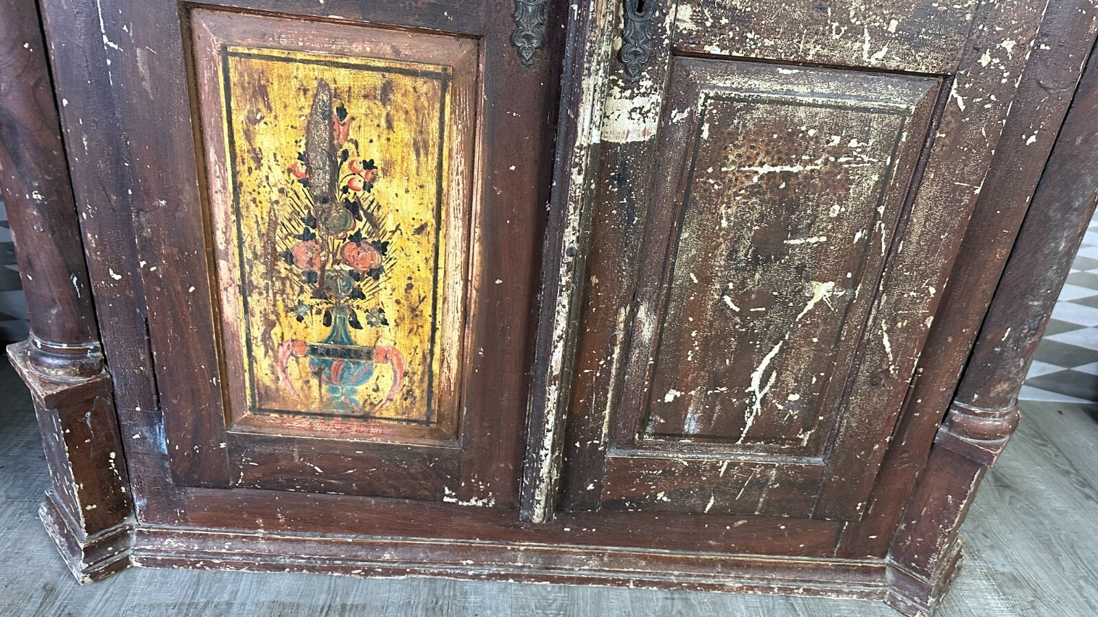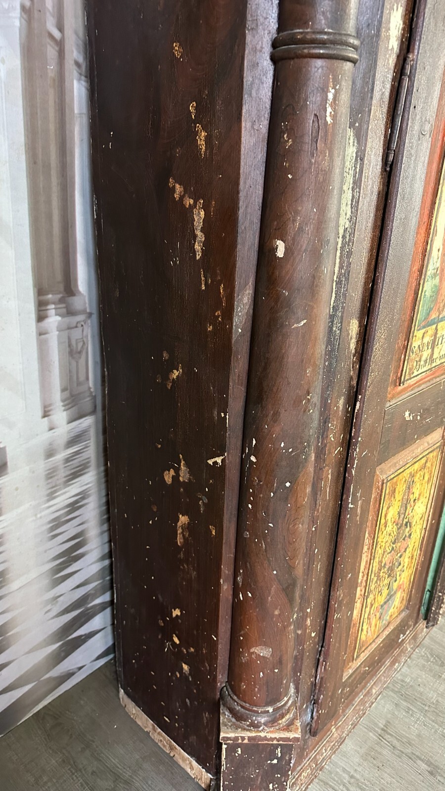 Antiker Bauernschrank um 1780/1800. Massiver Weichholzkorpus, komplett handbemalt. An den Türen Votivbilder, das untere rechte Bild ist leider nicht mehr erkenntlich. Der Schrank wurde mit der braunen Farbe komplett übermalt, diese ist stark berieben und im oberen Bereich gekrauselt. Füße fehlend, ebenfalls die seitliche, untere linke Leiste. Leisten insgesamt bestoßen. Der Innenraum wurde mal grün übermalt, kein Schlüssel vorhanden, Schloss ungetestet. Die Ablagebretter sind berieben und fleckig, an der Rückwand Dehnungsspalten, in der Oberfläche diverse Löcher von Nägeln. Der Schrank ist nicht zerlegbar, stabiler Zustand. Der Schrank hat keine Feuchtigkeit gezogen. Abmessungen BTH: 155x55x187cm. Im Innenraum und am Boden zum Teil alter, inaktiver Wurmfraß.