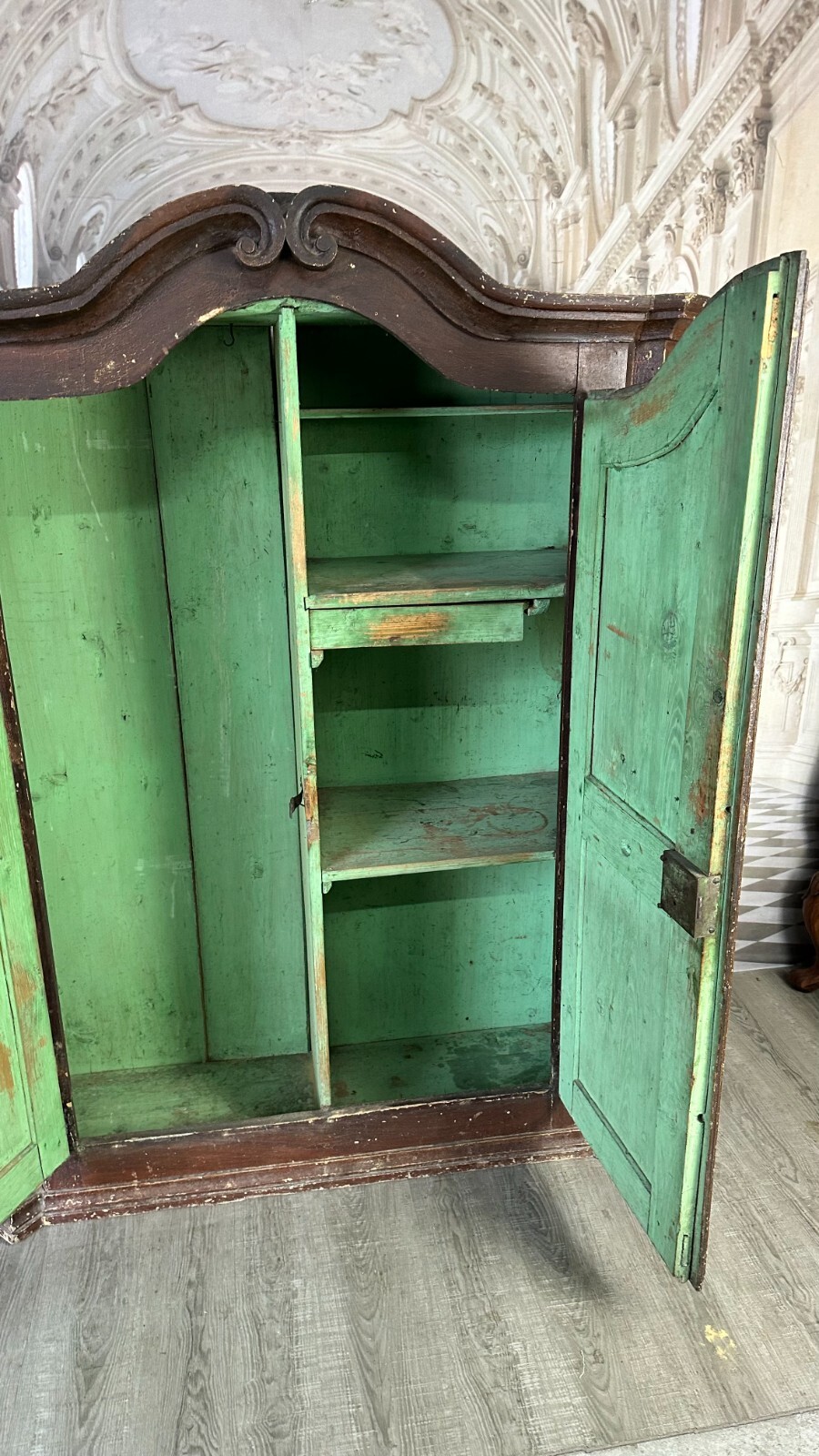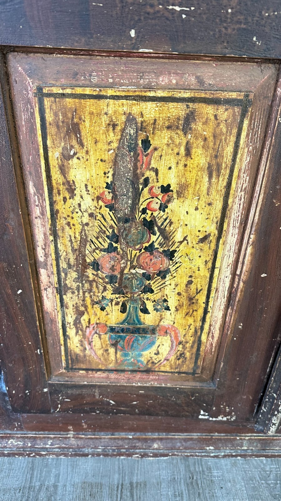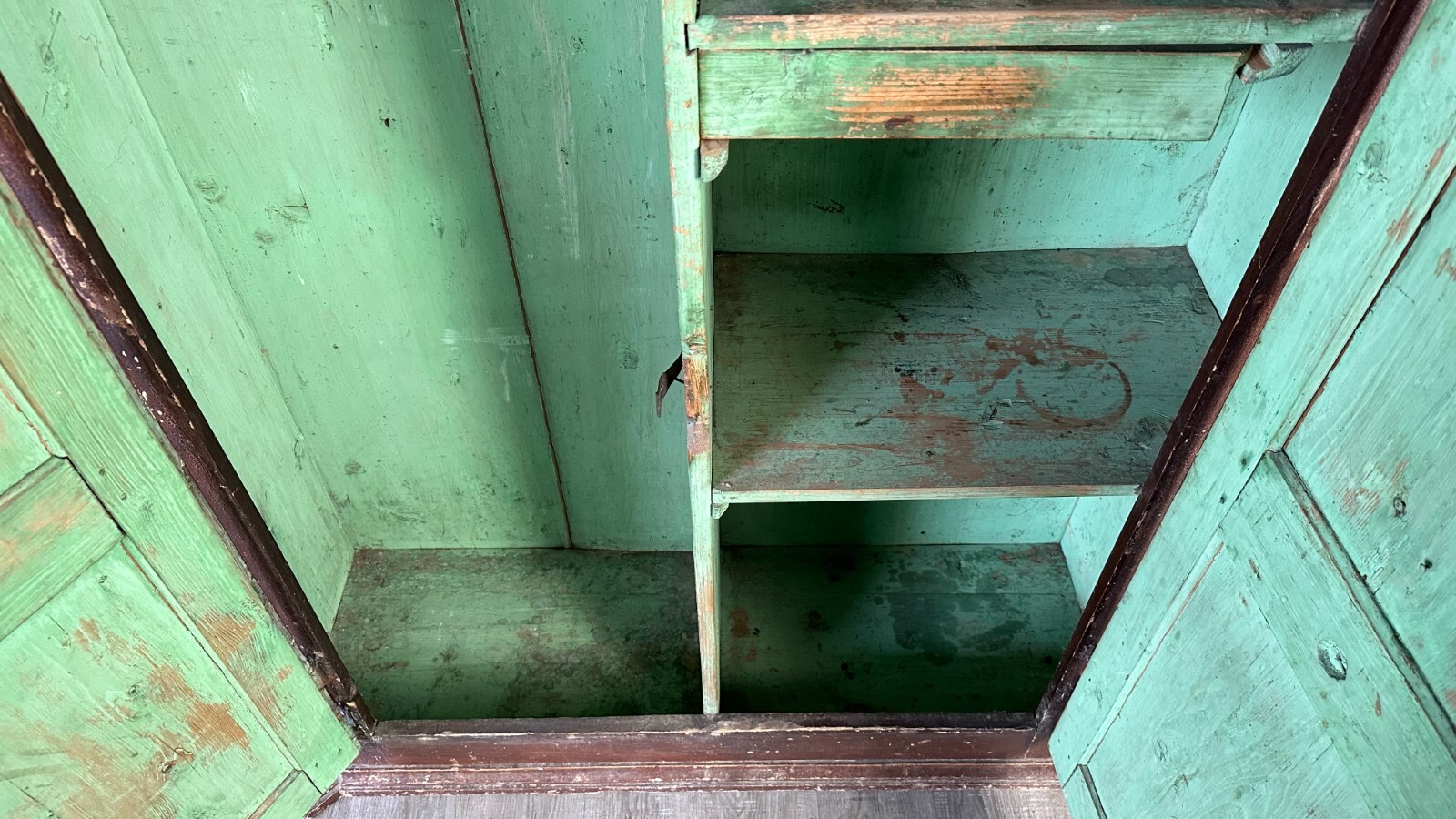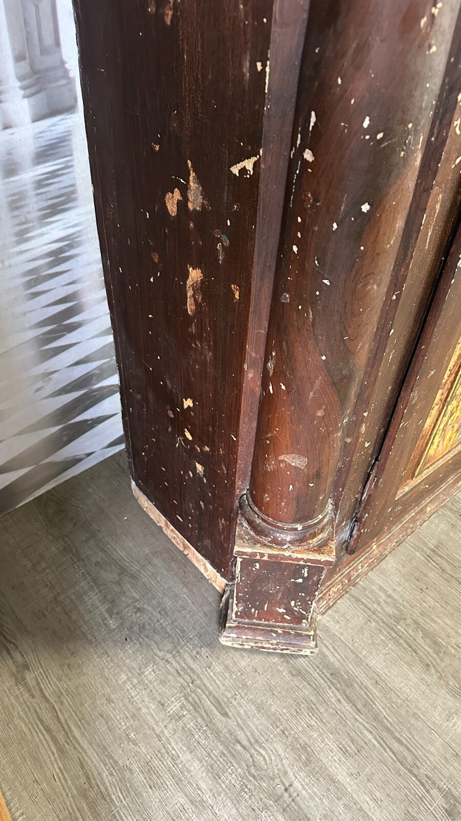 Antiker Bauernschrank um 1780/1800. Massiver Weichholzkorpus, komplett handbemalt. An den Türen Votivbilder, das untere rechte Bild ist leider nicht mehr erkenntlich. Der Schrank wurde mit der braunen Farbe komplett übermalt, diese ist stark berieben und im oberen Bereich gekrauselt. Füße fehlend, ebenfalls die seitliche, untere linke Leiste. Leisten insgesamt bestoßen. Der Innenraum wurde mal grün übermalt, kein Schlüssel vorhanden, Schloss ungetestet. Die Ablagebretter sind berieben und fleckig, an der Rückwand Dehnungsspalten, in der Oberfläche diverse Löcher von Nägeln. Der Schrank ist nicht zerlegbar, stabiler Zustand. Der Schrank hat keine Feuchtigkeit gezogen. Abmessungen BTH: 155x55x187cm. Im Innenraum und am Boden zum Teil alter, inaktiver Wurmfraß.
