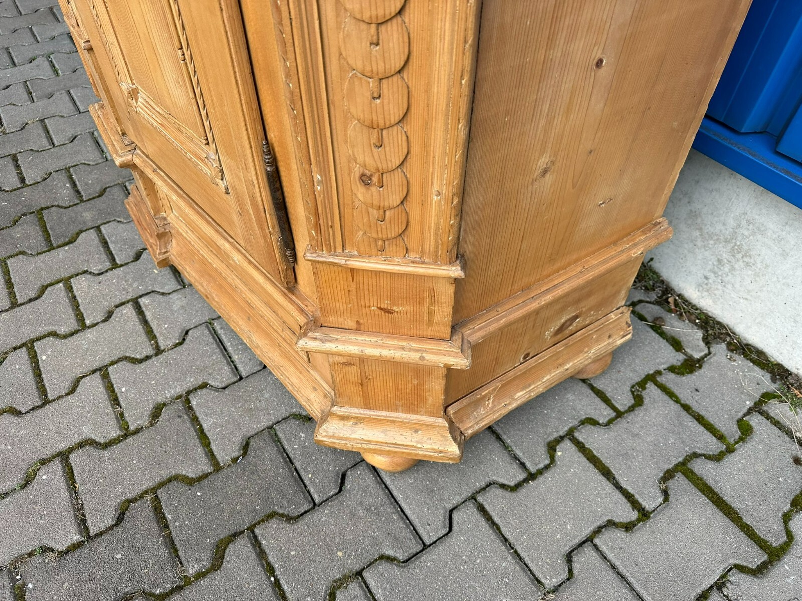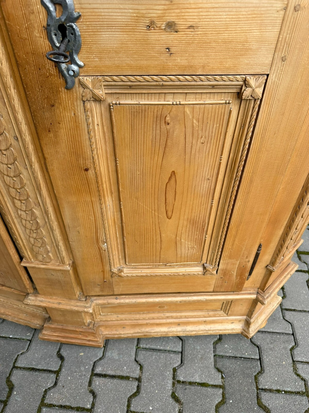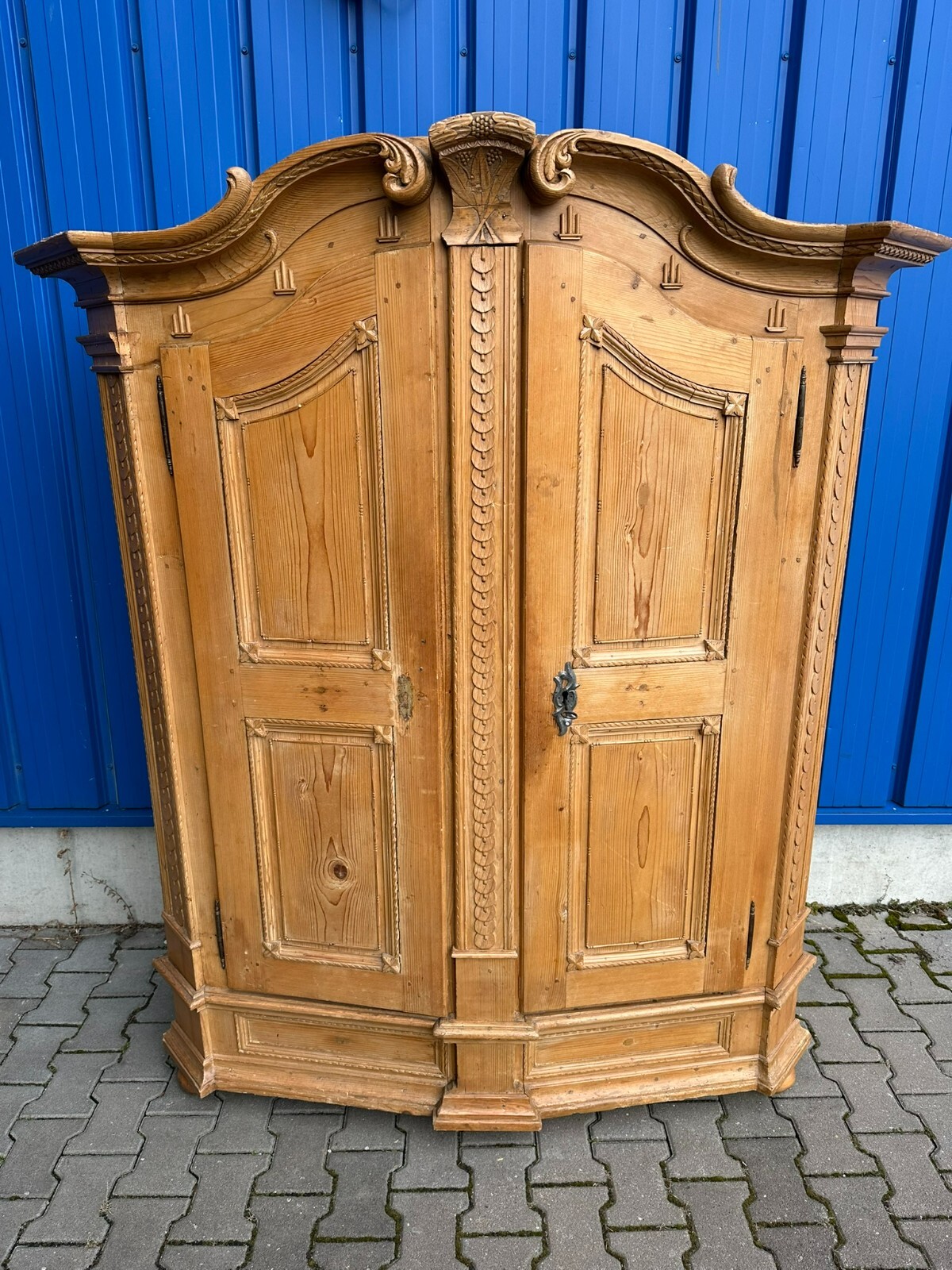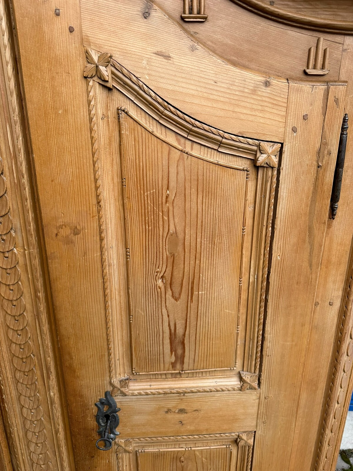 Sehr schöner, antiker Bodenseeschrank, Ende 18-tes Jahrhundert, aus massivem Weichholz. Der Schrank wurde mal komplett abgefasst und an wenigen Stellen ergänzt. Leisten insgesamt berieben und bestoßen. Der Innenraum noch original bemalt, Seitenwände, Türen und Rückwand neu bezogen, an der Rückwand im Bezug Risse. Rechte Seite als Garderobe umgebaut, hier keine Ablagefächer vorhanden. Oberes, mittleres Ornament gebrochen und nachgenagelt. Oben links kleines Stück Leiste fehlend, Schloss nicht original, jedoch antik. Der Schrank ist in zwei Hälften zerlegbar. Abmessungen BTH: 168x63x195cm. Leiste oben seitlich mit Dehnungsriss.