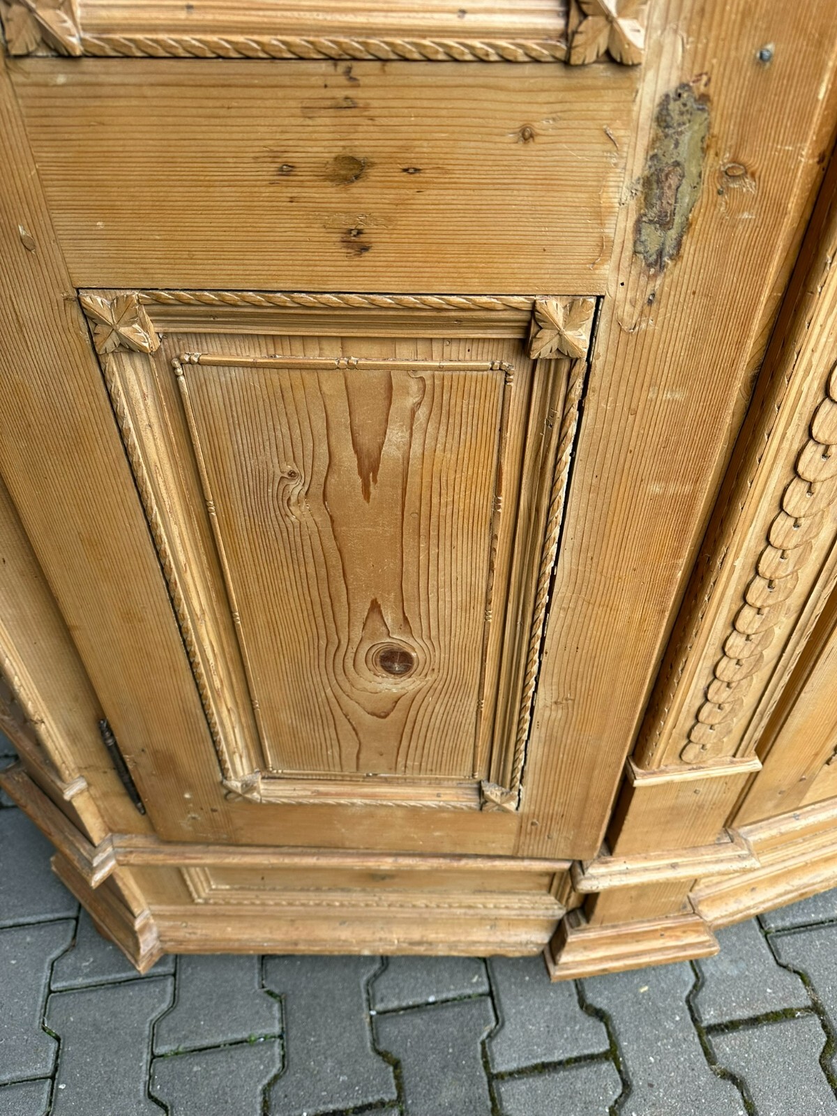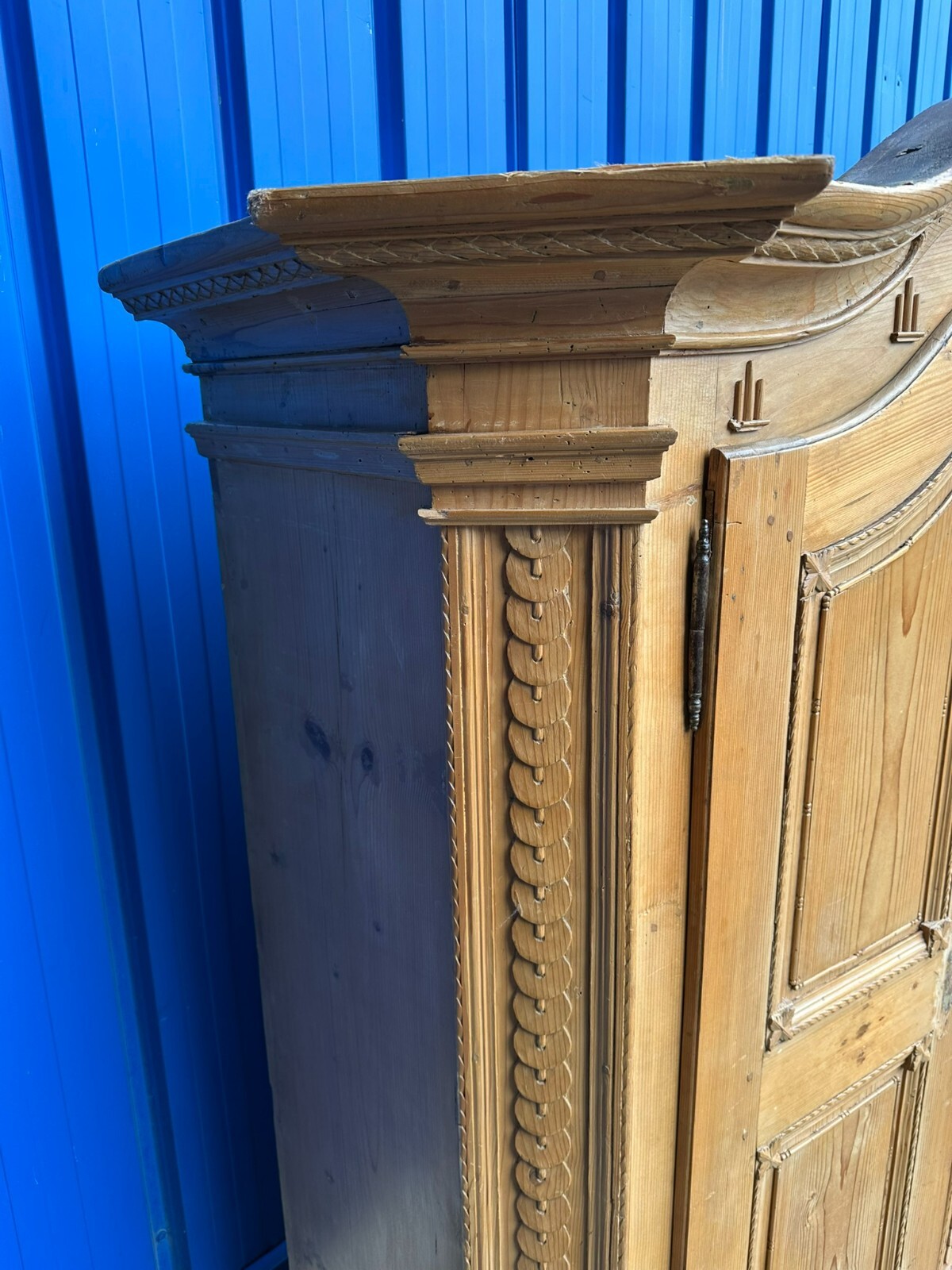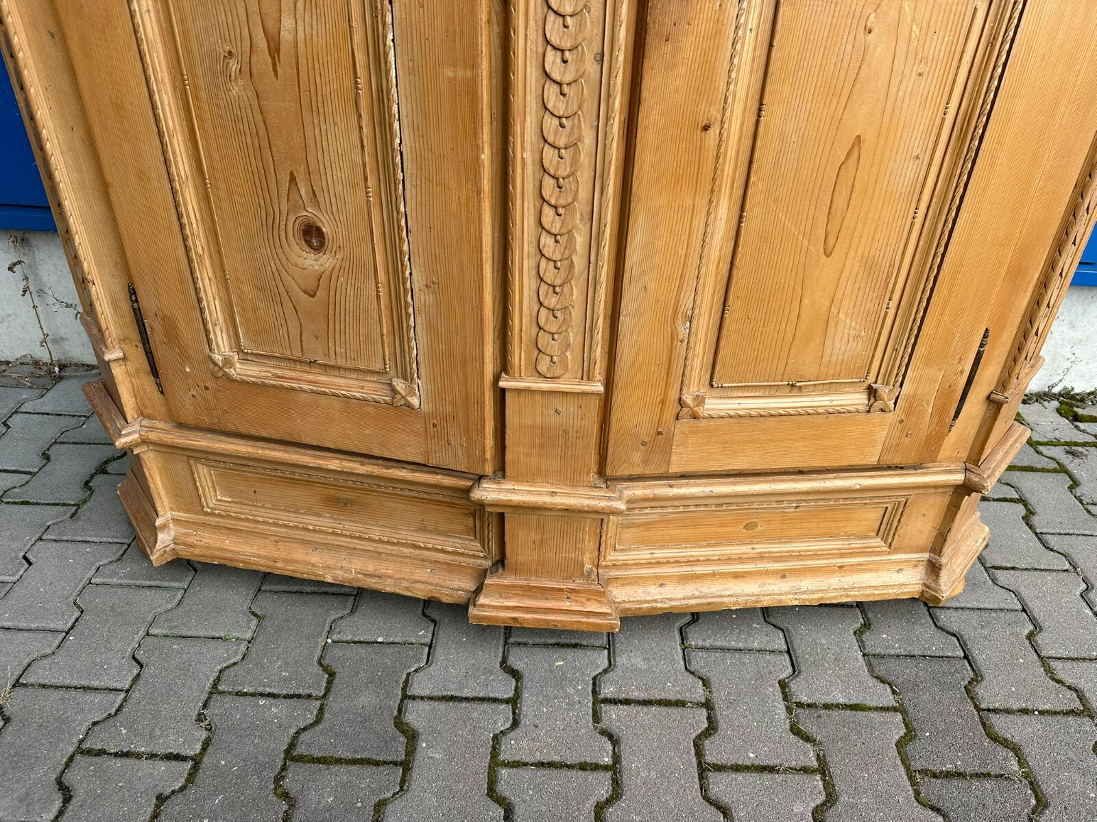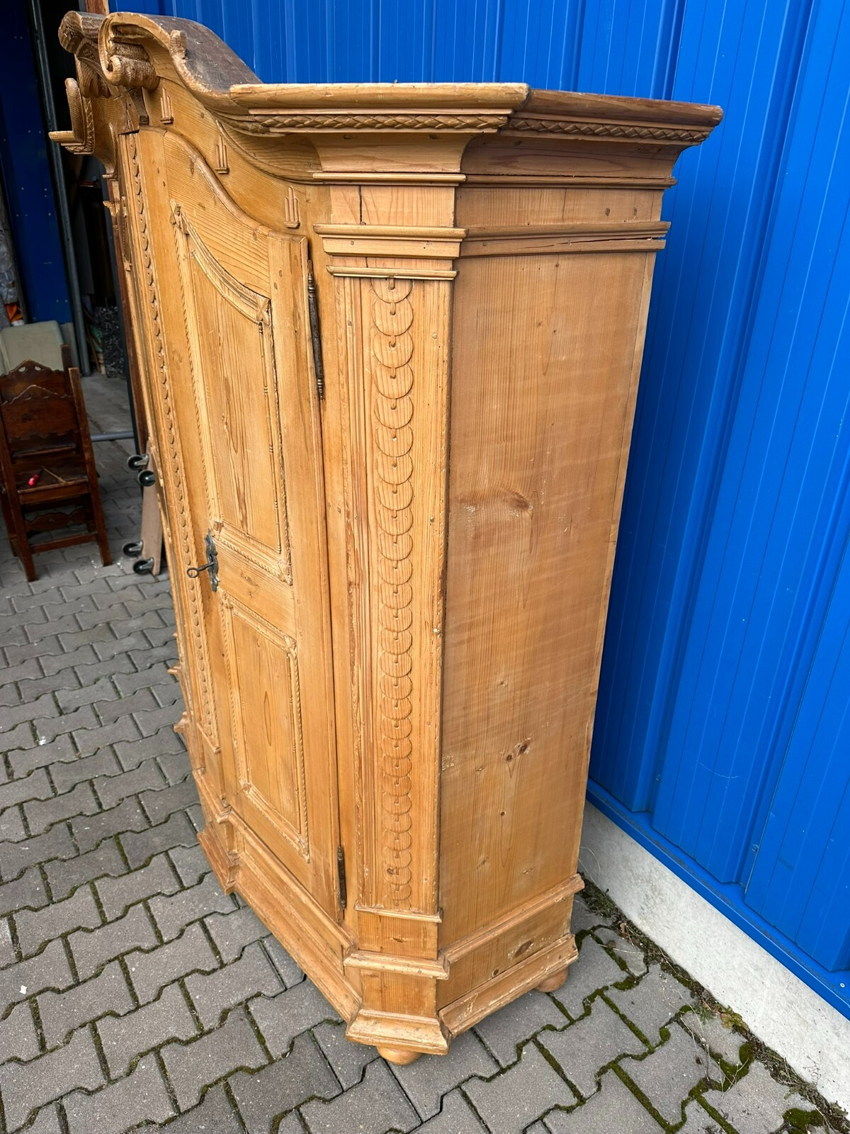 Sehr schöner, antiker Bodenseeschrank, Ende 18-tes Jahrhundert, aus massivem Weichholz. Der Schrank wurde mal komplett abgefasst und an wenigen Stellen ergänzt. Leisten insgesamt berieben und bestoßen. Der Innenraum noch original bemalt, Seitenwände, Türen und Rückwand neu bezogen, an der Rückwand im Bezug Risse. Rechte Seite als Garderobe umgebaut, hier keine Ablagefächer vorhanden. Oberes, mittleres Ornament gebrochen und nachgenagelt. Oben links kleines Stück Leiste fehlend, Schloss nicht original, jedoch antik. Der Schrank ist in zwei Hälften zerlegbar. Abmessungen BTH: 168x63x195cm. Leiste oben seitlich mit Dehnungsriss.