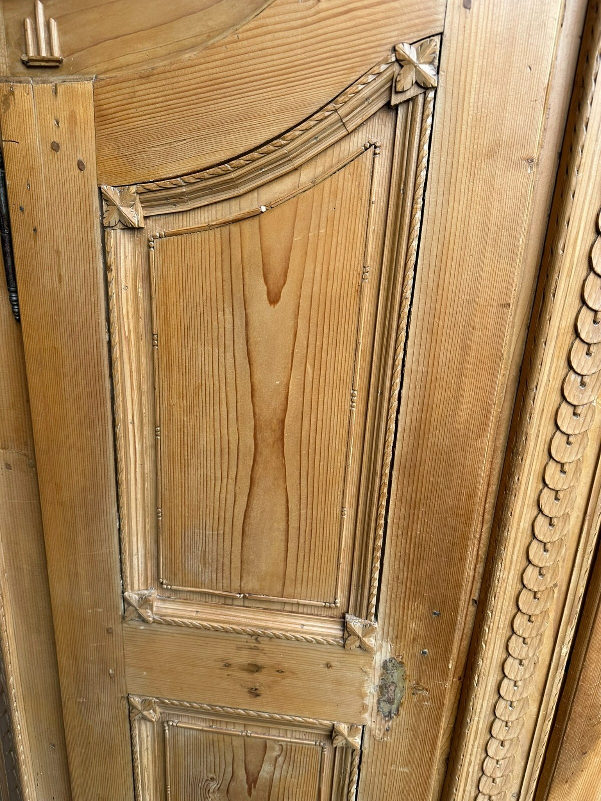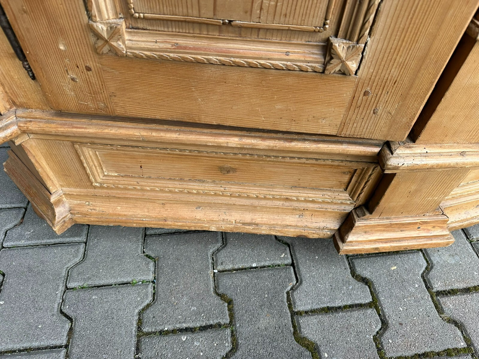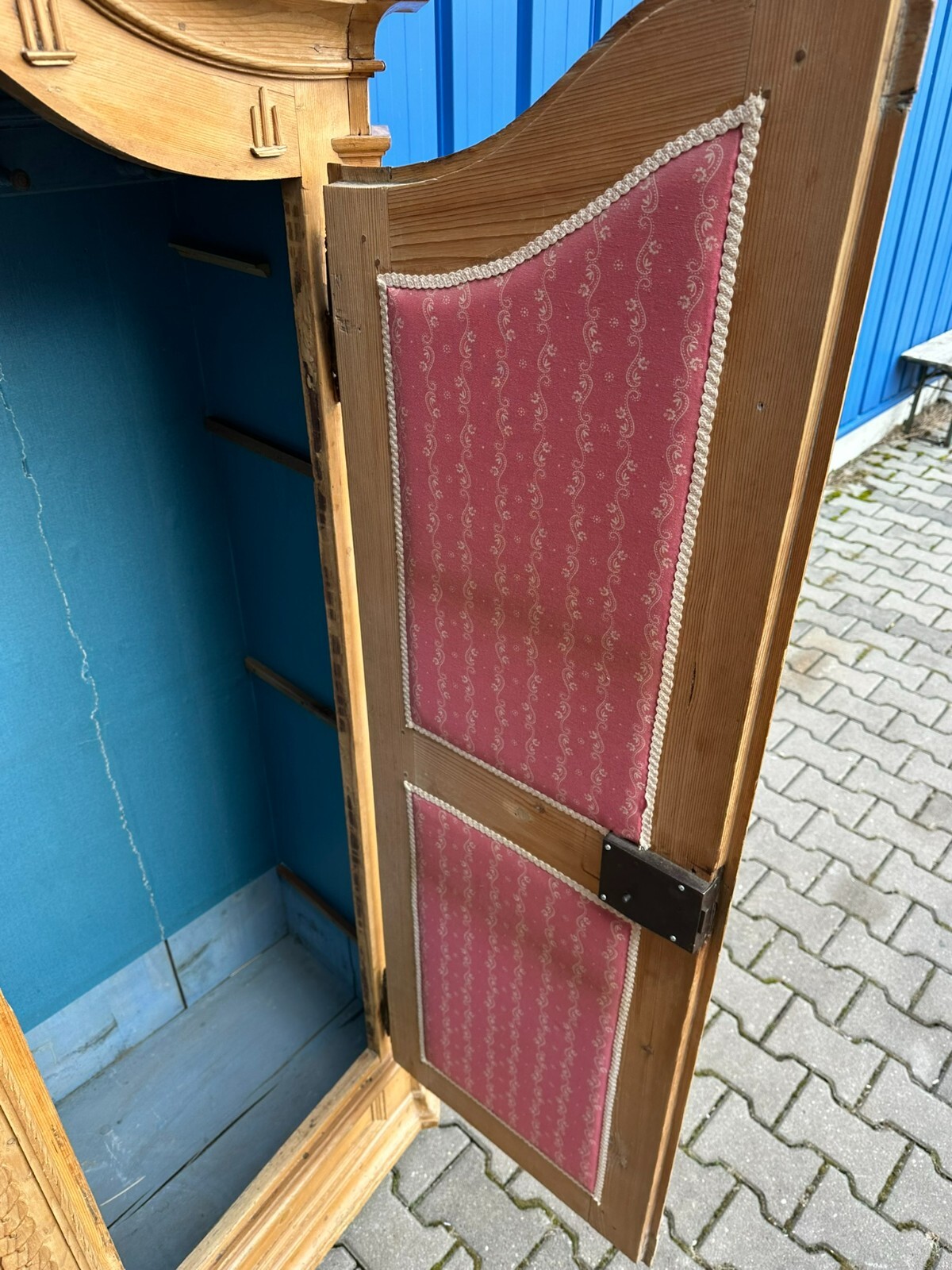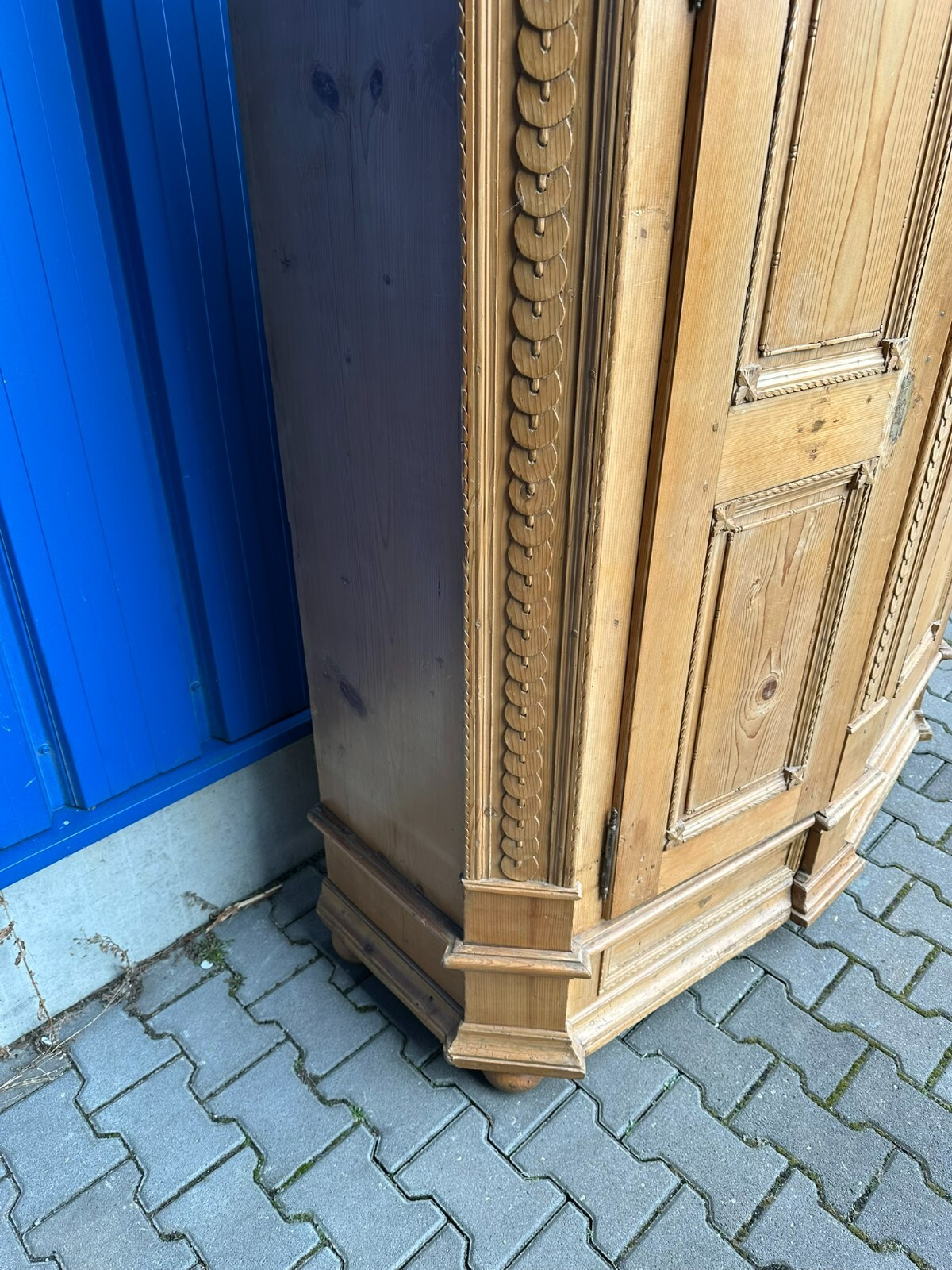 Sehr schöner, antiker Bodenseeschrank, Ende 18-tes Jahrhundert, aus massivem Weichholz. Der Schrank wurde mal komplett abgefasst und an wenigen Stellen ergänzt. Leisten insgesamt berieben und bestoßen. Der Innenraum noch original bemalt, Seitenwände, Türen und Rückwand neu bezogen, an der Rückwand im Bezug Risse. Rechte Seite als Garderobe umgebaut, hier keine Ablagefächer vorhanden. Oberes, mittleres Ornament gebrochen und nachgenagelt. Oben links kleines Stück Leiste fehlend, Schloss nicht original, jedoch antik. Der Schrank ist in zwei Hälften zerlegbar. Abmessungen BTH: 168x63x195cm. Leiste oben seitlich mit Dehnungsriss.