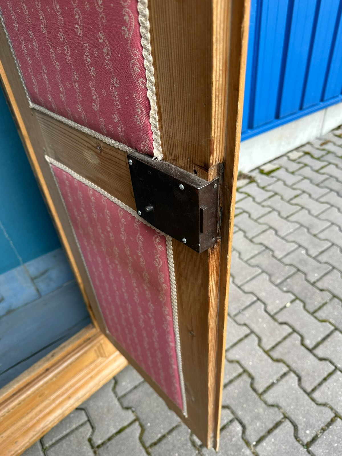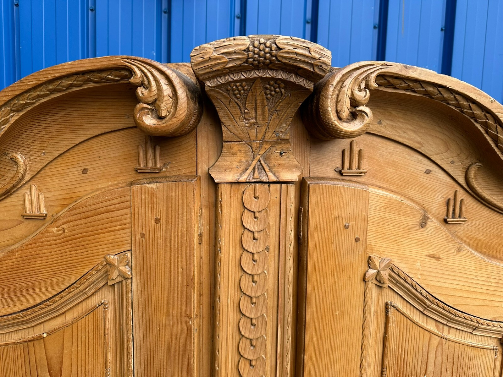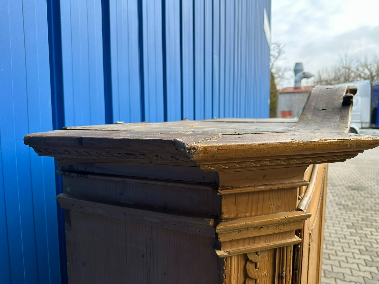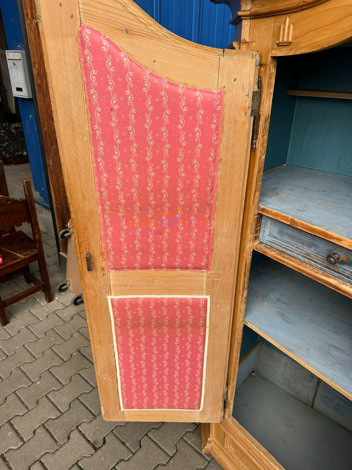 Sehr schöner, antiker Bodenseeschrank, Ende 18-tes Jahrhundert, aus massivem Weichholz. Der Schrank wurde mal komplett abgefasst und an wenigen Stellen ergänzt. Leisten insgesamt berieben und bestoßen. Der Innenraum noch original bemalt, Seitenwände, Türen und Rückwand neu bezogen, an der Rückwand im Bezug Risse. Rechte Seite als Garderobe umgebaut, hier keine Ablagefächer vorhanden. Oberes, mittleres Ornament gebrochen und nachgenagelt. Oben links kleines Stück Leiste fehlend, Schloss nicht original, jedoch antik. Der Schrank ist in zwei Hälften zerlegbar. Abmessungen BTH: 168x63x195cm. Leiste oben seitlich mit Dehnungsriss.