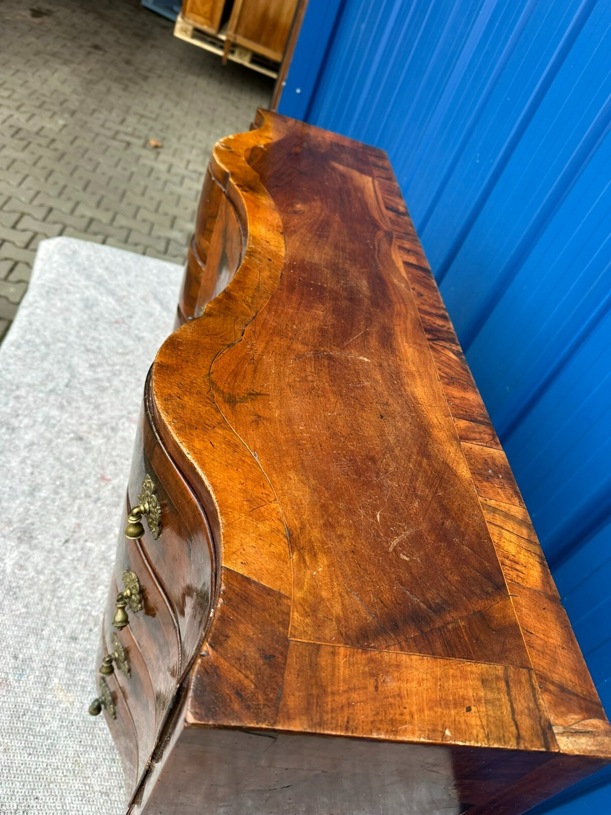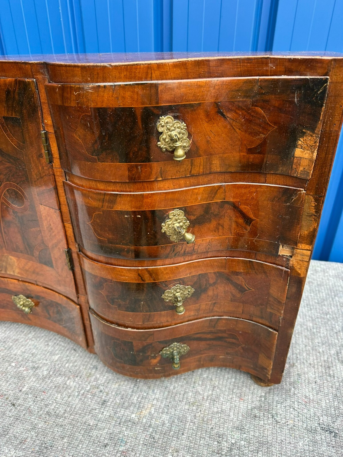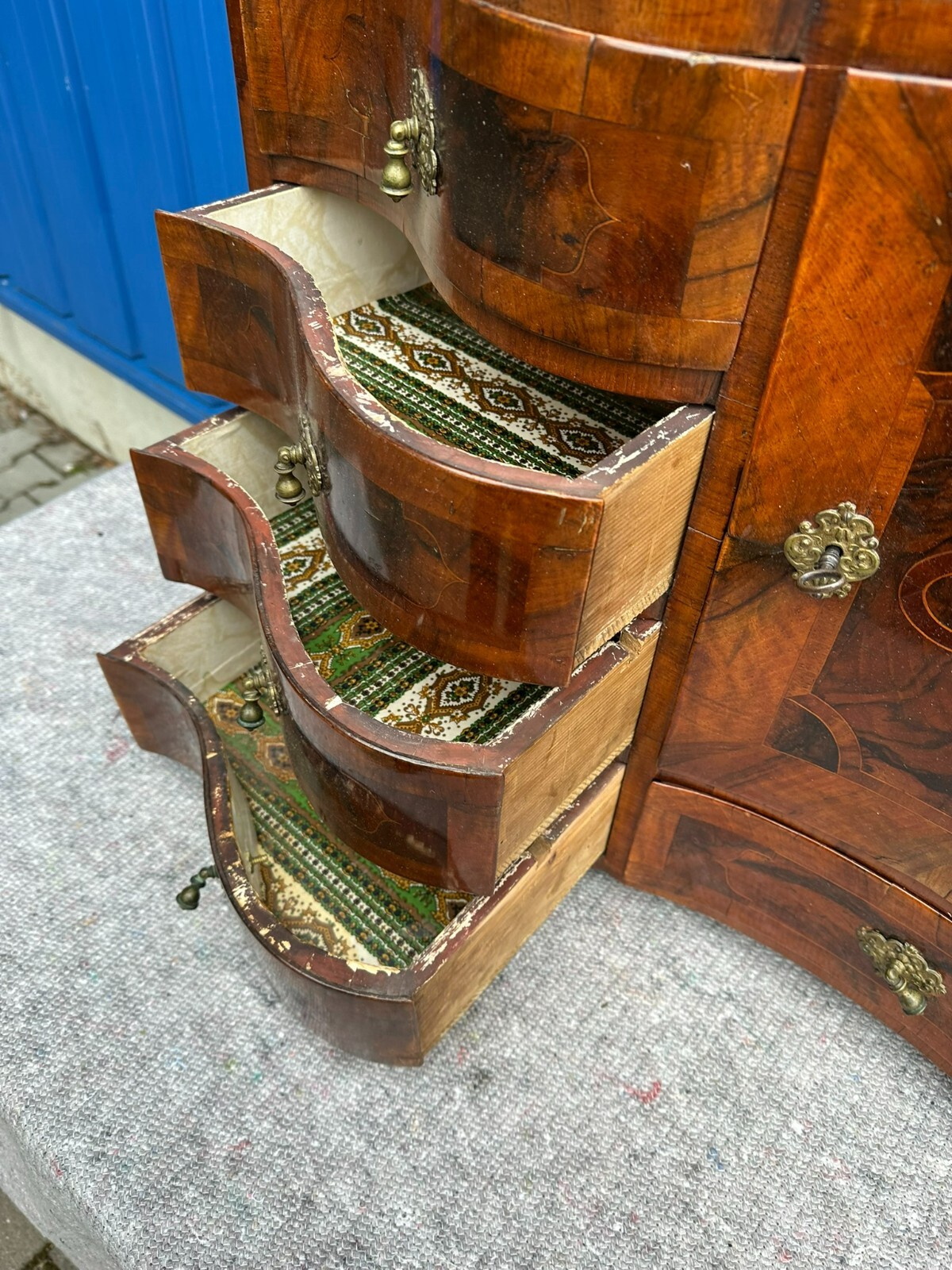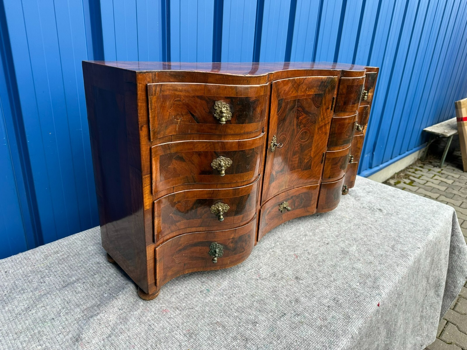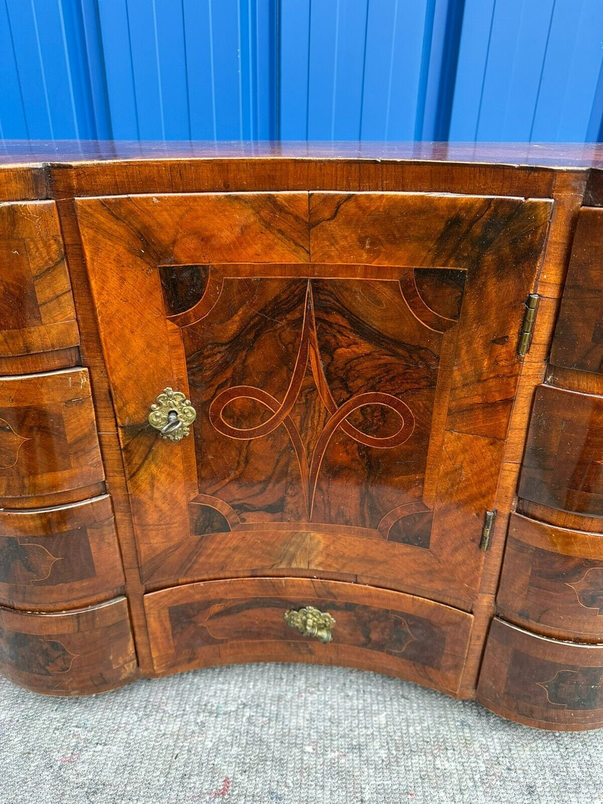 Sehr schöner, barocker Aufsatzsekretär, mitte 18tes Jahrhundert. Massiver Holzkorpus, Nussbaum furniert und intarsiert. Leichter, inaktiver Wurmfraß, das Furnier an wenigen Stellen zum Teil ausgetauscht. Der Innenraum zum Teil mit Papier ausgelegt und braun übermalt. das Papier ist geklebt, die Übermalung berieben. An der rechten Seite Furnierschäden an den Schubladen. Ein Schlüssel vorhanden, Schloss funktionsfähig, an beiden Seiten funktionsfähige Absperrschieber, obere Platte insgesamt berieben. Weiterhin an der gesamten Oberfläche Abrieb- und Druckstellen. Abmessungen BTH: 101x30x53,5cm.