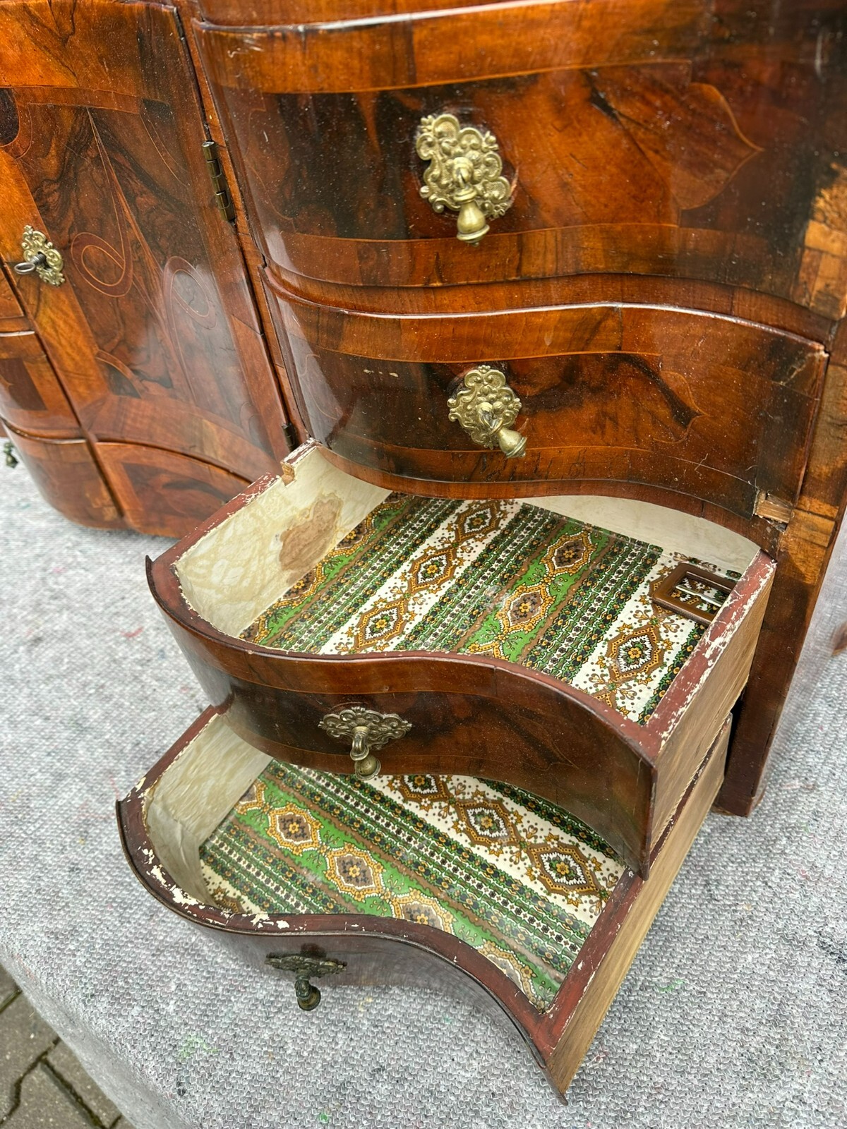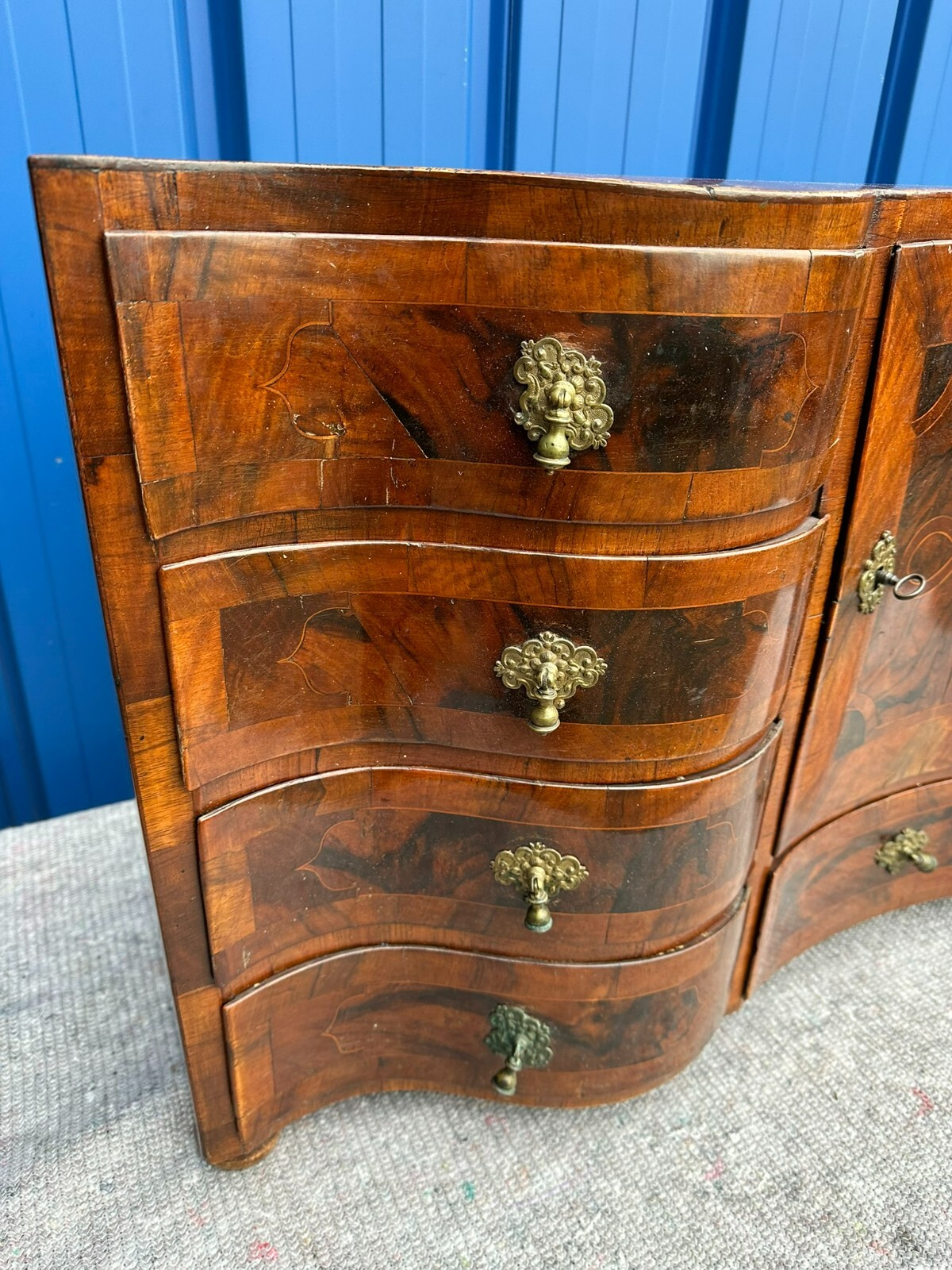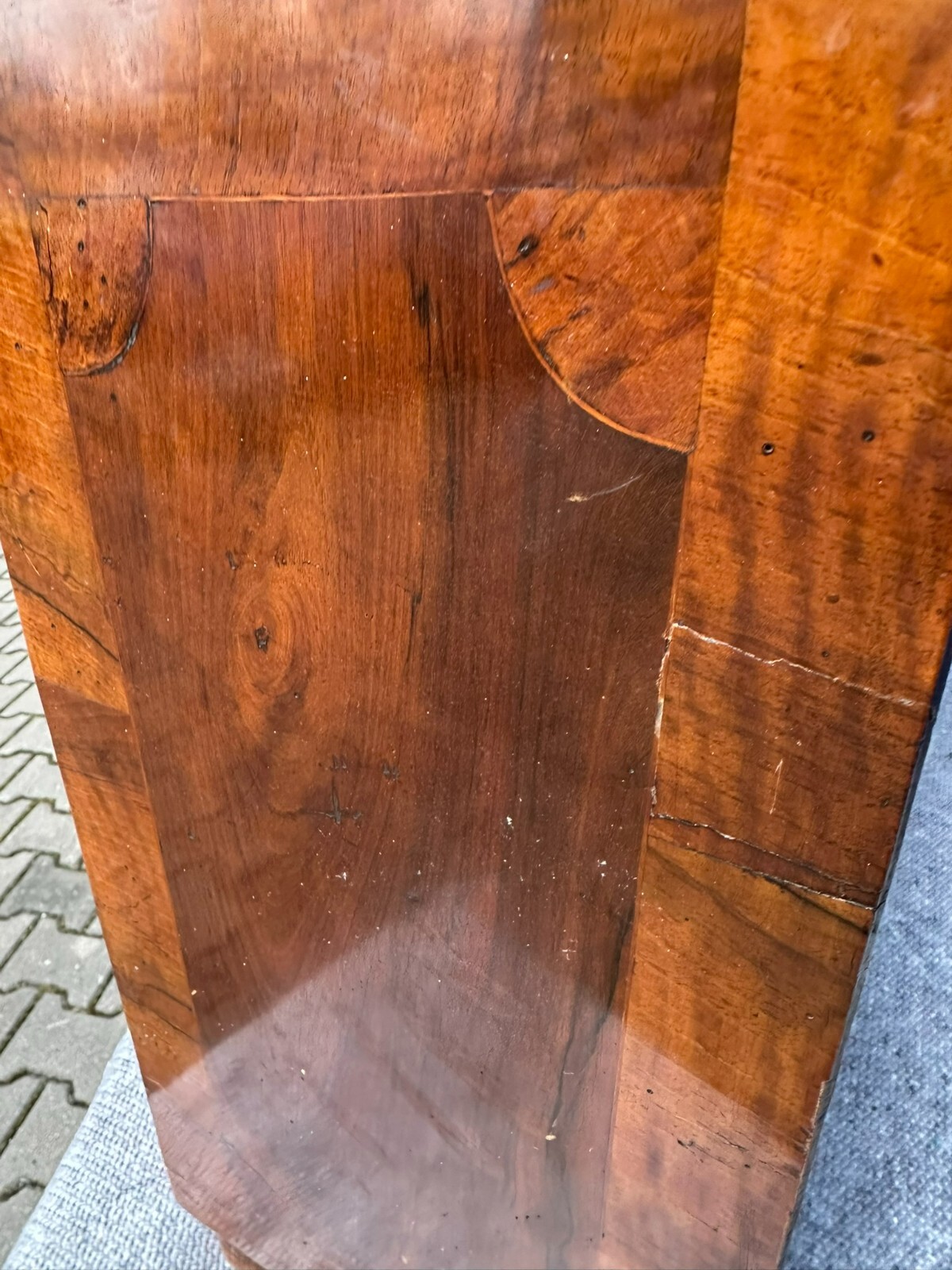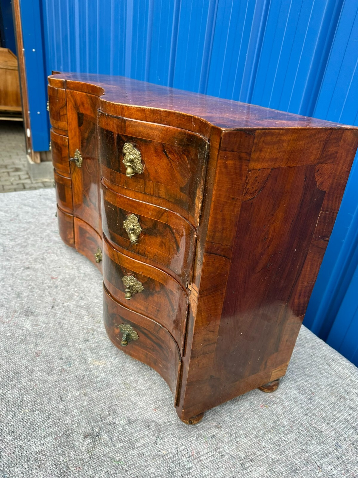 Sehr schöner, barocker Aufsatzsekretär, mitte 18tes Jahrhundert. Massiver Holzkorpus, Nussbaum furniert und intarsiert. Leichter, inaktiver Wurmfraß, das Furnier an wenigen Stellen zum Teil ausgetauscht. Der Innenraum zum Teil mit Papier ausgelegt und braun übermalt. das Papier ist geklebt, die Übermalung berieben. An der rechten Seite Furnierschäden an den Schubladen. Ein Schlüssel vorhanden, Schloss funktionsfähig, an beiden Seiten funktionsfähige Absperrschieber, obere Platte insgesamt berieben. Weiterhin an der gesamten Oberfläche Abrieb- und Druckstellen. Abmessungen BTH: 101x30x53,5cm.