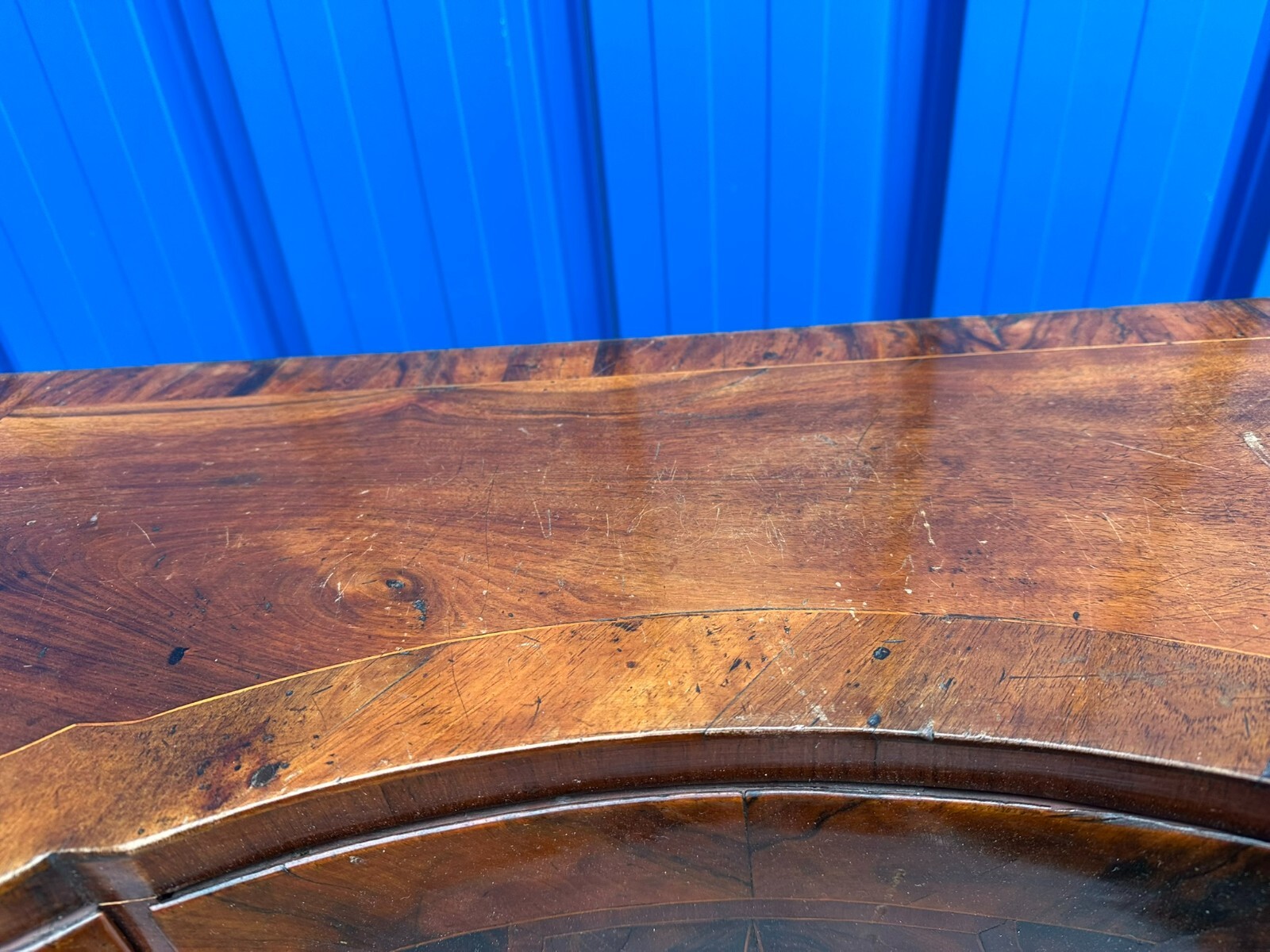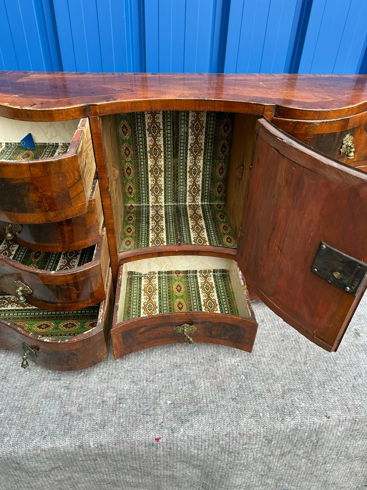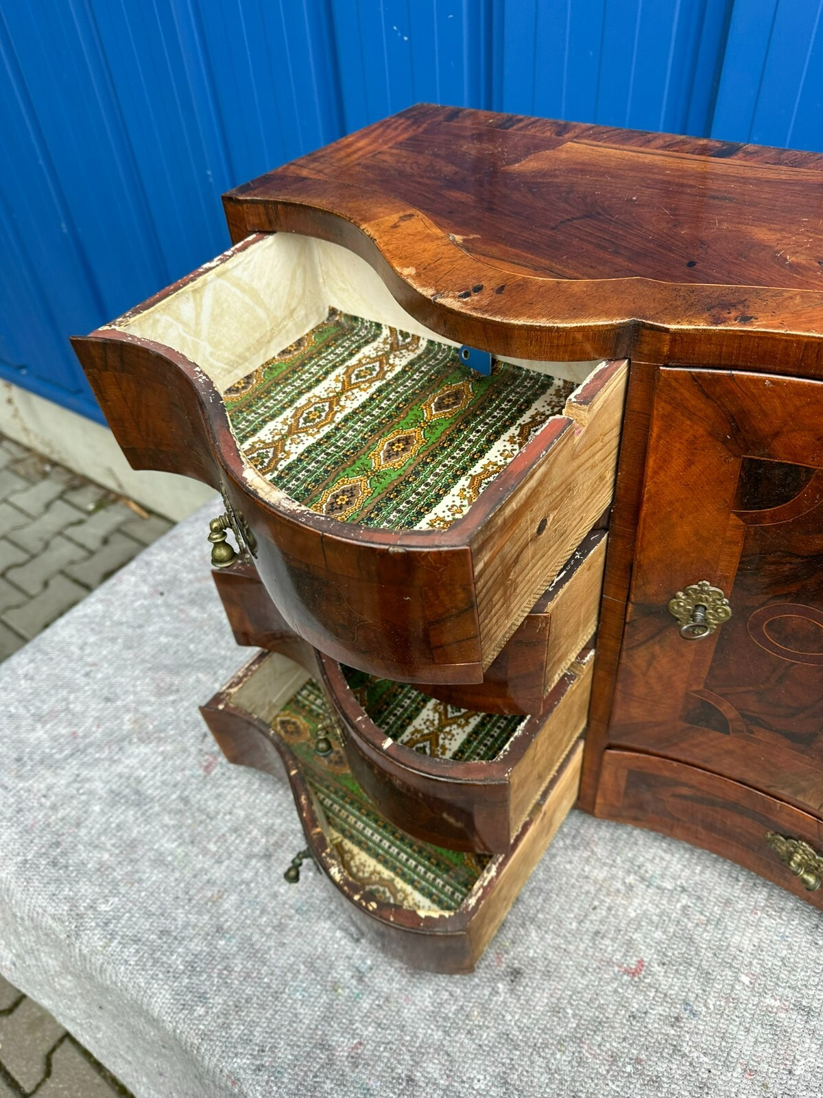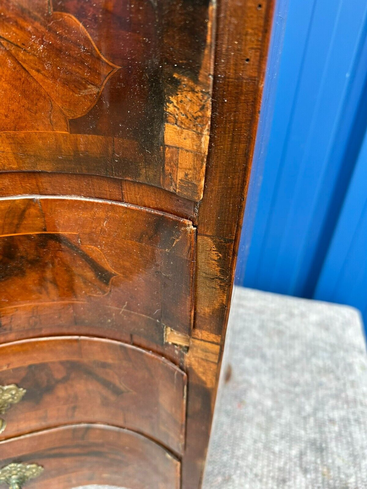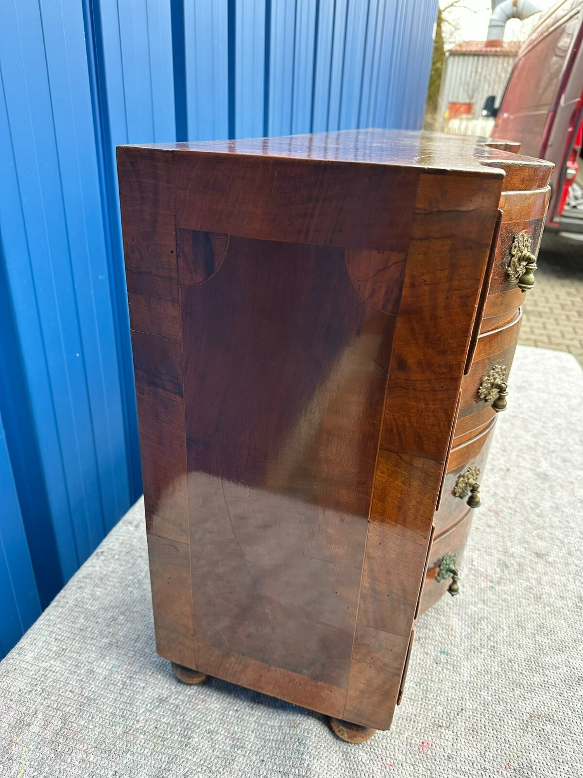 Sehr schöner, barocker Aufsatzsekretär, mitte 18tes Jahrhundert. Massiver Holzkorpus, Nussbaum furniert und intarsiert. Leichter, inaktiver Wurmfraß, das Furnier an wenigen Stellen zum Teil ausgetauscht. Der Innenraum zum Teil mit Papier ausgelegt und braun übermalt. das Papier ist geklebt, die Übermalung berieben. An der rechten Seite Furnierschäden an den Schubladen. Ein Schlüssel vorhanden, Schloss funktionsfähig, an beiden Seiten funktionsfähige Absperrschieber, obere Platte insgesamt berieben. Weiterhin an der gesamten Oberfläche Abrieb- und Druckstellen. Abmessungen BTH: 101x30x53,5cm.