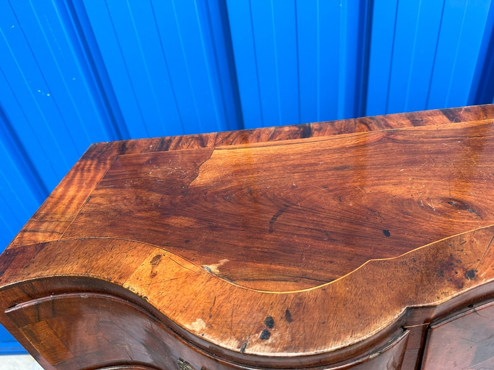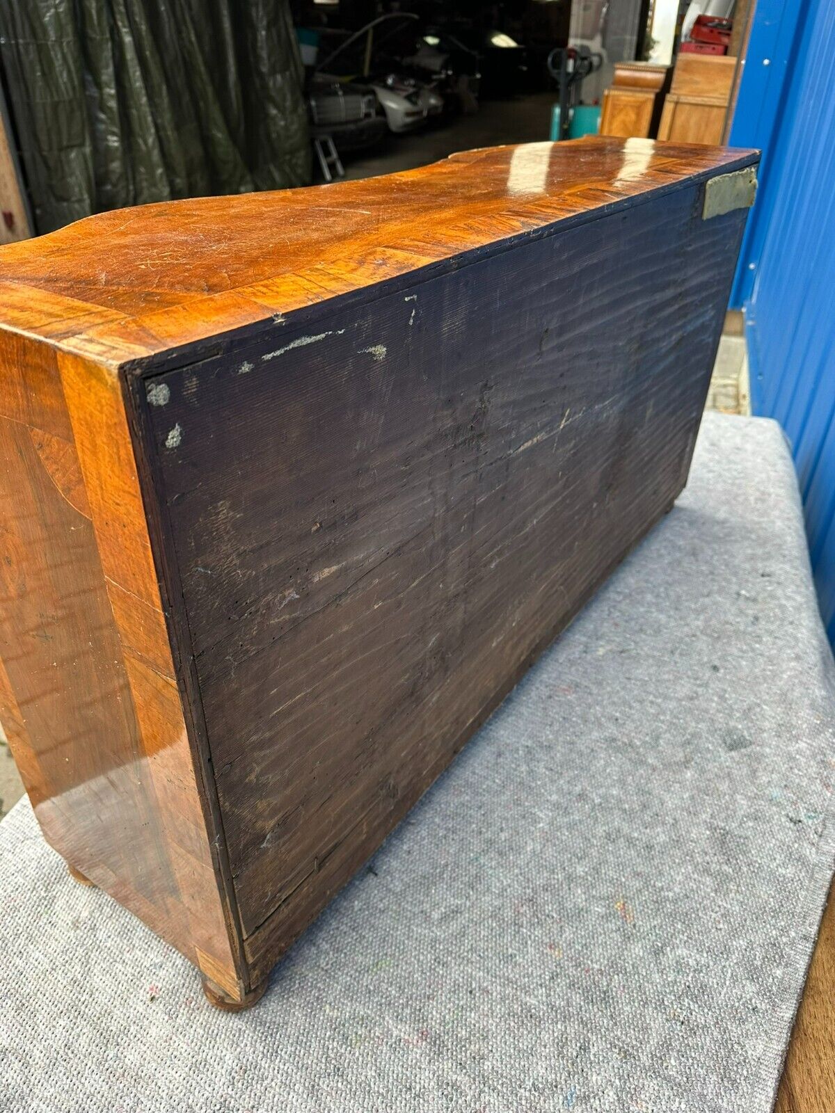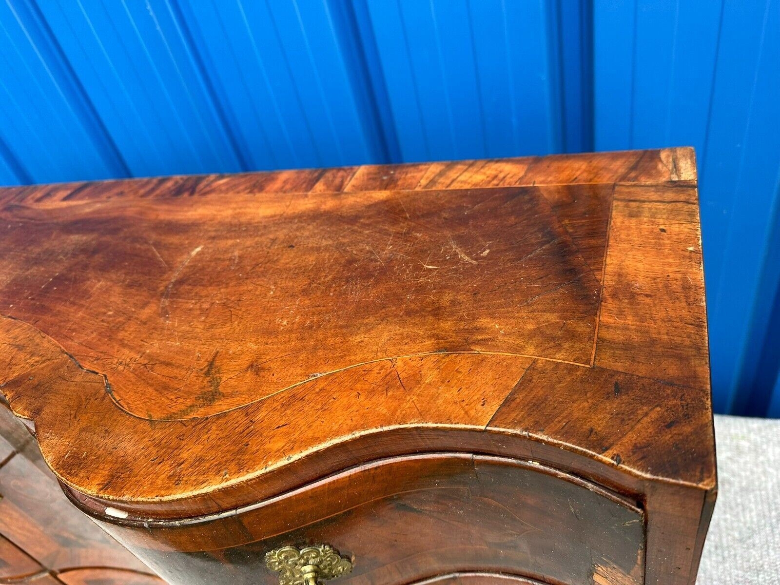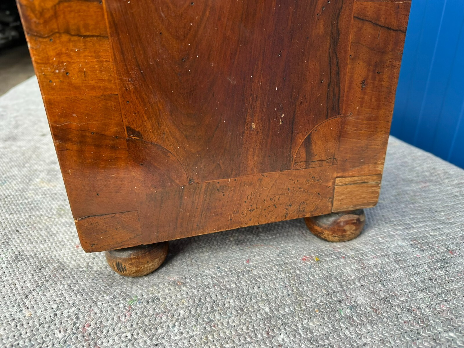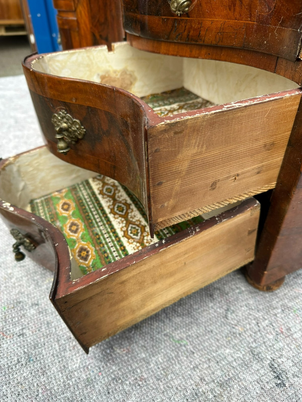 Sehr schöner, barocker Aufsatzsekretär, mitte 18tes Jahrhundert. Massiver Holzkorpus, Nussbaum furniert und intarsiert. Leichter, inaktiver Wurmfraß, das Furnier an wenigen Stellen zum Teil ausgetauscht. Der Innenraum zum Teil mit Papier ausgelegt und braun übermalt. das Papier ist geklebt, die Übermalung berieben. An der rechten Seite Furnierschäden an den Schubladen. Ein Schlüssel vorhanden, Schloss funktionsfähig, an beiden Seiten funktionsfähige Absperrschieber, obere Platte insgesamt berieben. Weiterhin an der gesamten Oberfläche Abrieb- und Druckstellen. Abmessungen BTH: 101x30x53,5cm.