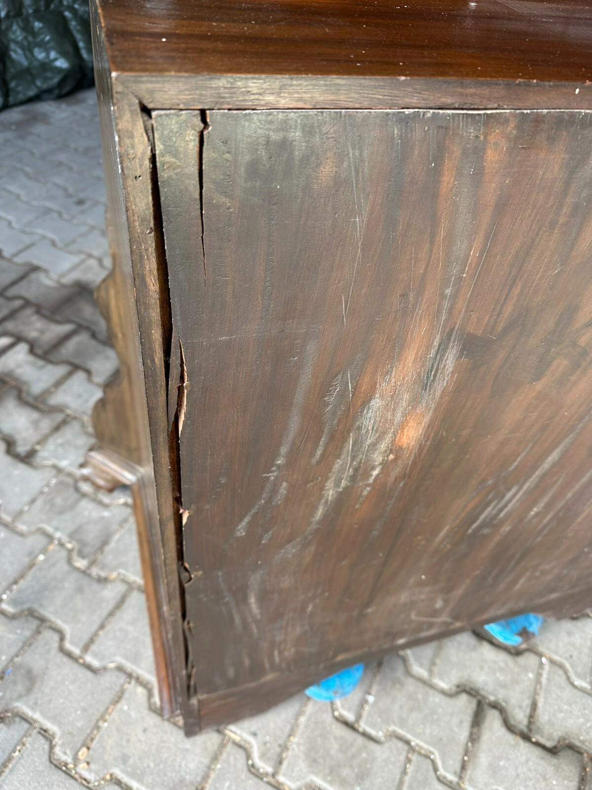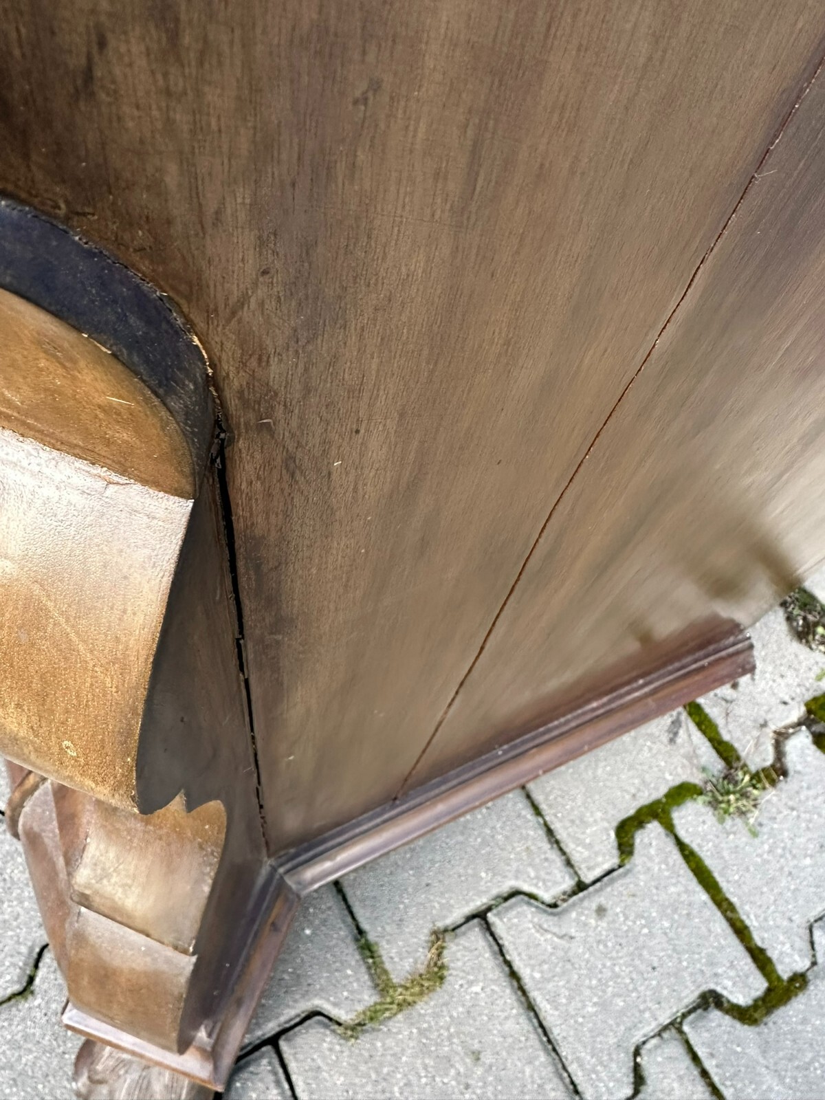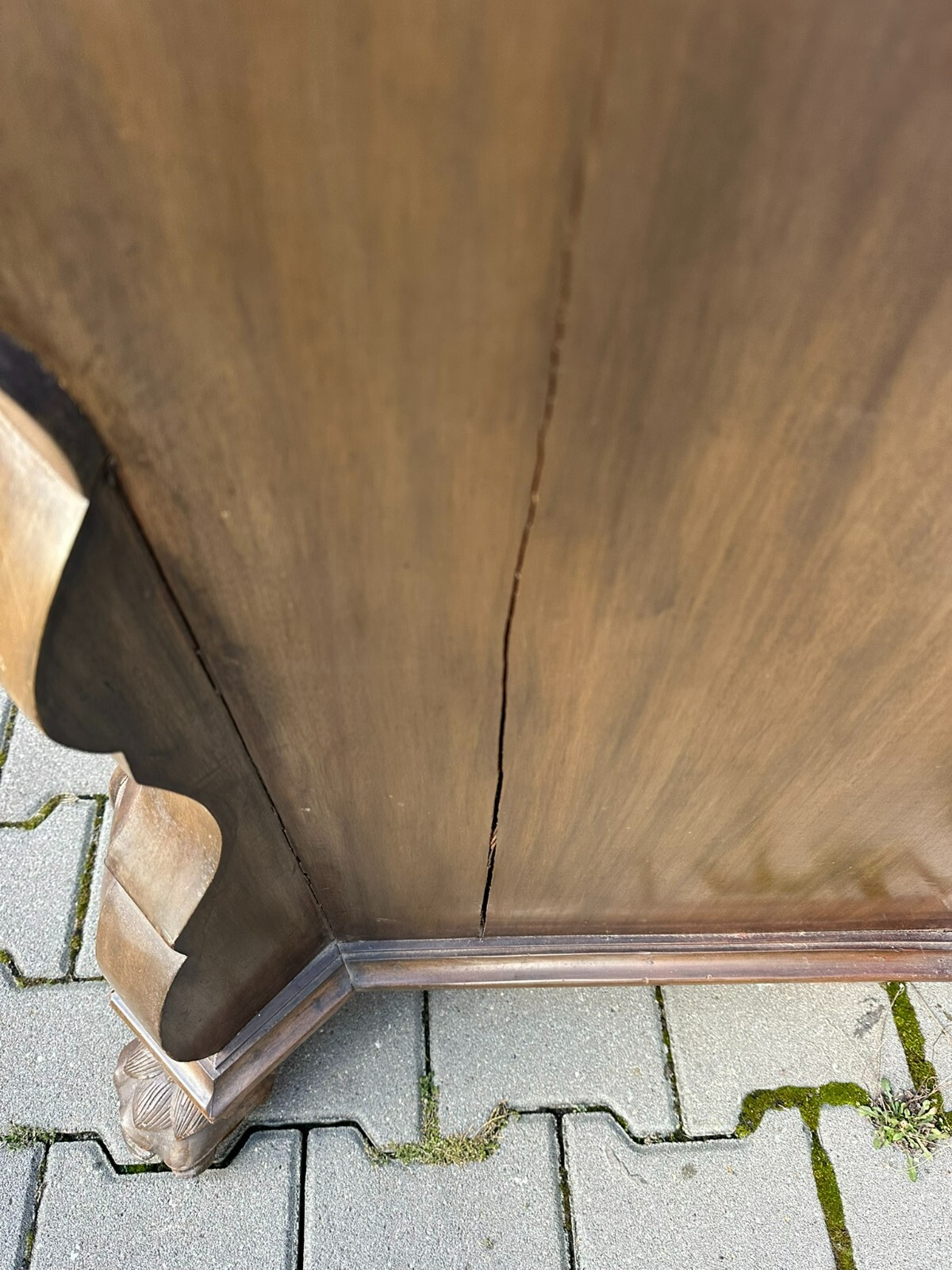 Massiver Barockstilsekretär, Holland 19 tes Jhdt. Mahagoni massiv, untere linke Ecke bestoßen, die Bruchstücke lose beiliegend. An der Sekretärklappe und der rechten Seitenwand Dehnungsrisse. Im Innenraum die Filzfläche berieben und fleckig, Schubladeninnenräume zum Teil fleckig. Oberfläche insgesamt leicht berieben. Der Sekretär ist sehr schwer, stabil und kann sofort genutzt werden. Abmessungen BTH: 118x55x103cm. Die rechte Seitenwand hat im Laufe der Zeit gearbeitet, daher diverse Dehnungsrisse auch an der Rückwand. Ein Schlüssel vorhanden, dieser passt nur zur Sekretärklappe, hier und an der Schublade keine Schlüssellochabdeckung vorhanden. Das obere Schloss ist grundsätzlich funktionsfähig, greift jedoch nicht ein, da die Sekretärklappe leicht nach außen gewölbt ist. Die massiven Griffe an den Schubladen sind leicht nach oben verbogen, unterste Schublade mittig mit hellem Fleck.
