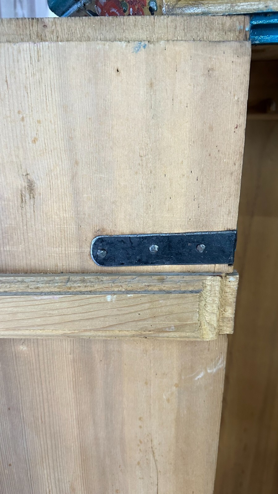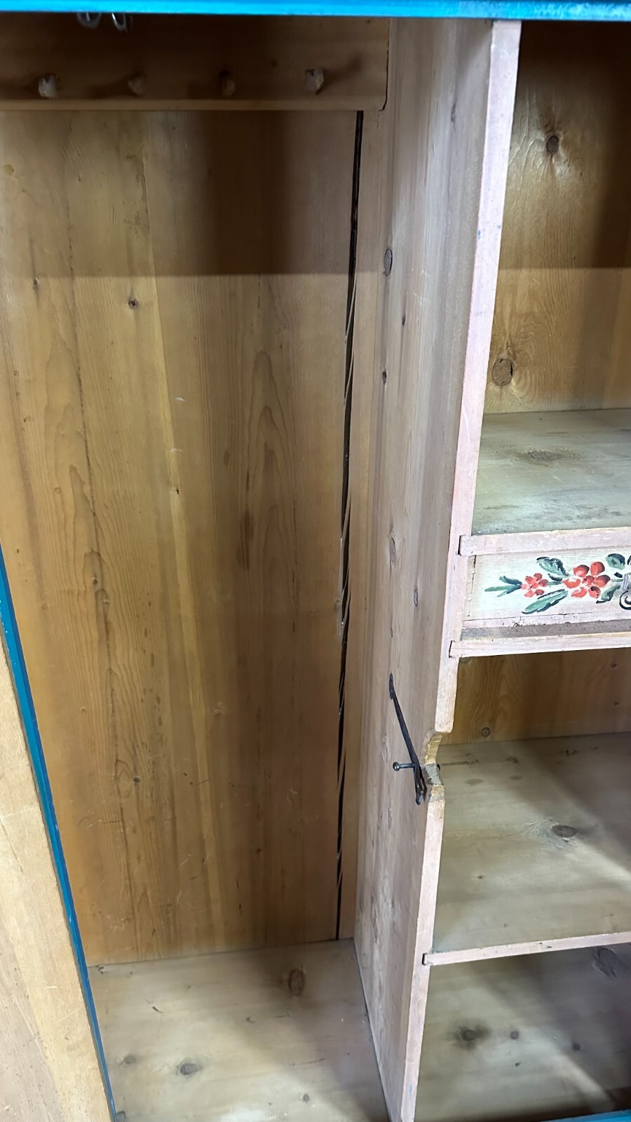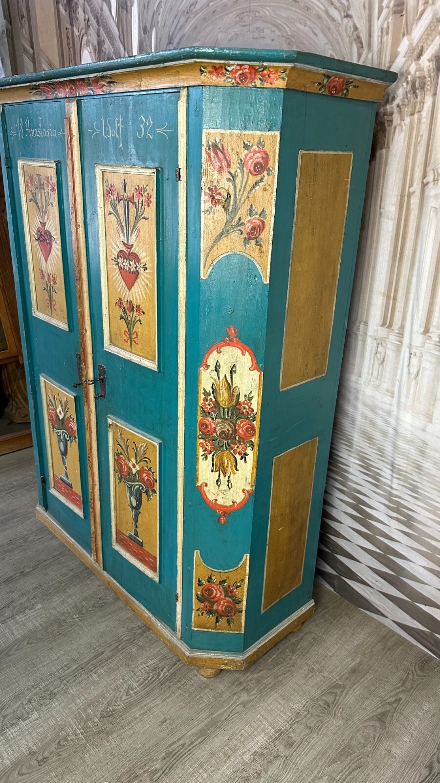 Sehr schöner, antiker Bauernschrank, Oberfläche komplett handbemalt, oben beizeichnet „Anastasia Wolf 1836“. Der Schrank wurde mal überarbeitet, wohl zum Teil nachgemalt (im Bereich der blauen Farbe). Die Füße und die untere Leiste leicht berieben, ebenfalls ist die Oberfläche an wenigen Stellen berieben. Am Korpus und an den Türen wenige, leichte Dehnungsrisse, die Rückwand hat durchgängig einen langen Dehnungsriss. Stabiler Zustand, Abmessungen BTH: 124x48x163cm. An der Seitenwand links unten zum Teil fleckig.