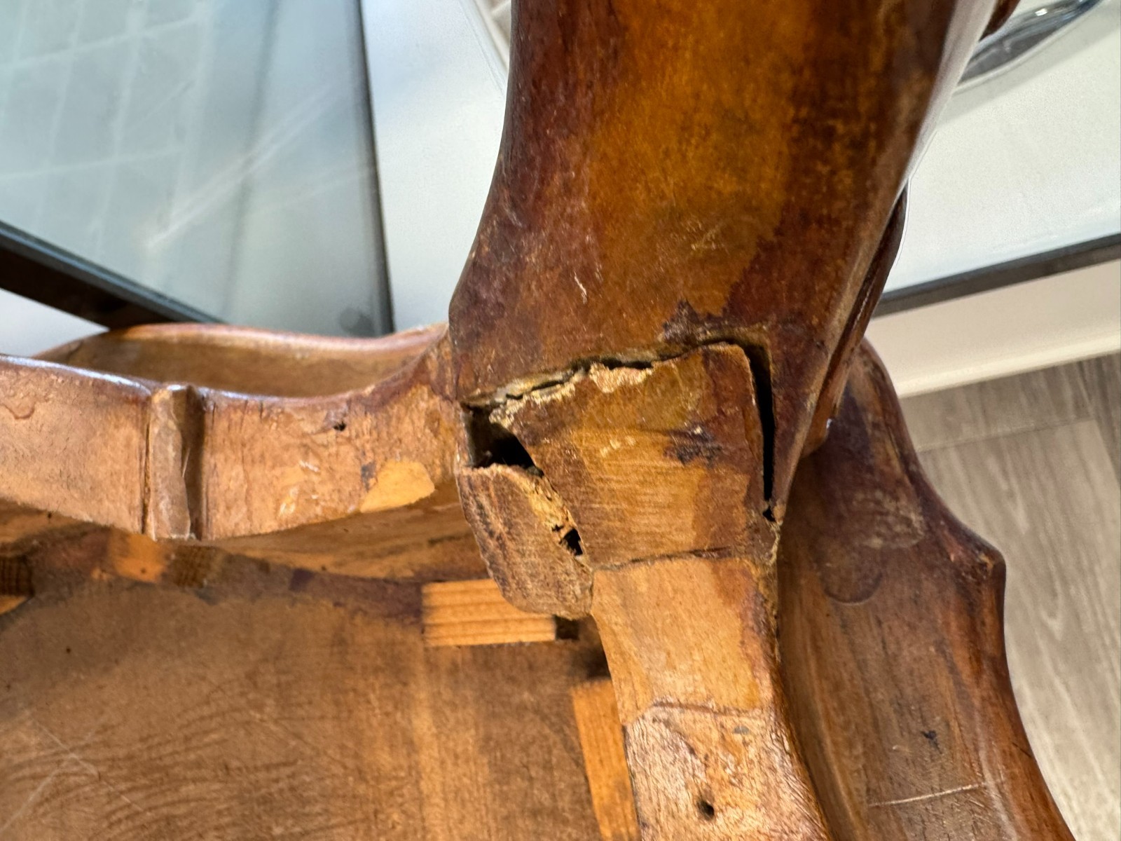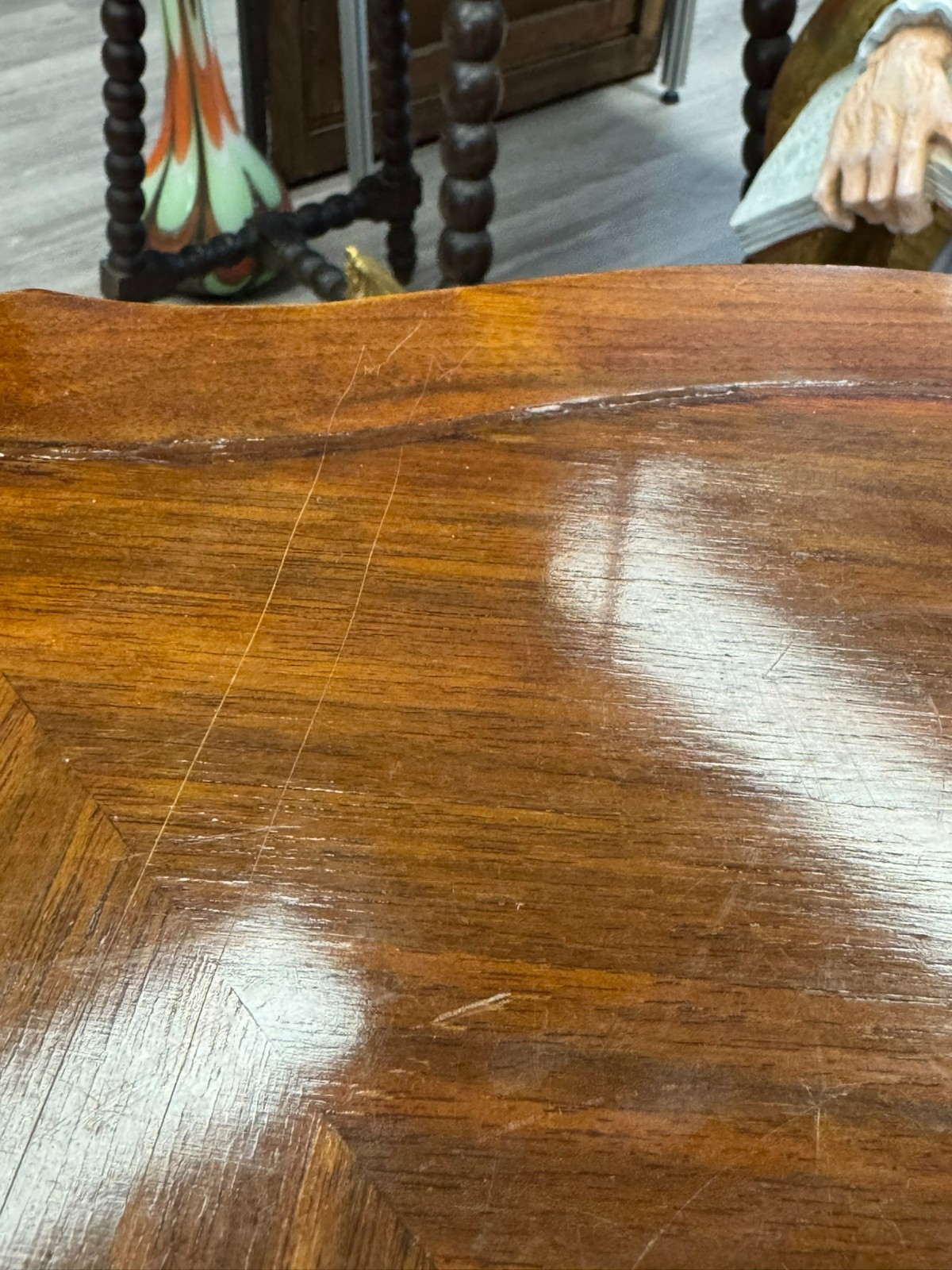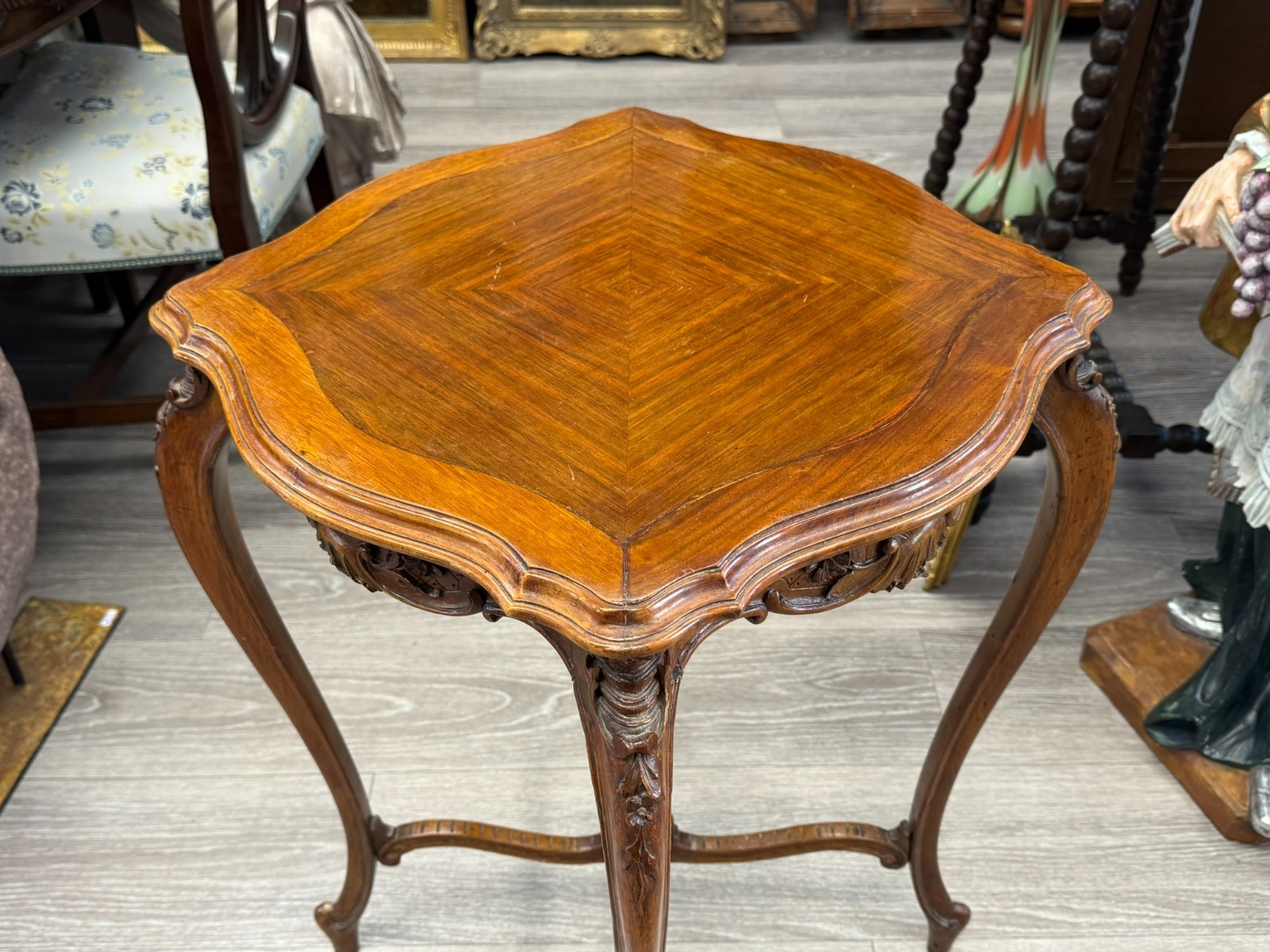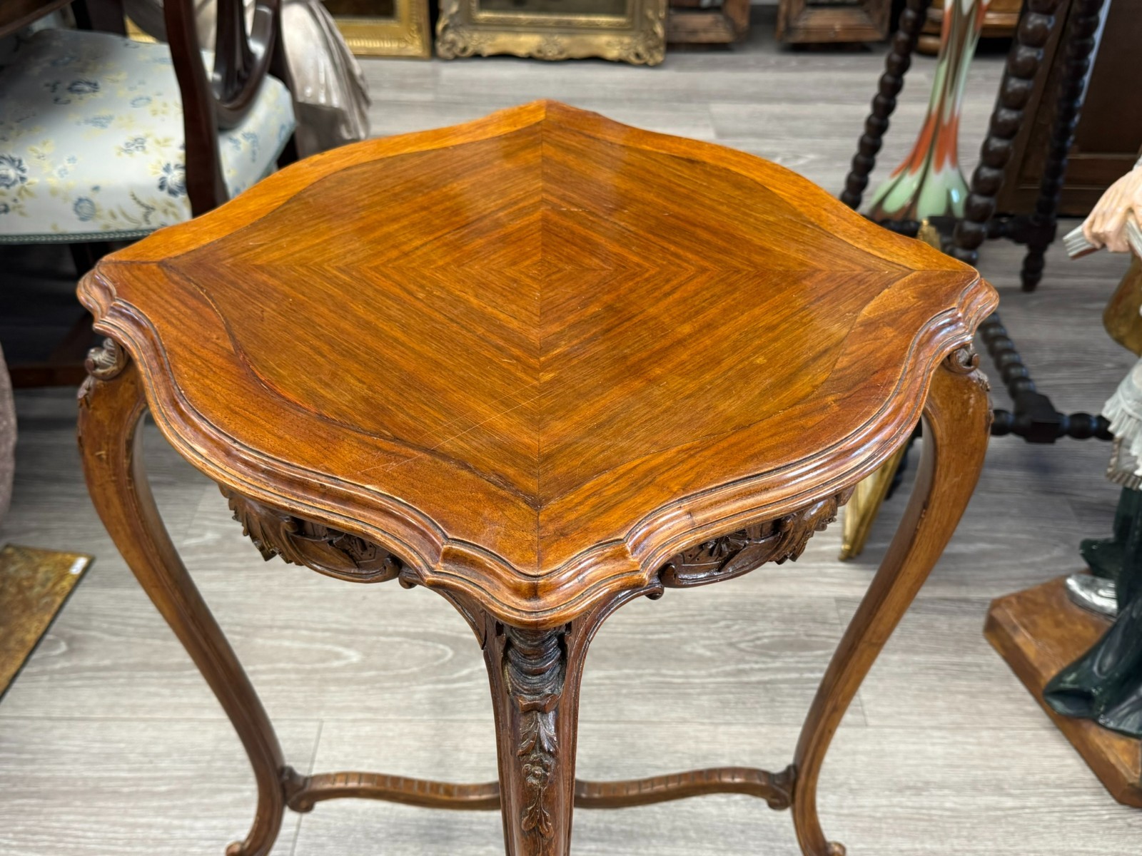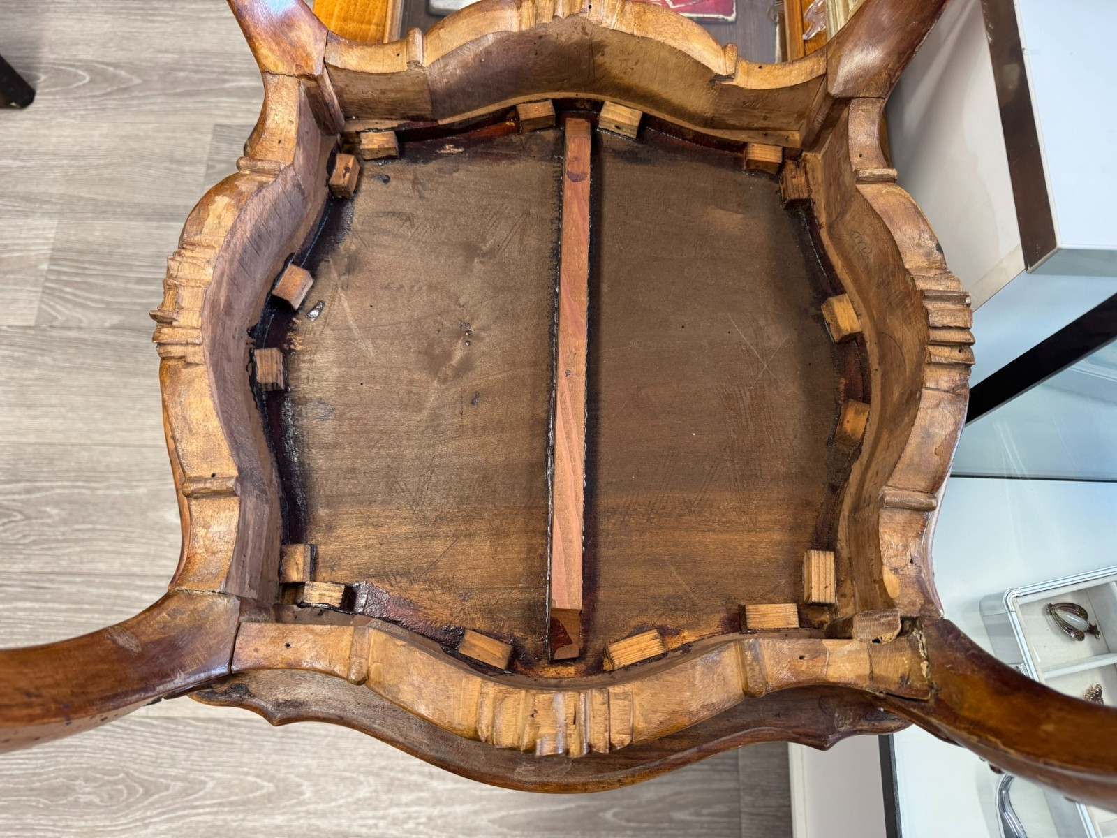Sehr schöner Beistelltisch, Neo Barock um 1900, Korpus aus massivem Nussholz, Tischablage mit schönem gespiegeltem Intarsienbild, Holz teils aufgebläht. Einer der Füße mal gebrochen aber altgeklebt, Oberfläche teils berieben, hinkt leicht, Füße müssen beim endgültigen Aufstellen angepasst werden, stabiler Zustand, Abmessungen BTH: 50x50x70cm. Der Tisch wurde mal professionell restauriert, Oberfläche zum Teil berieben.