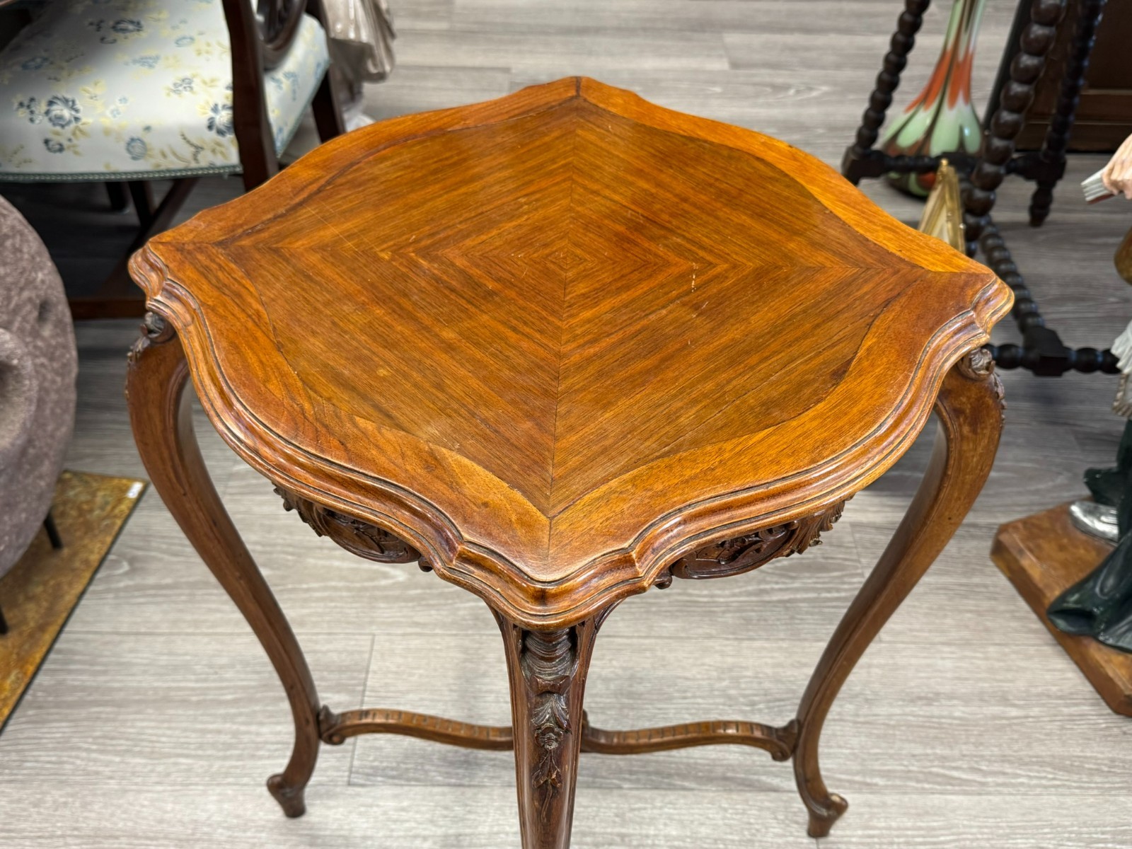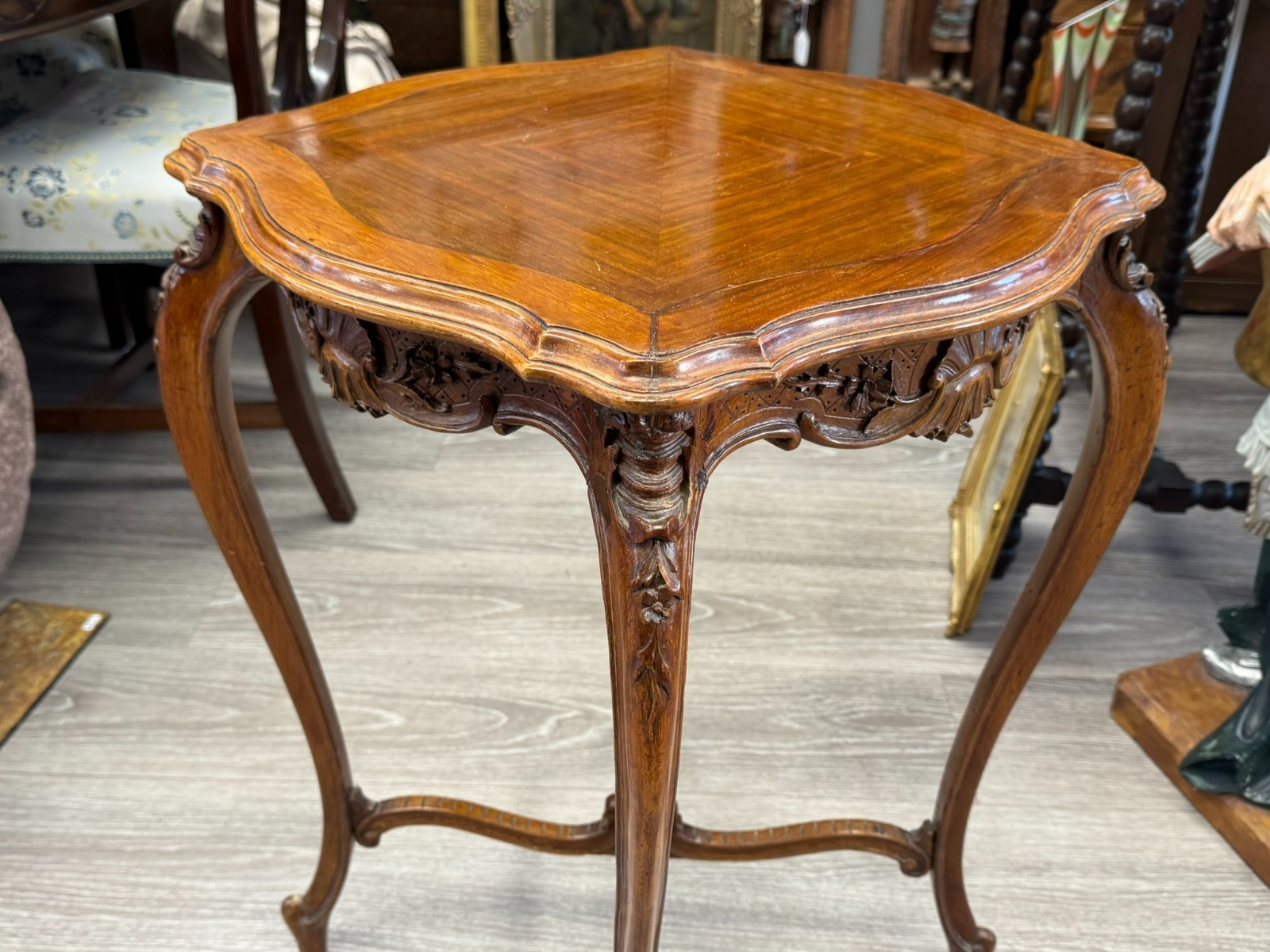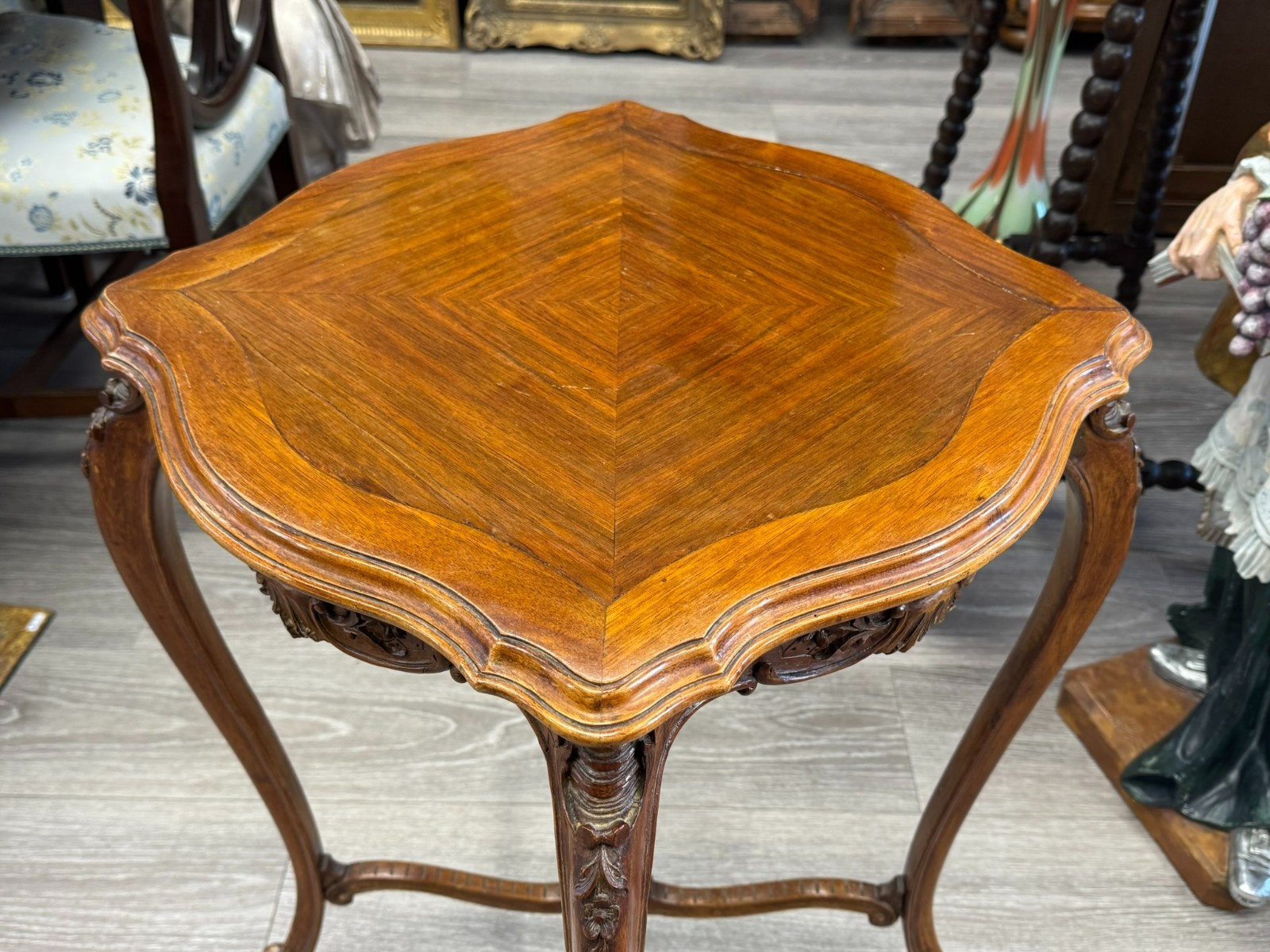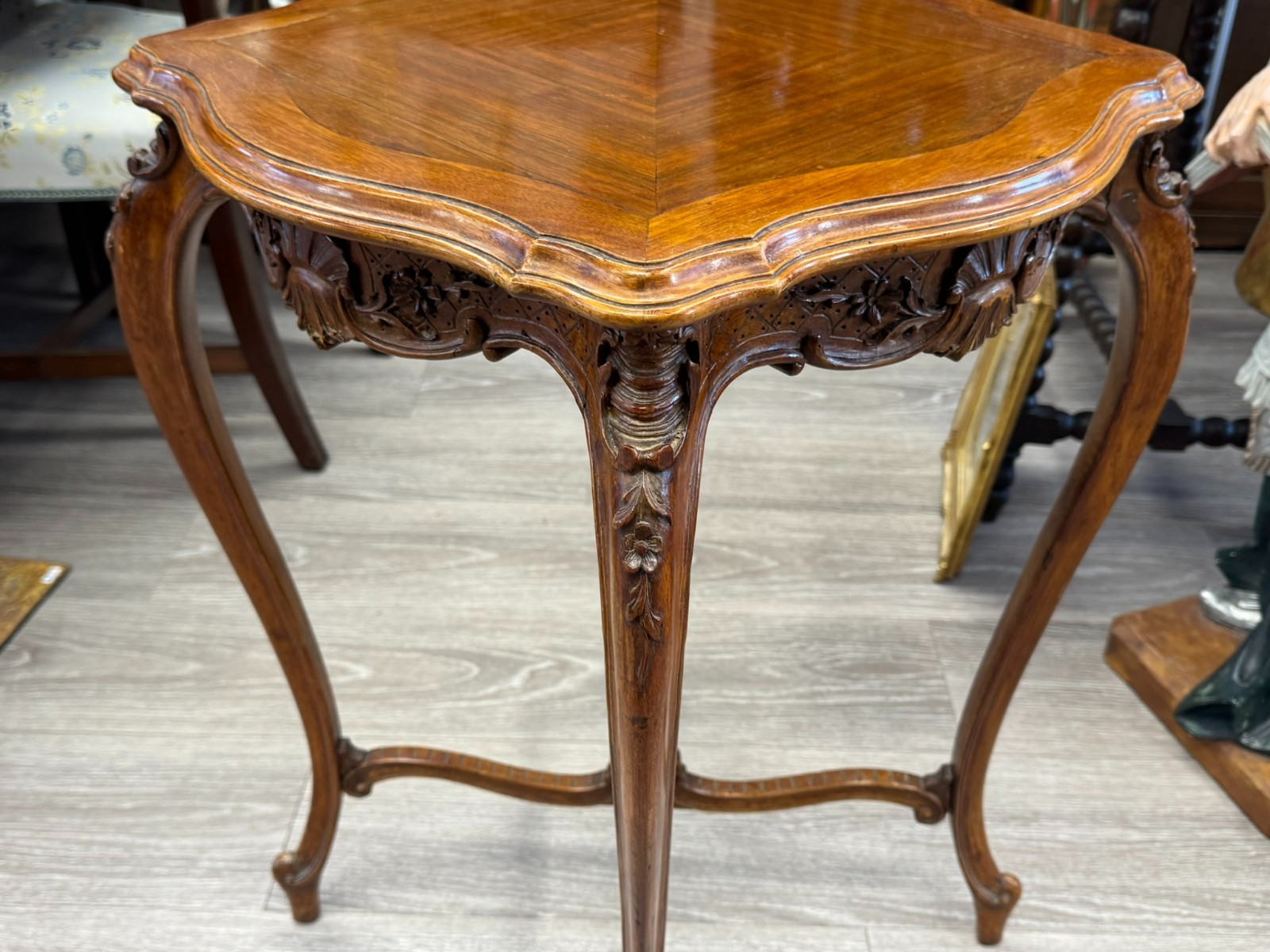 Sehr schöner Beistelltisch, Neo Barock um 1900, Korpus aus massivem Nussholz, Tischablage mit schönem gespiegeltem Intarsienbild, Holz teils aufgebläht. Einer der Füße mal gebrochen aber altgeklebt, Oberfläche teils berieben, hinkt leicht, Füße müssen beim endgültigen Aufstellen angepasst werden, stabiler Zustand, Abmessungen BTH: 50x50x70cm. Der Tisch wurde mal professionell restauriert, Oberfläche zum Teil berieben.