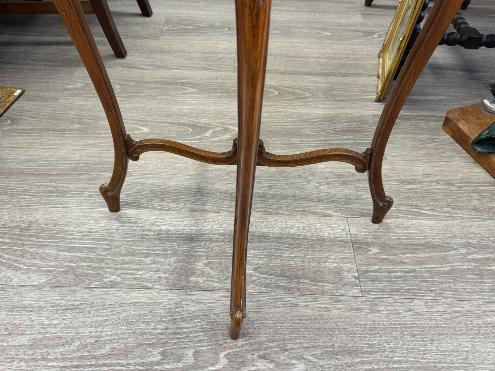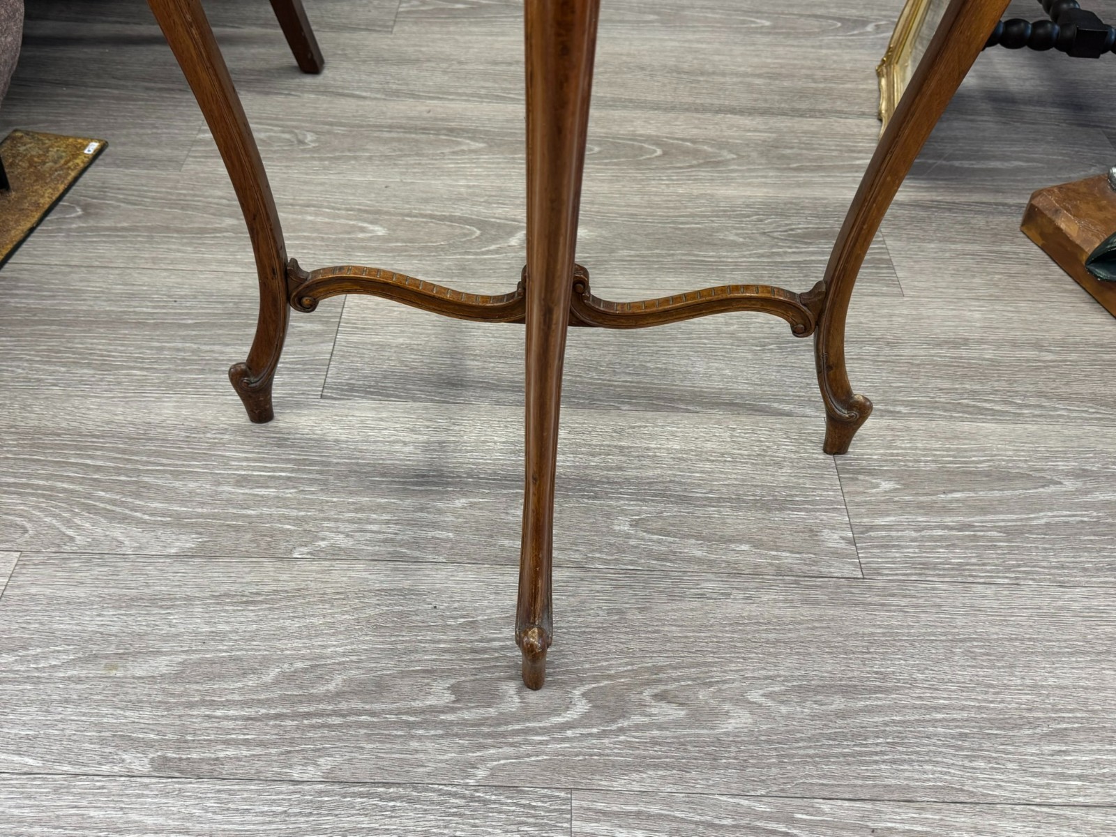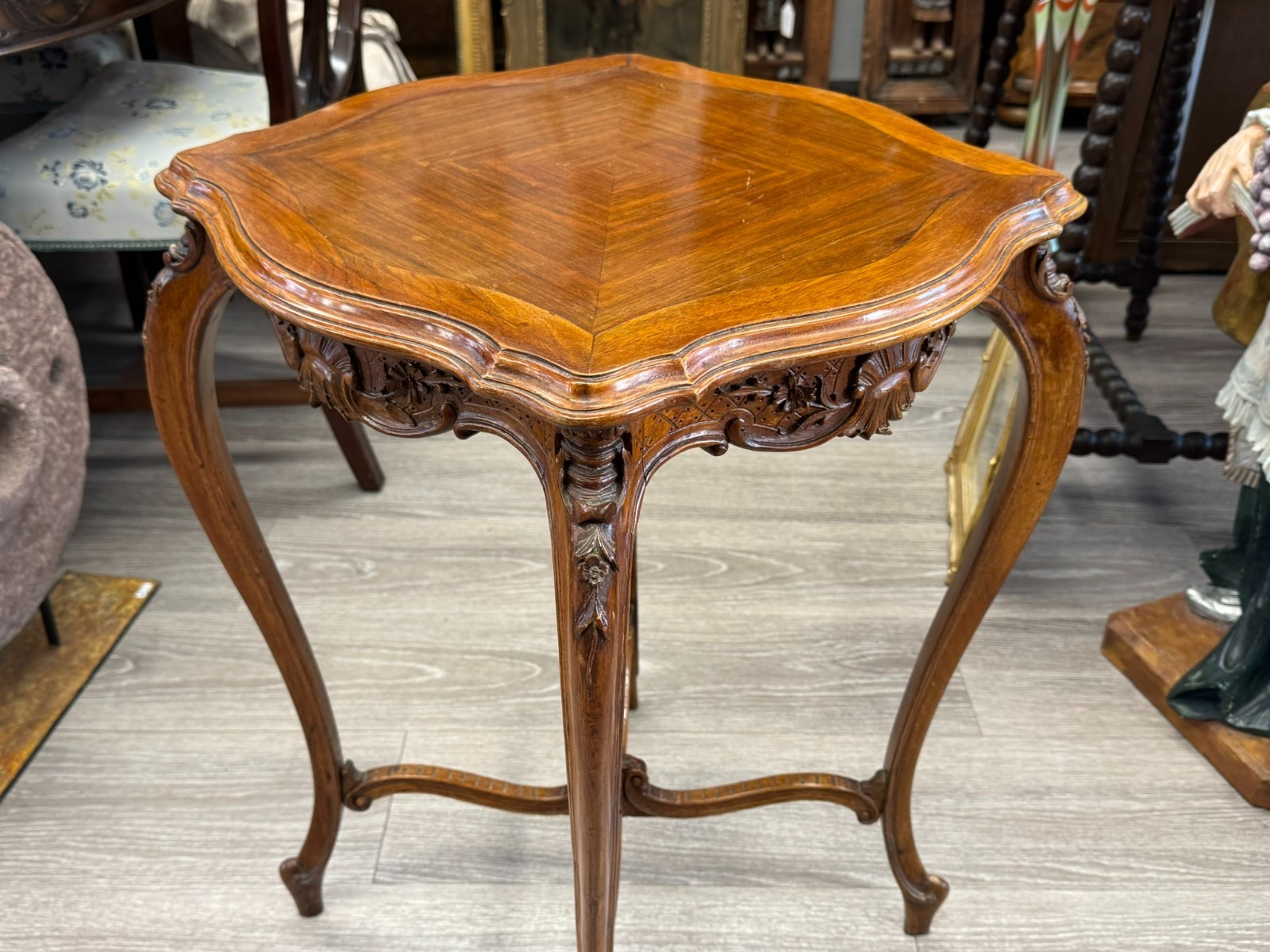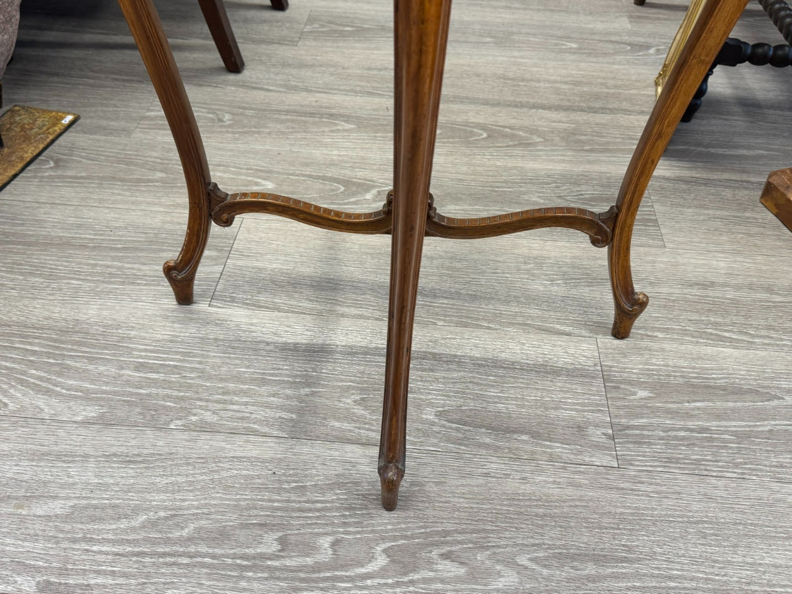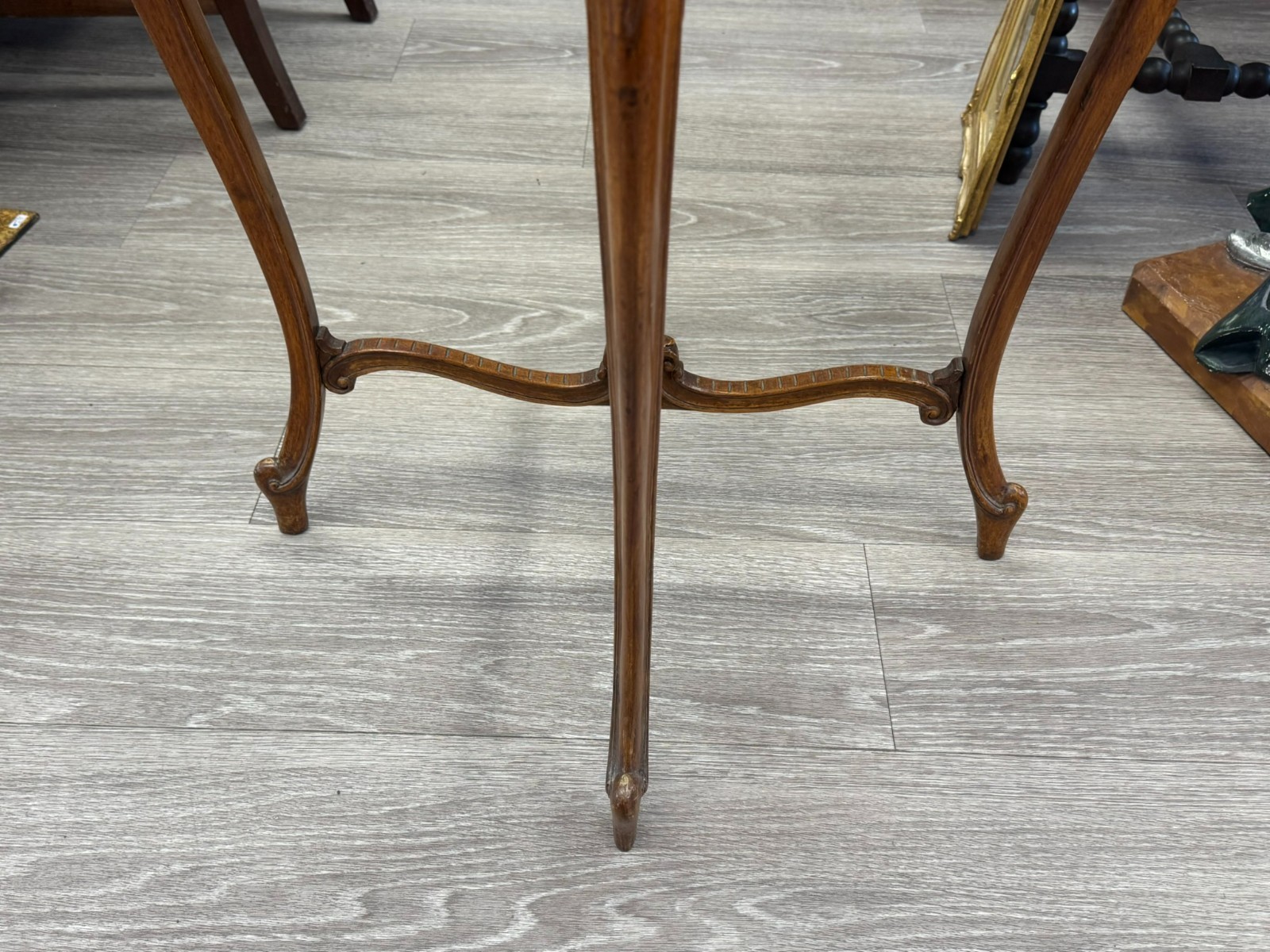 Sehr schöner Beistelltisch, Neo Barock um 1900, Korpus aus massivem Nussholz, Tischablage mit schönem gespiegeltem Intarsienbild, Holz teils aufgebläht. Einer der Füße mal gebrochen aber altgeklebt, Oberfläche teils berieben, hinkt leicht, Füße müssen beim endgültigen Aufstellen angepasst werden, stabiler Zustand, Abmessungen BTH: 50x50x70cm. Der Tisch wurde mal professionell restauriert, Oberfläche zum Teil berieben.
