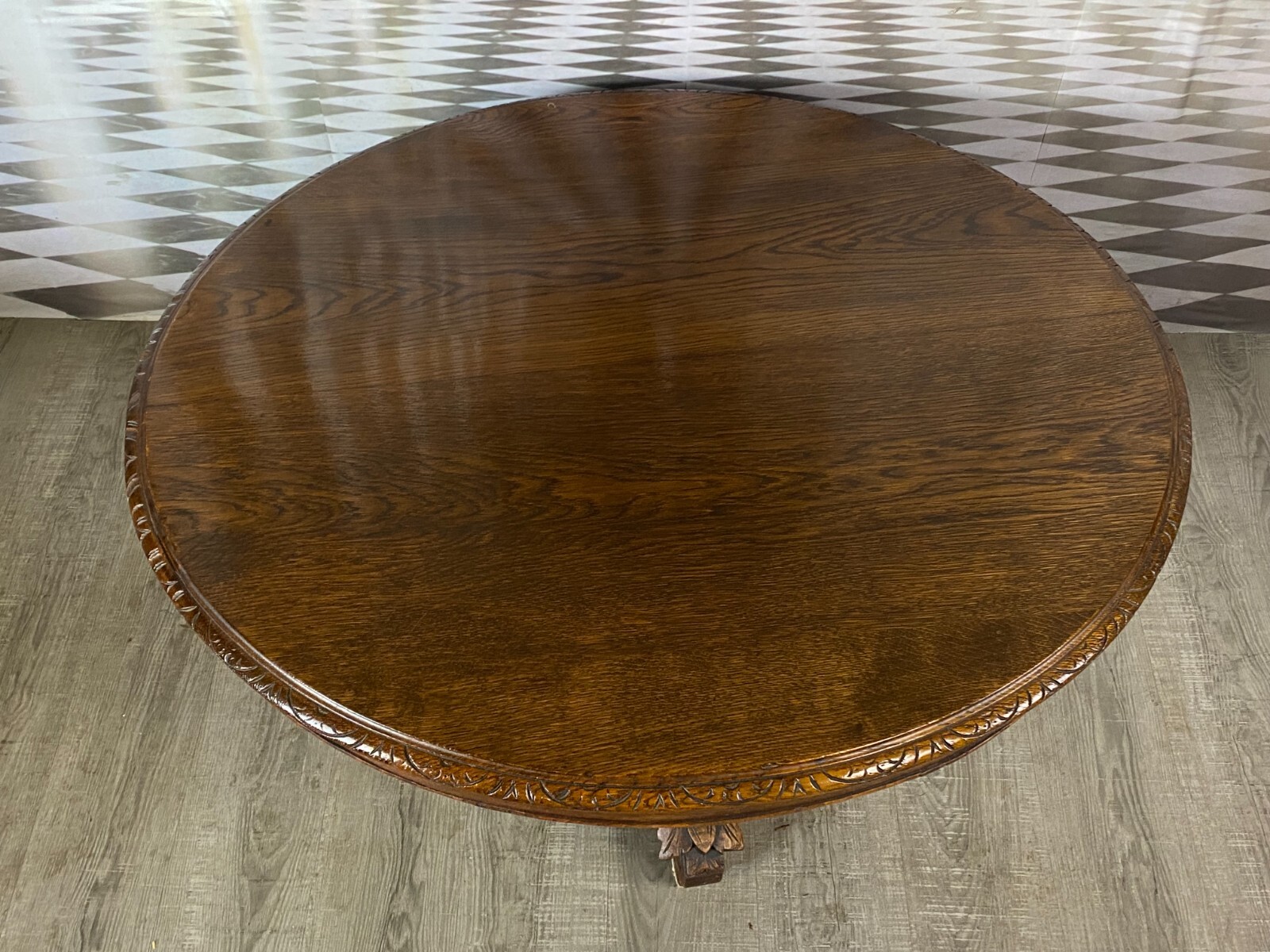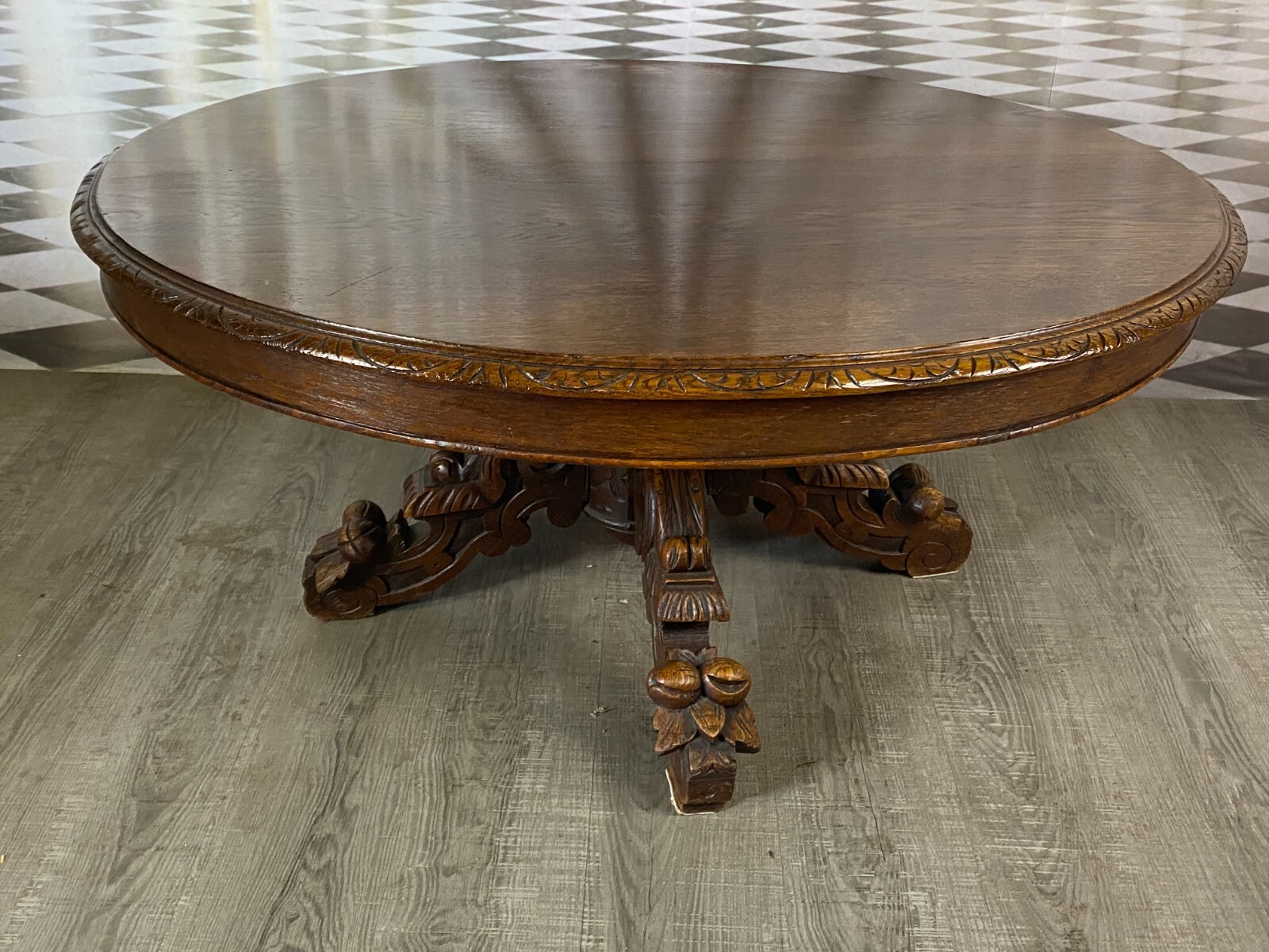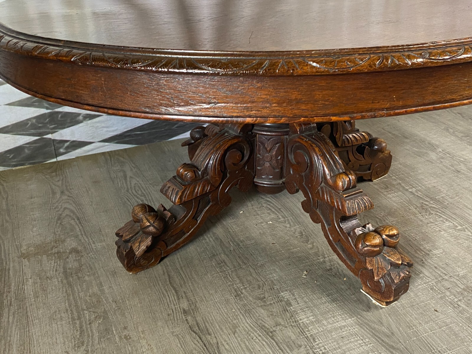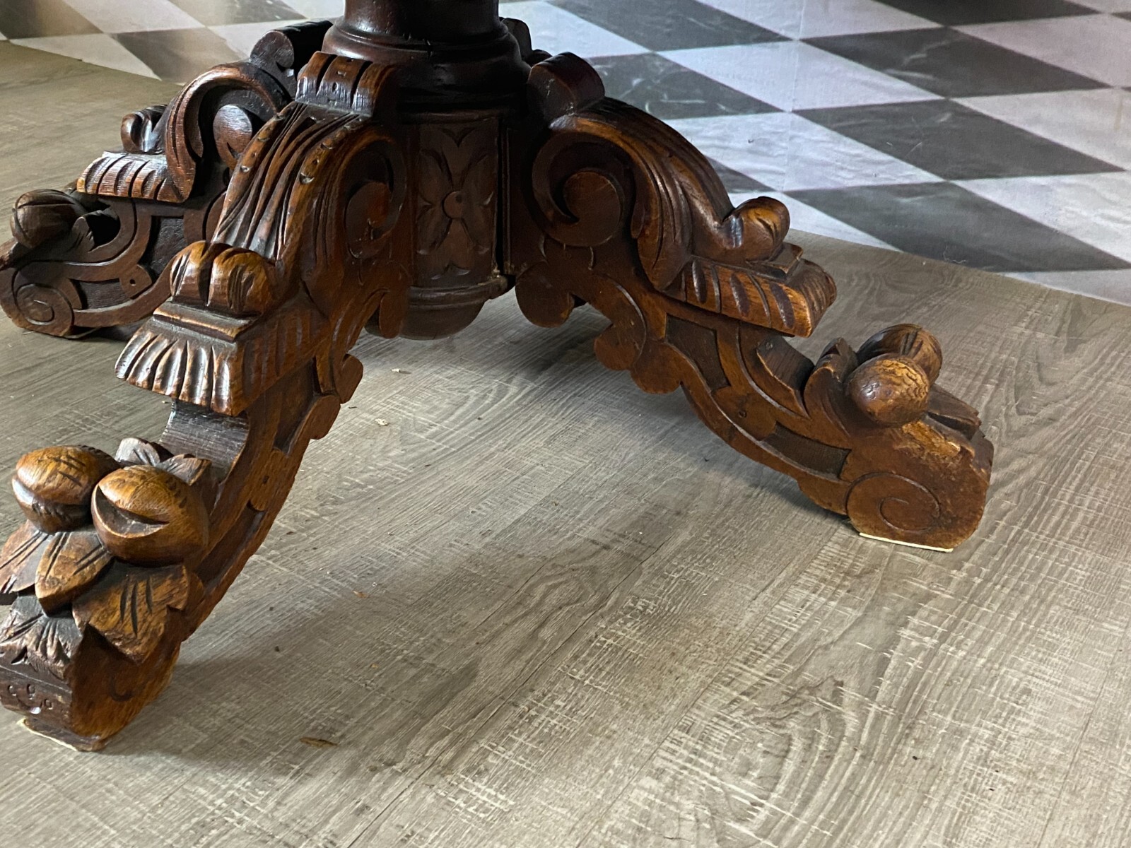 Antiker Beistelltisch um 1880, Henri Deux Stil. Eiche massiv mit Prunkschnitzwerk am Fuss. Oberfläche minimal zerkratzt und ganz leicht fleckig. Der komplett Fuss und die Aufnahme zur Platte wurden überarbeitet, geschraubt und geklebt. Im Fussraum Abrieb und kleinere Unvollständigkeiten. Abmessungen BTH 114/101/55cm.