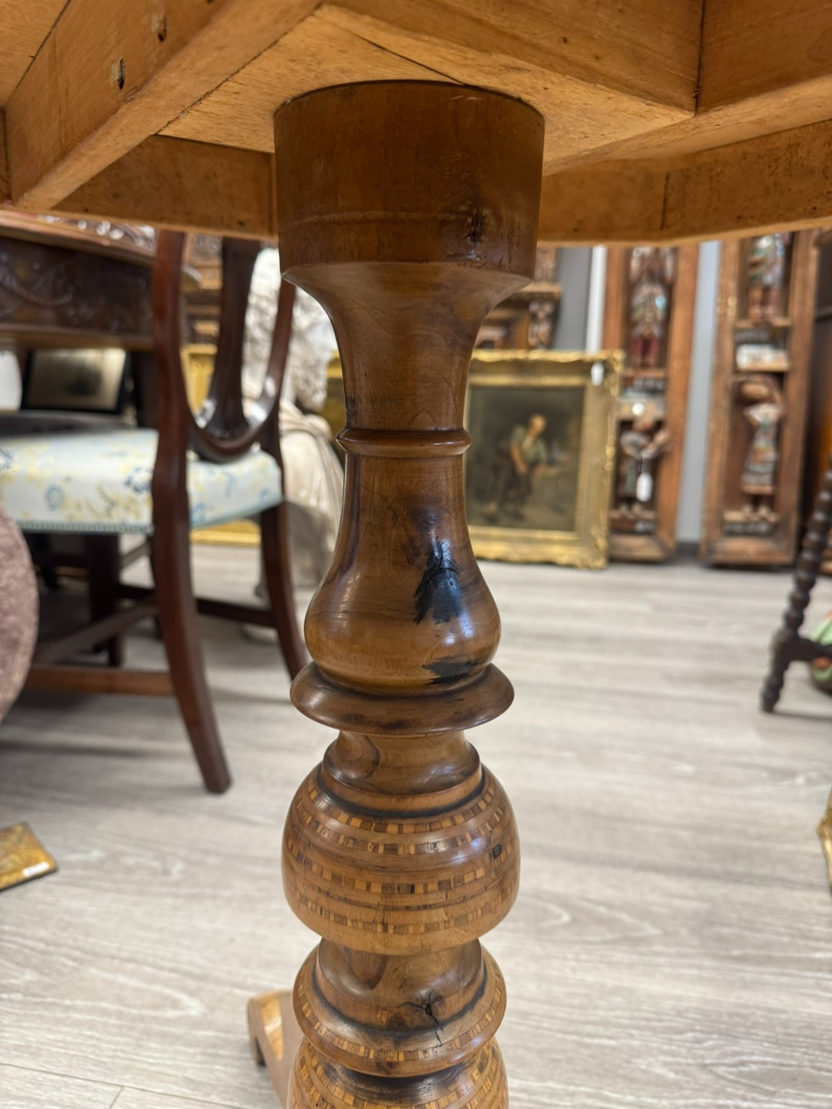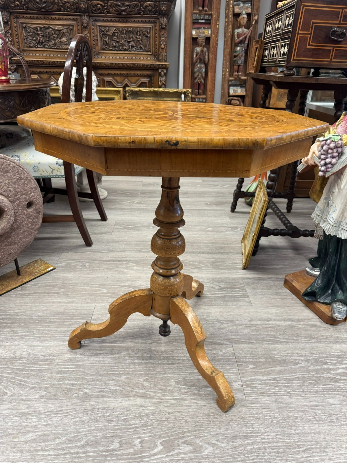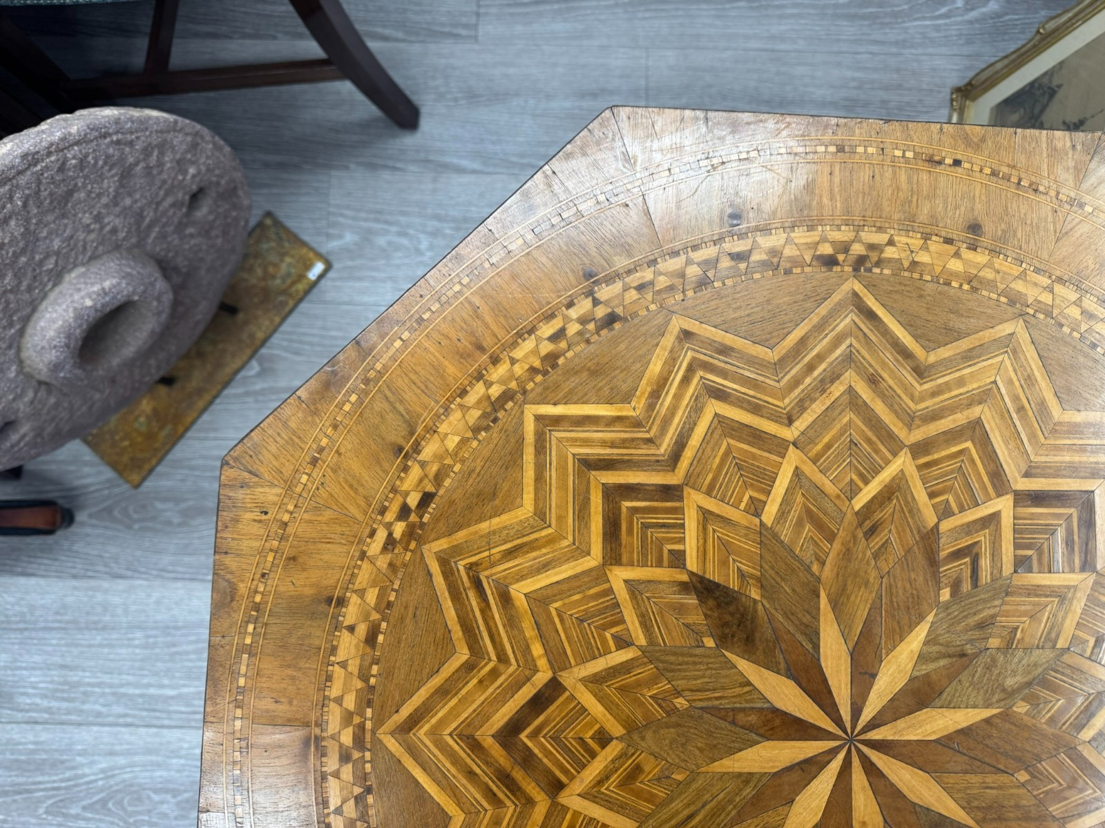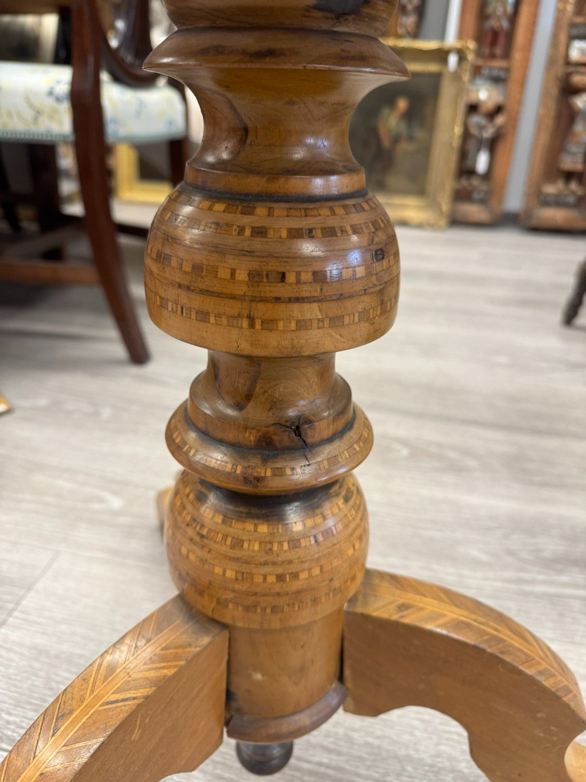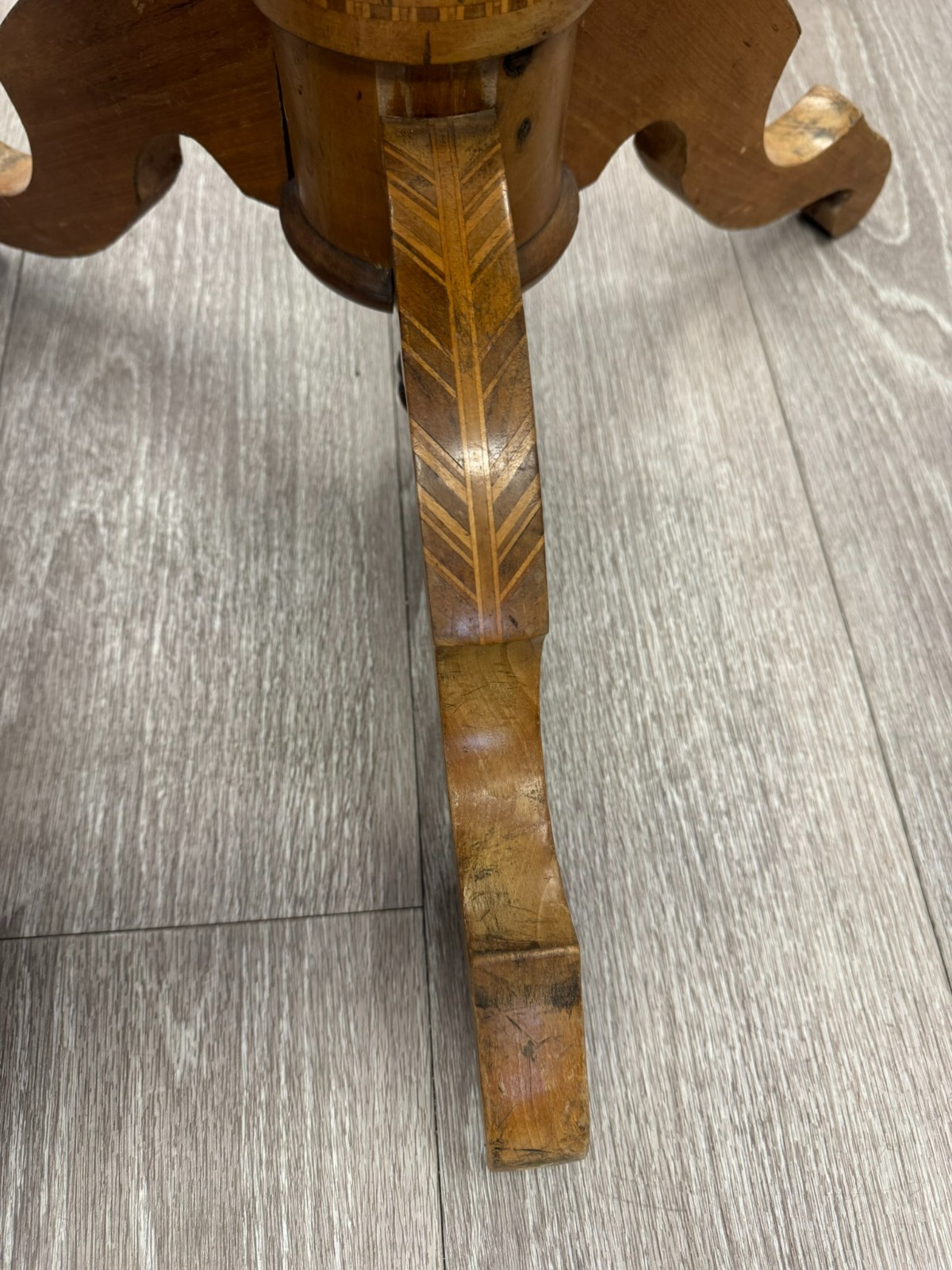 Sehr schöner, aufwendig intarsierter, Beistelltisch aus Nussbaum, mit Intarsieneinsätzen aus diversen Holzarten. Der Tisch ist im Fußbereich bestoßen und leicht berieben, einer der Füße ist in der Aufnahme locker, daher sieht es aus als wäre er etwas weiter unten befestigt als die anderen beiden, müsste beim endgültigen Aufstellen korrigiert werden. Sehr schöner Zustand, zum Teil berieben und leicht fleckig. Abmessungen BTH: 65x65x74cm.