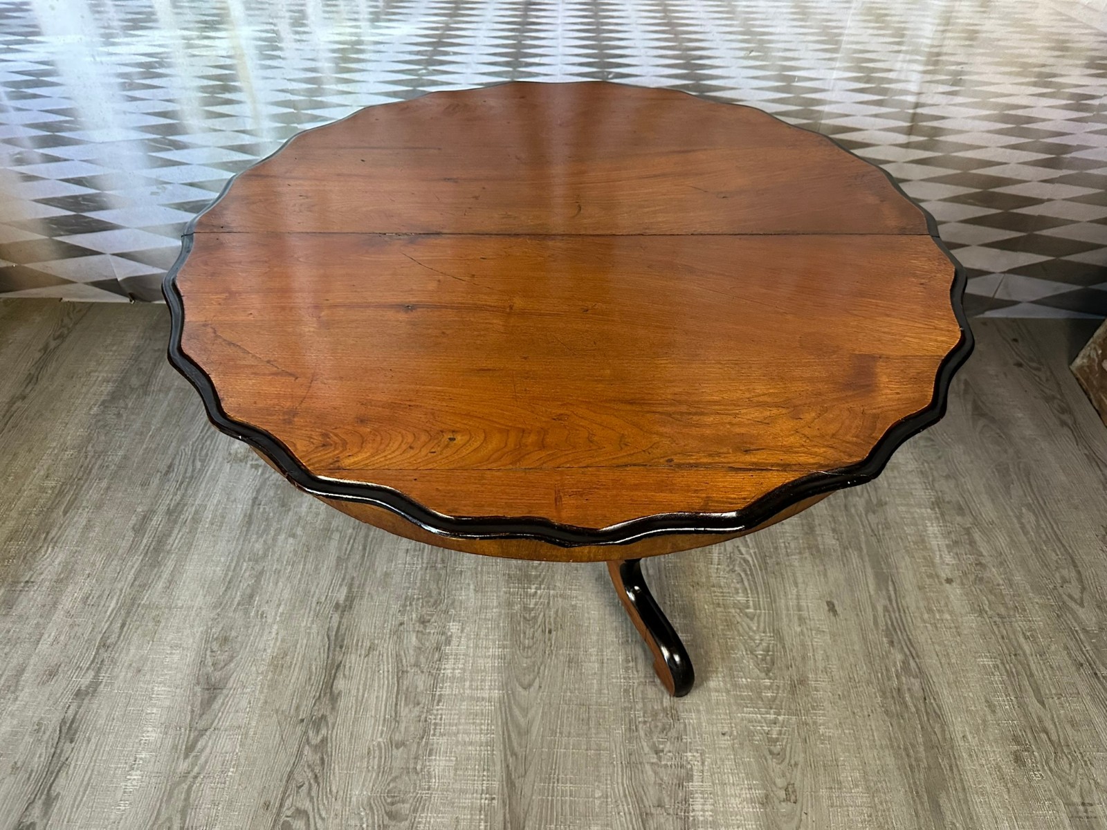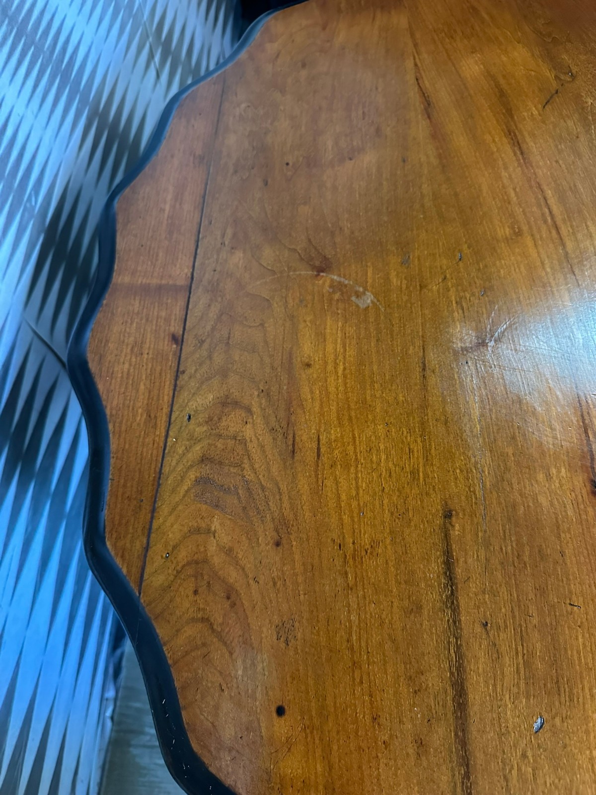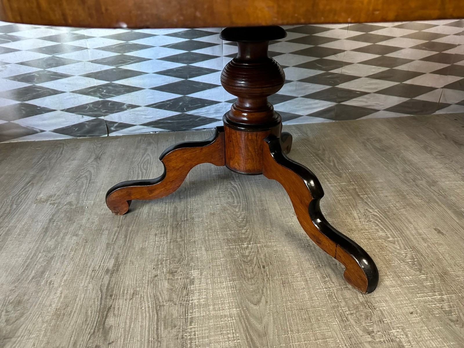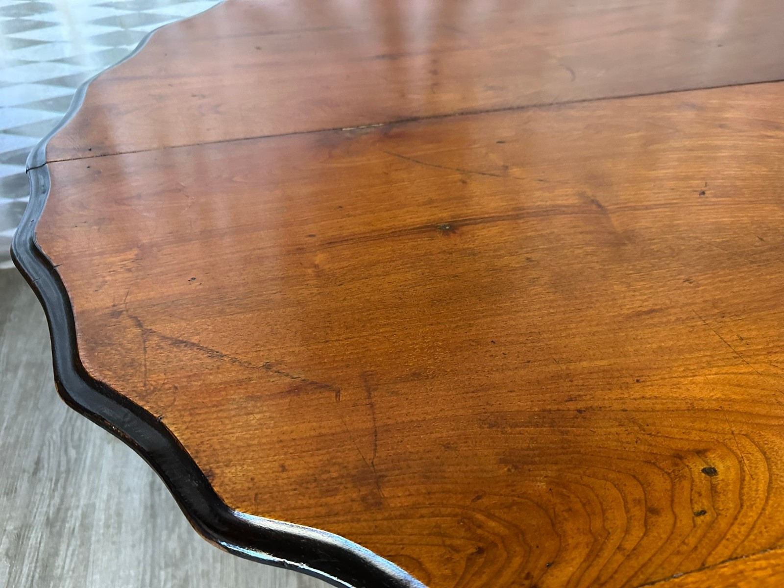 Antiker Beistelltisch, Oberfläche zum Teil ebonisiert, diese wurde mal komplett übergangen. Die obere Platte mit Dehnungsspalten, Flecken, Abrieb und kleineren Bestossungen. Die Ebonisierung zum Teil berieben, Stabiler Zustand, Abmessungen Höhe/Durchmesser 59/99cm.