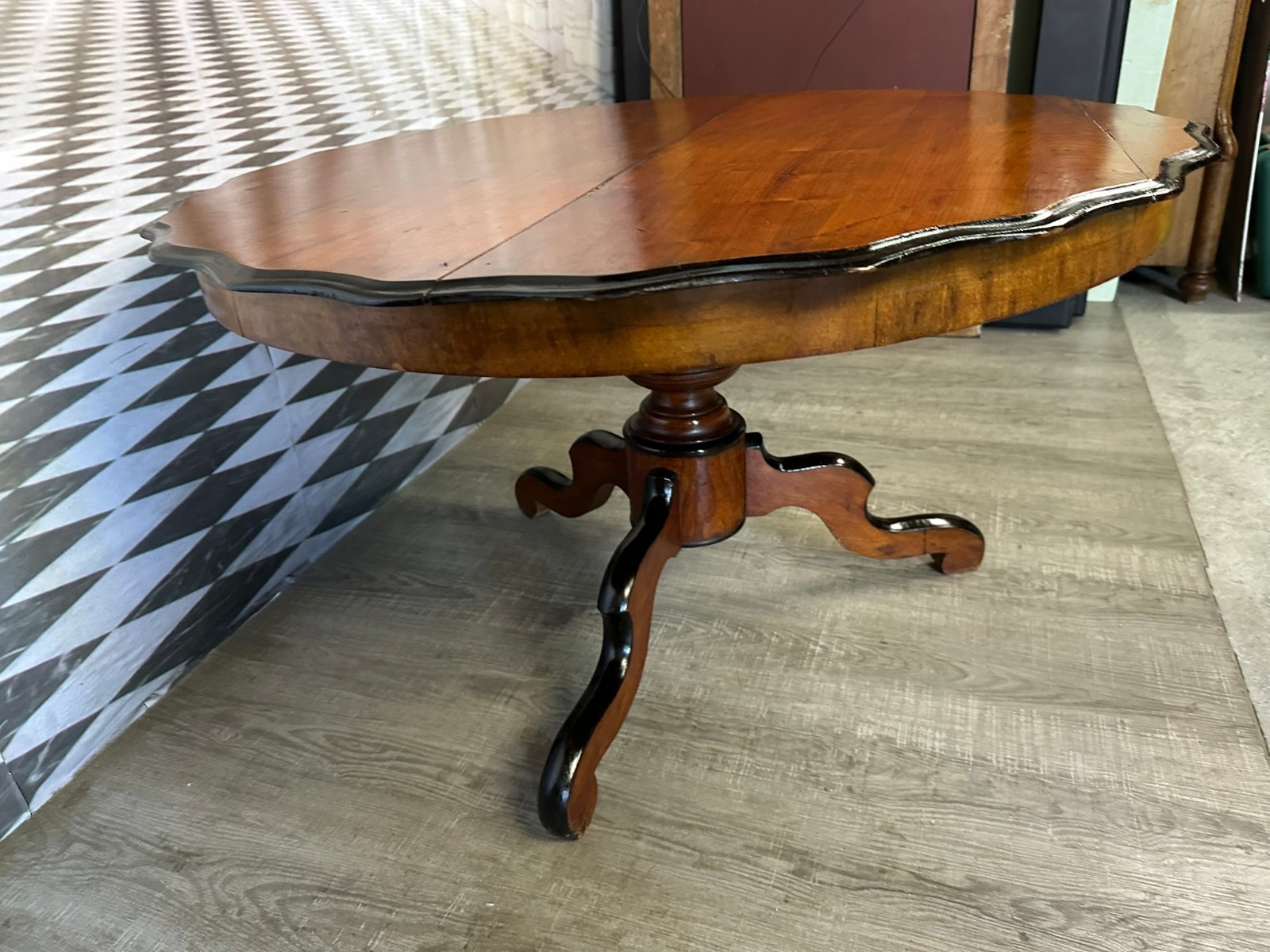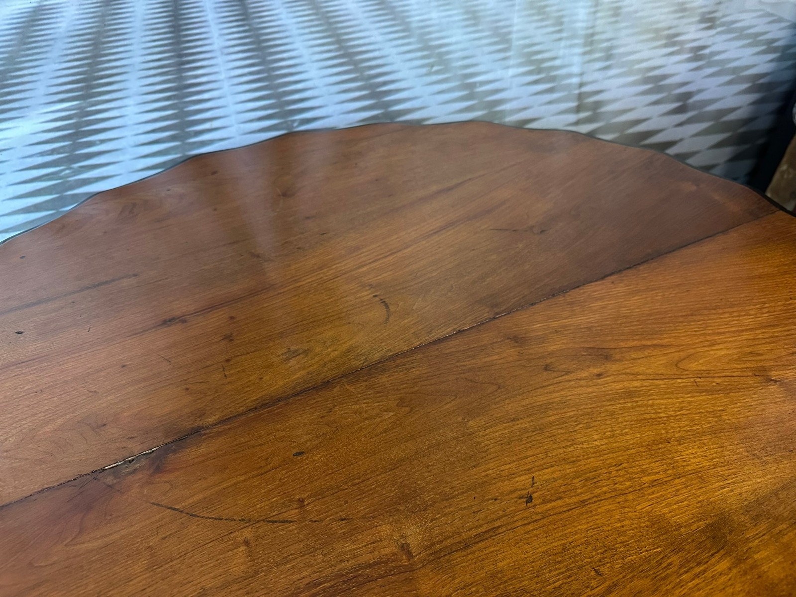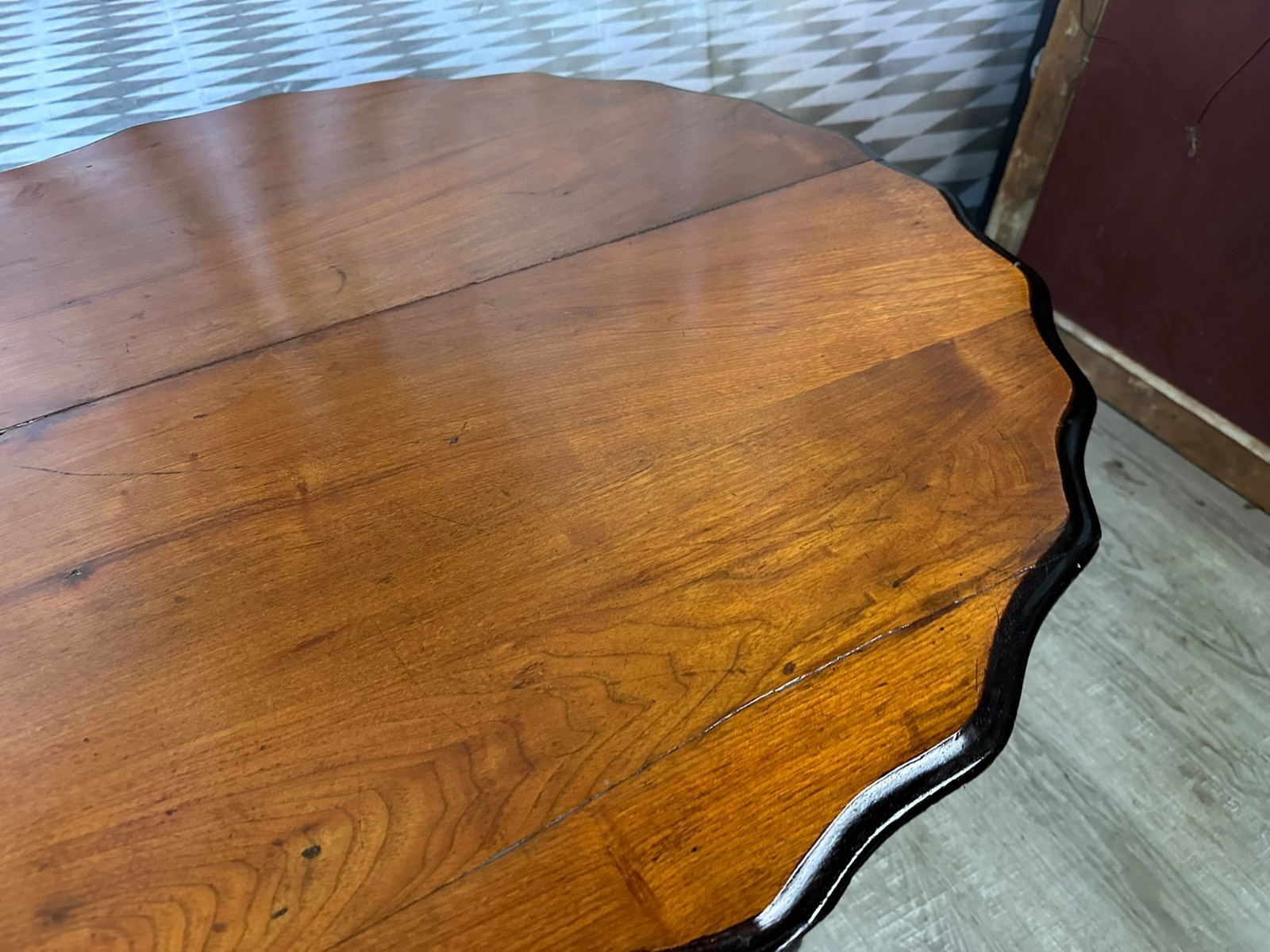 Antiker Beistelltisch, Oberfläche zum Teil ebonisiert, diese wurde mal komplett übergangen. Die obere Platte mit Dehnungsspalten, Flecken, Abrieb und kleineren Bestossungen. Die Ebonisierung zum Teil berieben, Stabiler Zustand, Abmessungen Höhe/Durchmesser 59/99cm.