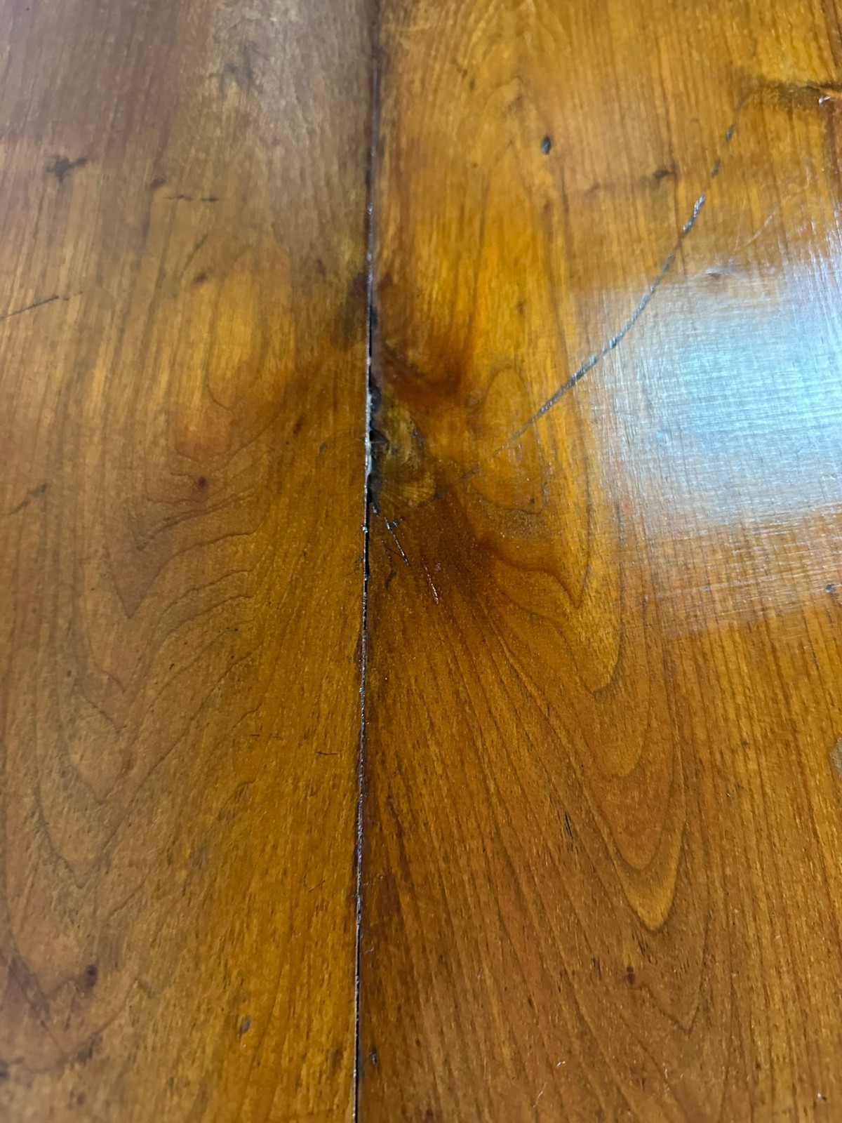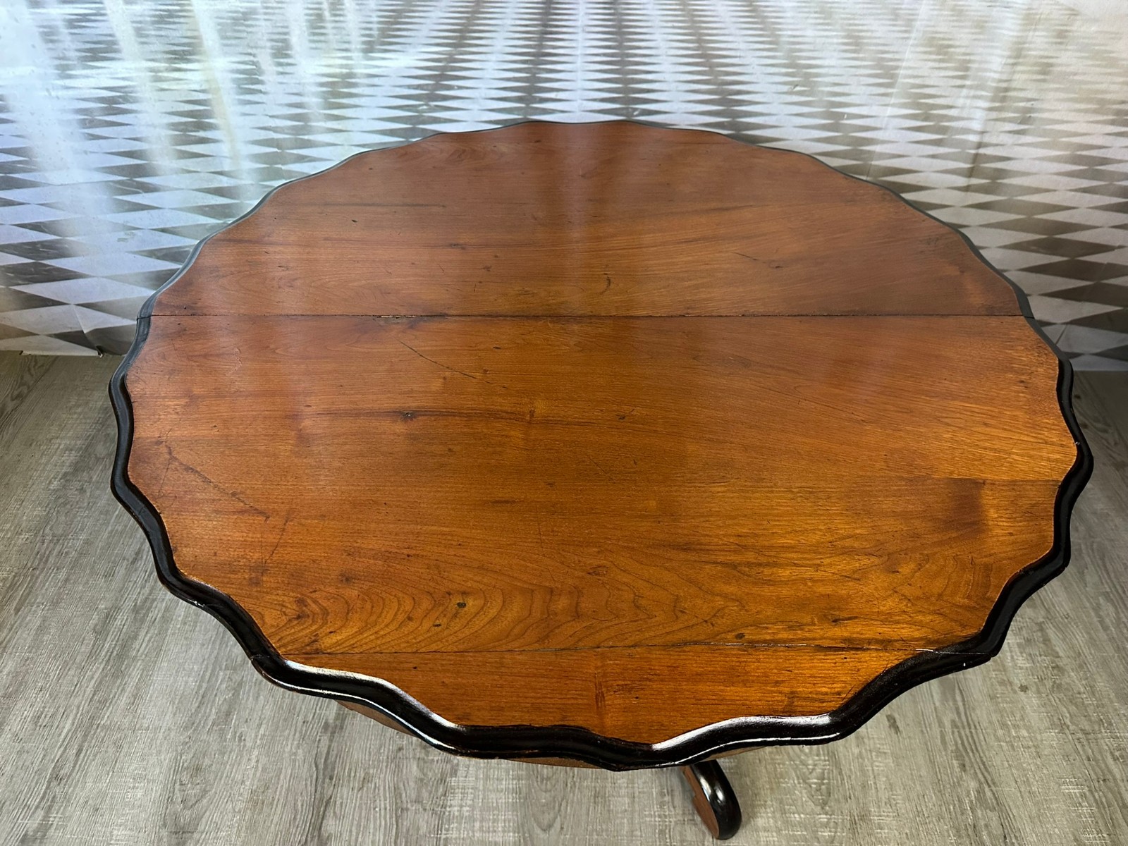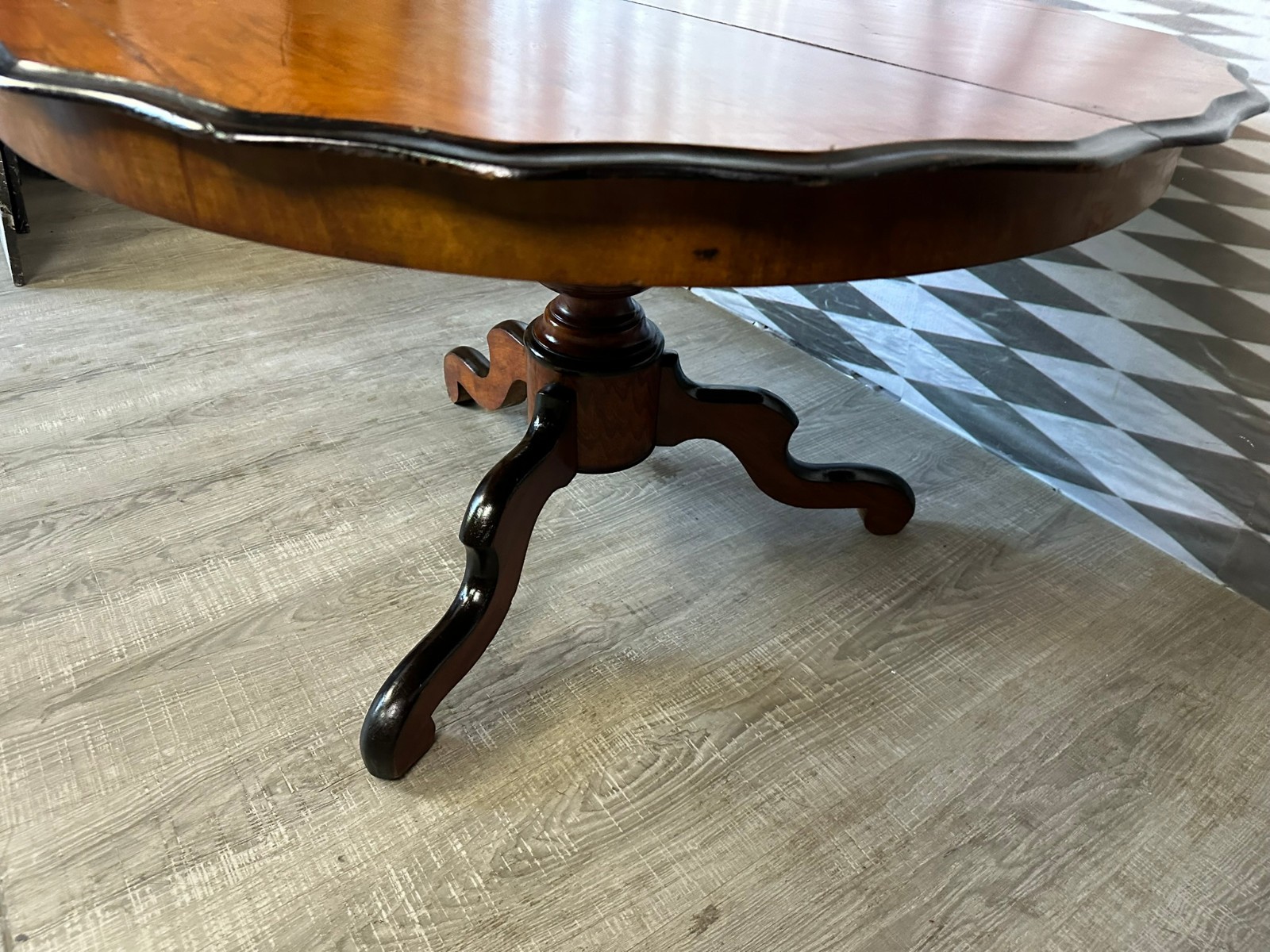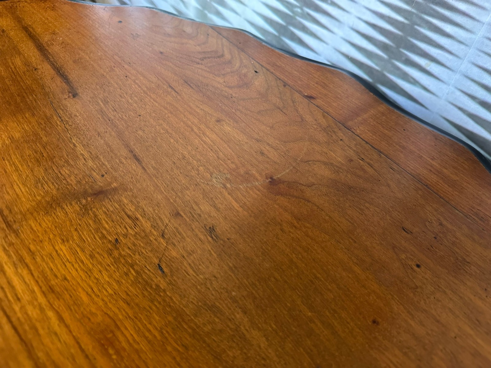 Antiker Beistelltisch, Oberfläche zum Teil ebonisiert, diese wurde mal komplett übergangen. Die obere Platte mit Dehnungsspalten, Flecken, Abrieb und kleineren Bestossungen. Die Ebonisierung zum Teil berieben, Stabiler Zustand, Abmessungen Höhe/Durchmesser 59/99cm.