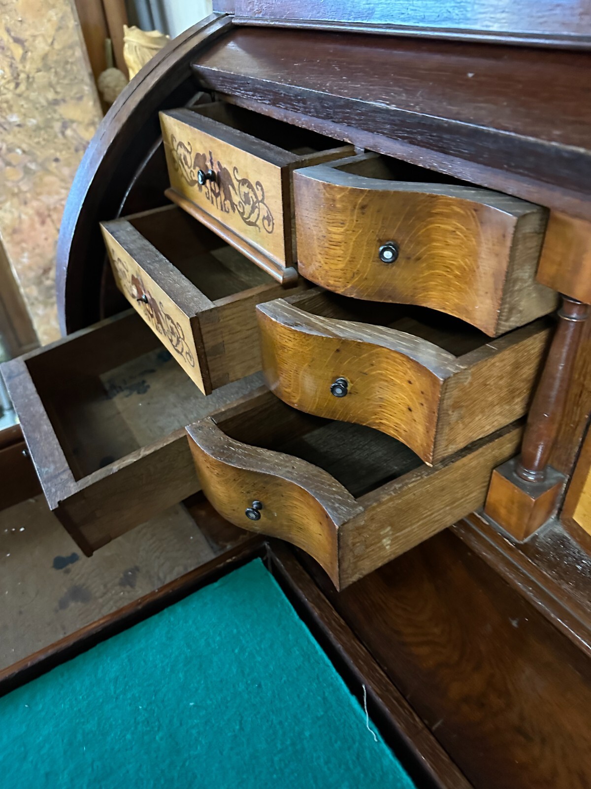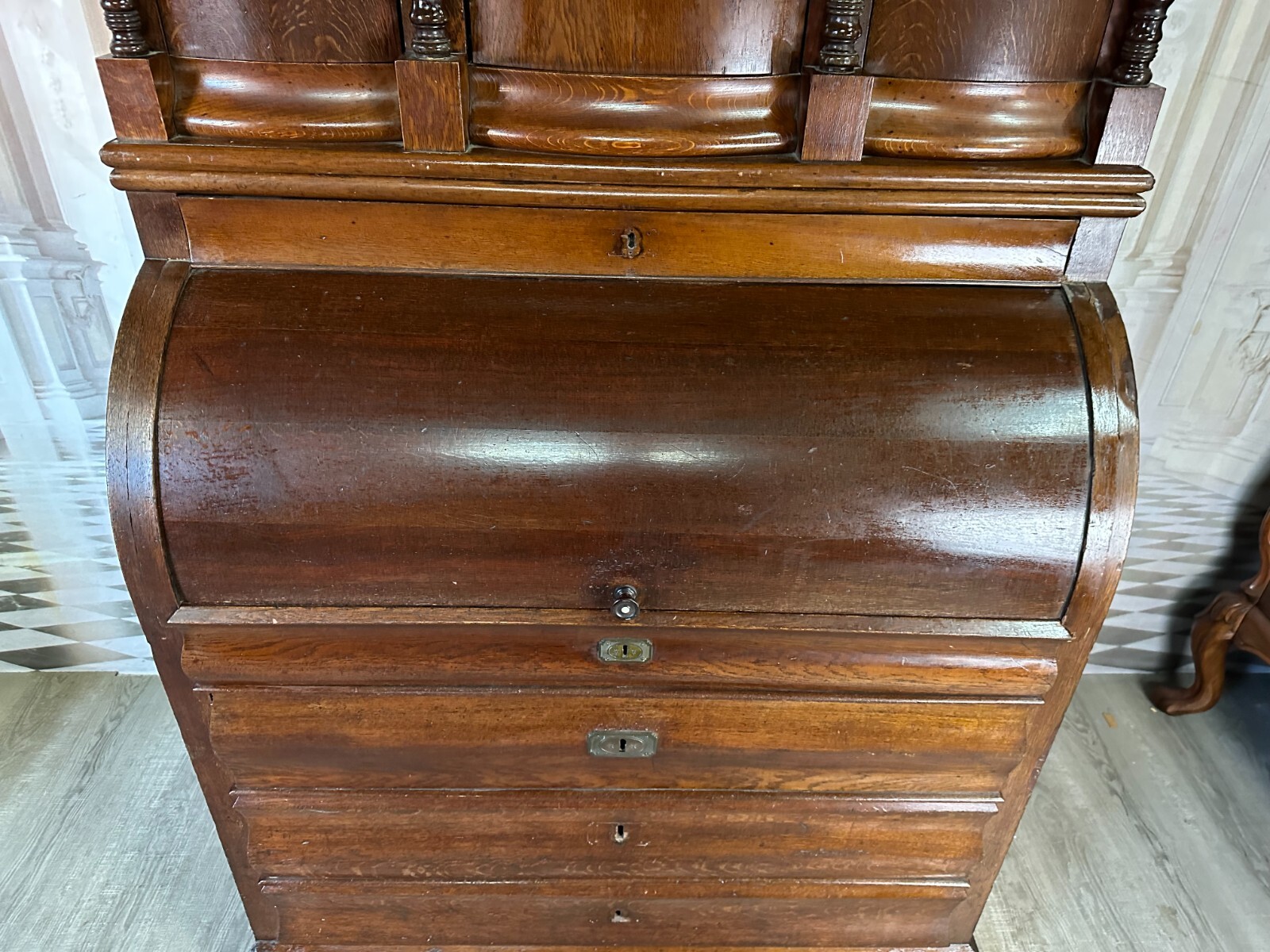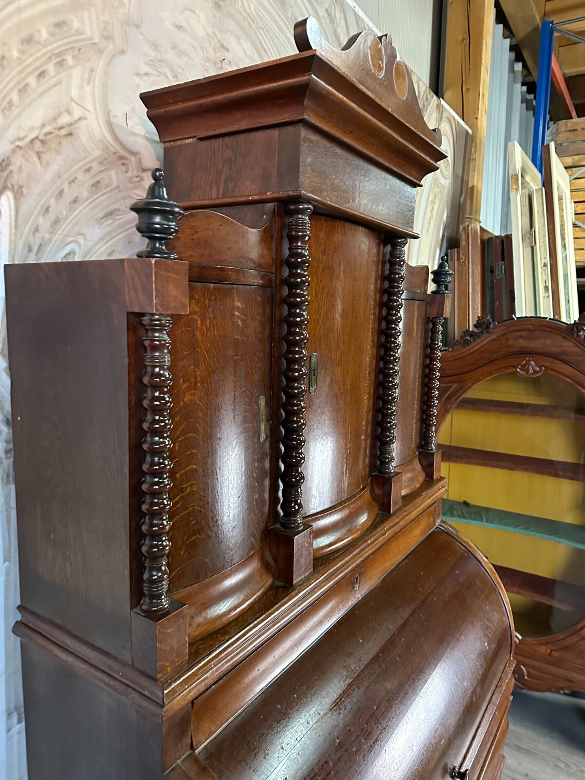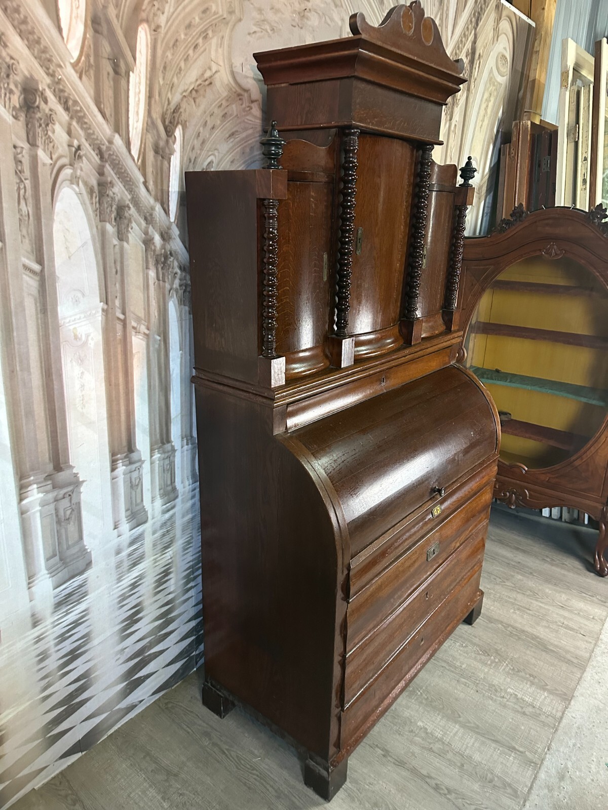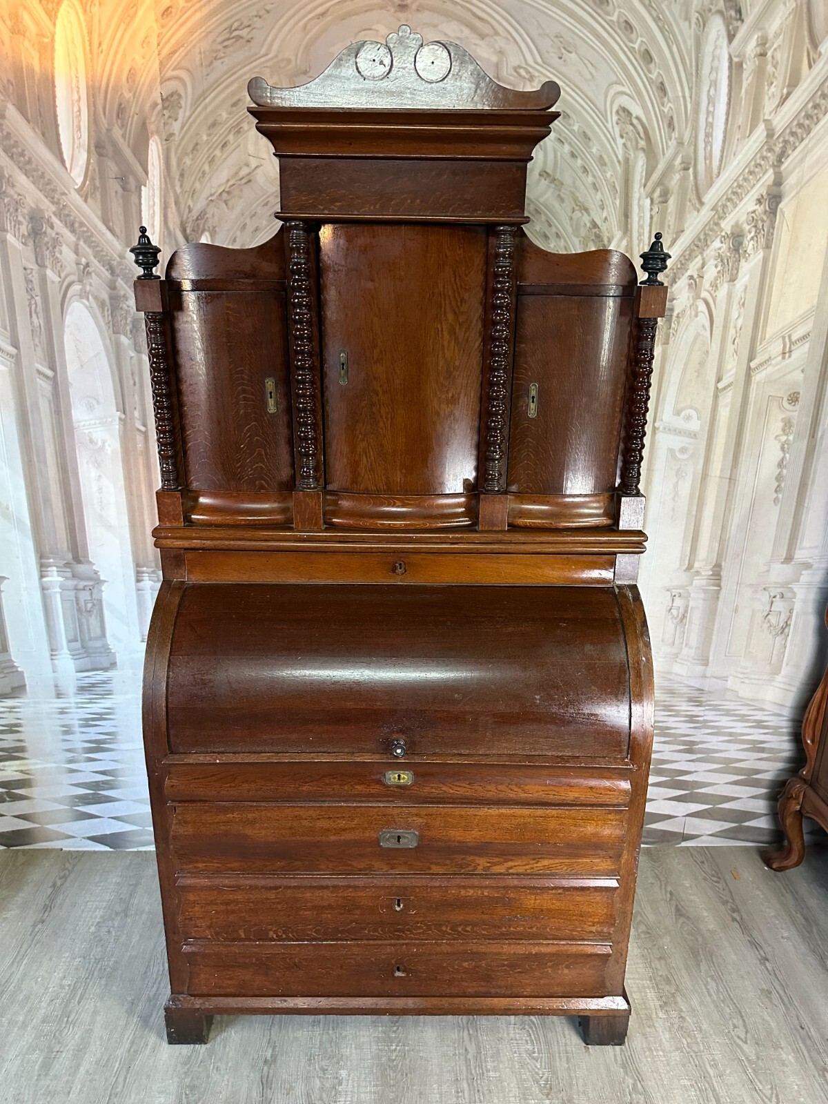 ANTIKER BIEDERMEIER SCHREIBTISCH MIT AUFSATZ ZYLINDERBÜRO UM 1840 EICHE SÄULEN