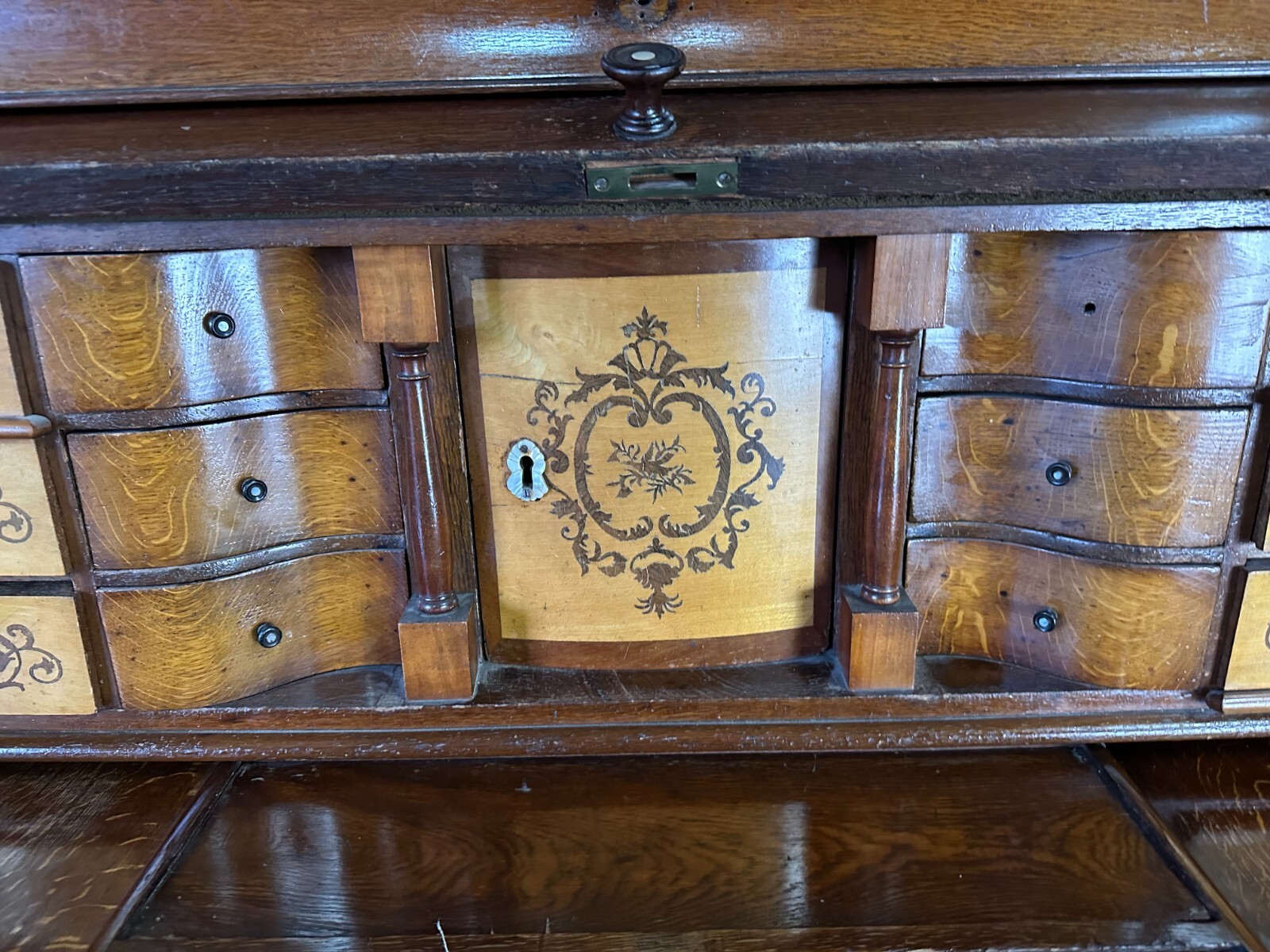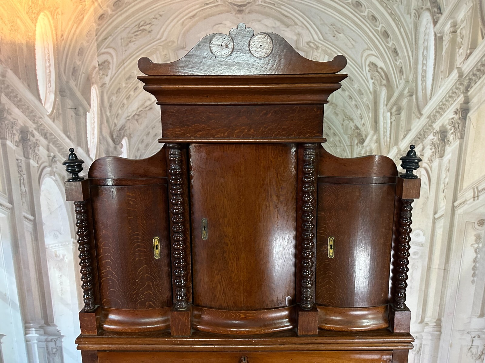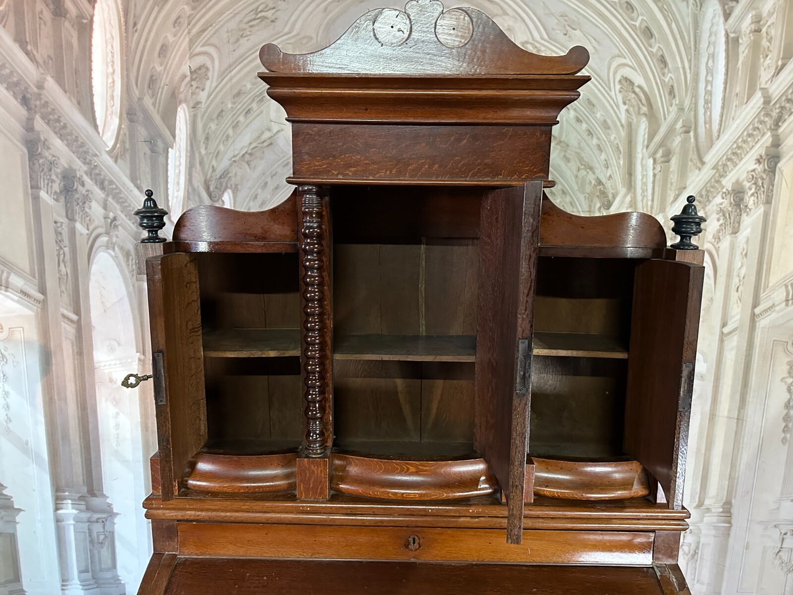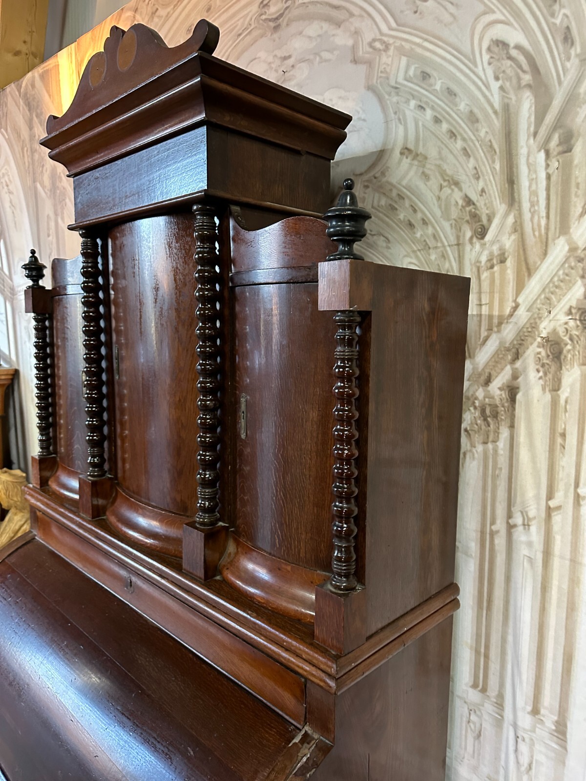Massiver antiker Aufsatzsekretär aus Eiche, zweiteilig, Biedermeier um 1840. Der Unterbau ist extrem schwer, hier werden drei weitere Helfer benötigt. Unten links Leiste fehlend, Seitenteile mit Dehnungsrissen, teils Kratzern und Druckstellen. Ein unpassender Schlüssel wird mitgegeben zum Ziehen der Türen, alle Schlösser offen bis auf die kleine Tür im Innenraum. Hier ebenfalls Knäufe fehlend, Abrieb und Flecken. Seitlich links mittig Stück Leiste gebrochen aber vorhanden. An den Gleitschienen der Klappe Furnierschäden, Abdeckungen teils abgeklebt. Beschläge nicht original, Schlösser ungetestet. Das Möbel ist nicht verbastelt, könnte sowohl sofort genutzt werden als auch als eine komplette Restaurationbasis dienen. Stabiler Zustand, Abmessungen BTH 118/61/236cm. Der obere Aufsatz hatte wohl zwei Appliken, diese sind nicht vorhanden. OHNE PASSENDE SCHLÜSSEL.