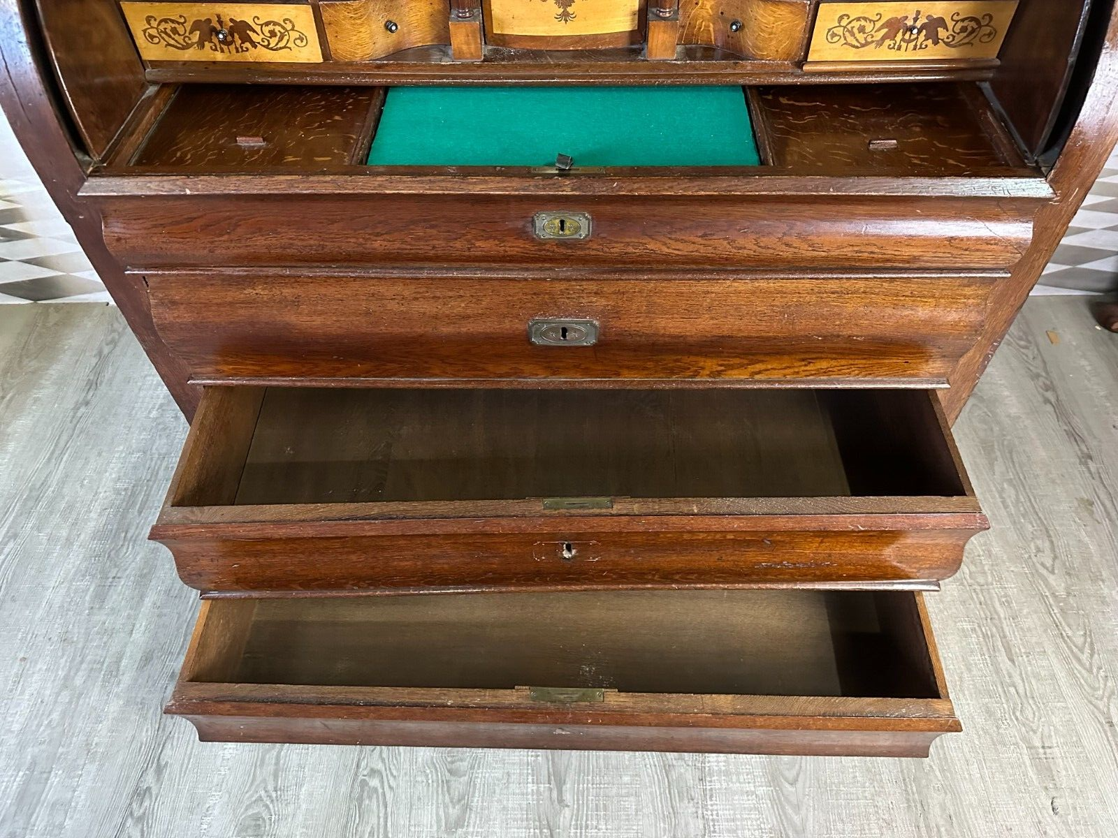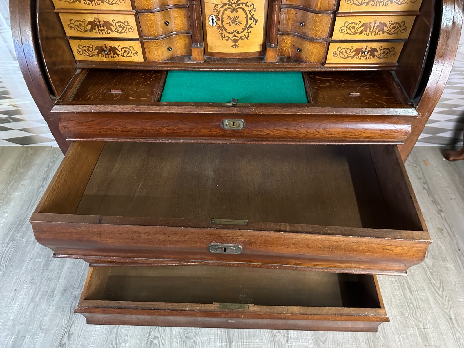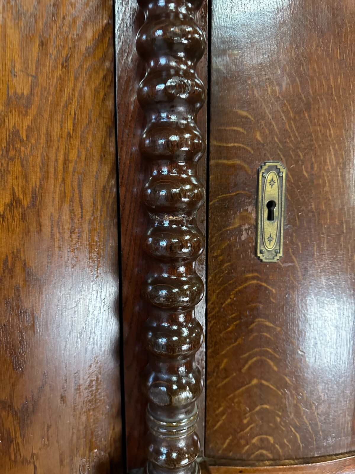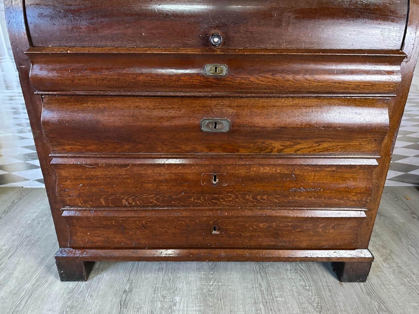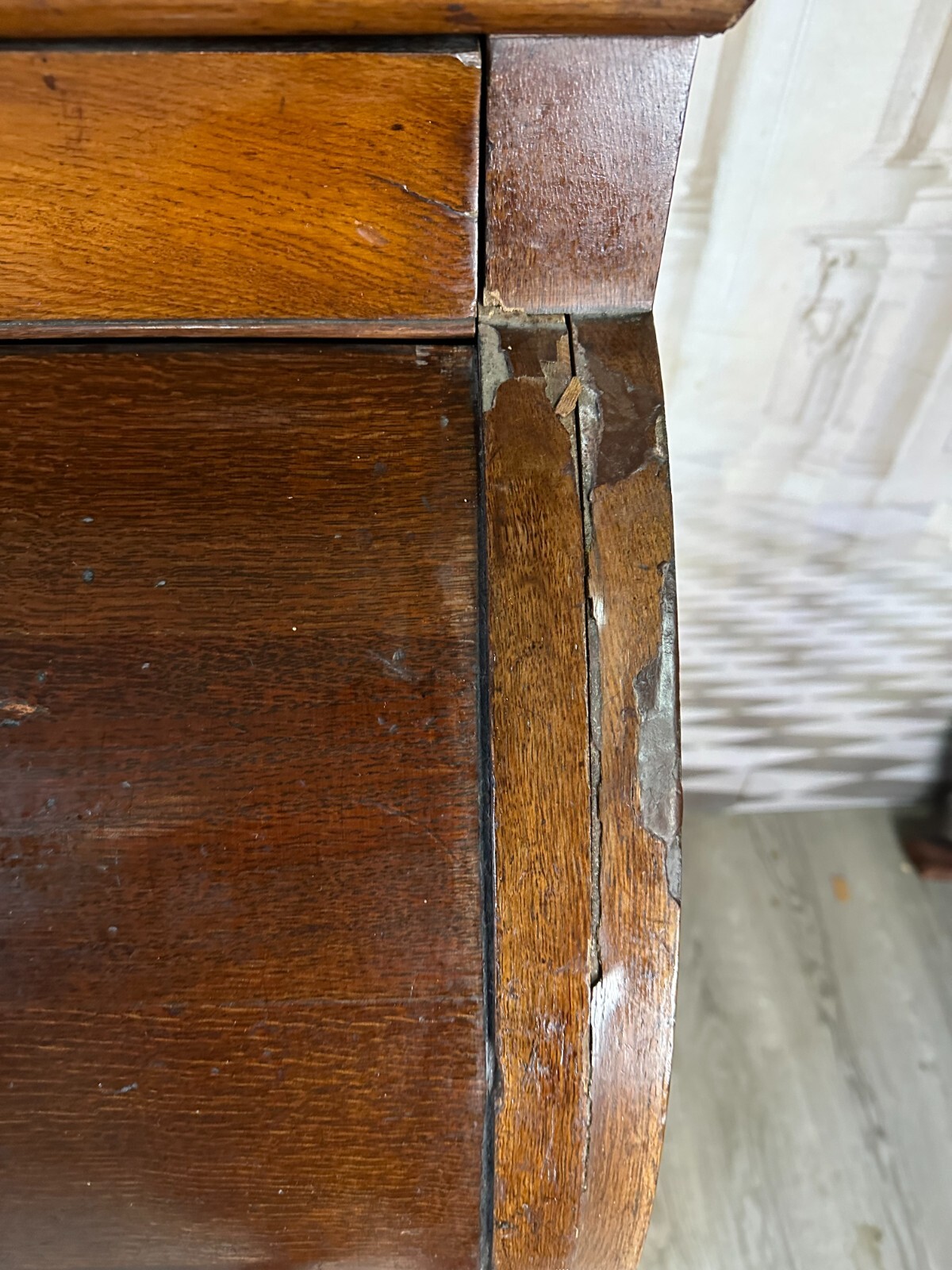 Massiver antiker Aufsatzsekretär aus Eiche, zweiteilig, Biedermeier um 1840. Der Unterbau ist extrem schwer, hier werden drei weitere Helfer benötigt. Unten links Leiste fehlend, Seitenteile mit Dehnungsrissen, teils Kratzern und Druckstellen. Ein unpassender Schlüssel wird mitgegeben zum Ziehen der Türen, alle Schlösser offen bis auf die kleine Tür im Innenraum. Hier ebenfalls Knäufe fehlend, Abrieb und Flecken. Seitlich links mittig Stück Leiste gebrochen aber vorhanden. An den Gleitschienen der Klappe Furnierschäden, Abdeckungen teils abgeklebt. Beschläge nicht original, Schlösser ungetestet. Das Möbel ist nicht verbastelt, könnte sowohl sofort genutzt werden als auch als eine komplette Restaurationbasis dienen. Stabiler Zustand, Abmessungen BTH 118/61/236cm. Der obere Aufsatz hatte wohl zwei Appliken, diese sind nicht vorhanden. OHNE PASSENDE SCHLÜSSEL.