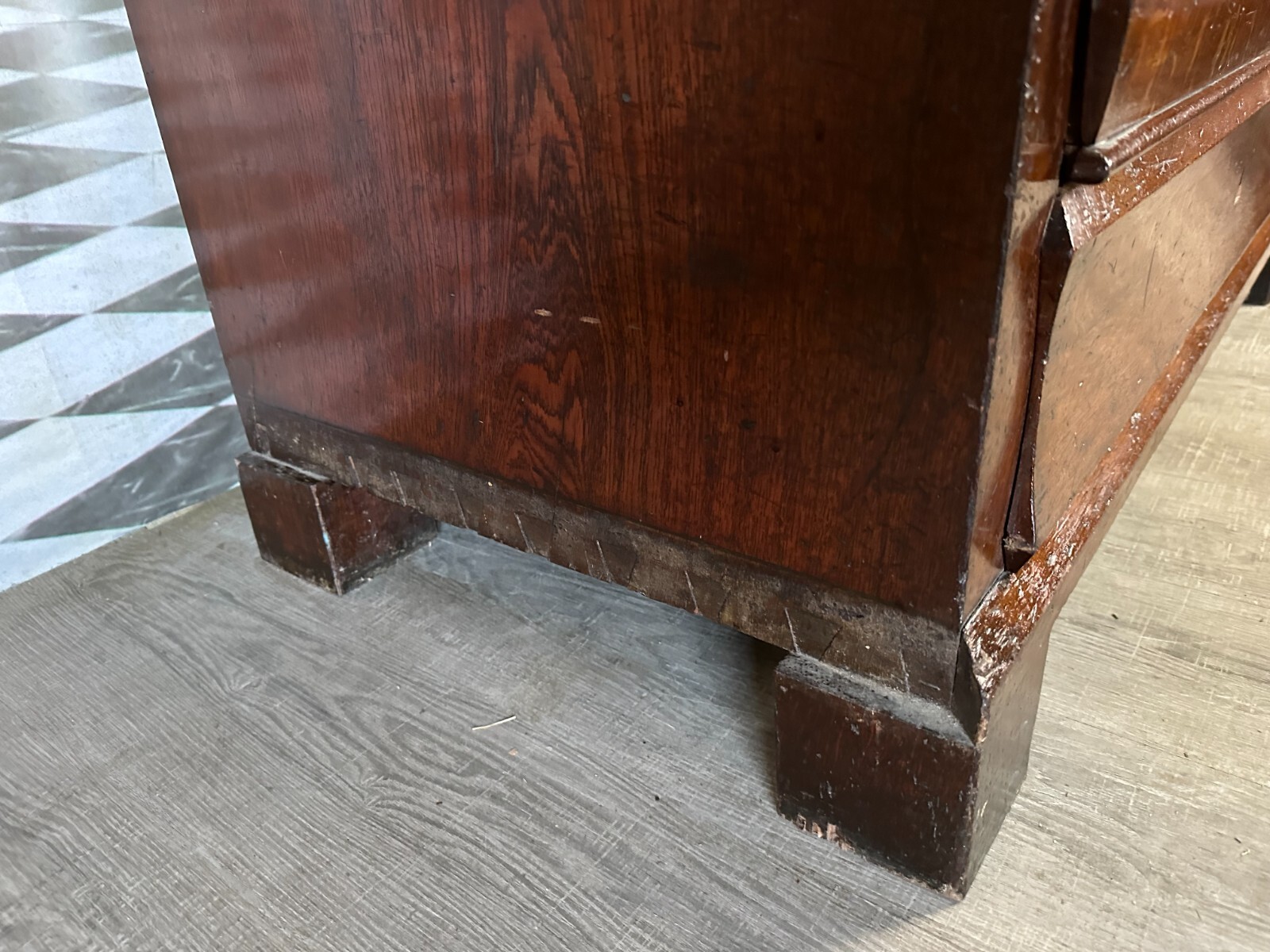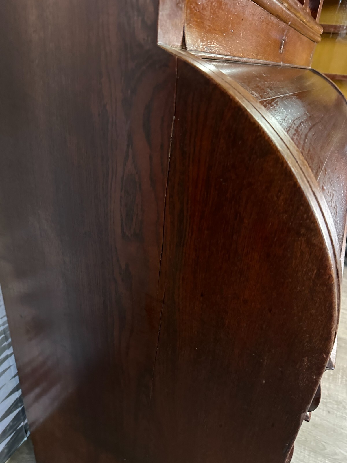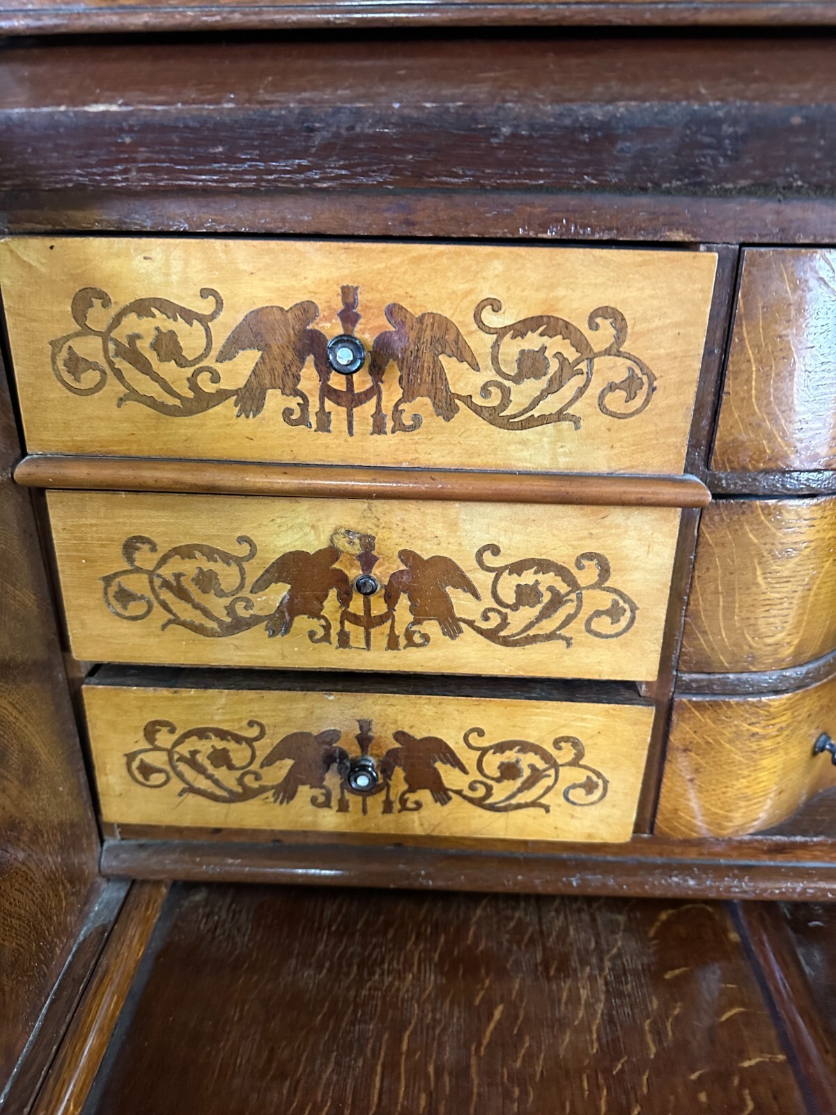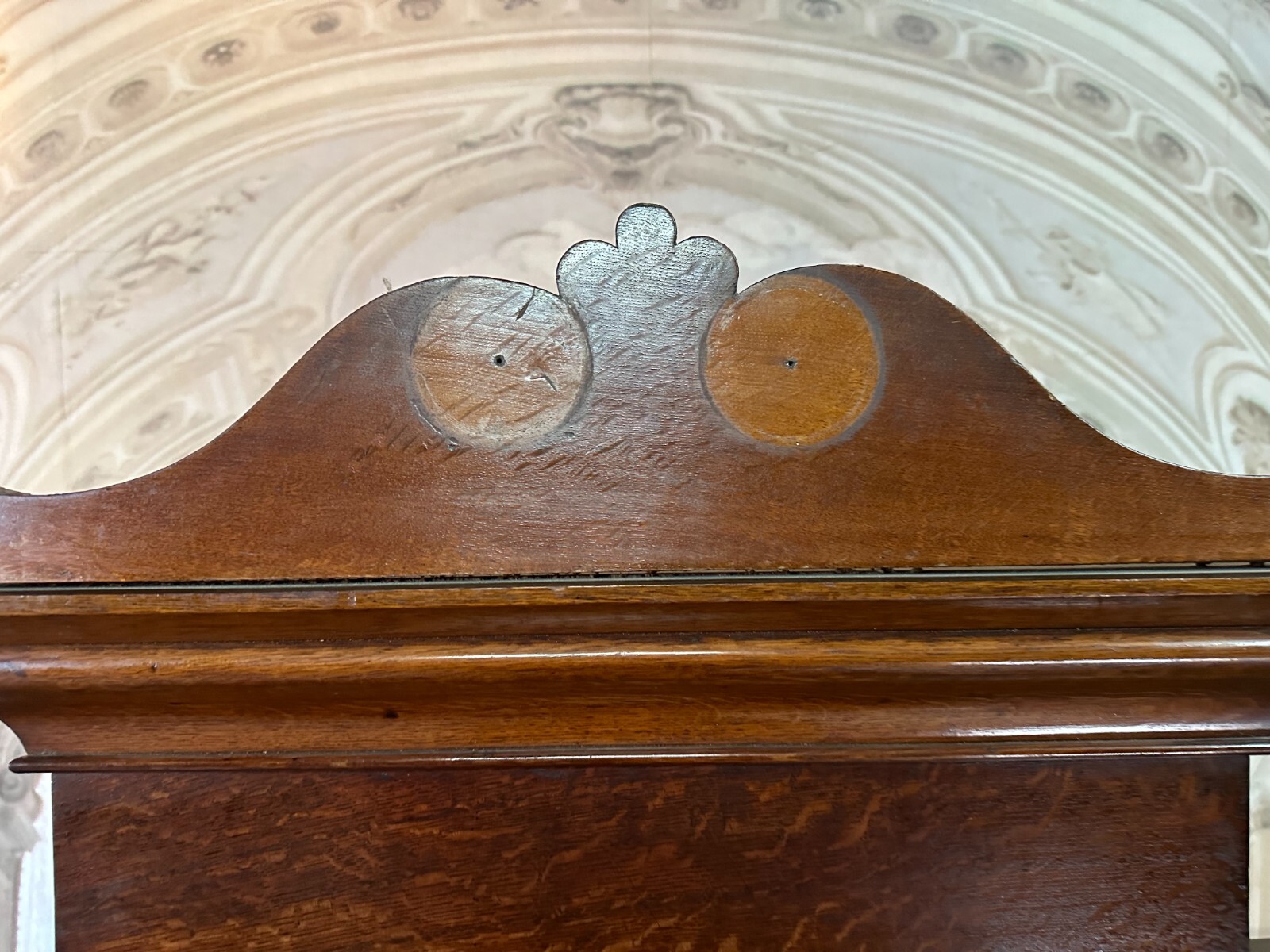 Massiver antiker Aufsatzsekretär aus Eiche, zweiteilig, Biedermeier um 1840. Der Unterbau ist extrem schwer, hier werden drei weitere Helfer benötigt. Unten links Leiste fehlend, Seitenteile mit Dehnungsrissen, teils Kratzern und Druckstellen. Ein unpassender Schlüssel wird mitgegeben zum Ziehen der Türen, alle Schlösser offen bis auf die kleine Tür im Innenraum. Hier ebenfalls Knäufe fehlend, Abrieb und Flecken. Seitlich links mittig Stück Leiste gebrochen aber vorhanden. An den Gleitschienen der Klappe Furnierschäden, Abdeckungen teils abgeklebt. Beschläge nicht original, Schlösser ungetestet. Das Möbel ist nicht verbastelt, könnte sowohl sofort genutzt werden als auch als eine komplette Restaurationbasis dienen. Stabiler Zustand, Abmessungen BTH 118/61/236cm. Der obere Aufsatz hatte wohl zwei Appliken, diese sind nicht vorhanden. OHNE PASSENDE SCHLÜSSEL.