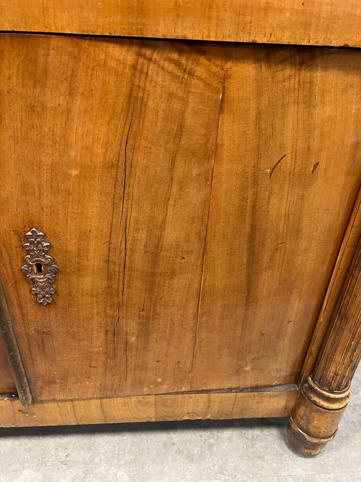 Sekretär aus dem 19. Jahrhundert, massiver Holzkorpus, Nussbaum furniert. Im oberen Bereich an der hinteren Kante kleinere Beschädigungen, die vorderen Ecken leicht berieben und bestoßen. Die oberste Platte mit leichter Dehnungsfuge, zum Teil berieben, leicht fleckig. Weiterhin lange, dunkle Druckstelle und feine Kratzer. Die Sekretärklappe ist an den Scharnieren beschädigt und sollte definitiv verstärkt werden. Die Innenseite der Klappe wurde schwarz angemalt, hier sind diverse Dehnungsrisse zu sehen und Farbabplatzer. Zur Unterstützung der Klappe wurden mal zwei Halterungen angebracht, diese sind vorhanden, die dafür vorgesehenen Löcher geben jedoch keinen Halt mehr. Sehr schöner Innenraum, leicht fleckig, normale Nutzungsspuren. Unteren Türen mit Dehnungsrissen, an den Seitenwänden teilweise Abrieb und Druckstellen. Im Fußbereich stärkere Dehnungsrisse mit dementsprechenden Furnierschäden, ebenfalls Abrieb. Das Möbel ist sehr stabil. Die Rückwand wurde nachgeschraubt. An der Oberfläche der Sekretärklappe Druckspuren, weiterhin an der gesamten Furnieroberfläche kleinere Fehlstellen. Abmessungen BTH: 117x61x160cm, Höhe der Sekretärklappe: 74cm. Im Unterbau Innenhöhe: 50cm. Schloss der Sekretärklappe funktionsfähig, für die anderen beiden Schlösser kein Schlüssel vorhanden.